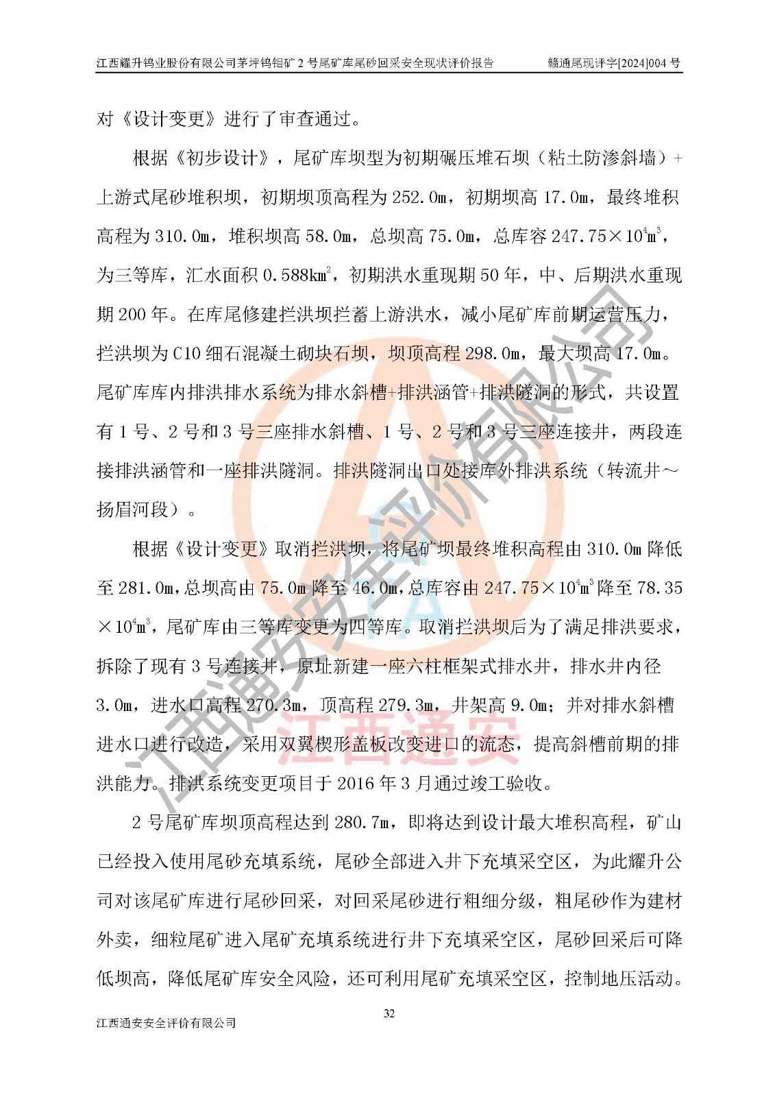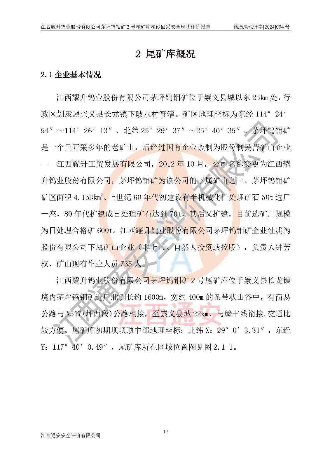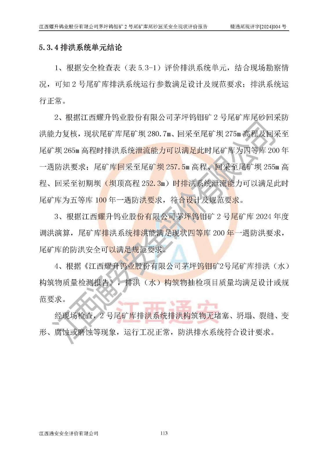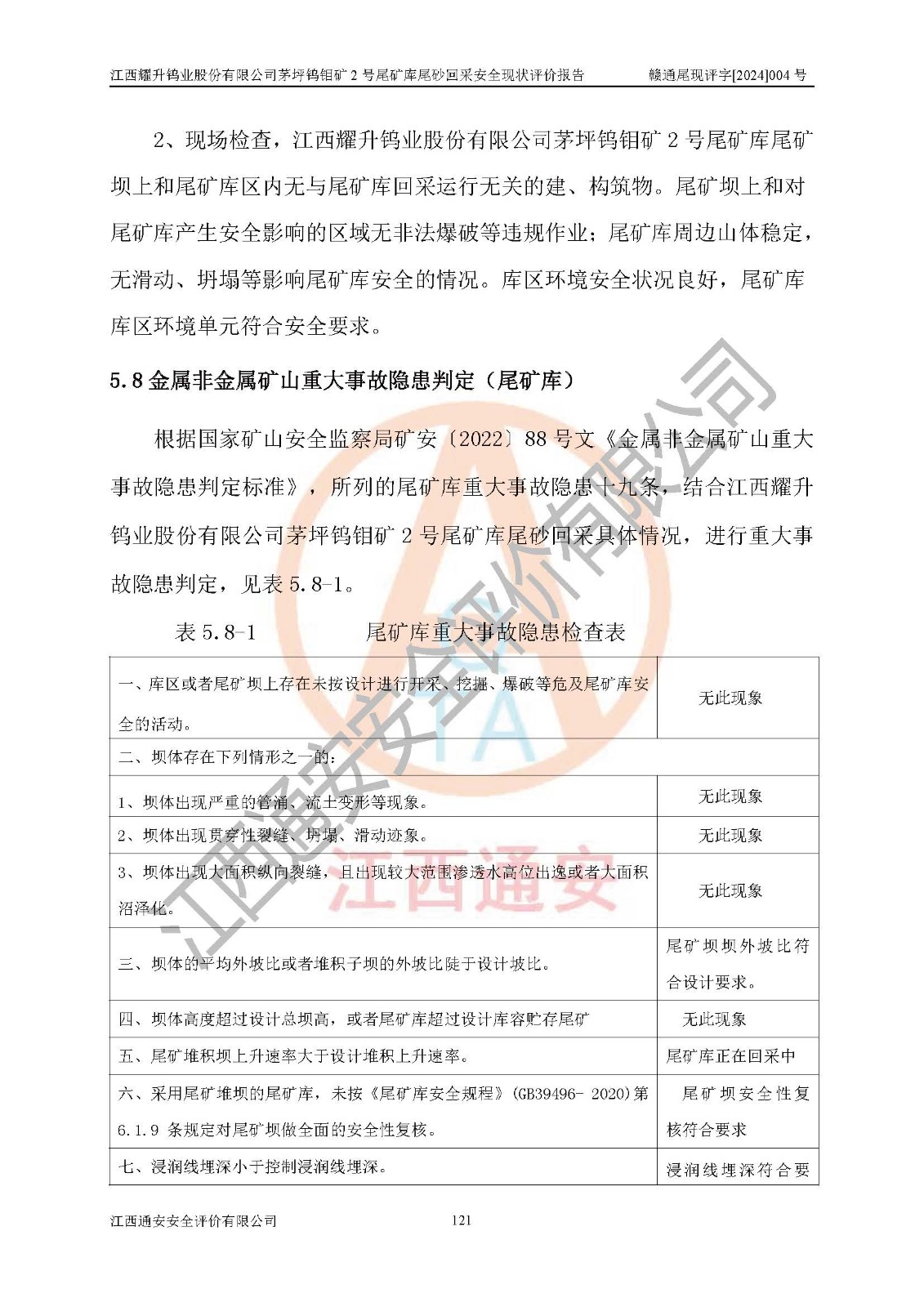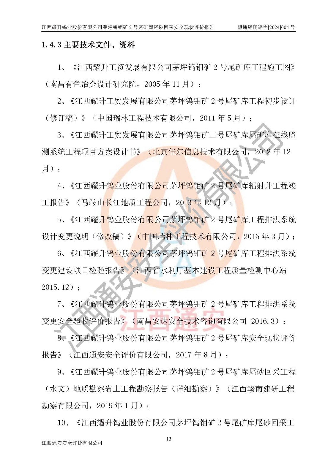 評價報告名稱 | 江西耀升鎢業(yè)股份有限公司茅坪鎢鉬礦2號尾礦庫尾砂回采安全現(xiàn)狀評價報告 | |||