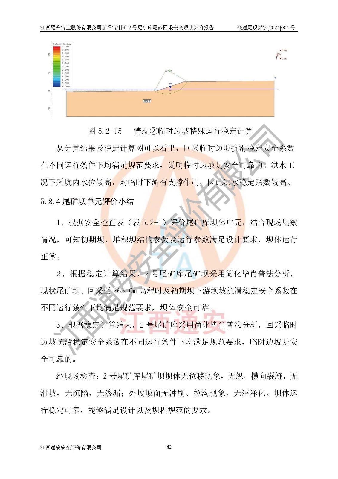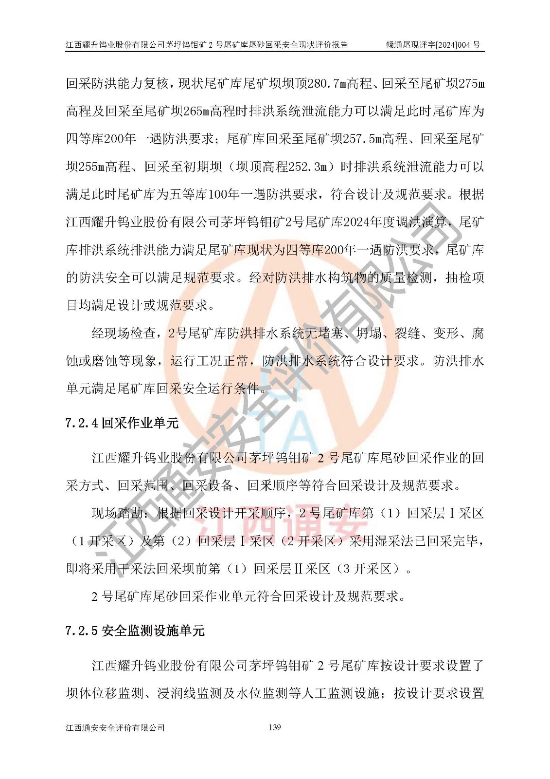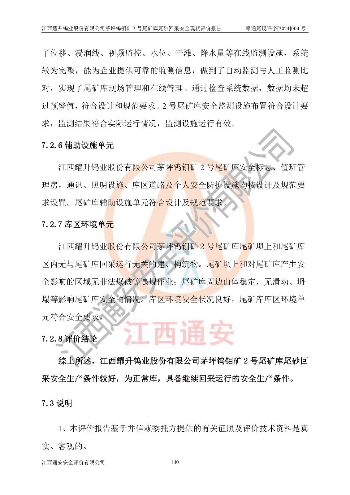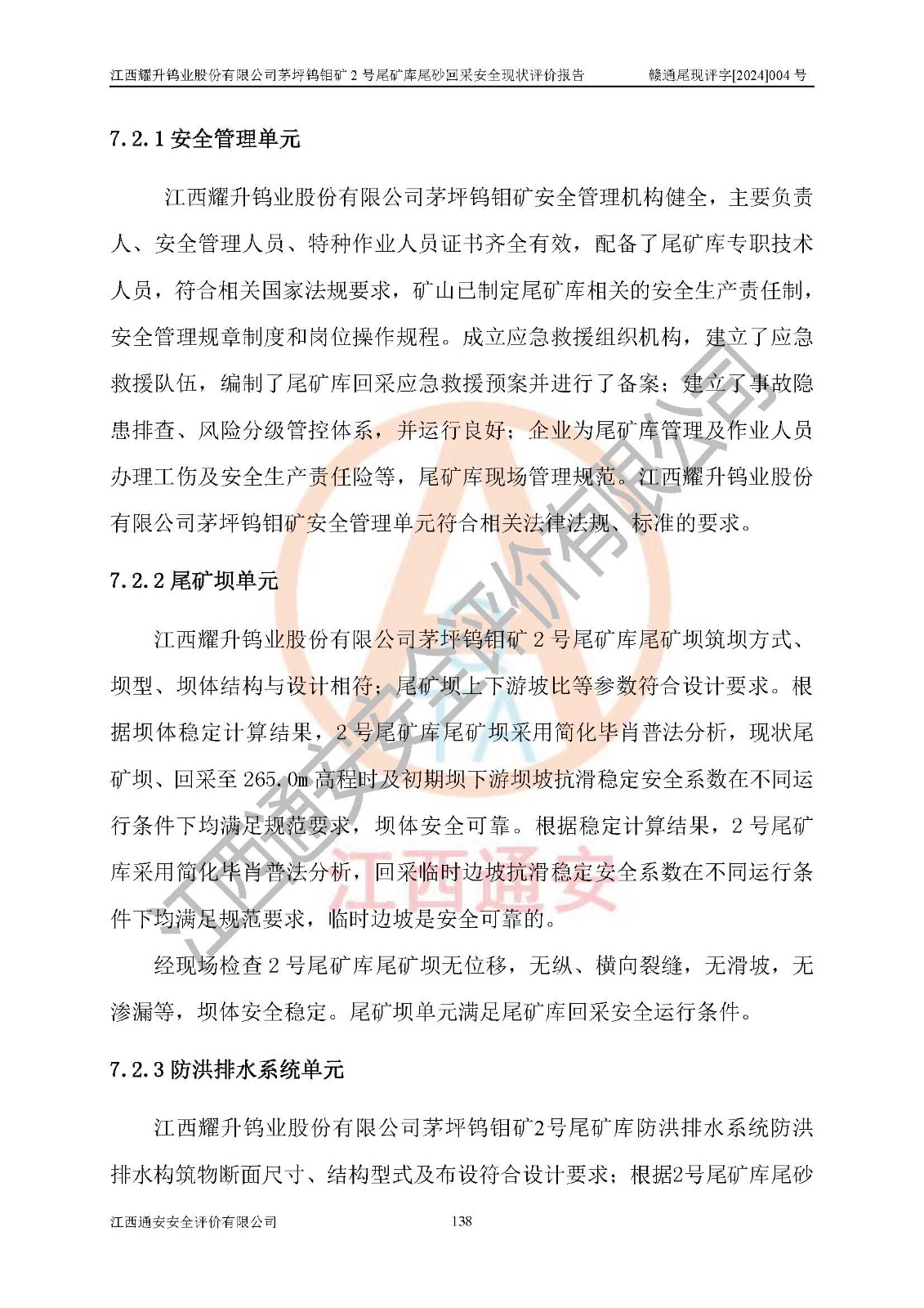 評價結論 | 江西耀升鎢業(yè)股份有限公司茅坪鎢鉬礦2號尾礦庫尾砂回采安全生產(chǎn)條件較好,為正常庫,具備繼續(xù)回采運行的安全生產(chǎn)條件。 | |||