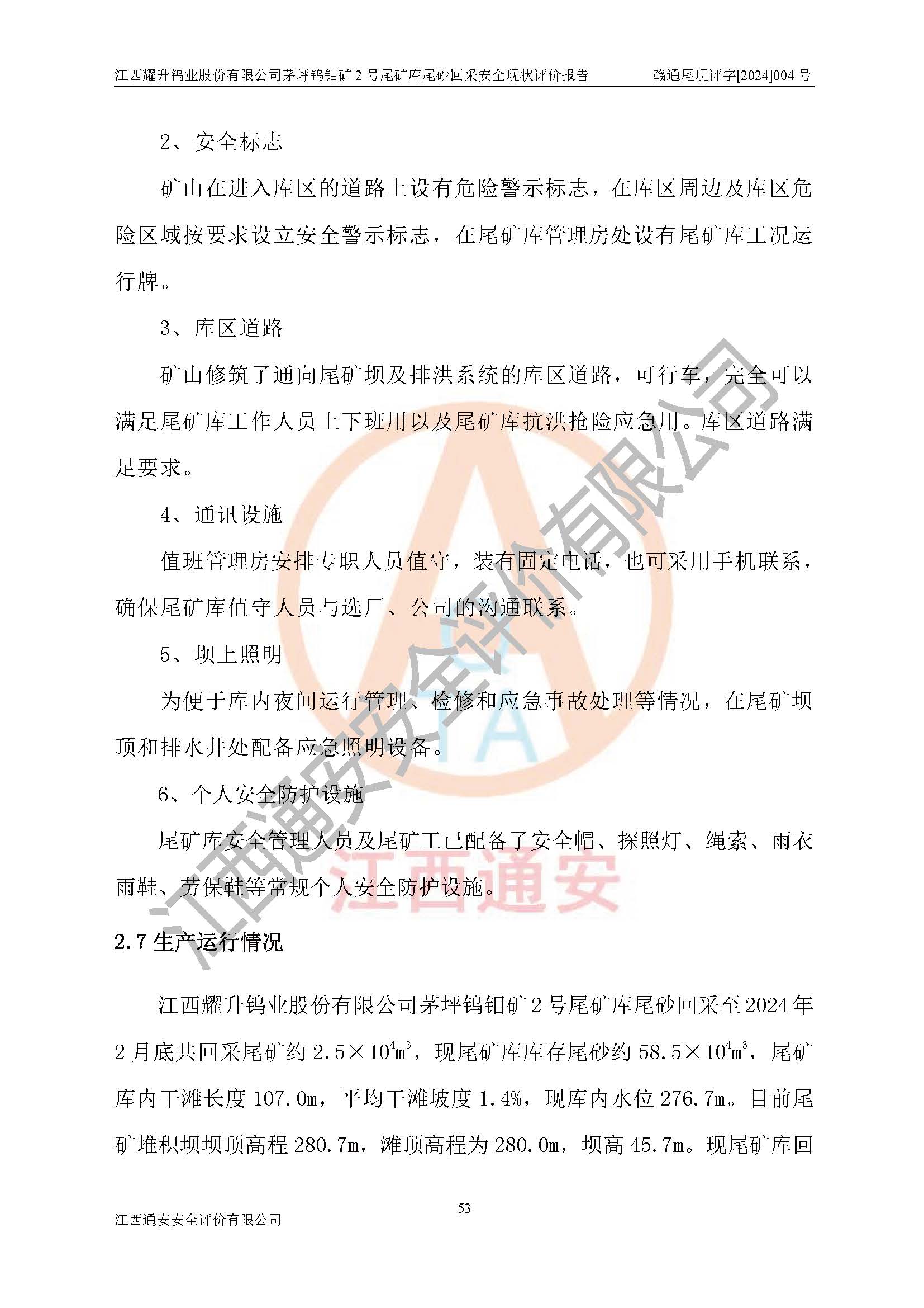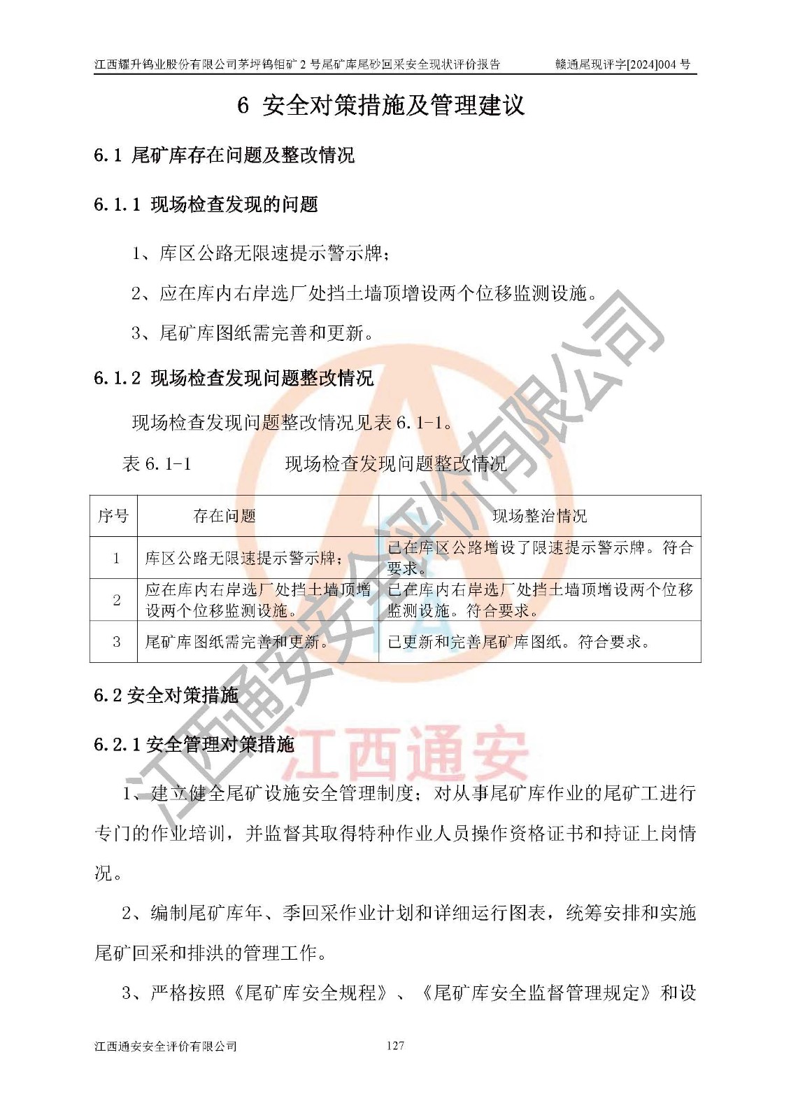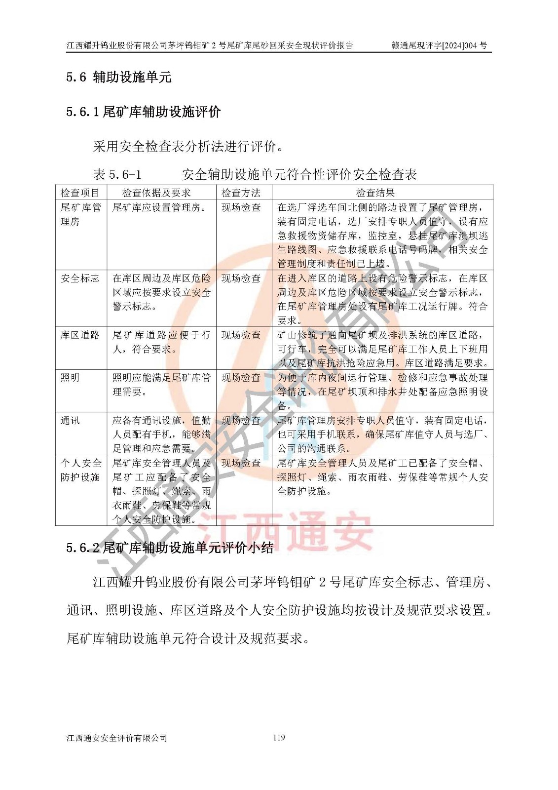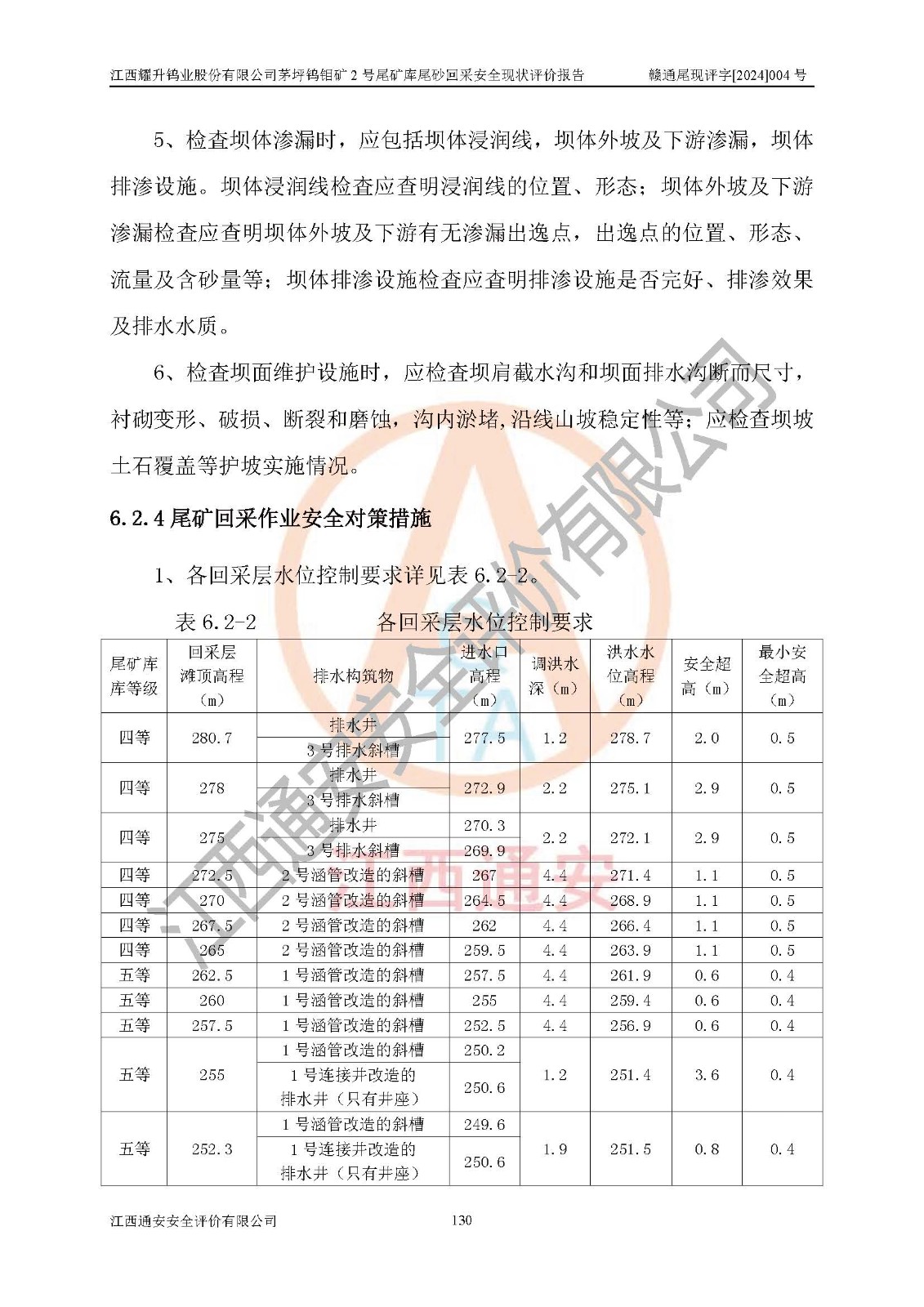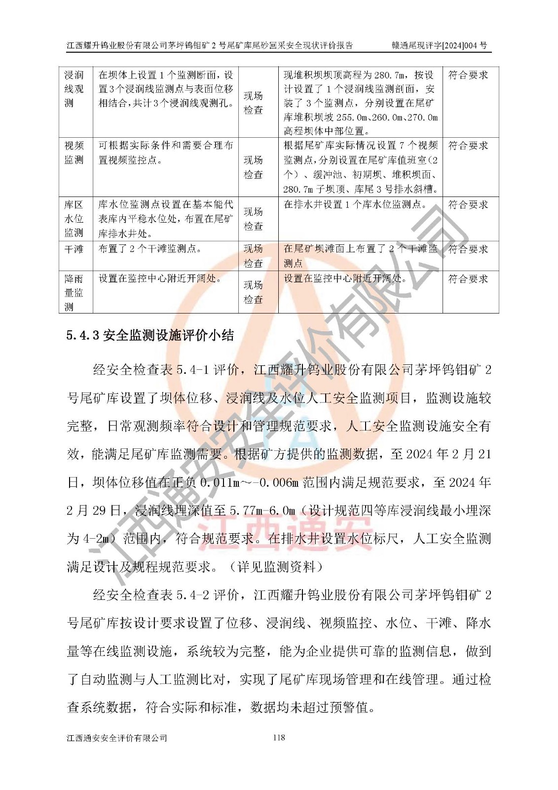 評價結論 | 江西耀升鎢業(yè)股份有限公司茅坪鎢鉬礦2號尾礦庫尾砂回采安全生產(chǎn)條件較好,為正常庫,具備繼續(xù)回采運行的安全生產(chǎn)條件。 | |||