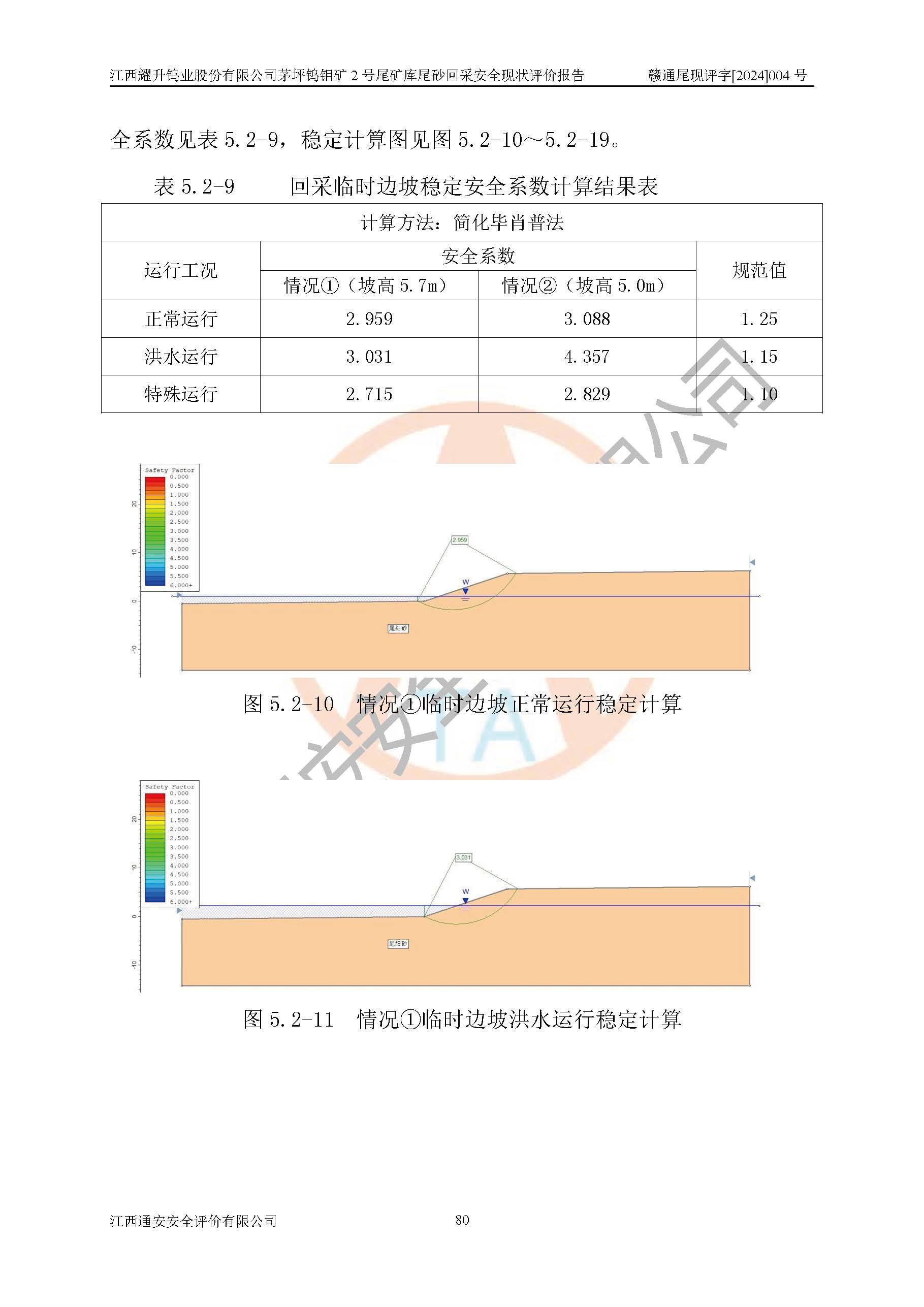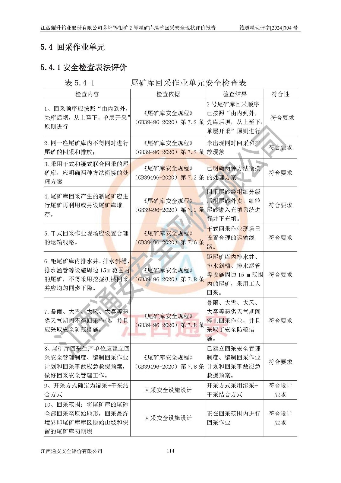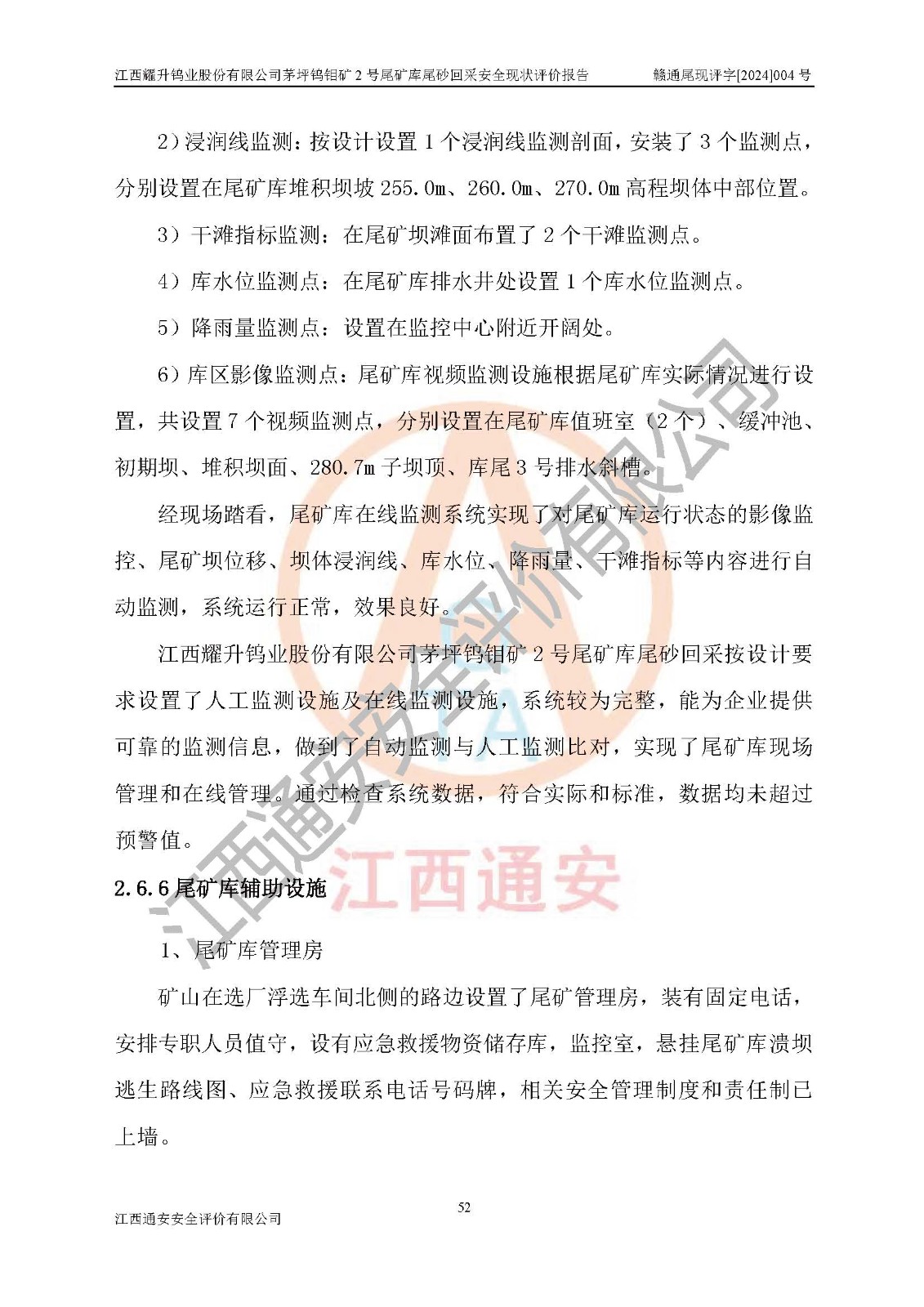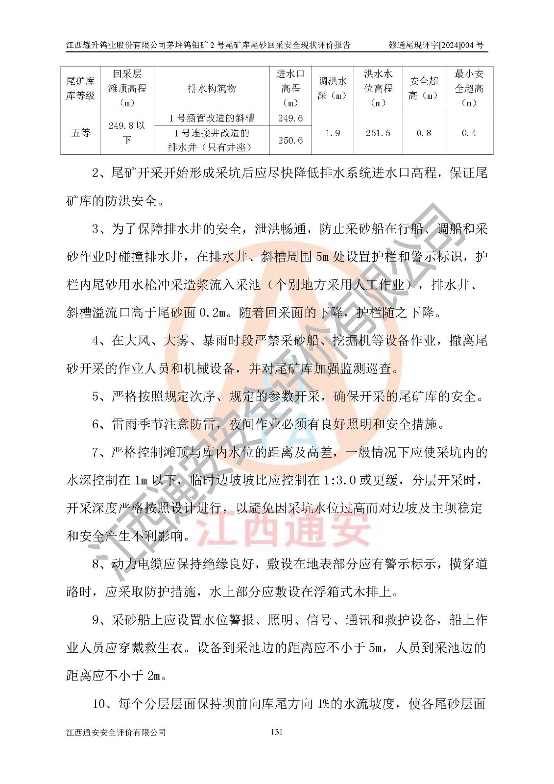 評價結論 | 江西耀升鎢業(yè)股份有限公司茅坪鎢鉬礦2號尾礦庫尾砂回采安全生產(chǎn)條件較好,為正常庫,具備繼續(xù)回采運行的安全生產(chǎn)條件。 | |||
