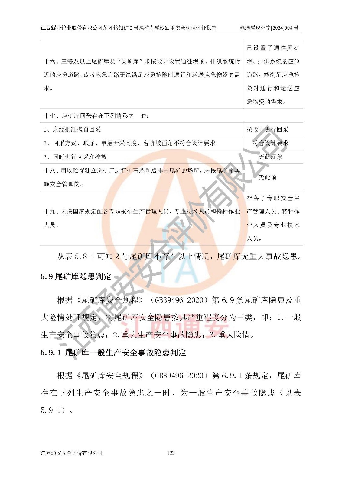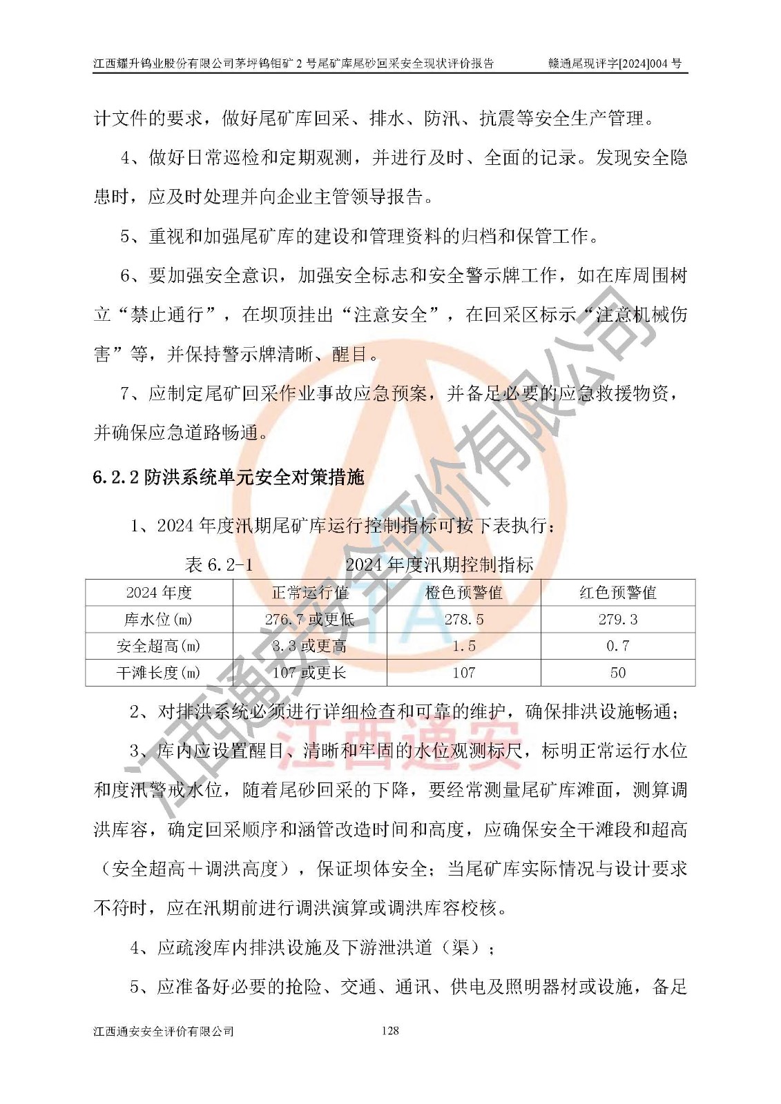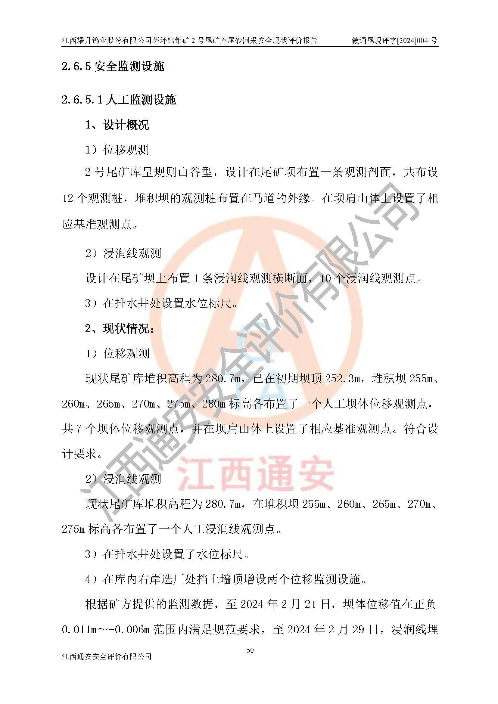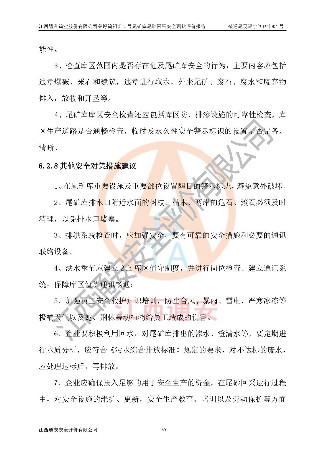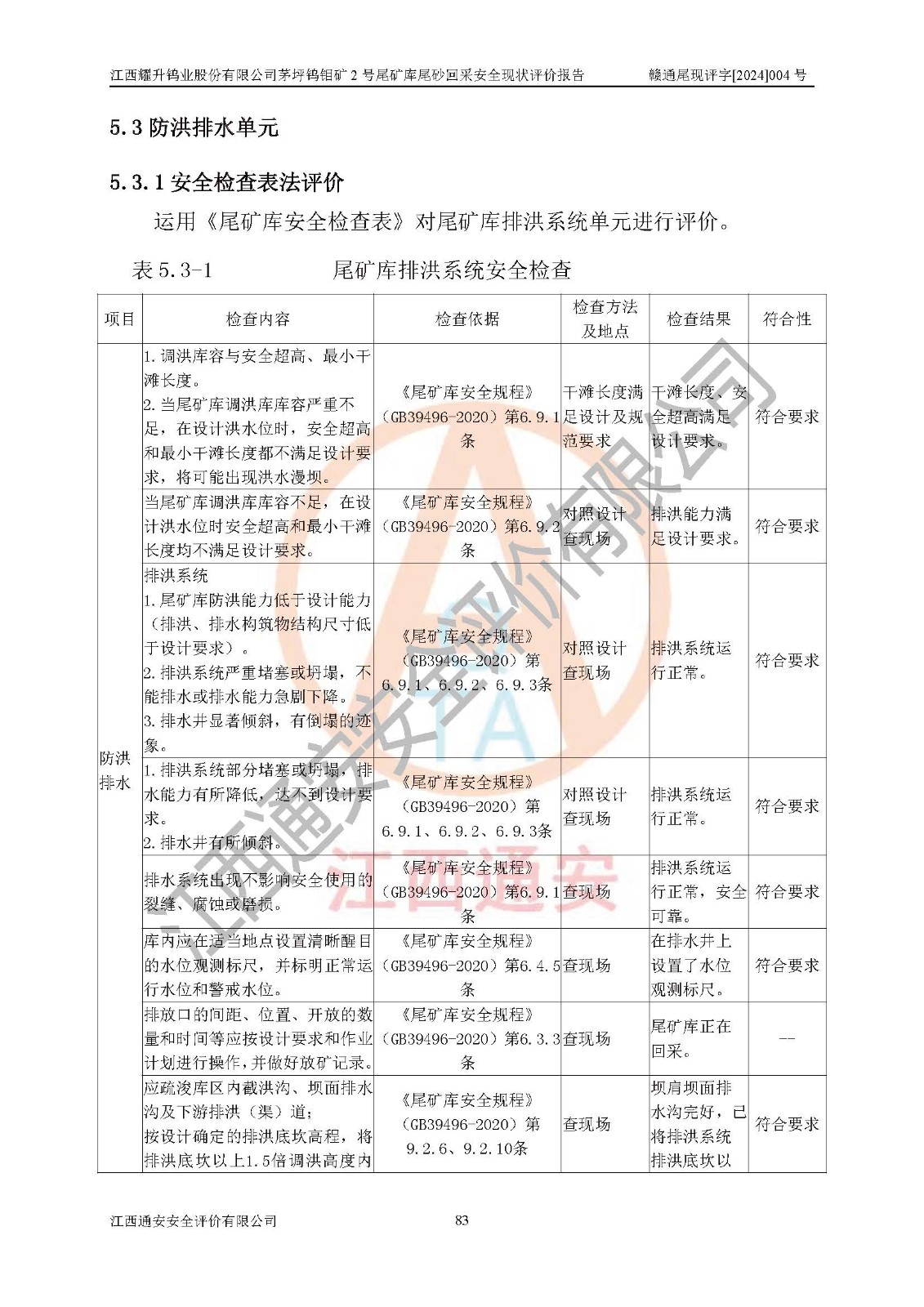 評價結論 | 江西耀升鎢業(yè)股份有限公司茅坪鎢鉬礦2號尾礦庫尾砂回采安全生產(chǎn)條件較好,為正常庫,具備繼續(xù)回采運行的安全生產(chǎn)條件。 | |||