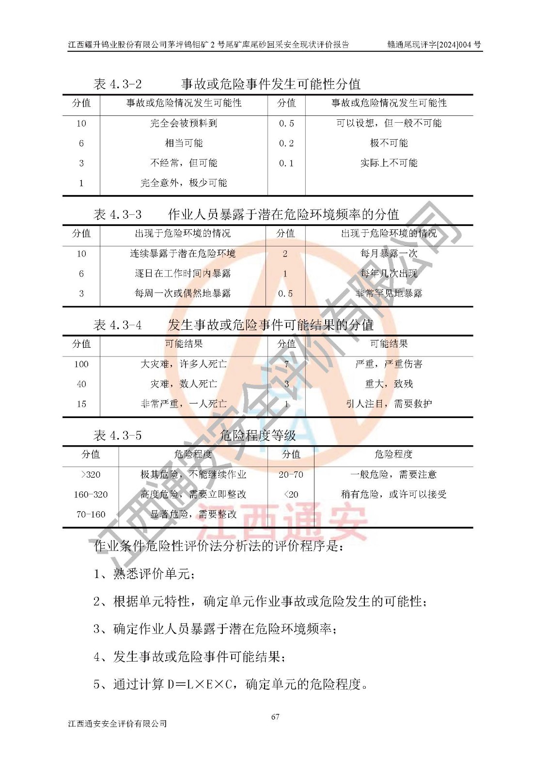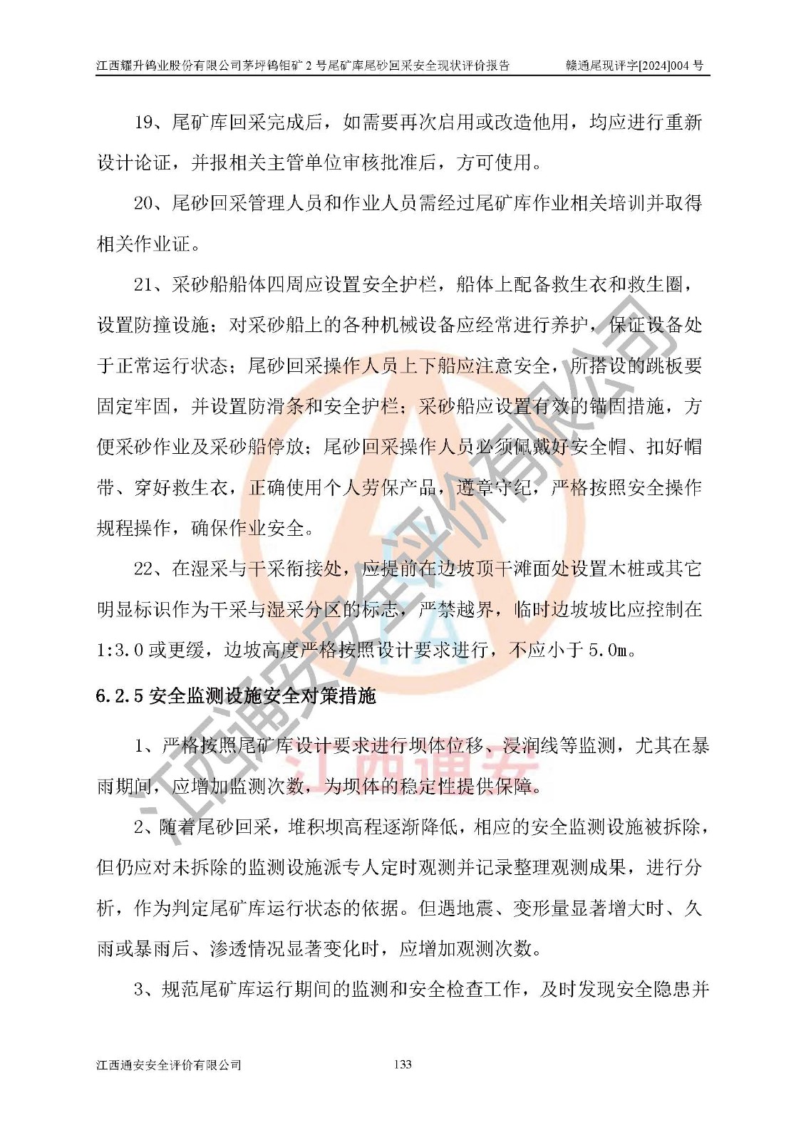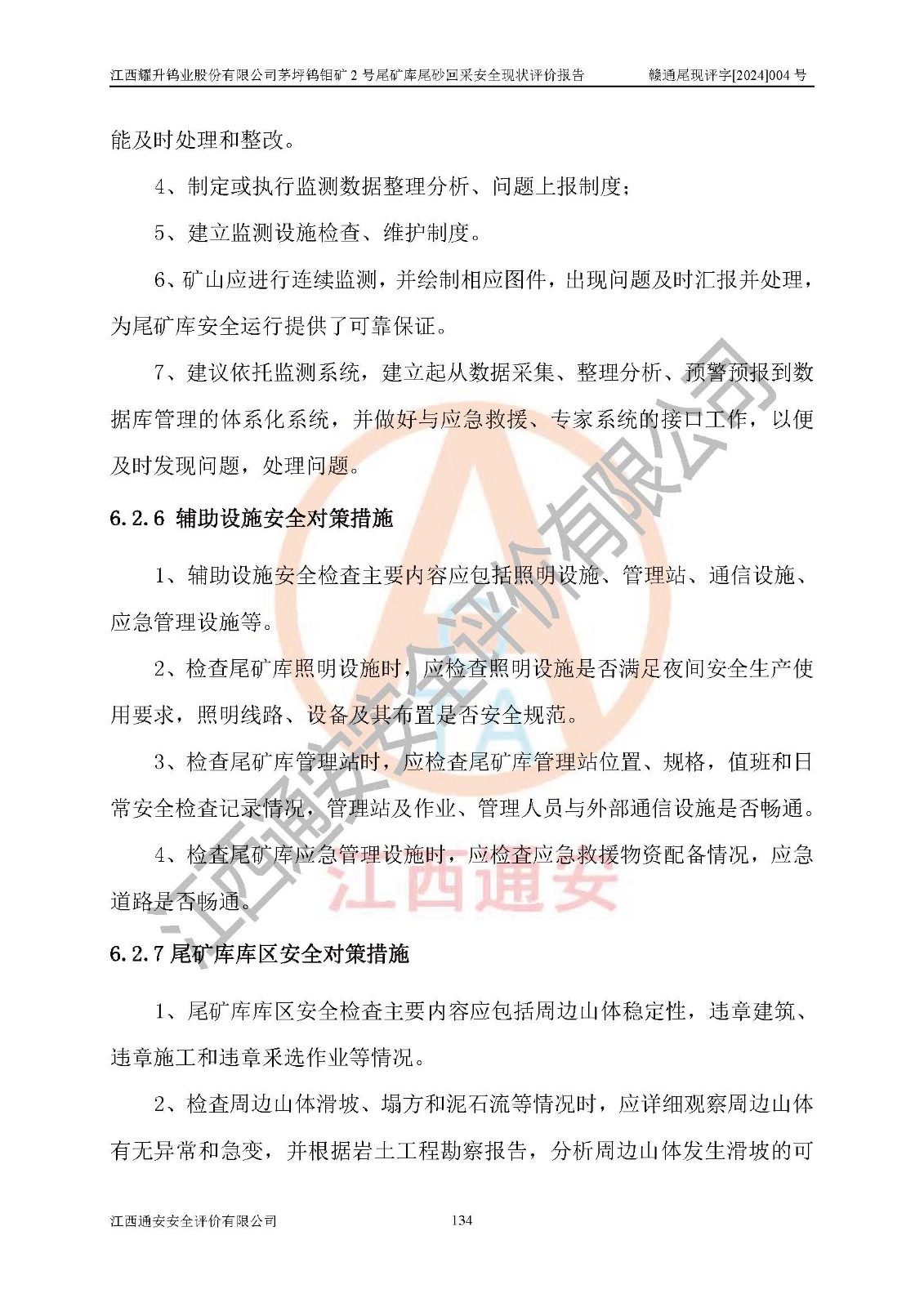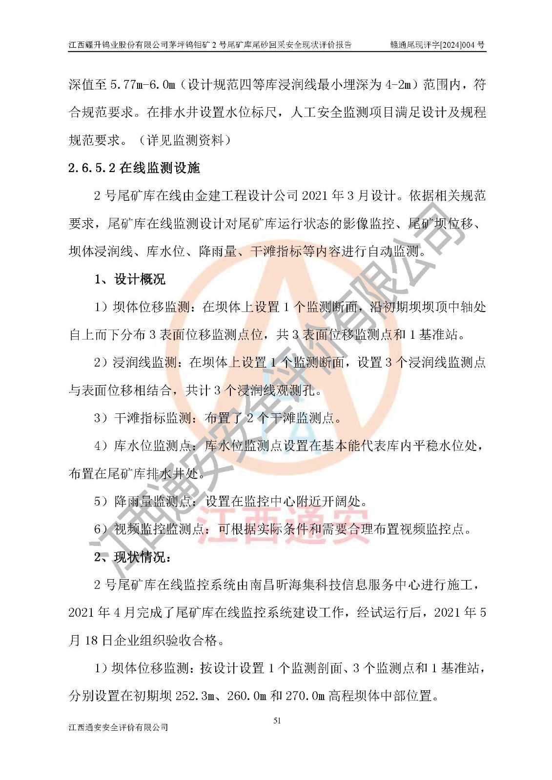 評價結論 | 江西耀升鎢業(yè)股份有限公司茅坪鎢鉬礦2號尾礦庫尾砂回采安全生產(chǎn)條件較好,為正常庫,具備繼續(xù)回采運行的安全生產(chǎn)條件。 | |||