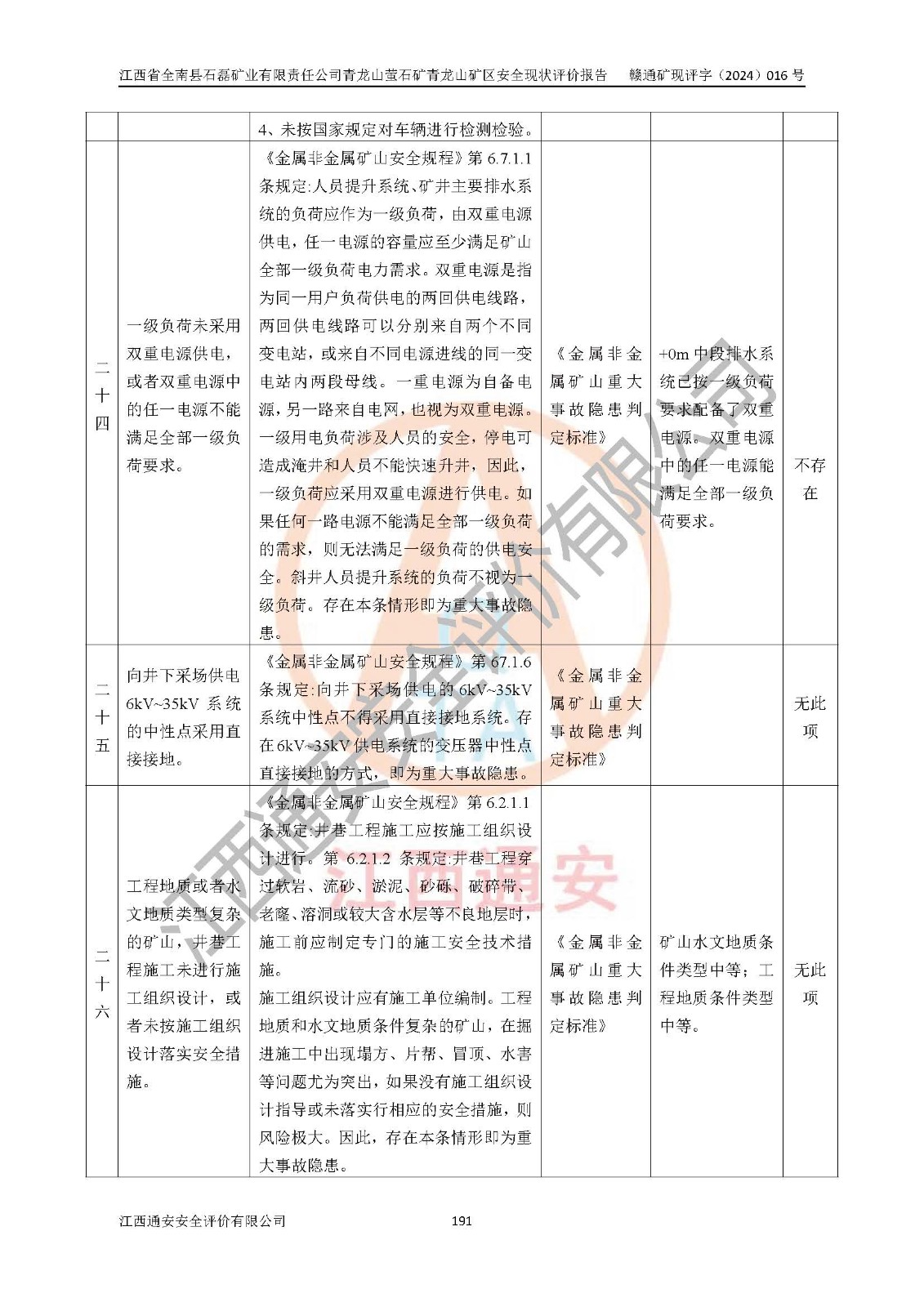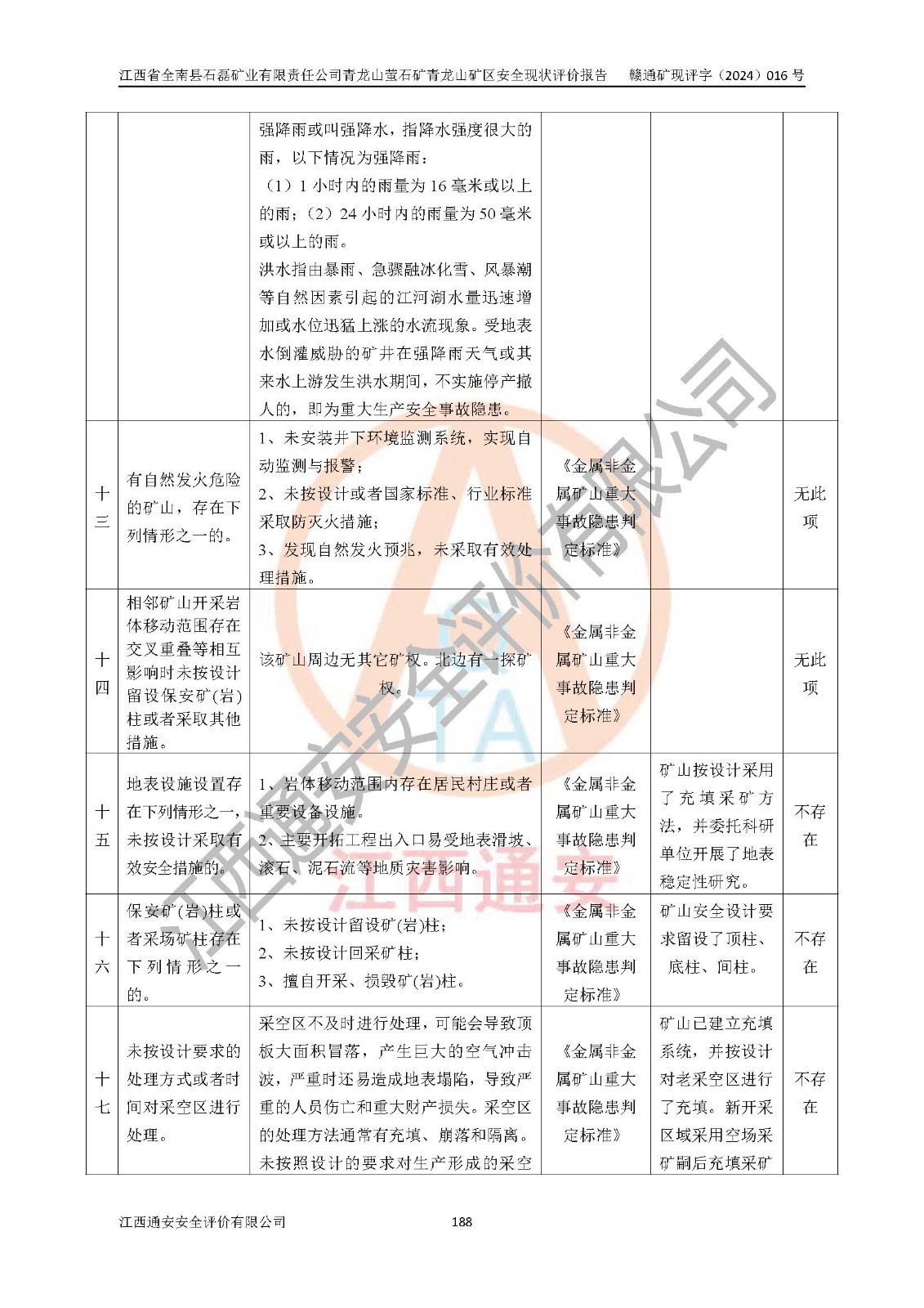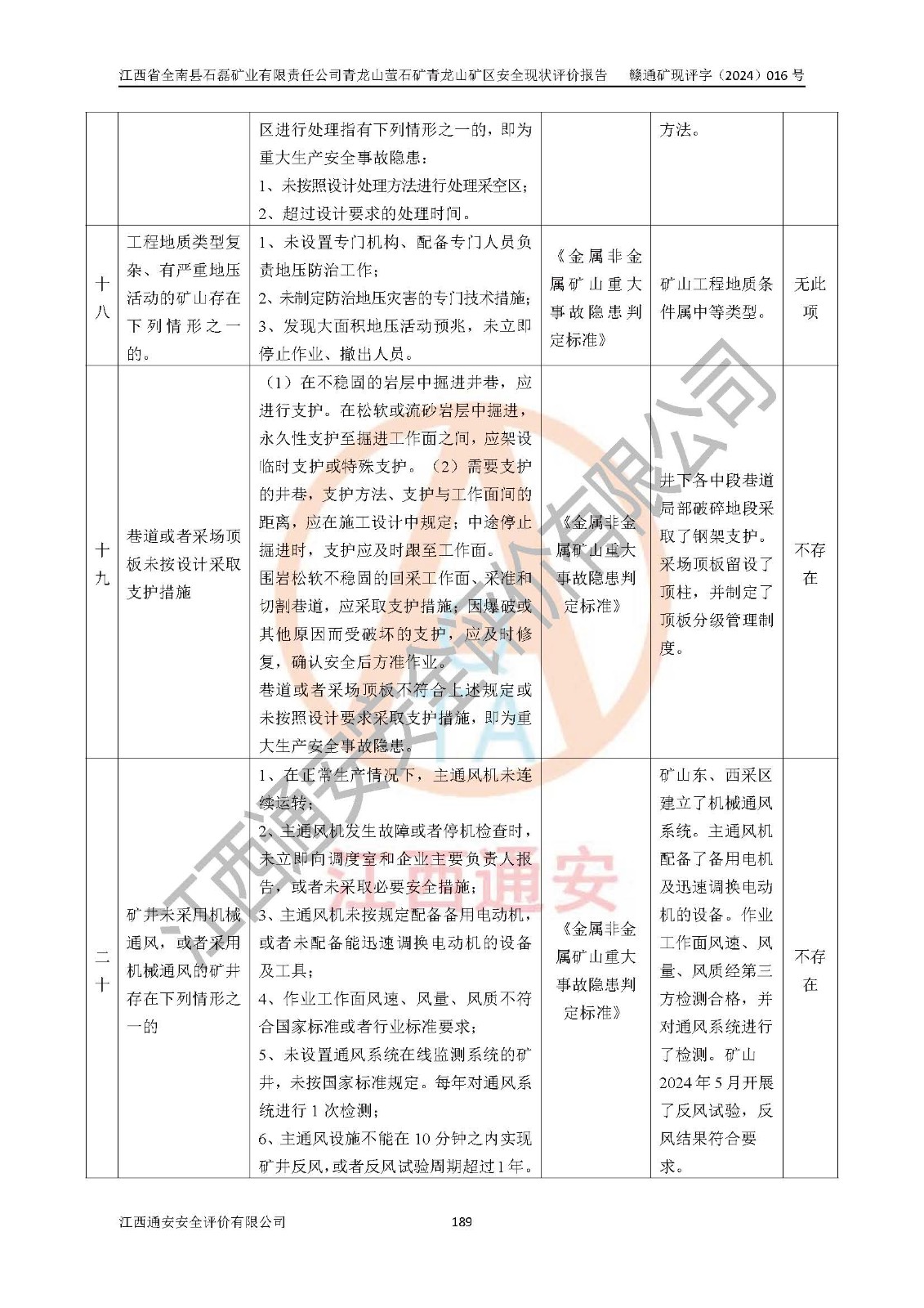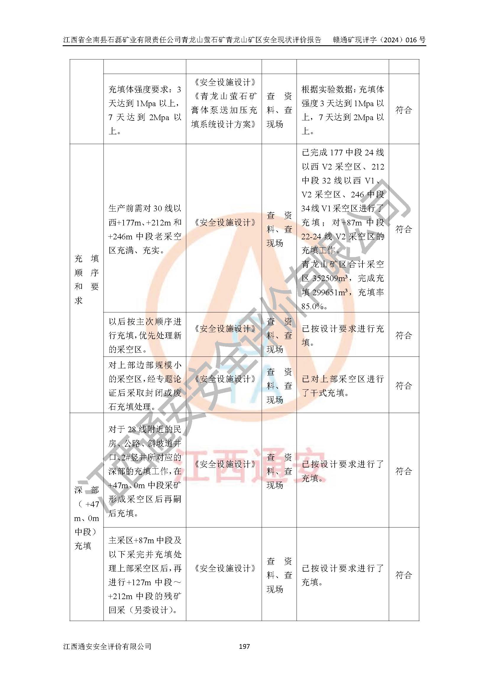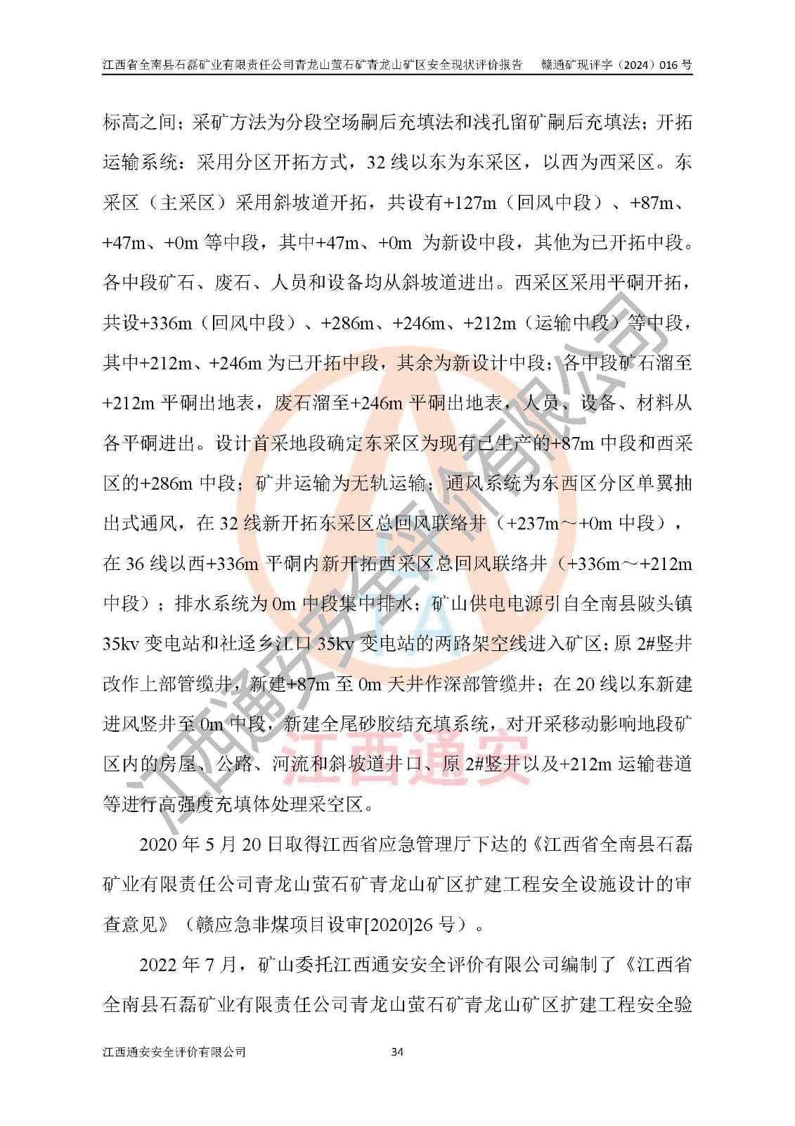 其它 | 江西省全南縣石磊礦業(yè)有限責(zé)任公司青龍山螢石礦青龍山礦區(qū)的主要生產(chǎn)及輔助系統(tǒng):提升運(yùn)輸、排水、供配電、通風(fēng)、供風(fēng)、采掘、充填、安全避險(xiǎn)“六大系統(tǒng)”等基本符合法律法規(guī)要求和規(guī)程、規(guī)范要求;各種危險(xiǎn)有害因素及不可接受的風(fēng)險(xiǎn)在運(yùn)行中認(rèn)真落實(shí)行之**的技術(shù)措施或管理措施,嚴(yán)格按規(guī)程,按要求加強(qiáng)管理,可以避免和控制各類事故,**安全生產(chǎn)?,F(xiàn)階段礦山設(shè)備、設(shè)施和場(chǎng)所符合**安全生產(chǎn)有關(guān)法律、法規(guī)、標(biāo)準(zhǔn)及規(guī)范的規(guī)定。礦山采用平硐+斜坡道聯(lián)合開拓方式,安全生產(chǎn)條件一般;安全管理能滿足法規(guī)要求,礦山地下開采符合**規(guī)定的安全生產(chǎn)條件。 | ||||