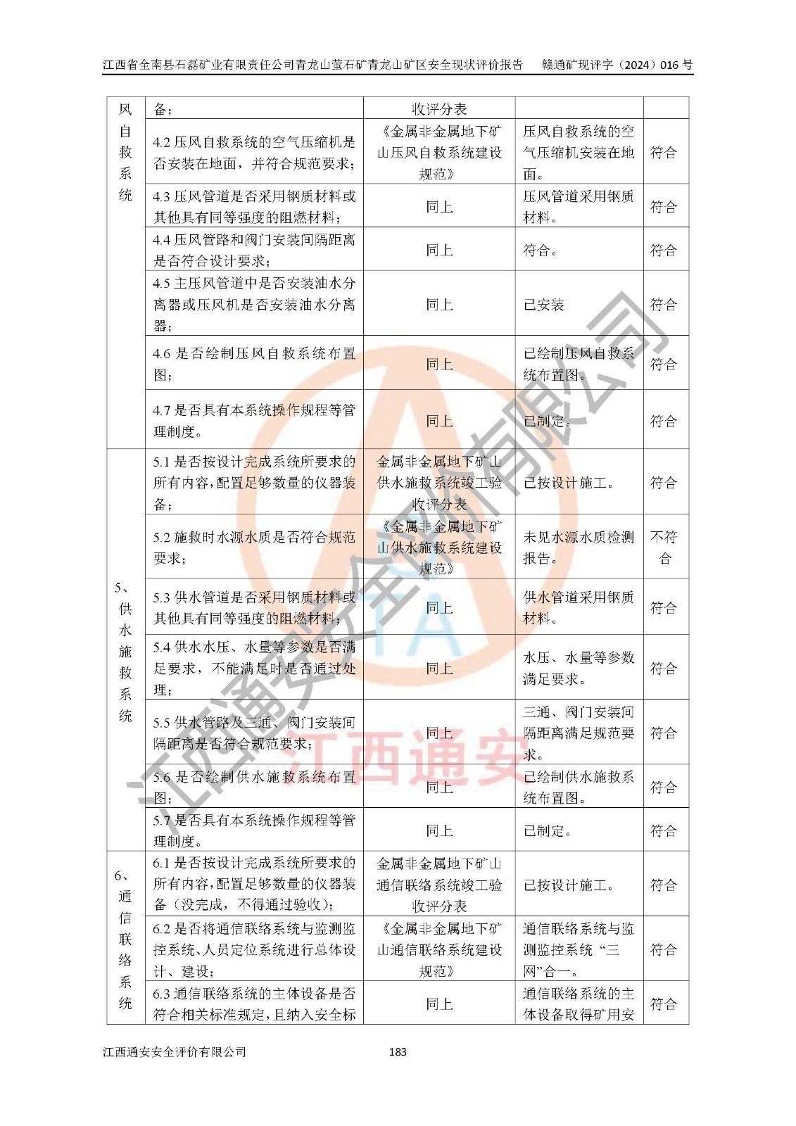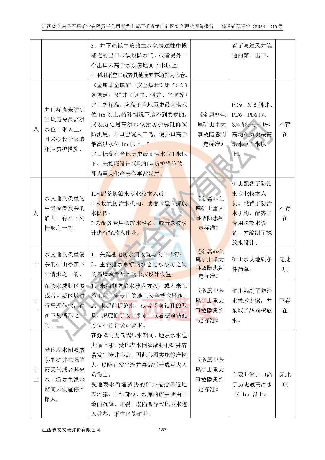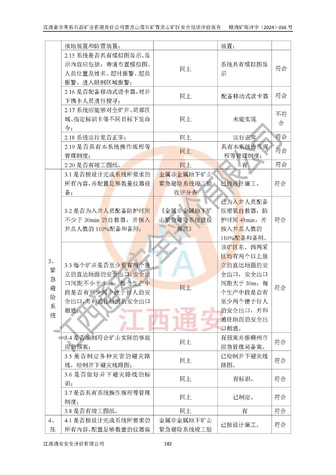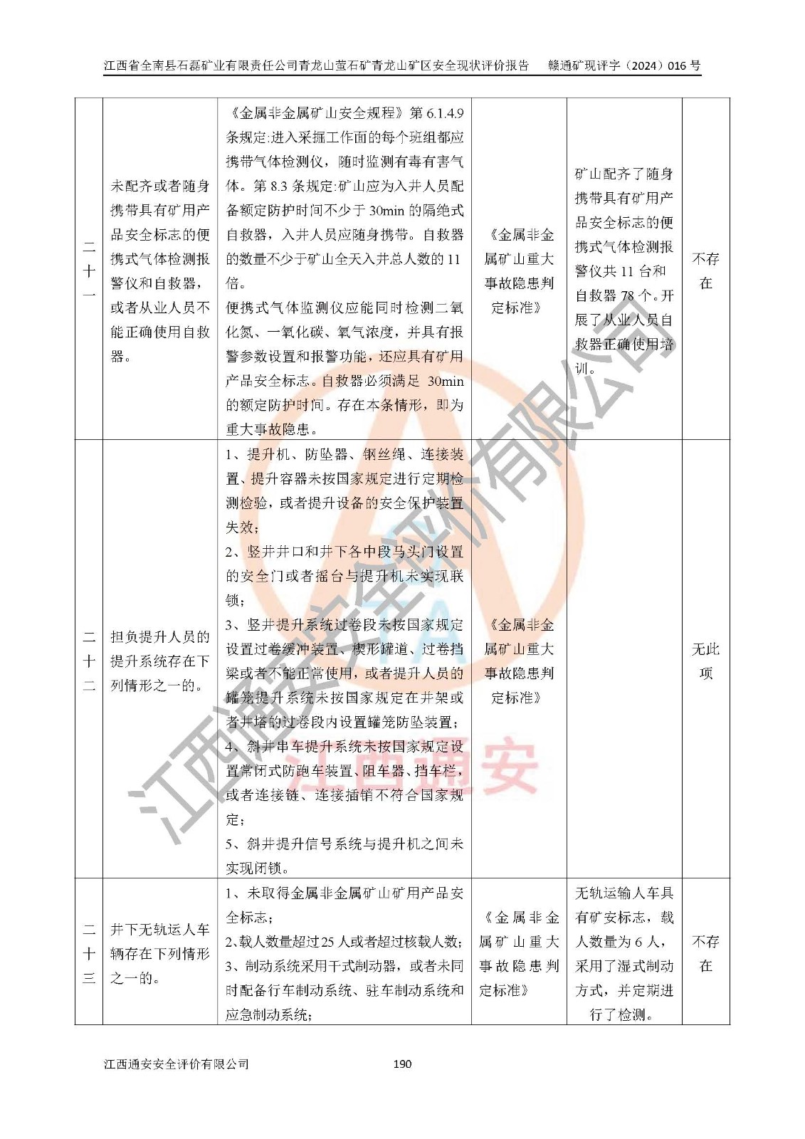 其它 | 江西省全南縣石磊礦業(yè)有限責(zé)任公司青龍山螢石礦青龍山礦區(qū)的主要生產(chǎn)及輔助系統(tǒng):提升運(yùn)輸、排水、供配電、通風(fēng)、供風(fēng)、采掘、充填、安全避險(xiǎn)“六大系統(tǒng)”等基本符合法律法規(guī)要求和規(guī)程、規(guī)范要求;各種危險(xiǎn)有害因素及不可接受的風(fēng)險(xiǎn)在運(yùn)行中認(rèn)真落實(shí)行之**的技術(shù)措施或管理措施,嚴(yán)格按規(guī)程,按要求加強(qiáng)管理,可以避免和控制各類事故,**安全生產(chǎn)?,F(xiàn)階段礦山設(shè)備、設(shè)施和場(chǎng)所符合**安全生產(chǎn)有關(guān)法律、法規(guī)、標(biāo)準(zhǔn)及規(guī)范的規(guī)定。礦山采用平硐+斜坡道聯(lián)合開拓方式,安全生產(chǎn)條件一般;安全管理能滿足法規(guī)要求,礦山地下開采符合**規(guī)定的安全生產(chǎn)條件。 | ||||