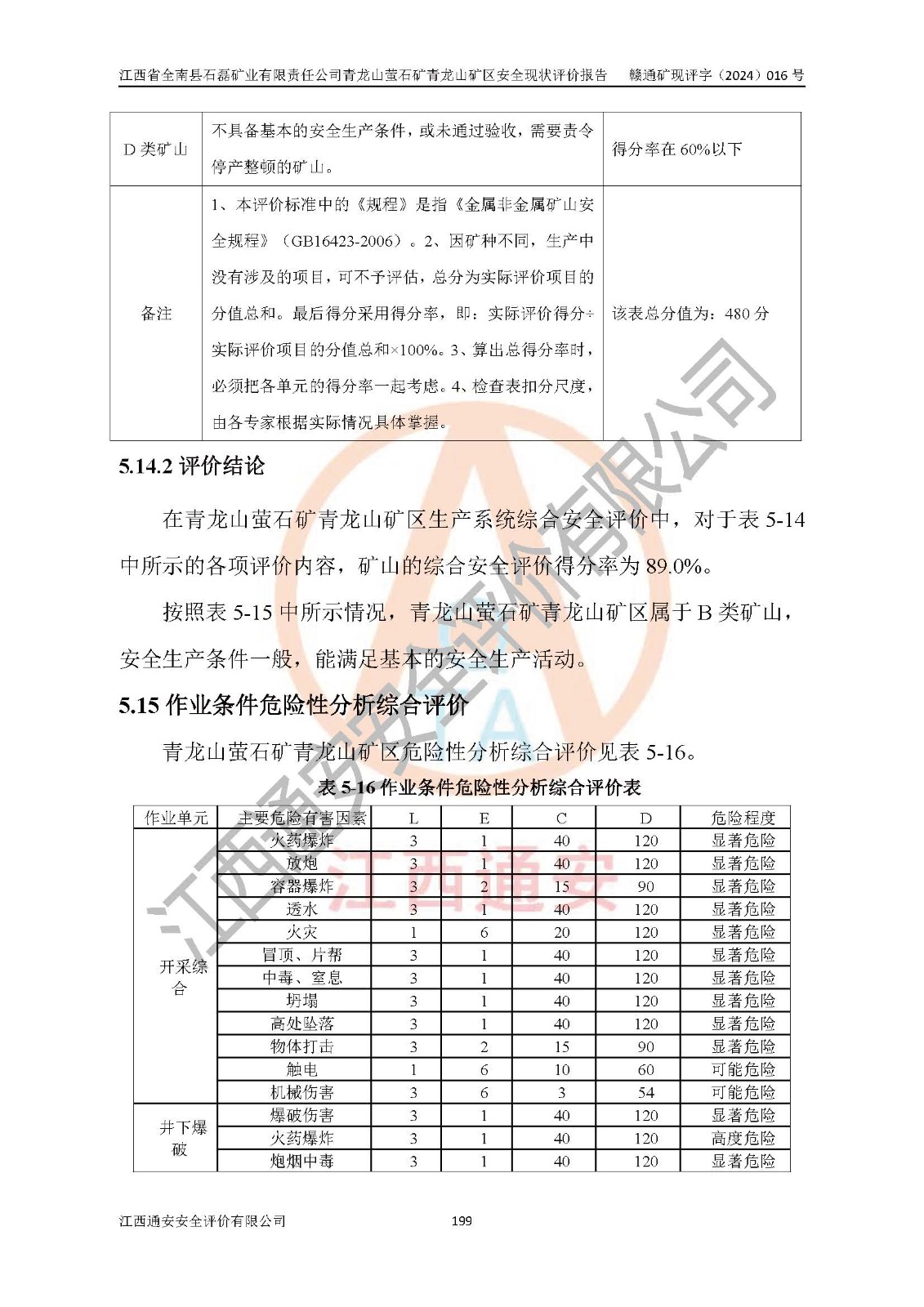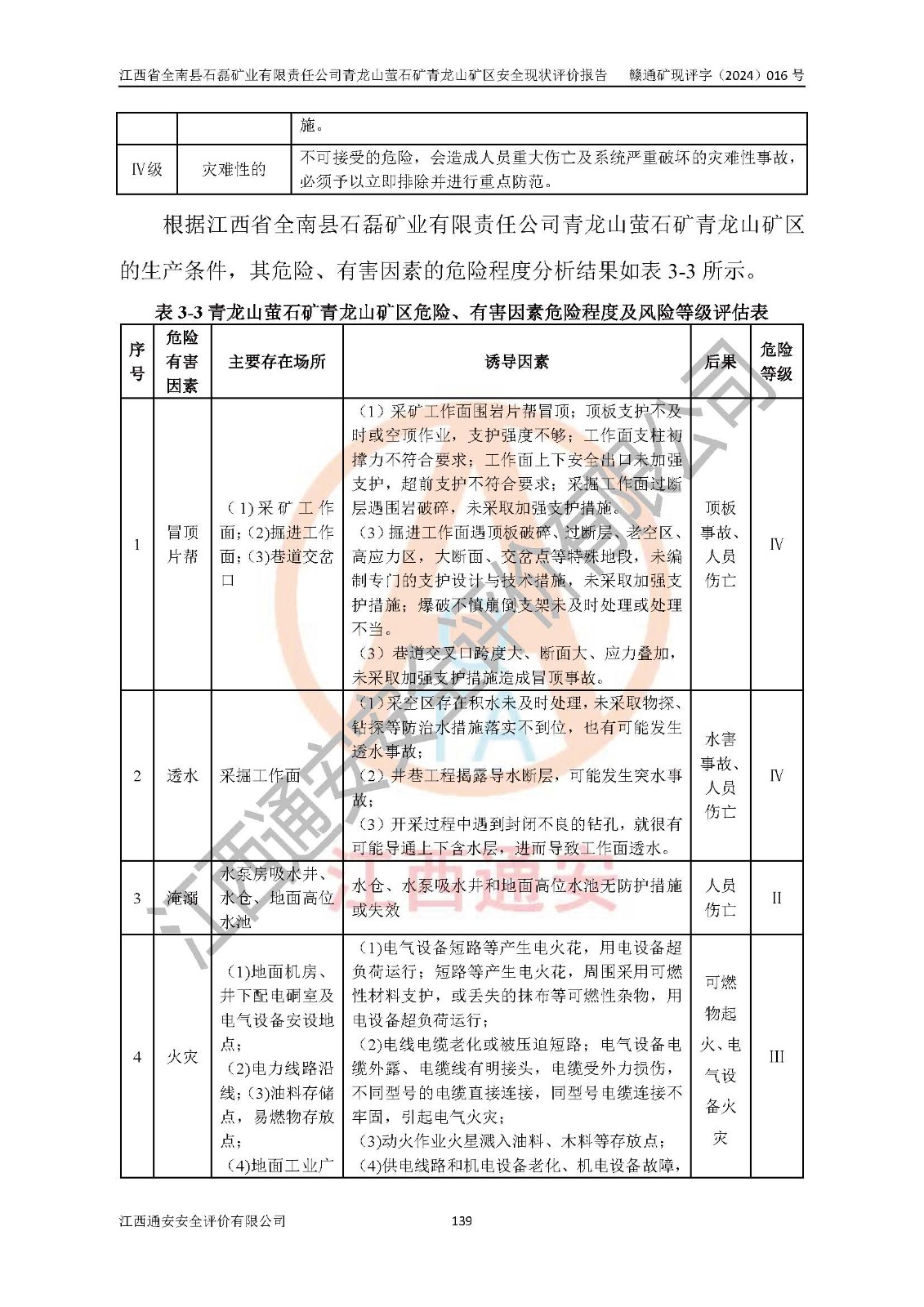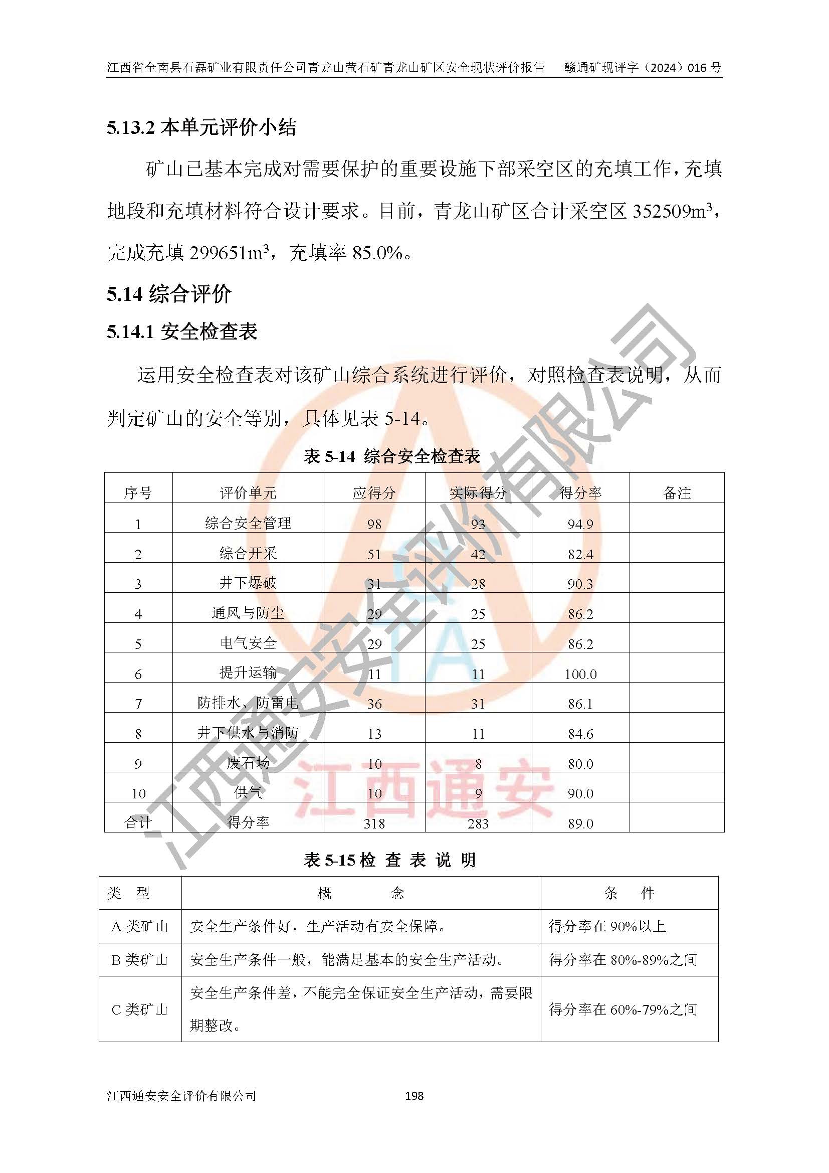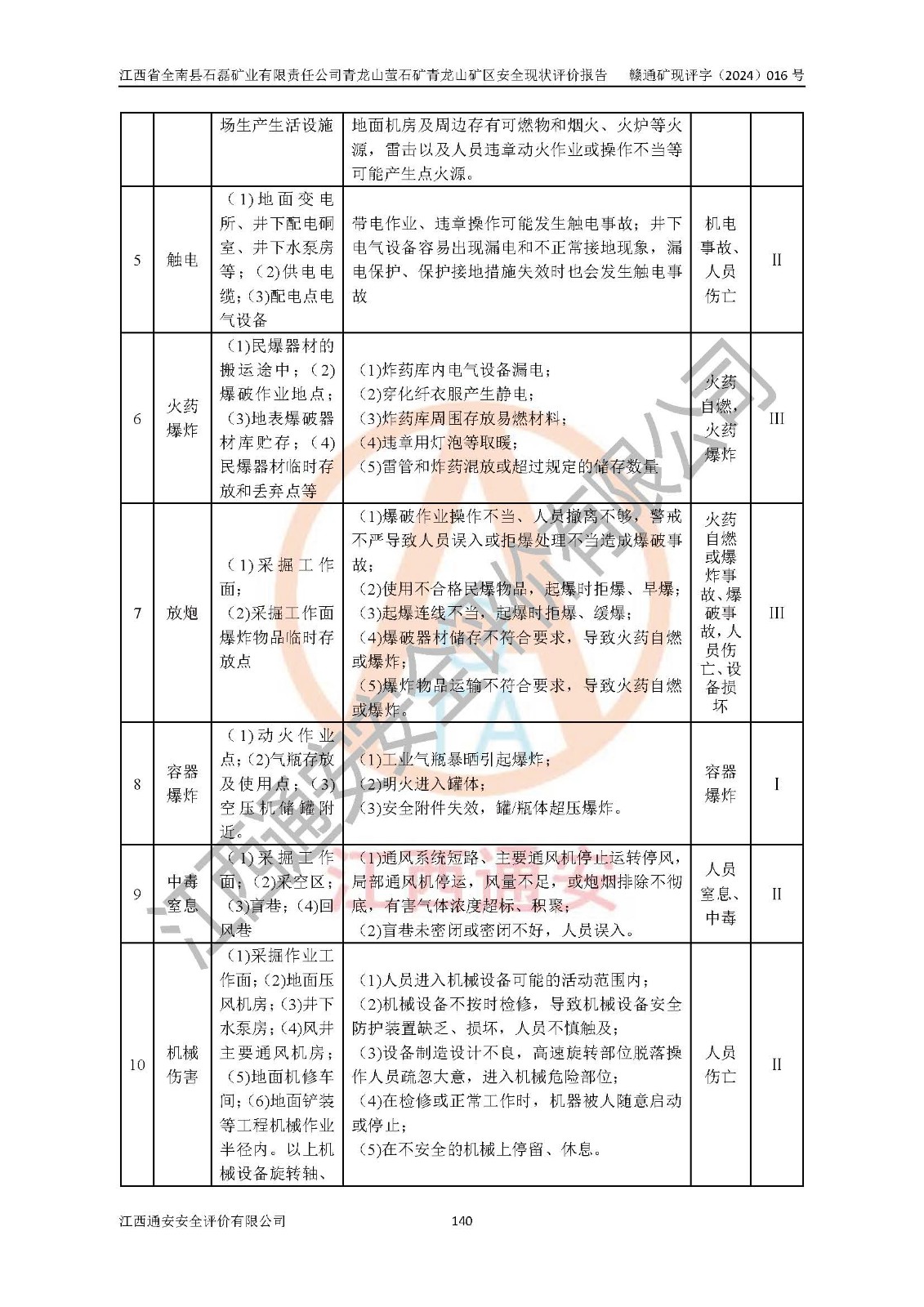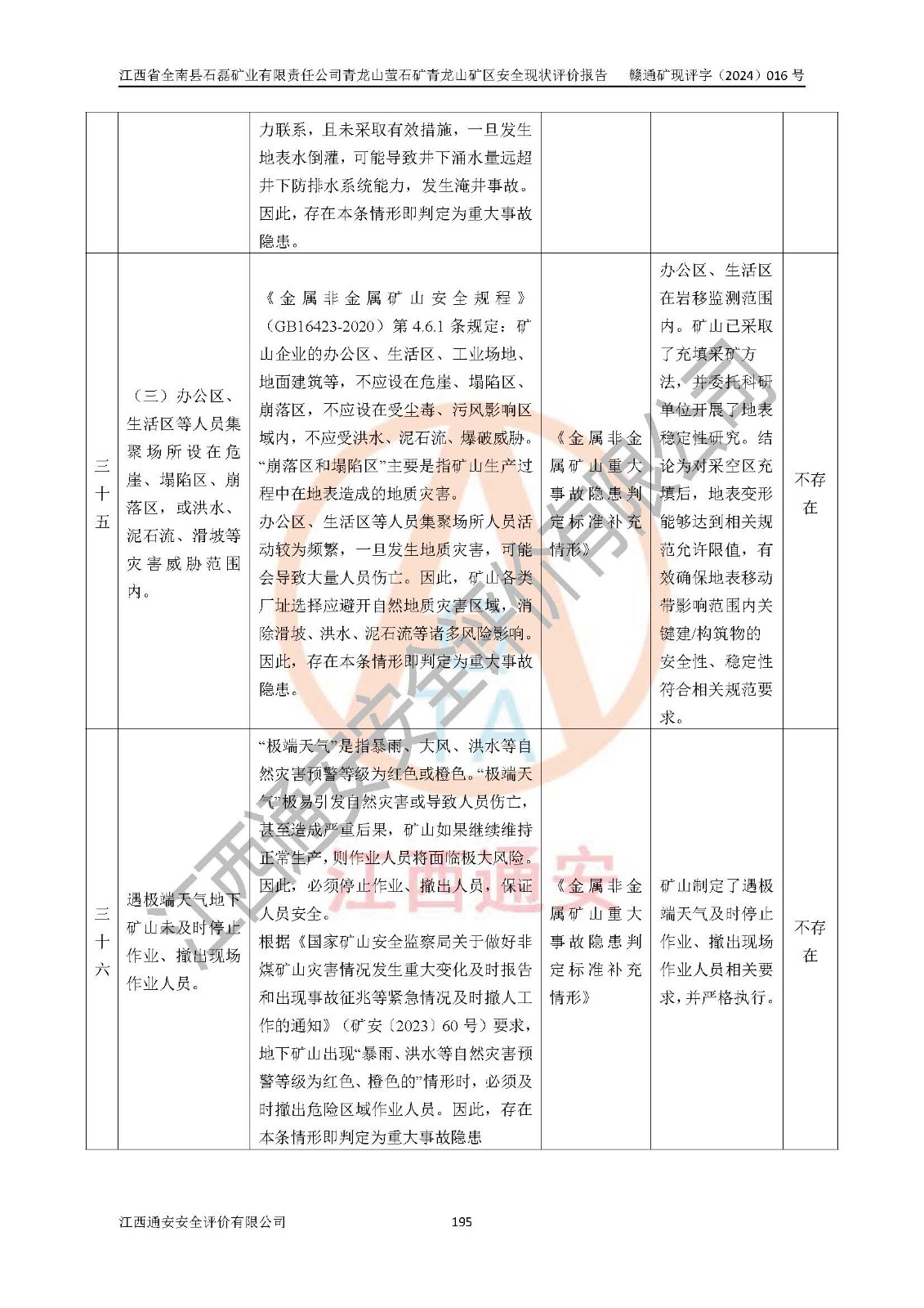 其它 | 江西省全南縣石磊礦業(yè)有限責(zé)任公司青龍山螢石礦青龍山礦區(qū)的主要生產(chǎn)及輔助系統(tǒng):提升運(yùn)輸、排水、供配電、通風(fēng)、供風(fēng)、采掘、充填、安全避險(xiǎn)“六大系統(tǒng)”等基本符合法律法規(guī)要求和規(guī)程、規(guī)范要求;各種危險(xiǎn)有害因素及不可接受的風(fēng)險(xiǎn)在運(yùn)行中認(rèn)真落實(shí)行之**的技術(shù)措施或管理措施,嚴(yán)格按規(guī)程,按要求加強(qiáng)管理,可以避免和控制各類事故,**安全生產(chǎn)?,F(xiàn)階段礦山設(shè)備、設(shè)施和場(chǎng)所符合**安全生產(chǎn)有關(guān)法律、法規(guī)、標(biāo)準(zhǔn)及規(guī)范的規(guī)定。礦山采用平硐+斜坡道聯(lián)合開拓方式,安全生產(chǎn)條件一般;安全管理能滿足法規(guī)要求,礦山地下開采符合**規(guī)定的安全生產(chǎn)條件。 | ||||