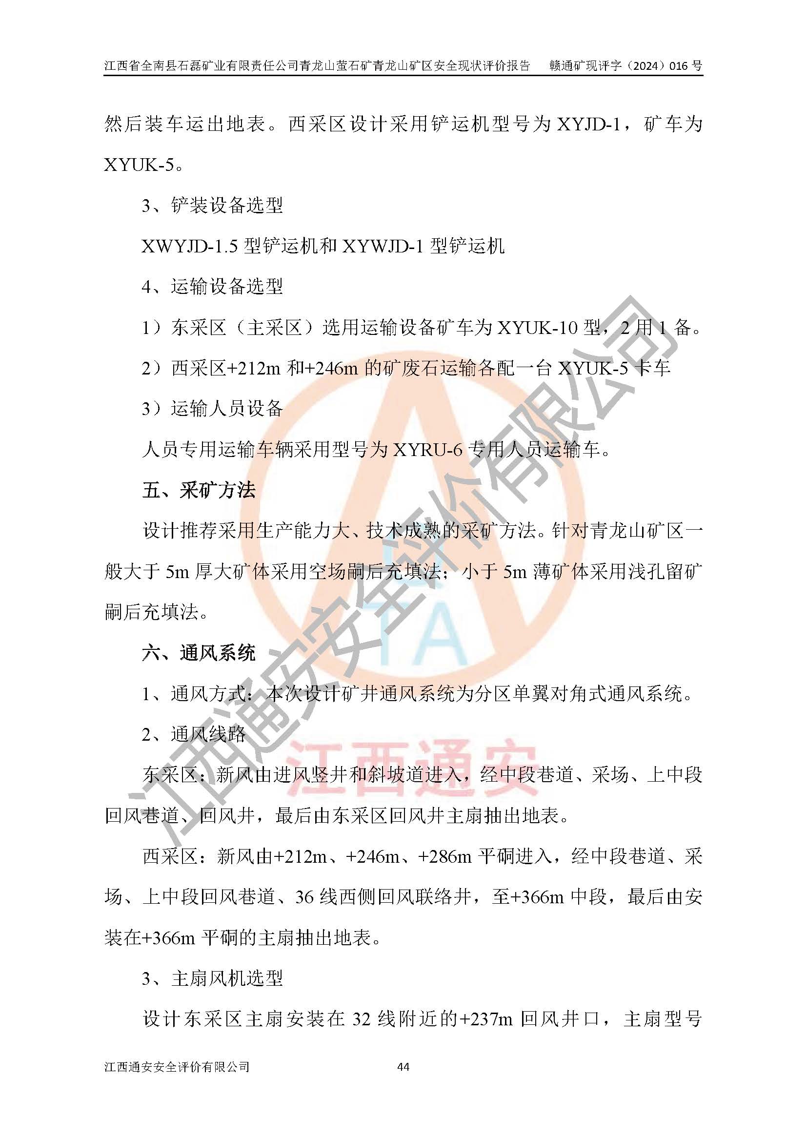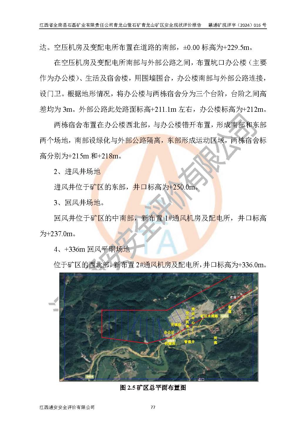 項(xiàng)目簡(jiǎn)介 | 江西省全南縣石磊礦業(yè)有限責(zé)任公司青龍山螢石礦礦區(qū)位于全南縣城北北東20°直距約36km處,行政區(qū)劃隸屬全南縣社逕鄉(xiāng)和陂頭鎮(zhèn)管轄,礦區(qū)地理坐標(biāo):東經(jīng)114°36′52″~114°37′52″,北緯25°03′16″~25°04′10″,礦區(qū)面積:1.4005km2。 江西省全南縣石磊礦業(yè)有限責(zé)任公司青龍山螢石礦上世紀(jì)90年代初期有當(dāng)?shù)孛窆ぴ谠摰V區(qū)進(jìn)行開采,主要是對(duì)V1、V2、V7號(hào)礦體進(jìn)行地下開采。由于開采秩序混亂,2002年全南縣對(duì)青龍山螢石礦進(jìn)行整治,并作為縣招商引資項(xiàng)目,將青龍山螢石資源整合后由江西省全南縣石磊礦業(yè)有限責(zé)任公司進(jìn)行開采經(jīng)營(yíng)。2002年10月江西省全南縣石磊礦業(yè)有限責(zé)任公司依法取得采礦權(quán)并接管青龍山螢石礦。2003年7月由贛州市地質(zhì)隊(duì)對(duì)全南縣青龍山螢石礦區(qū)(東段)進(jìn)行了普查工作,完成了《江西省全南縣青龍山螢石礦區(qū)(東段)資源儲(chǔ)量普查報(bào)告》。2006年南方冶金學(xué)院編制了劃定礦區(qū)范圍(現(xiàn)采礦證范圍)的《江西省全南縣青龍山螢石礦礦產(chǎn)資源開發(fā)利用方案》,并于當(dāng)年8月取得新采礦許可證。青龍山螢石礦采礦許可證范圍內(nèi)有兩個(gè)獨(dú)立的地下開采生產(chǎn)系統(tǒng),即青龍山礦區(qū)和井水寨礦區(qū)。本次評(píng)價(jià)為青龍山礦區(qū)。 2008年,礦山委托了江西冶金設(shè)計(jì)院對(duì)青龍山礦區(qū)進(jìn)行了開采設(shè)計(jì),規(guī)模為12萬(wàn)噸/年,共設(shè)有+286m、+246 m、+212 m、+177 m、+127 m、+87m等六個(gè)中段,采用平硐+豎井聯(lián)合開拓。+212m以上為平硐開拓,以下為豎井開拓。設(shè)計(jì)布置了兩條豎井,一條為26線主豎井(2#豎井),服務(wù)+87m中段;另一條為28線的副豎井(1#豎井),服務(wù)+127m和+177m兩個(gè)中段。該項(xiàng)目于2012年完成“三同時(shí)”驗(yàn)收,于2012年9月26日取得江西省安全生產(chǎn)監(jiān)督管理局換發(fā)的安全生產(chǎn)許可證((贛)FM安許證字[2012]M1603),許可開采范圍為上述六個(gè)中段。隨著生產(chǎn)向下延深,經(jīng)過(guò)2015年、2018年、2021年多次延期換證,許可范圍縮減至目前的+87m中段,生產(chǎn)規(guī)模為12萬(wàn)t/a。 由于青龍山礦區(qū)安全生產(chǎn)許可范圍內(nèi)可采礦量不足以維持12萬(wàn)t/a產(chǎn)能,企業(yè)急需擴(kuò)大礦山年產(chǎn)量。2020年4月中國(guó)瑞林工程技術(shù)股份有限公司編制了《江西省全南縣石磊礦業(yè)有限責(zé)任公司青龍山螢石礦青龍山礦區(qū)擴(kuò)建工程初步設(shè)計(jì)和安全設(shè)施設(shè)計(jì)》,并向全南縣工業(yè)和信息化局申請(qǐng)了立項(xiàng)。全南縣工業(yè)和信息化局于2020年7月9日下達(dá)了“江西省工業(yè)企業(yè)技術(shù)改造項(xiàng)目備案通知書”。 中國(guó)瑞林工程技術(shù)股份有限公司編制的《江西省全南縣石磊礦業(yè)有限責(zé)任公司青龍山螢石礦青龍山礦區(qū)擴(kuò)建工程安全設(shè)施設(shè)計(jì)》主要設(shè)計(jì)內(nèi)容有:設(shè)計(jì)開采范圍為青龍山礦區(qū)20~36′線+0m~+366m標(biāo)高之間,其中20~32線東采區(qū)為0m~+212m標(biāo)高,32~36′線西采區(qū)為+212m~+366m標(biāo)高之間;采礦方法為分段空?qǐng)鏊煤蟪涮罘ê蜏\孔留礦嗣后充填法;開拓運(yùn)輸系統(tǒng):采用分區(qū)開拓方式,32線以東為東采區(qū),以西為西采區(qū)。東采區(qū)(主采區(qū))采用斜坡道開拓,共設(shè)有+127m(回風(fēng)中段)、+87m、+47m、+0m等中段,其中+47m、+0m 為新設(shè)中段,其他為已開拓中段。各中段礦石、廢石、人員和設(shè)備均從斜坡道進(jìn)出。西采區(qū)采用平硐開拓,共設(shè)+336m(回風(fēng)中段)、+286m、+246m、+212m(運(yùn)輸中段)等中段,其中+212m、+246m為已開拓中段,其余為新設(shè)計(jì)中段;各中段礦石溜至+212m平硐出地表,廢石溜至+246m平硐出地表,人員、設(shè)備、材料從各平硐進(jìn)出。設(shè)計(jì)首采地段確定東采區(qū)為現(xiàn)有已生產(chǎn)的+87m中段和西采區(qū)的+286m中段;礦井運(yùn)輸為無(wú)軌運(yùn)輸;通風(fēng)系統(tǒng)為東西區(qū)分區(qū)單翼抽出式通風(fēng),在32線新開拓東采區(qū)總回風(fēng)聯(lián)絡(luò)井(+237m~+0m中段),在36線以西+336m平硐內(nèi)新開拓西采區(qū)總回風(fēng)聯(lián)絡(luò)井(+336m~+212m中段);排水系統(tǒng)為0m中段集中排水;礦山供電電源引自全南縣陂頭鎮(zhèn)35kv變電站和社逕鄉(xiāng)江口35kv變電站的兩路架空線進(jìn)入礦區(qū);原2#豎井改作上部管纜井,新建+87m至0m天井作深部管纜井;在20線以東新建進(jìn)風(fēng)豎井至0m中段,新建全尾砂膠結(jié)充填系統(tǒng),對(duì)開采移動(dòng)影響地段礦區(qū)內(nèi)的房屋、公路、河流和斜坡道井口、原2#豎井以及+212m運(yùn)輸巷道等進(jìn)行高強(qiáng)度充填體處理采空區(qū)。 2020年5月20日取得江西省應(yīng)急管理廳下達(dá)的《江西省全南縣石磊礦業(yè)有限責(zé)任公司青龍山螢石礦青龍山礦區(qū)擴(kuò)建工程安全設(shè)施設(shè)計(jì)的審查意見》(贛應(yīng)急非煤項(xiàng)目設(shè)審[2020]26號(hào))。 2022年7月,礦山委托江西通安安全評(píng)價(jià)有限公司編制了《江西省全南縣