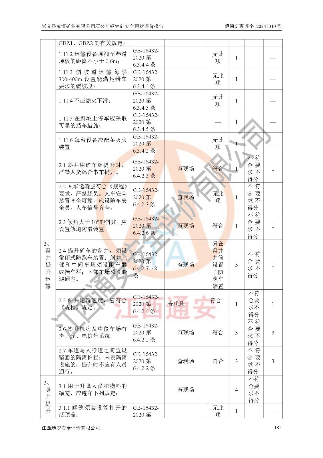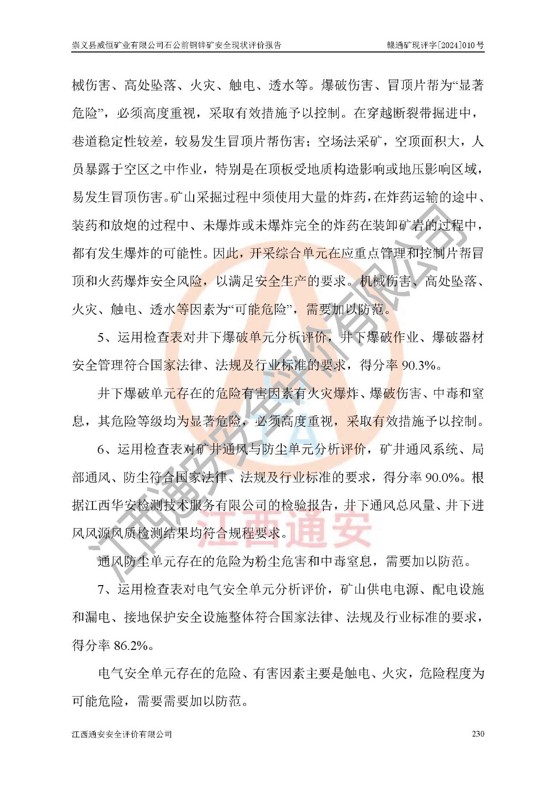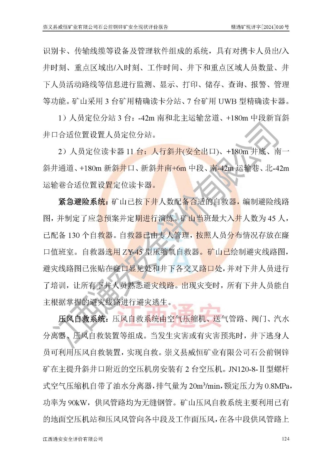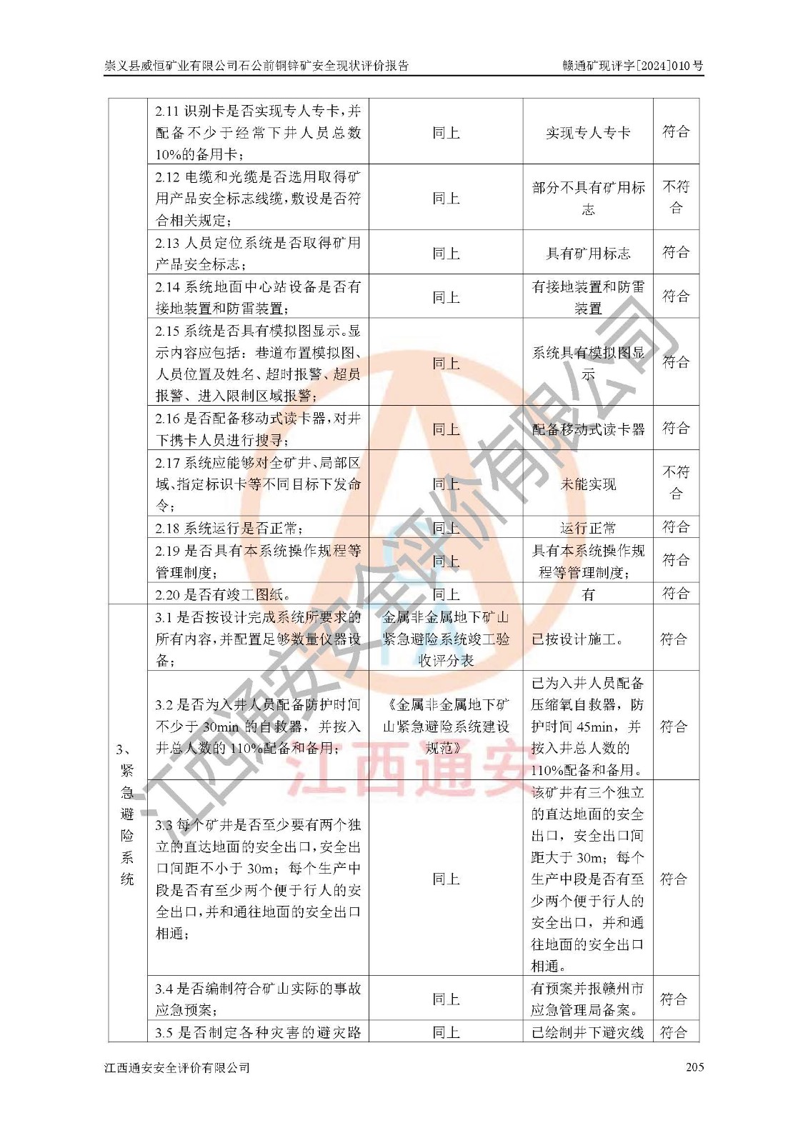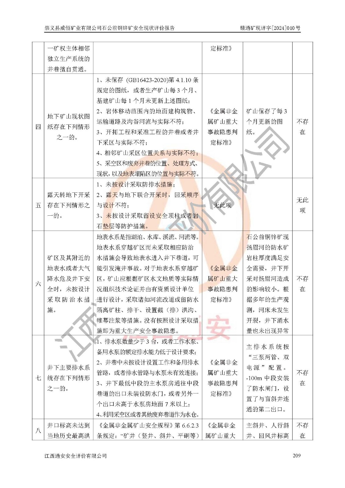 其它 | 崇義縣威恒礦業(yè)有限公司石公前銅鋅礦的主要生產(chǎn)及輔助系統(tǒng):提升運輸、排水、供配電、通風(fēng)、供風(fēng)、采掘、安全避險“六大系統(tǒng)”等基本符合法律法規(guī)要求和規(guī)程、規(guī)范要求;各種危險有害因素及不可接受的風(fēng)險在運行中認(rèn)真落實行之**的技術(shù)措施或管理措施,嚴(yán)格按規(guī)程,按要求加強管理,可以避免和控制各類事故,**安全生產(chǎn)。現(xiàn)階段礦山設(shè)備、設(shè)施和場所符合**安全生產(chǎn)有關(guān)法律、法規(guī)、標(biāo)準(zhǔn)及規(guī)范的規(guī)定。礦山采用斜井+盲斜井聯(lián)合開拓方式,安全生產(chǎn)條件一般;安全管理能滿足法規(guī)要求,礦山地下開采符合**規(guī)定的安全生產(chǎn)條件。 | ||||