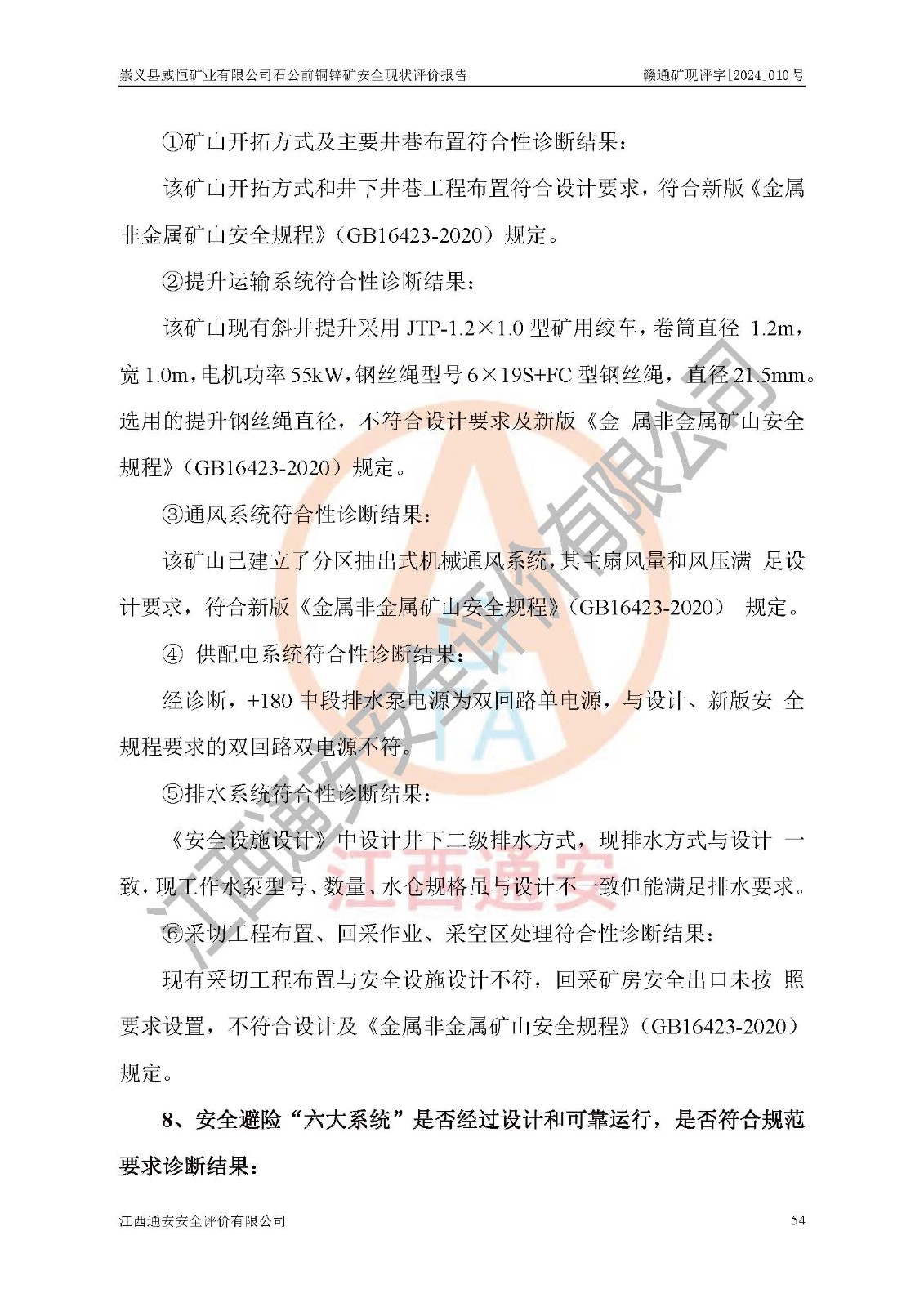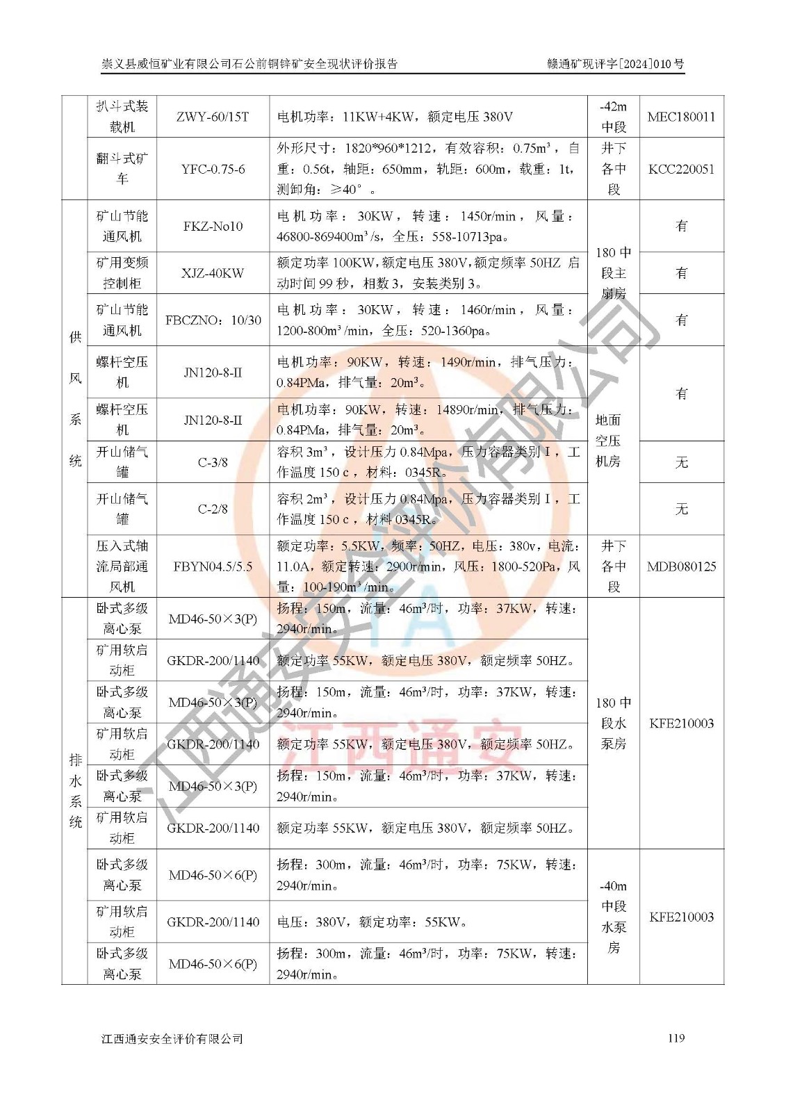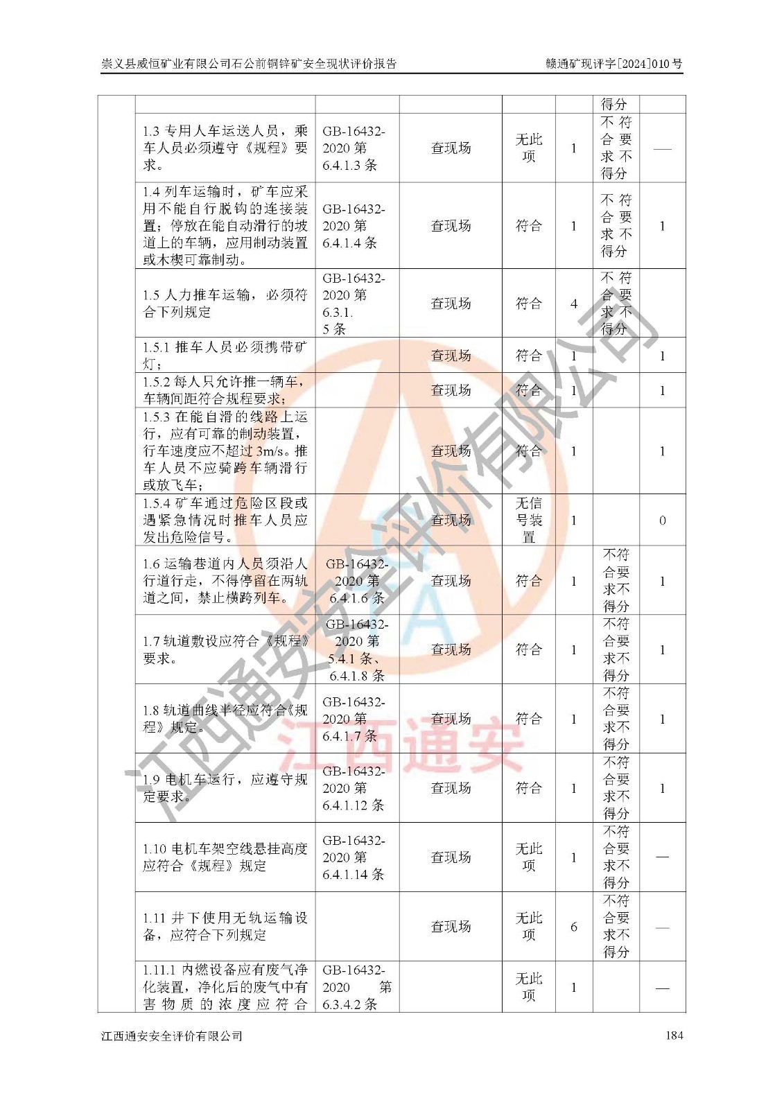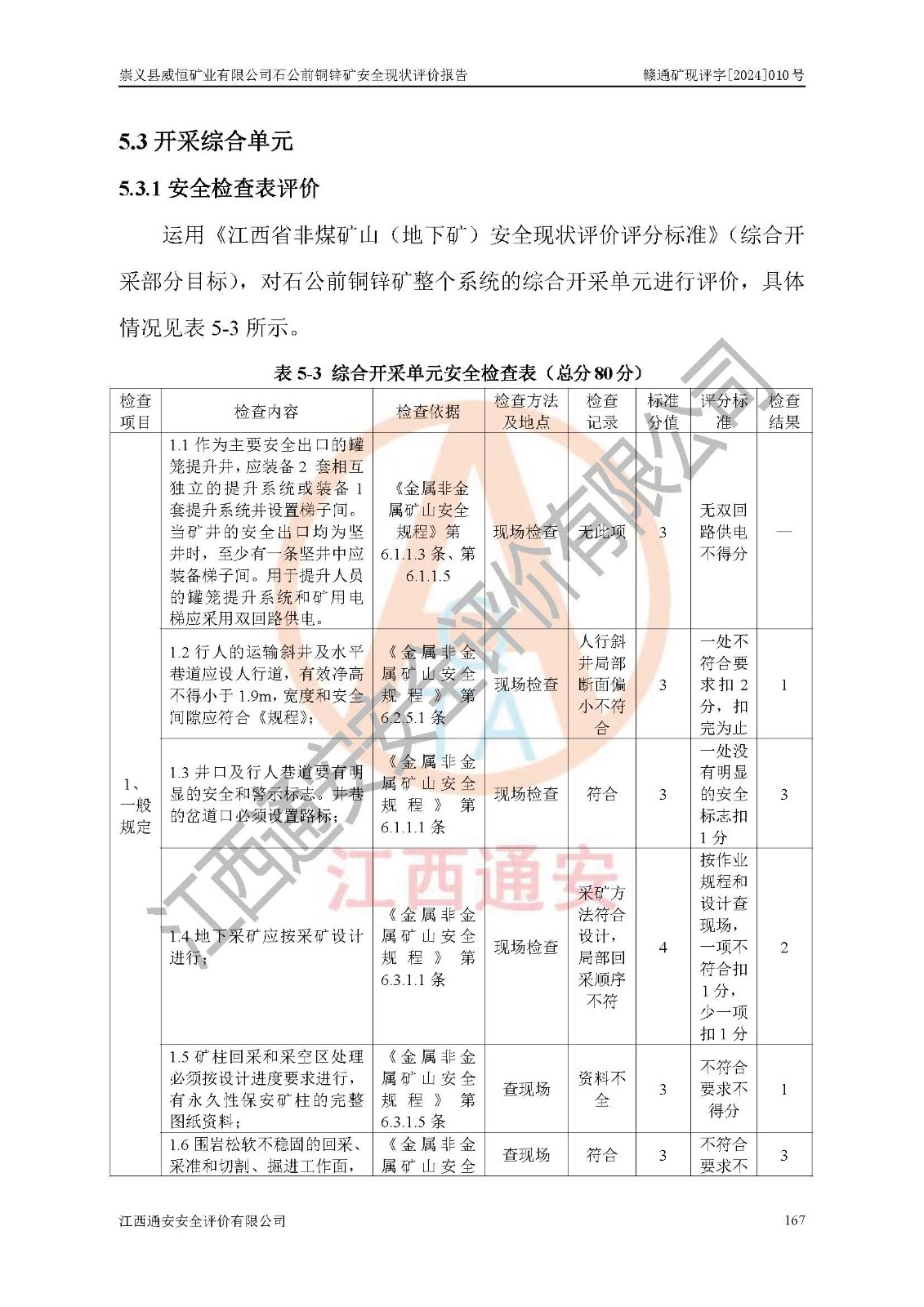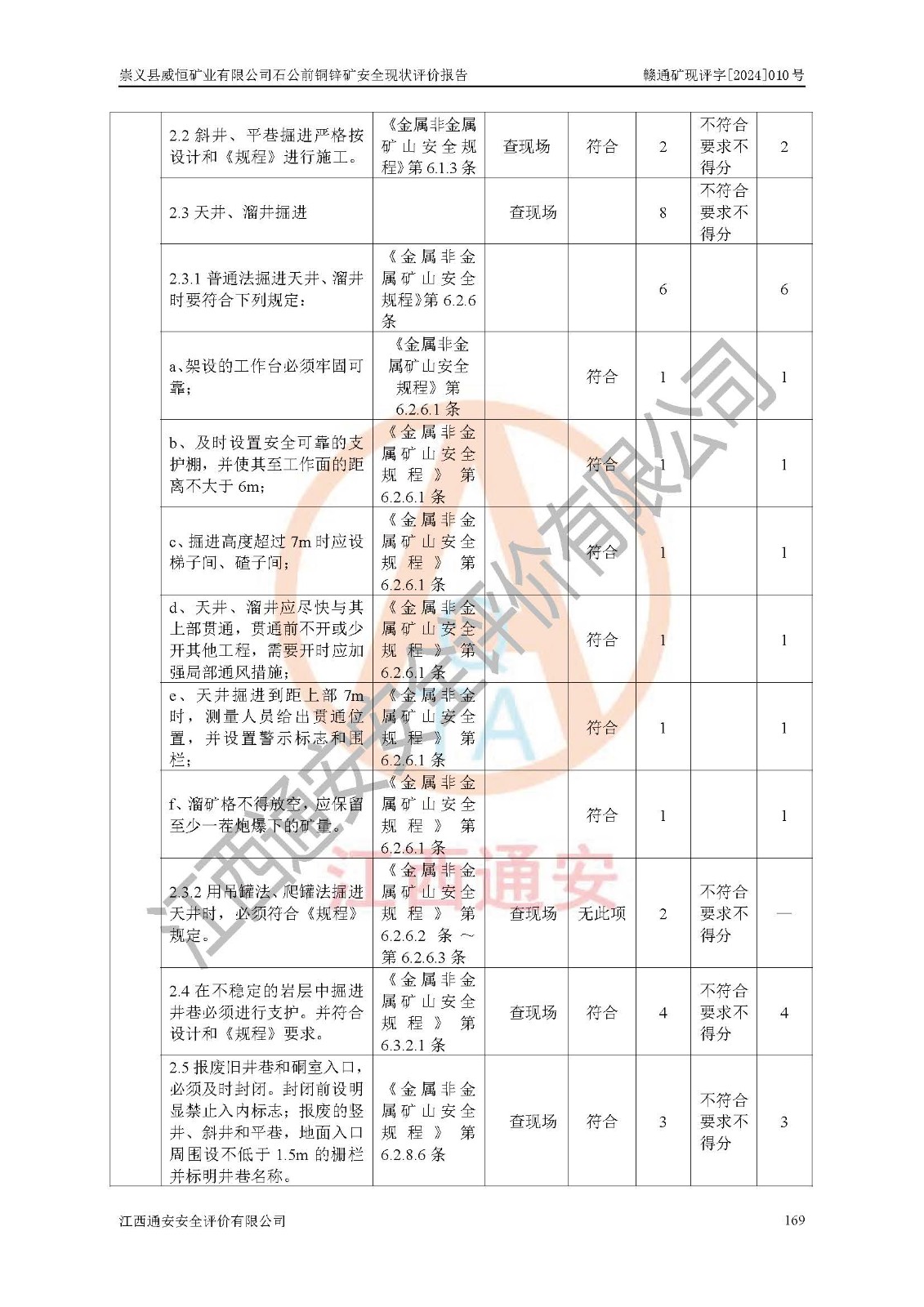 其它 | 崇義縣威恒礦業(yè)有限公司石公前銅鋅礦的主要生產(chǎn)及輔助系統(tǒng):提升運輸、排水、供配電、通風(fēng)、供風(fēng)、采掘、安全避險“六大系統(tǒng)”等基本符合法律法規(guī)要求和規(guī)程、規(guī)范要求;各種危險有害因素及不可接受的風(fēng)險在運行中認(rèn)真落實行之**的技術(shù)措施或管理措施,嚴(yán)格按規(guī)程,按要求加強管理,可以避免和控制各類事故,**安全生產(chǎn)。現(xiàn)階段礦山設(shè)備、設(shè)施和場所符合**安全生產(chǎn)有關(guān)法律、法規(guī)、標(biāo)準(zhǔn)及規(guī)范的規(guī)定。礦山采用斜井+盲斜井聯(lián)合開拓方式,安全生產(chǎn)條件一般;安全管理能滿足法規(guī)要求,礦山地下開采符合**規(guī)定的安全生產(chǎn)條件。 | ||||
