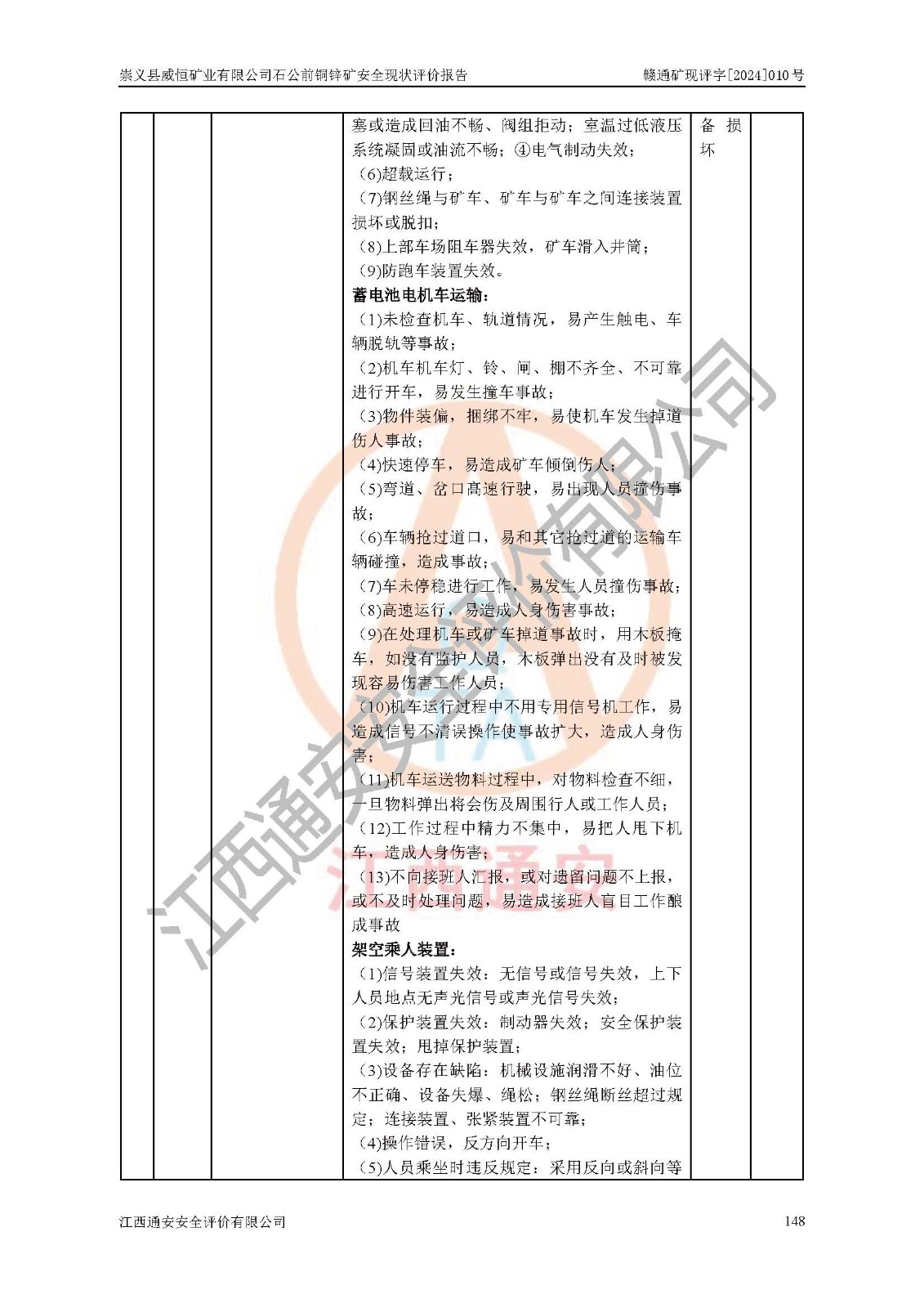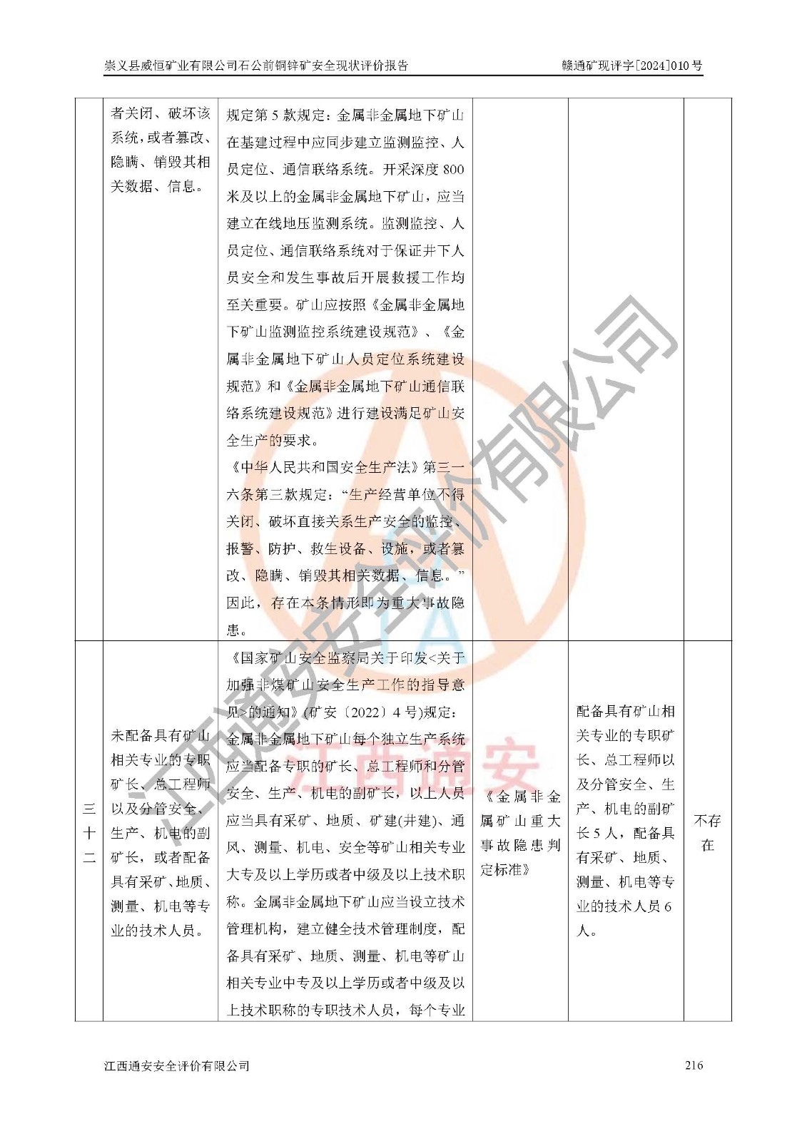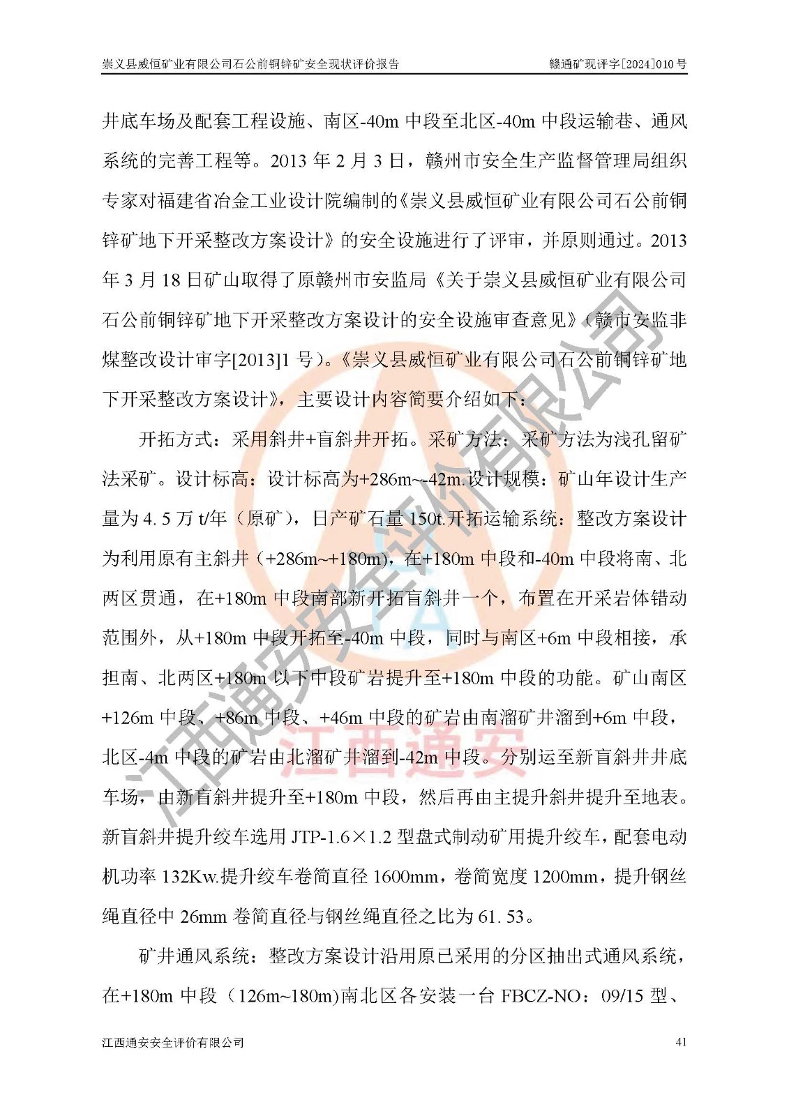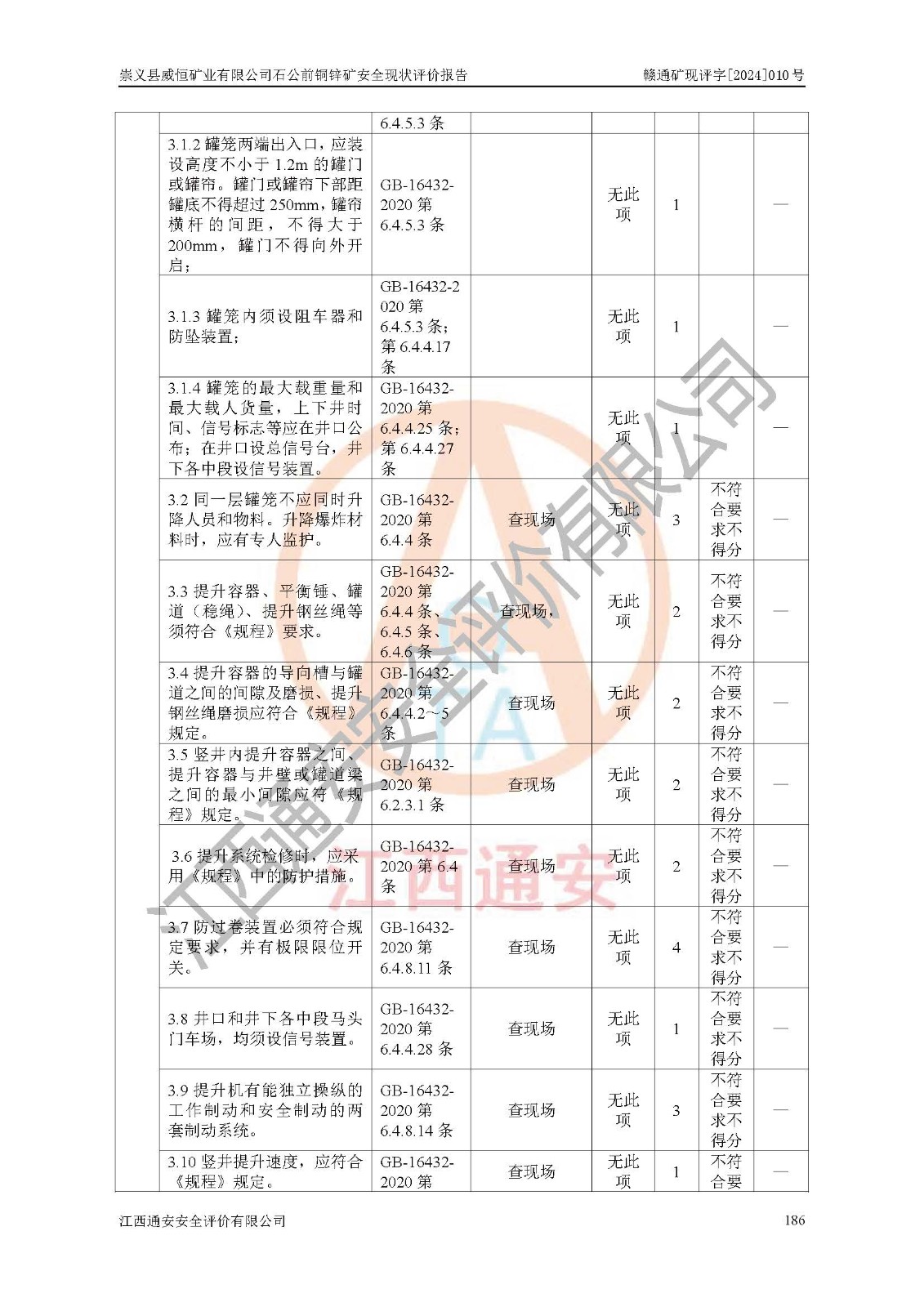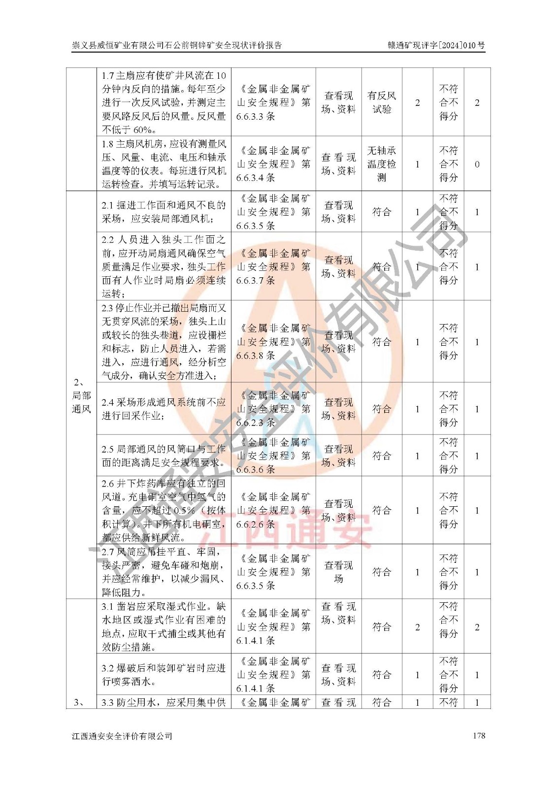 其它 | 崇義縣威恒礦業(yè)有限公司石公前銅鋅礦的主要生產(chǎn)及輔助系統(tǒng):提升運輸、排水、供配電、通風(fēng)、供風(fēng)、采掘、安全避險“六大系統(tǒng)”等基本符合法律法規(guī)要求和規(guī)程、規(guī)范要求;各種危險有害因素及不可接受的風(fēng)險在運行中認(rèn)真落實行之**的技術(shù)措施或管理措施,嚴(yán)格按規(guī)程,按要求加強管理,可以避免和控制各類事故,**安全生產(chǎn)。現(xiàn)階段礦山設(shè)備、設(shè)施和場所符合**安全生產(chǎn)有關(guān)法律、法規(guī)、標(biāo)準(zhǔn)及規(guī)范的規(guī)定。礦山采用斜井+盲斜井聯(lián)合開拓方式,安全生產(chǎn)條件一般;安全管理能滿足法規(guī)要求,礦山地下開采符合**規(guī)定的安全生產(chǎn)條件。 | ||||