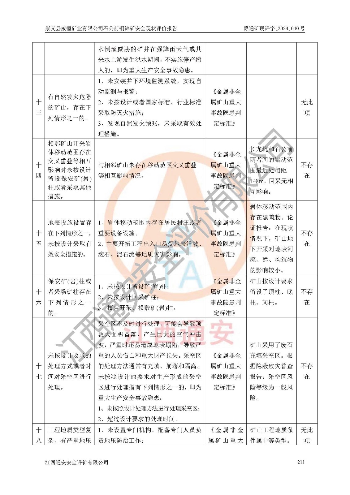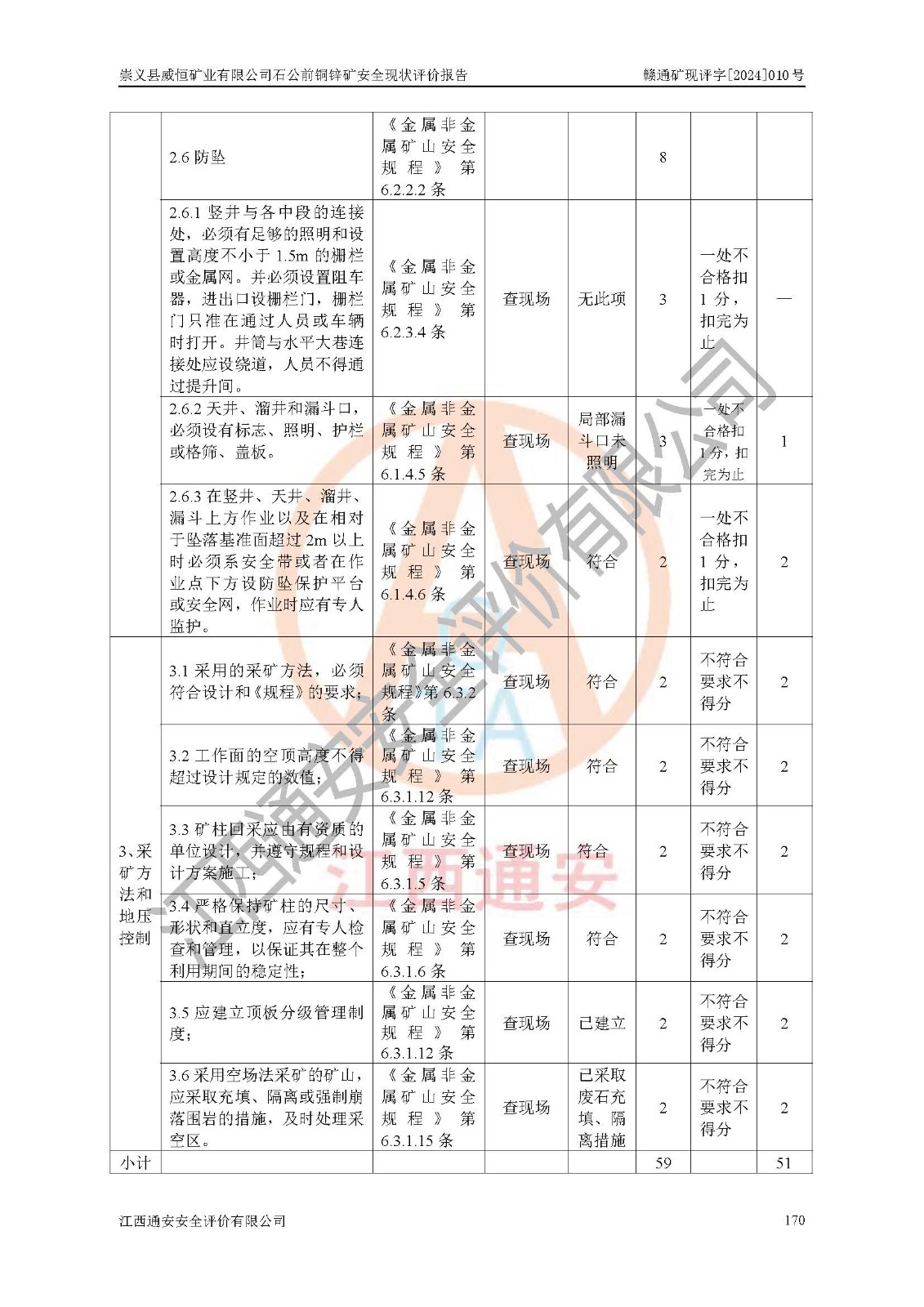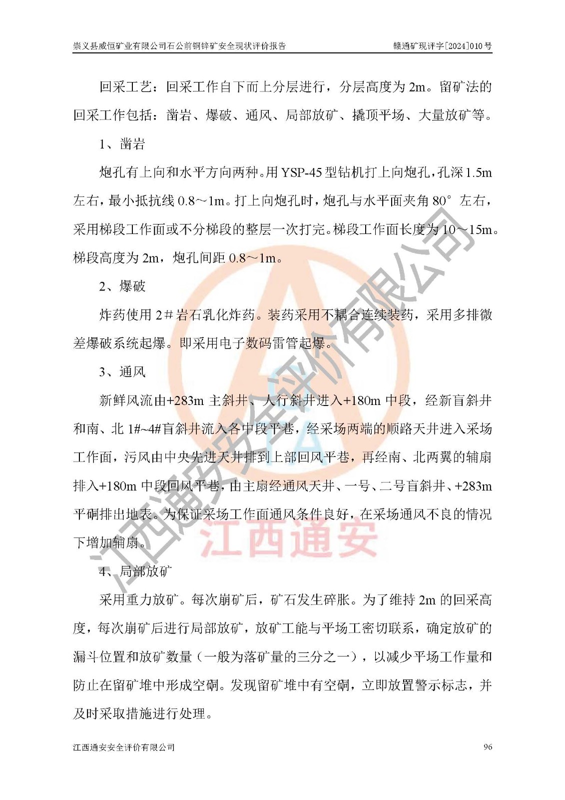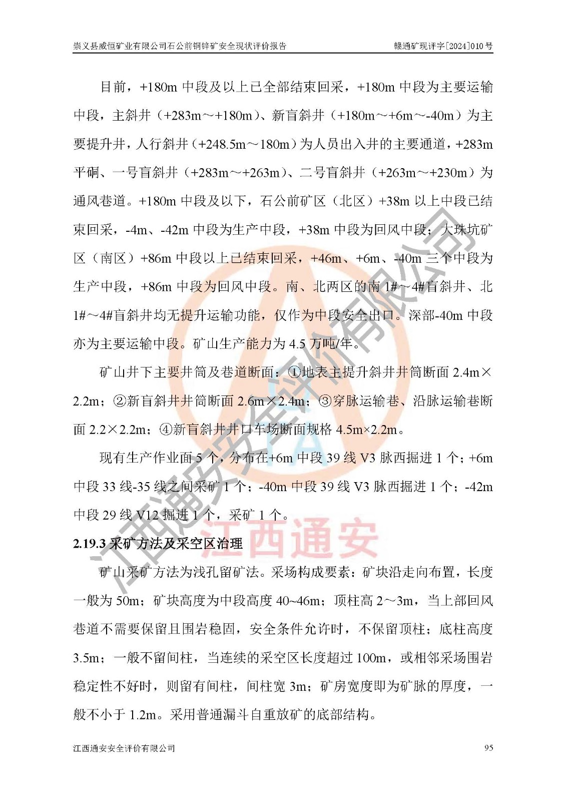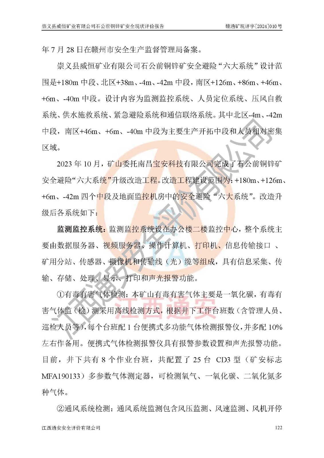 其它 | 崇義縣威恒礦業(yè)有限公司石公前銅鋅礦的主要生產(chǎn)及輔助系統(tǒng):提升運輸、排水、供配電、通風(fēng)、供風(fēng)、采掘、安全避險“六大系統(tǒng)”等基本符合法律法規(guī)要求和規(guī)程、規(guī)范要求;各種危險有害因素及不可接受的風(fēng)險在運行中認(rèn)真落實行之**的技術(shù)措施或管理措施,嚴(yán)格按規(guī)程,按要求加強管理,可以避免和控制各類事故,**安全生產(chǎn)。現(xiàn)階段礦山設(shè)備、設(shè)施和場所符合**安全生產(chǎn)有關(guān)法律、法規(guī)、標(biāo)準(zhǔn)及規(guī)范的規(guī)定。礦山采用斜井+盲斜井聯(lián)合開拓方式,安全生產(chǎn)條件一般;安全管理能滿足法規(guī)要求,礦山地下開采符合**規(guī)定的安全生產(chǎn)條件。 | ||||