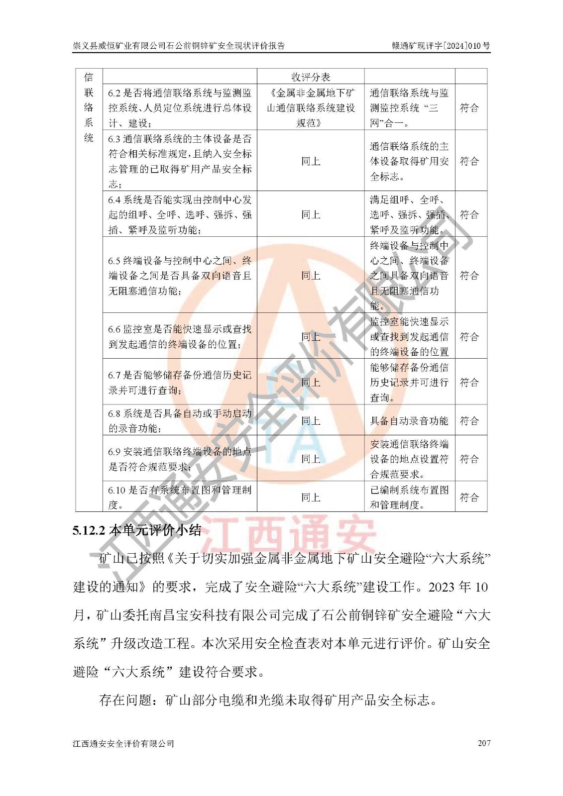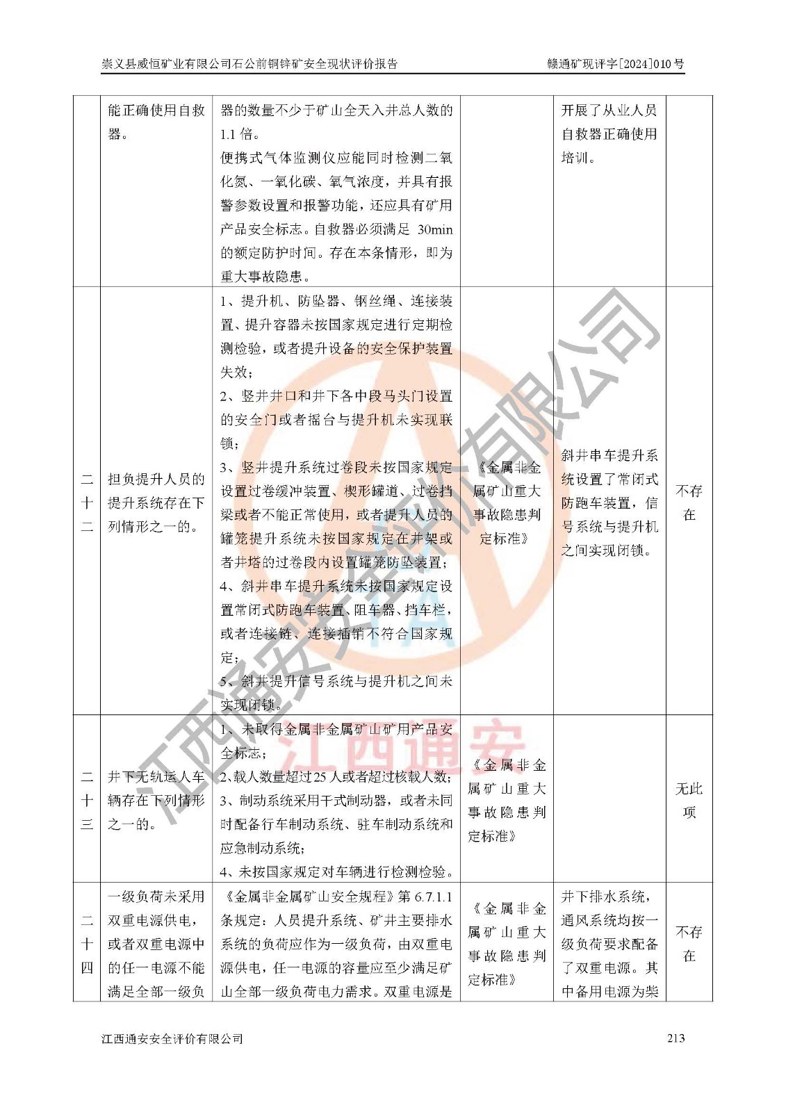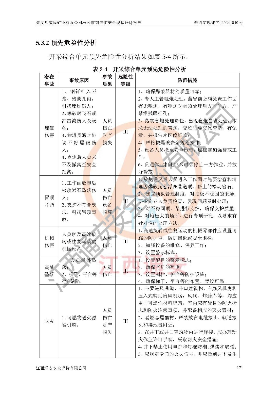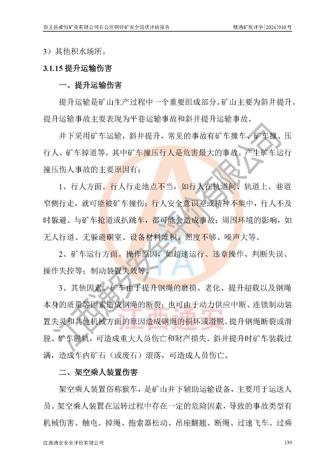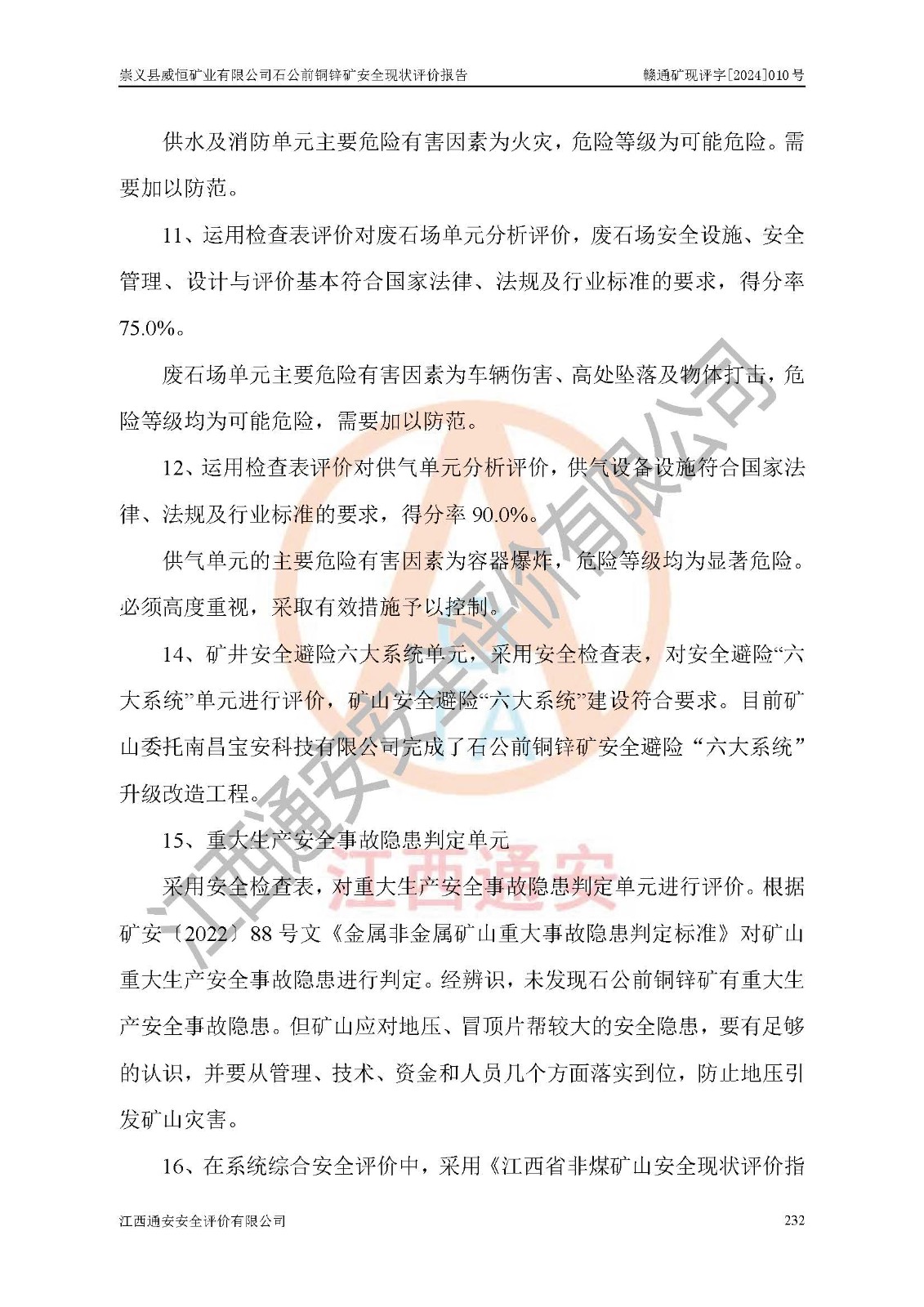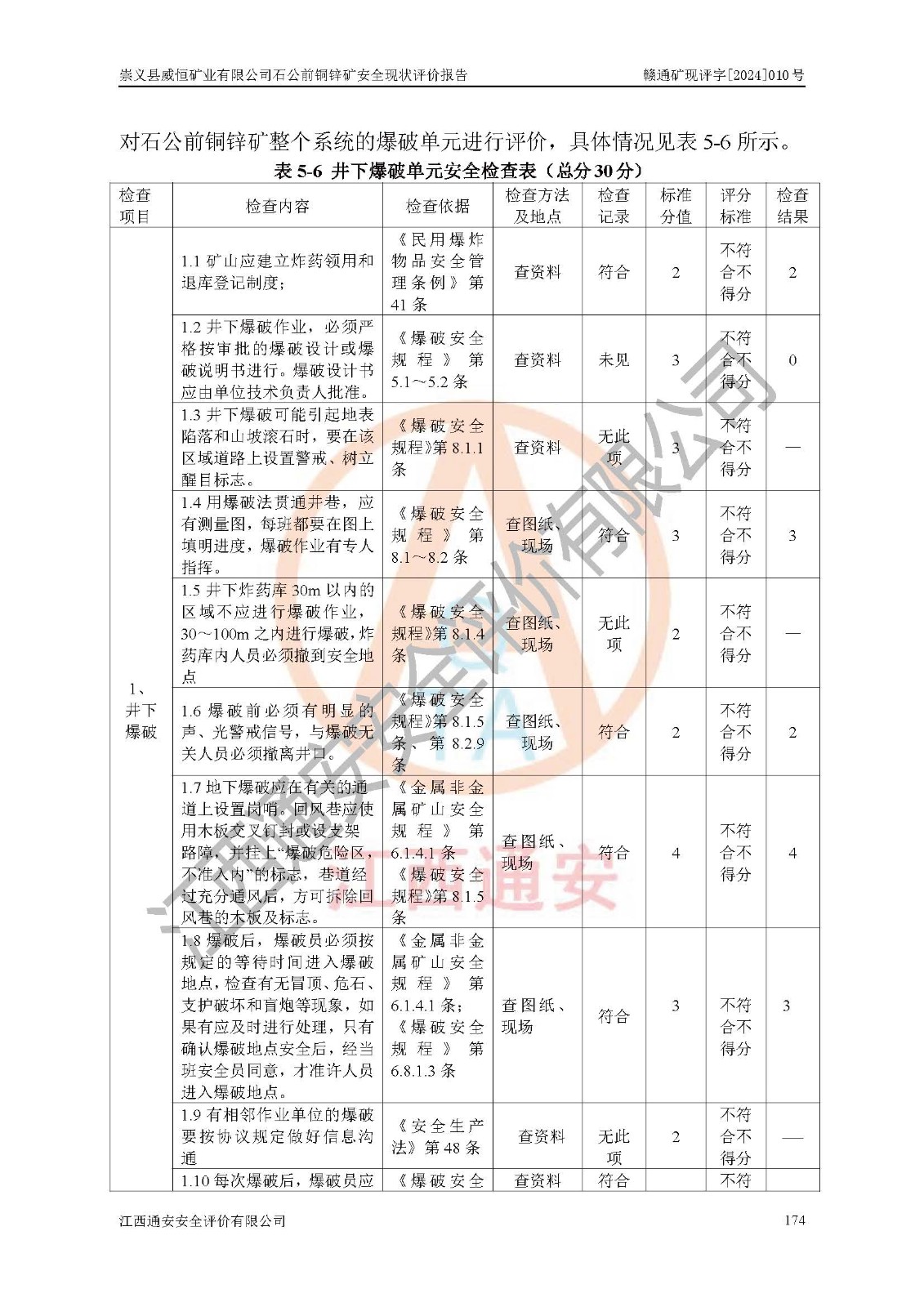 其它 | 崇義縣威恒礦業(yè)有限公司石公前銅鋅礦的主要生產(chǎn)及輔助系統(tǒng):提升運輸、排水、供配電、通風(fēng)、供風(fēng)、采掘、安全避險“六大系統(tǒng)”等基本符合法律法規(guī)要求和規(guī)程、規(guī)范要求;各種危險有害因素及不可接受的風(fēng)險在運行中認(rèn)真落實行之**的技術(shù)措施或管理措施,嚴(yán)格按規(guī)程,按要求加強管理,可以避免和控制各類事故,**安全生產(chǎn)。現(xiàn)階段礦山設(shè)備、設(shè)施和場所符合**安全生產(chǎn)有關(guān)法律、法規(guī)、標(biāo)準(zhǔn)及規(guī)范的規(guī)定。礦山采用斜井+盲斜井聯(lián)合開拓方式,安全生產(chǎn)條件一般;安全管理能滿足法規(guī)要求,礦山地下開采符合**規(guī)定的安全生產(chǎn)條件。 | ||||