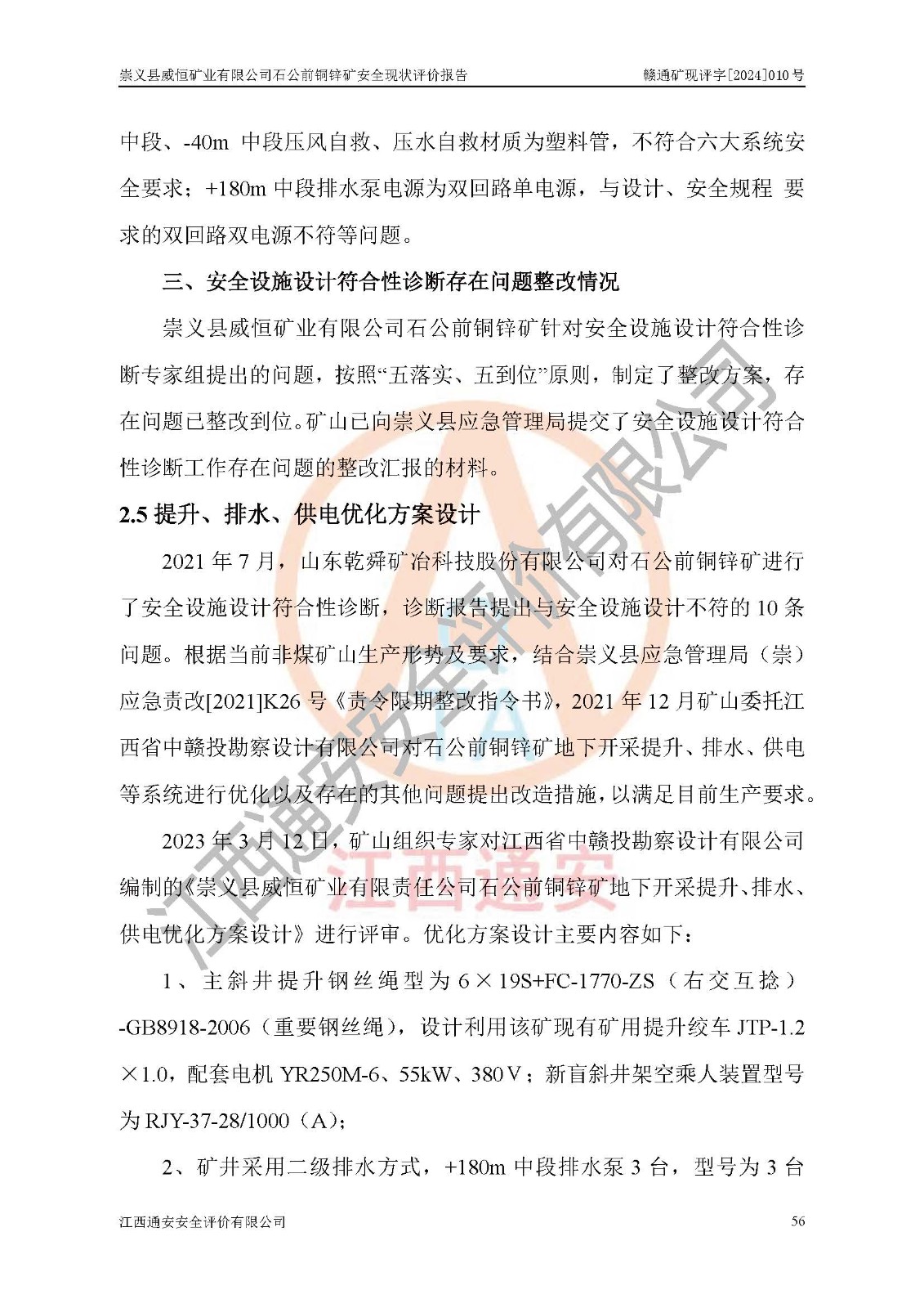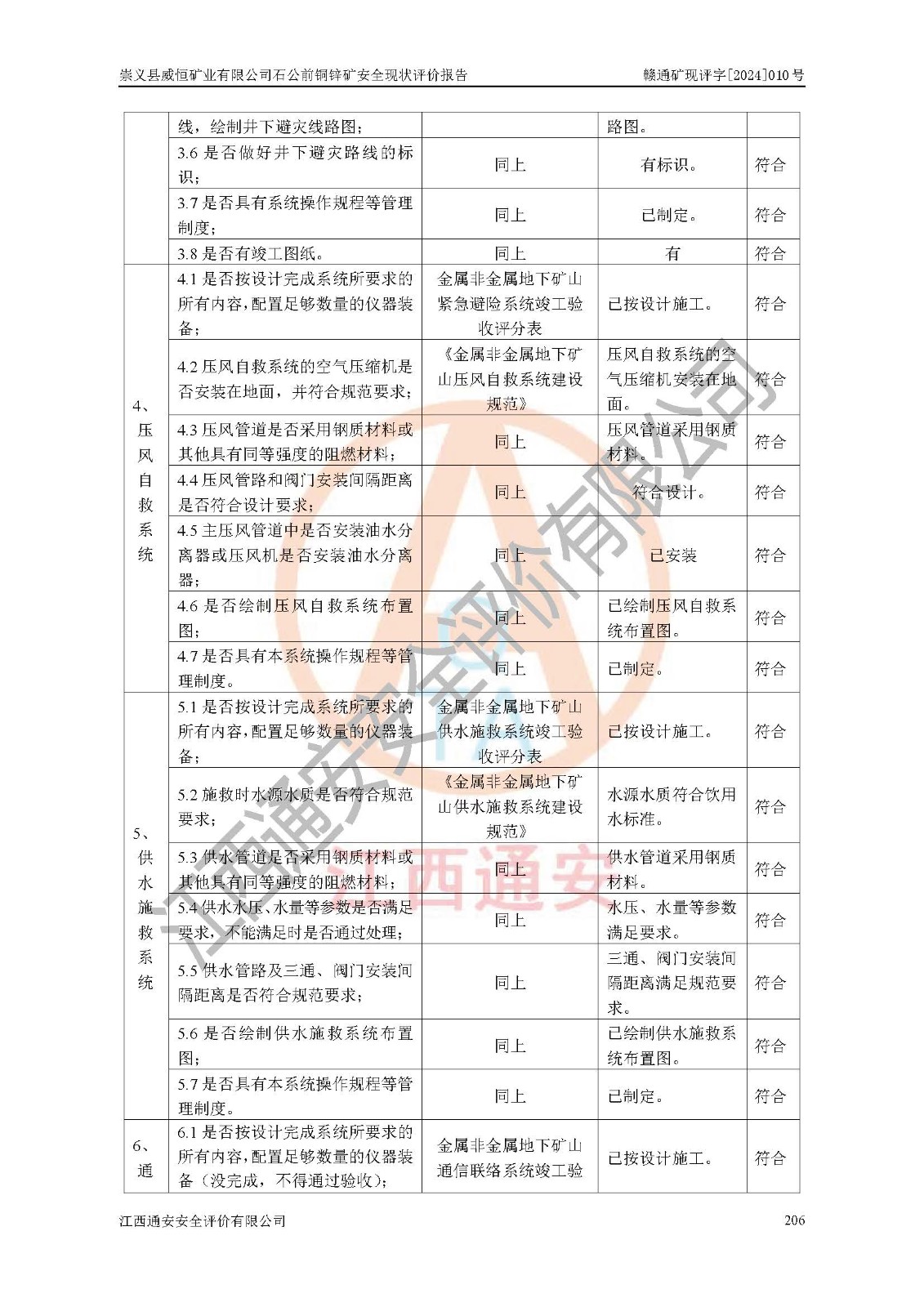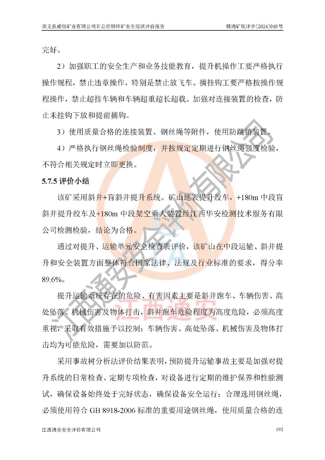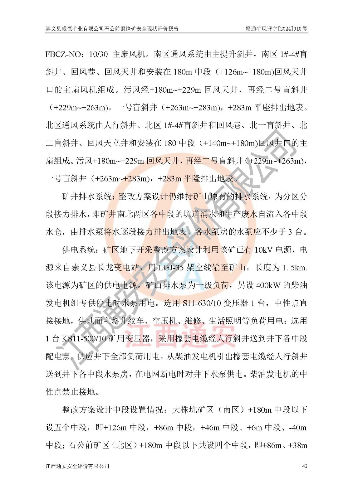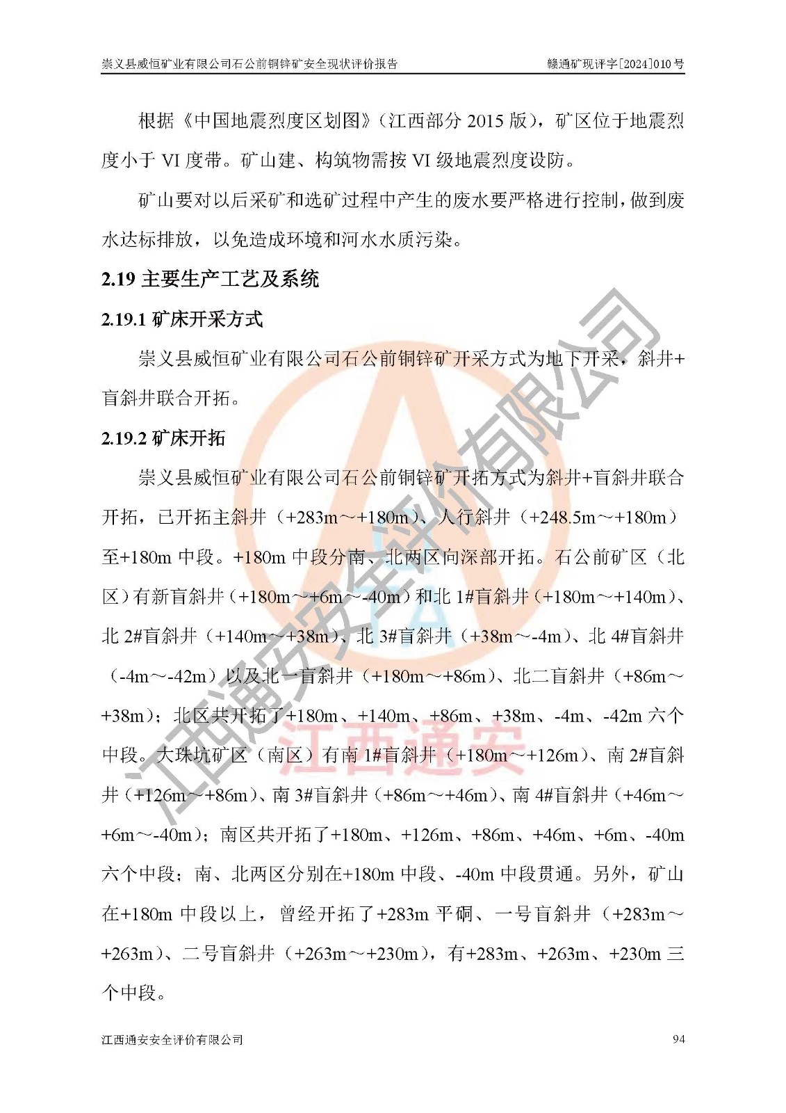 其它 | 崇義縣威恒礦業(yè)有限公司石公前銅鋅礦的主要生產(chǎn)及輔助系統(tǒng):提升運輸、排水、供配電、通風(fēng)、供風(fēng)、采掘、安全避險“六大系統(tǒng)”等基本符合法律法規(guī)要求和規(guī)程、規(guī)范要求;各種危險有害因素及不可接受的風(fēng)險在運行中認(rèn)真落實行之**的技術(shù)措施或管理措施,嚴(yán)格按規(guī)程,按要求加強管理,可以避免和控制各類事故,**安全生產(chǎn)。現(xiàn)階段礦山設(shè)備、設(shè)施和場所符合**安全生產(chǎn)有關(guān)法律、法規(guī)、標(biāo)準(zhǔn)及規(guī)范的規(guī)定。礦山采用斜井+盲斜井聯(lián)合開拓方式,安全生產(chǎn)條件一般;安全管理能滿足法規(guī)要求,礦山地下開采符合**規(guī)定的安全生產(chǎn)條件。 | ||||