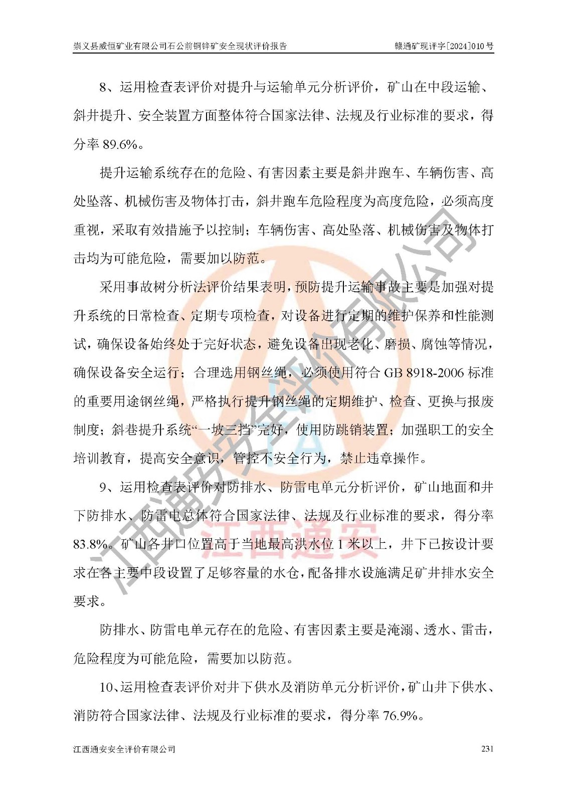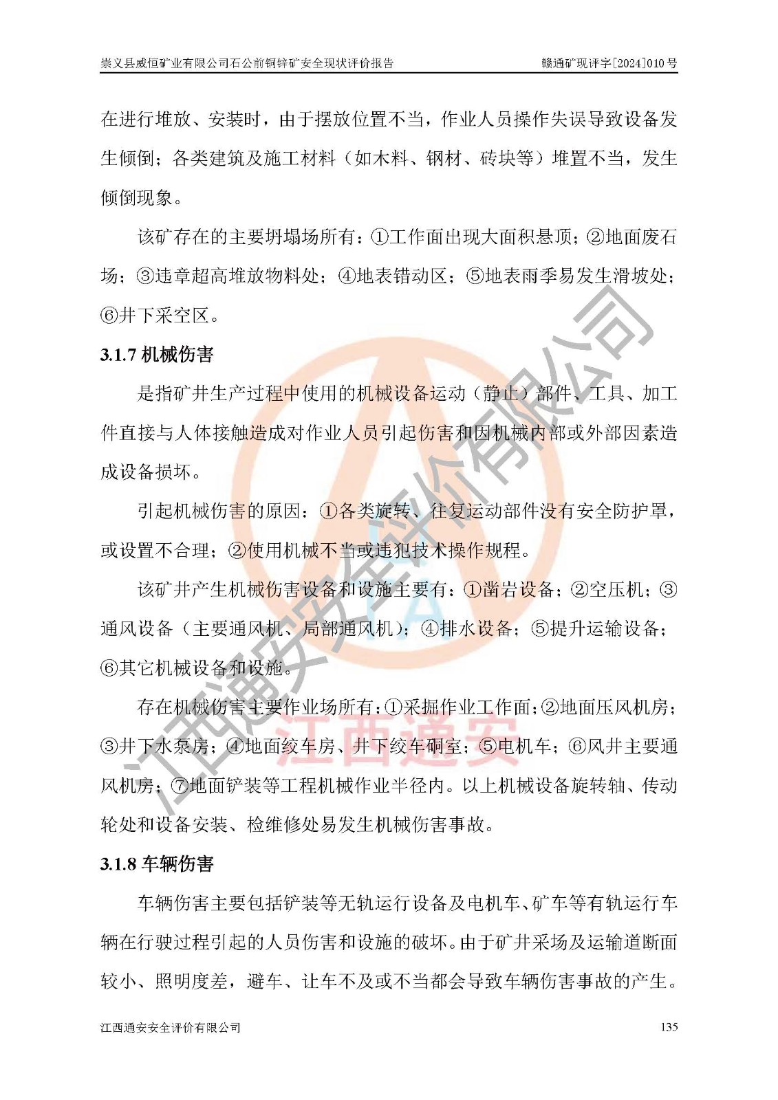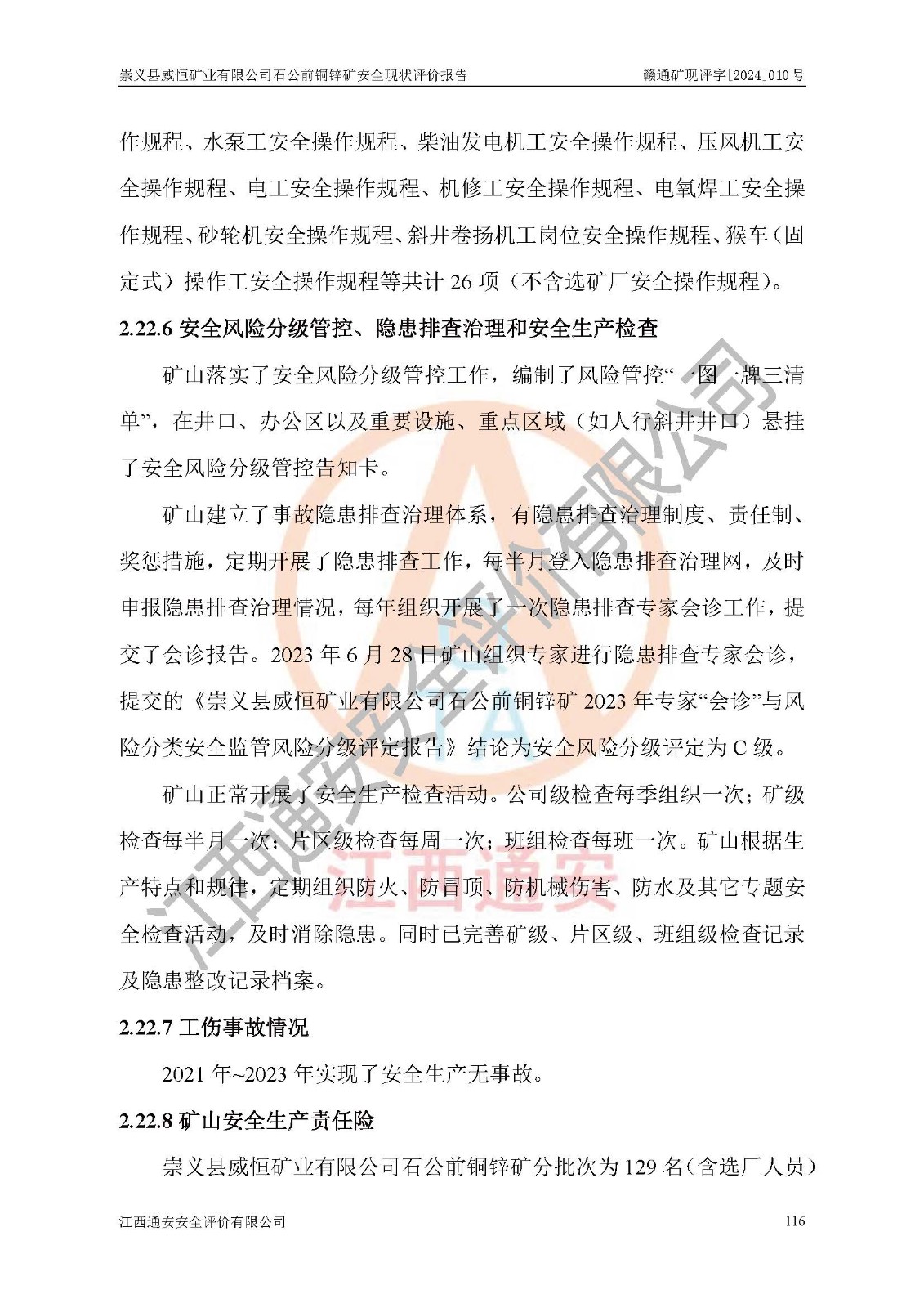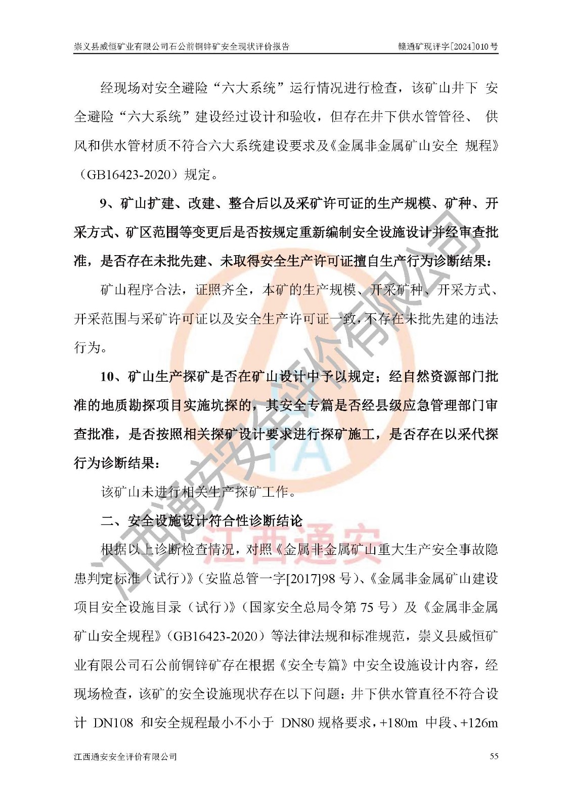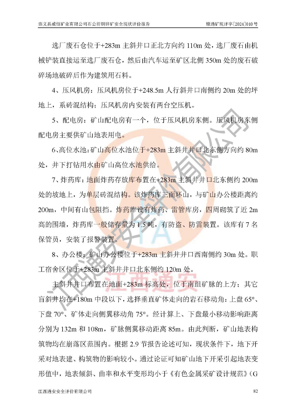 其它 | 崇義縣威恒礦業(yè)有限公司石公前銅鋅礦的主要生產(chǎn)及輔助系統(tǒng):提升運輸、排水、供配電、通風(fēng)、供風(fēng)、采掘、安全避險“六大系統(tǒng)”等基本符合法律法規(guī)要求和規(guī)程、規(guī)范要求;各種危險有害因素及不可接受的風(fēng)險在運行中認(rèn)真落實行之**的技術(shù)措施或管理措施,嚴(yán)格按規(guī)程,按要求加強管理,可以避免和控制各類事故,**安全生產(chǎn)。現(xiàn)階段礦山設(shè)備、設(shè)施和場所符合**安全生產(chǎn)有關(guān)法律、法規(guī)、標(biāo)準(zhǔn)及規(guī)范的規(guī)定。礦山采用斜井+盲斜井聯(lián)合開拓方式,安全生產(chǎn)條件一般;安全管理能滿足法規(guī)要求,礦山地下開采符合**規(guī)定的安全生產(chǎn)條件。 | ||||