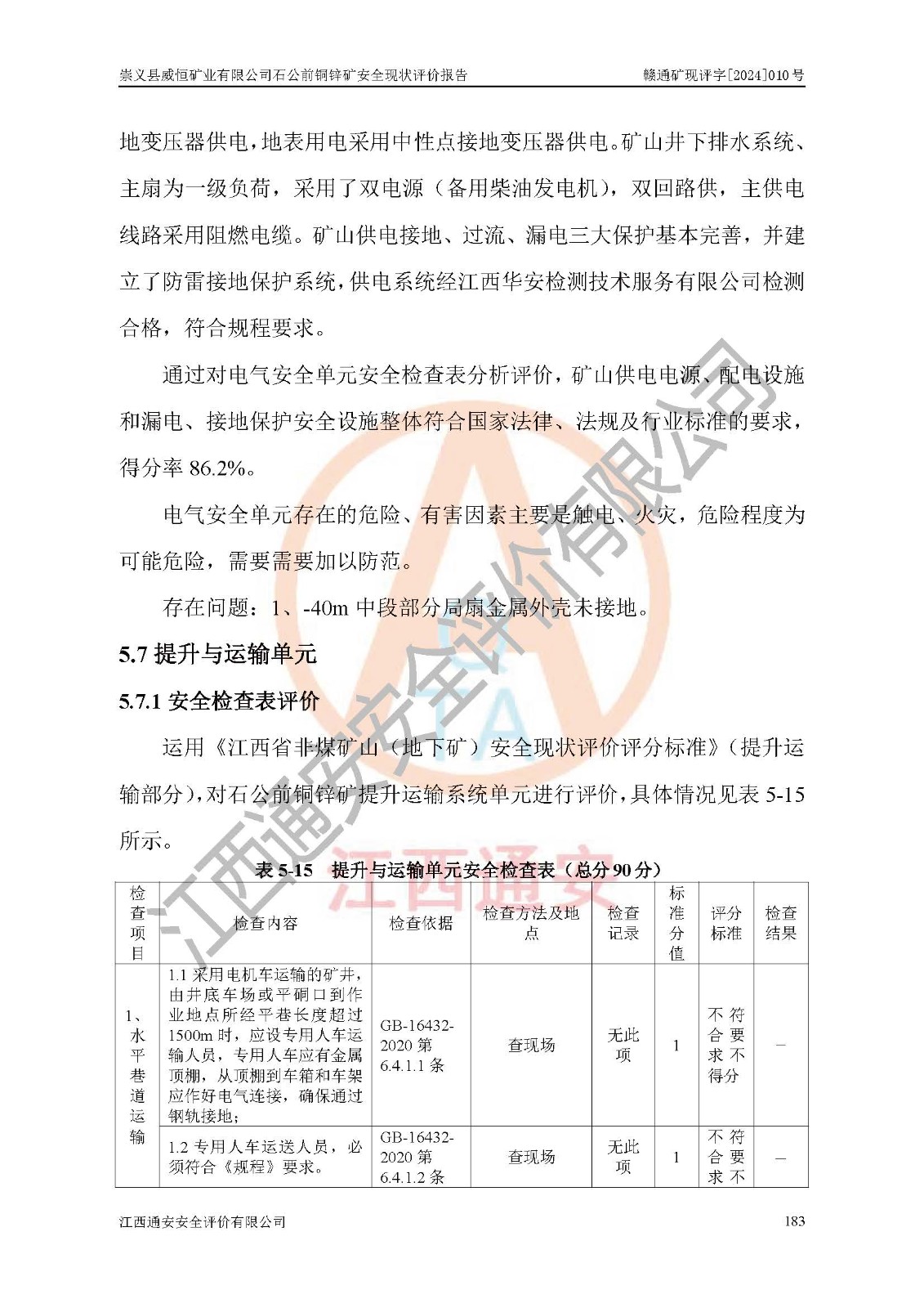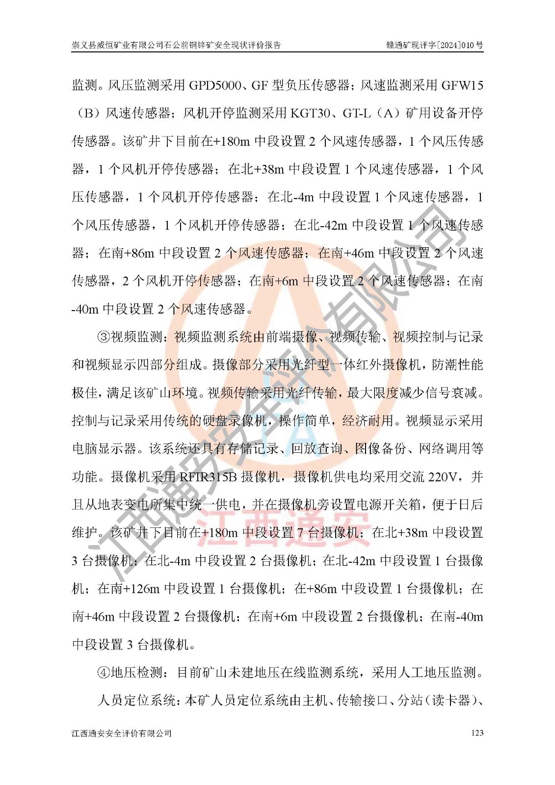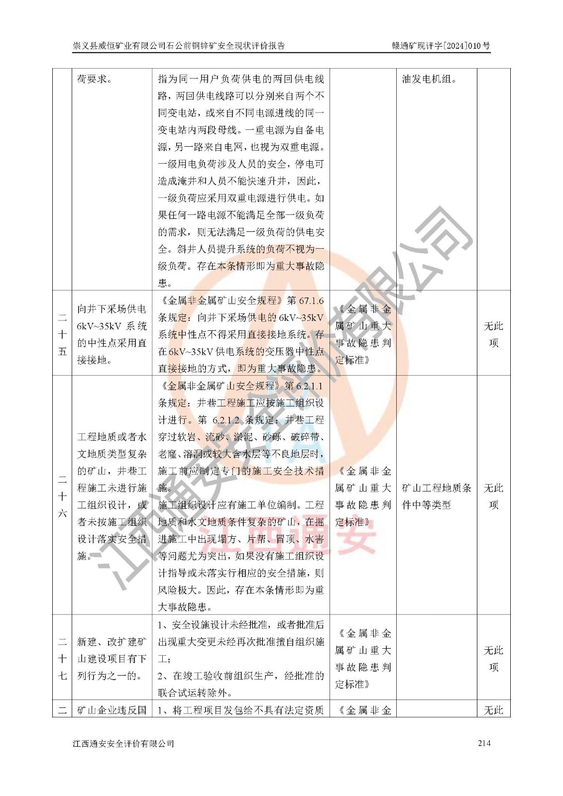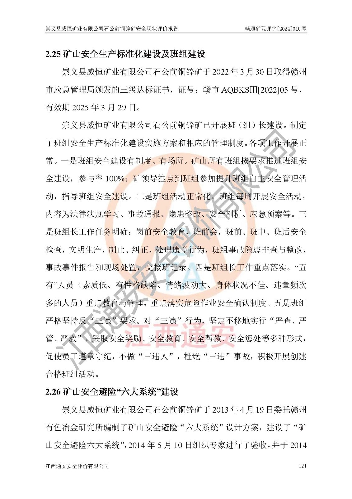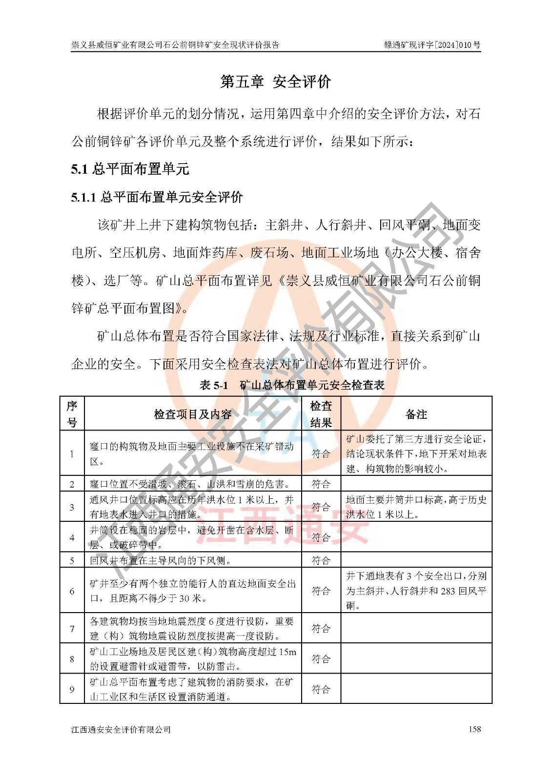 其它 | 崇義縣威恒礦業(yè)有限公司石公前銅鋅礦的主要生產(chǎn)及輔助系統(tǒng):提升運輸、排水、供配電、通風(fēng)、供風(fēng)、采掘、安全避險“六大系統(tǒng)”等基本符合法律法規(guī)要求和規(guī)程、規(guī)范要求;各種危險有害因素及不可接受的風(fēng)險在運行中認(rèn)真落實行之**的技術(shù)措施或管理措施,嚴(yán)格按規(guī)程,按要求加強管理,可以避免和控制各類事故,**安全生產(chǎn)。現(xiàn)階段礦山設(shè)備、設(shè)施和場所符合**安全生產(chǎn)有關(guān)法律、法規(guī)、標(biāo)準(zhǔn)及規(guī)范的規(guī)定。礦山采用斜井+盲斜井聯(lián)合開拓方式,安全生產(chǎn)條件一般;安全管理能滿足法規(guī)要求,礦山地下開采符合**規(guī)定的安全生產(chǎn)條件。 | ||||