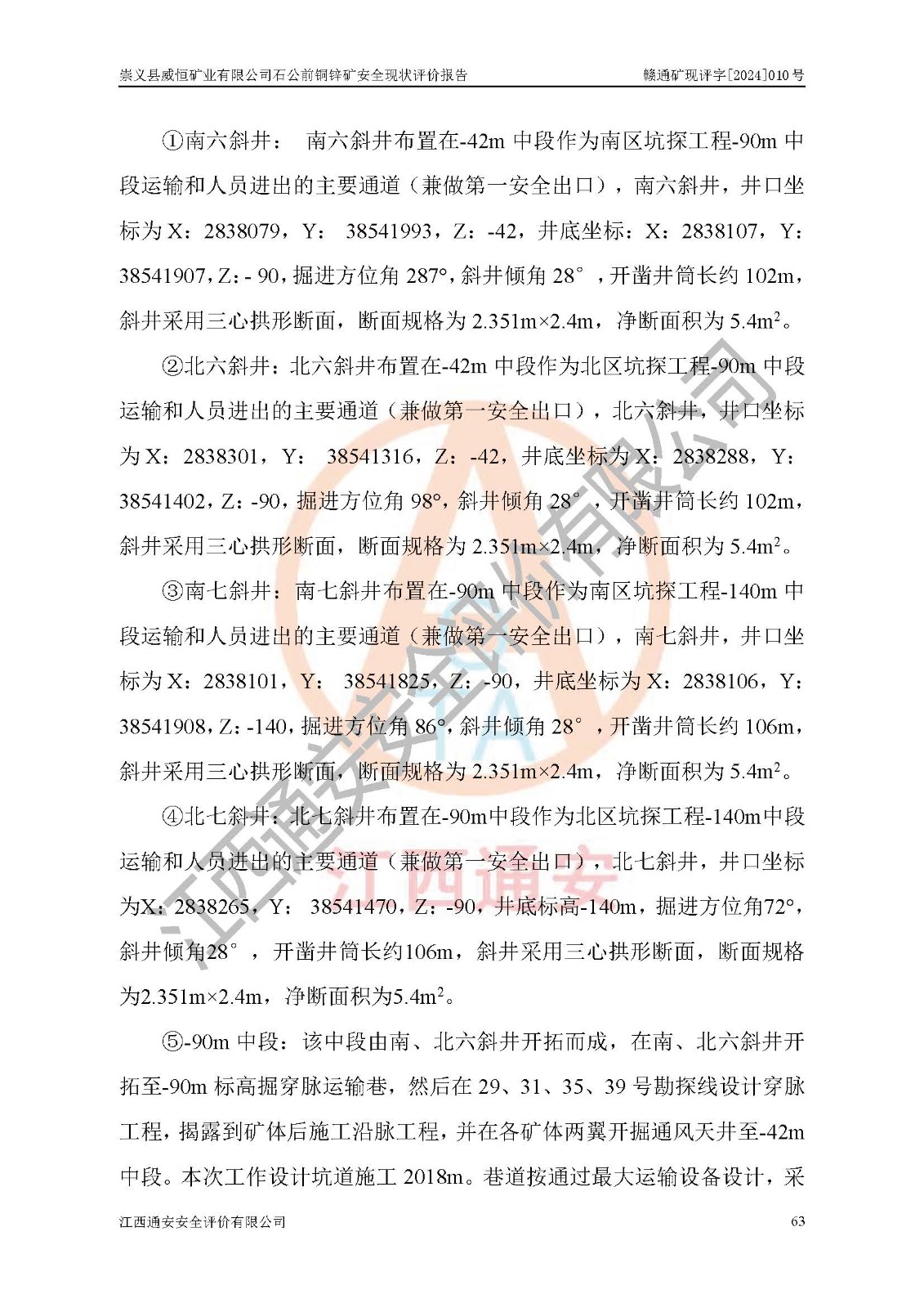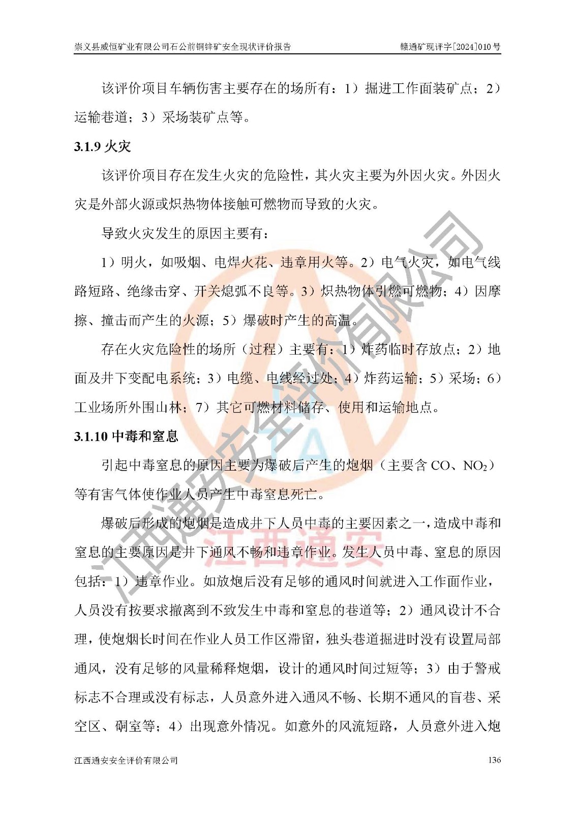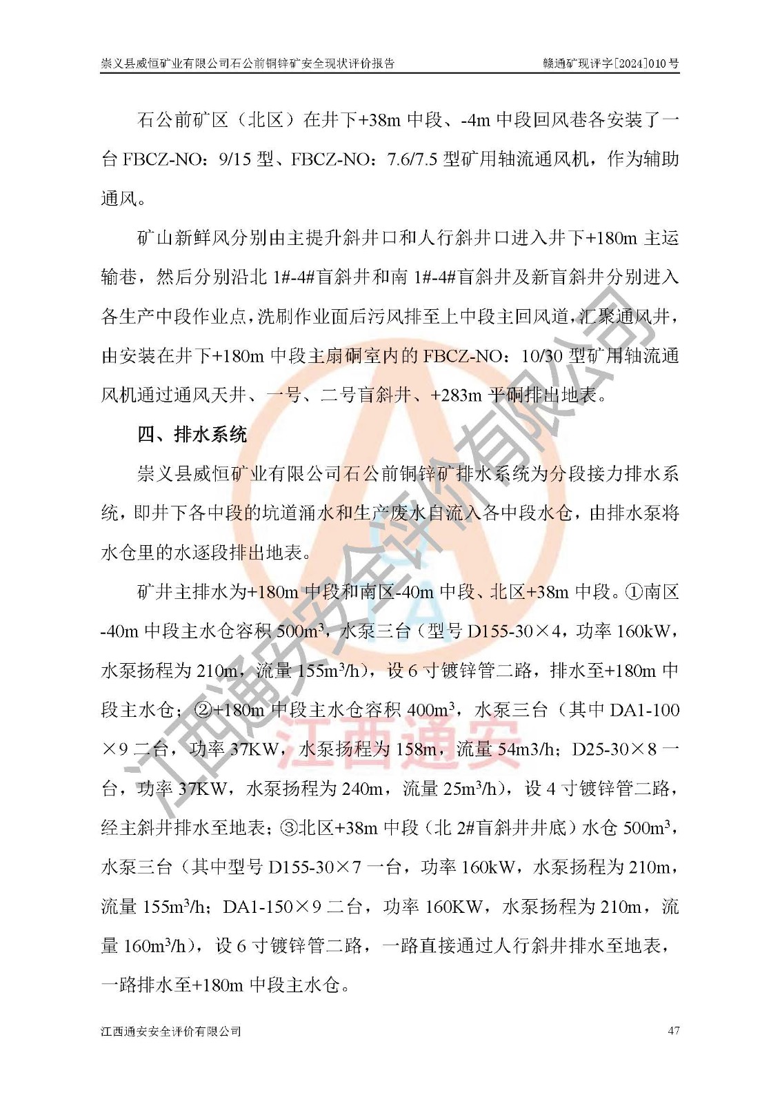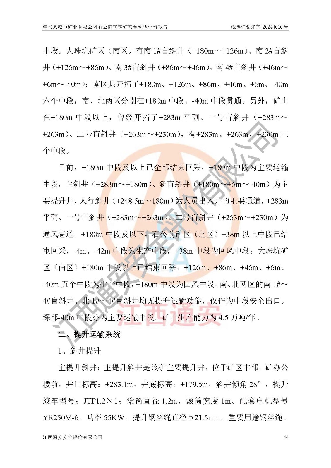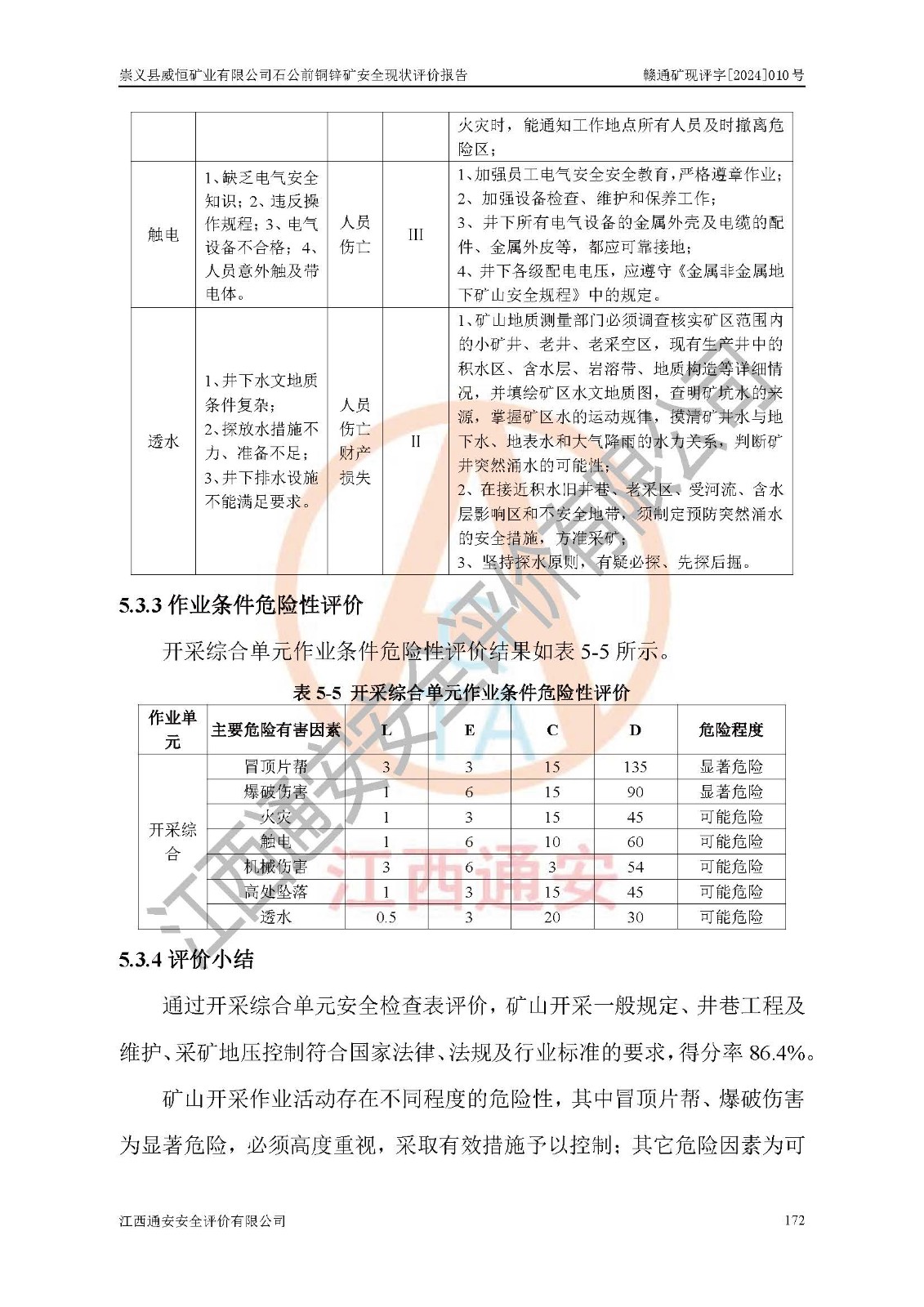 其它 | 崇義縣威恒礦業(yè)有限公司石公前銅鋅礦的主要生產(chǎn)及輔助系統(tǒng):提升運輸、排水、供配電、通風(fēng)、供風(fēng)、采掘、安全避險“六大系統(tǒng)”等基本符合法律法規(guī)要求和規(guī)程、規(guī)范要求;各種危險有害因素及不可接受的風(fēng)險在運行中認(rèn)真落實行之**的技術(shù)措施或管理措施,嚴(yán)格按規(guī)程,按要求加強管理,可以避免和控制各類事故,**安全生產(chǎn)。現(xiàn)階段礦山設(shè)備、設(shè)施和場所符合**安全生產(chǎn)有關(guān)法律、法規(guī)、標(biāo)準(zhǔn)及規(guī)范的規(guī)定。礦山采用斜井+盲斜井聯(lián)合開拓方式,安全生產(chǎn)條件一般;安全管理能滿足法規(guī)要求,礦山地下開采符合**規(guī)定的安全生產(chǎn)條件。 | ||||