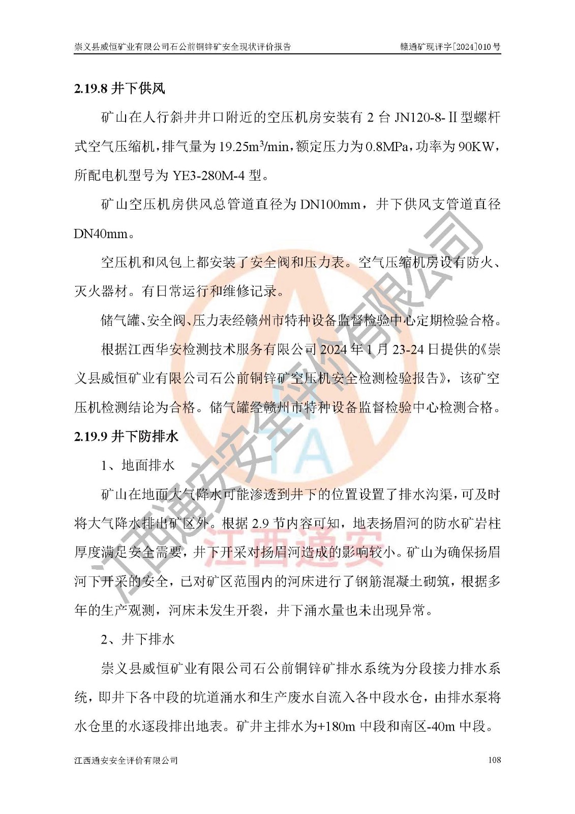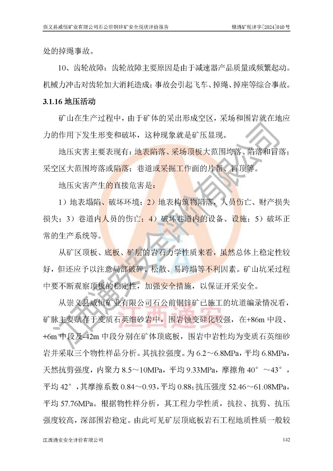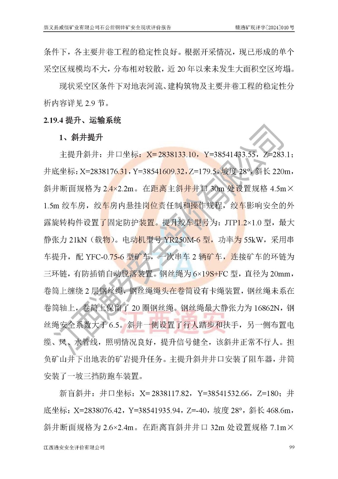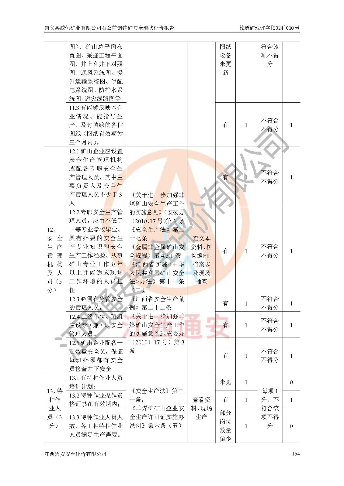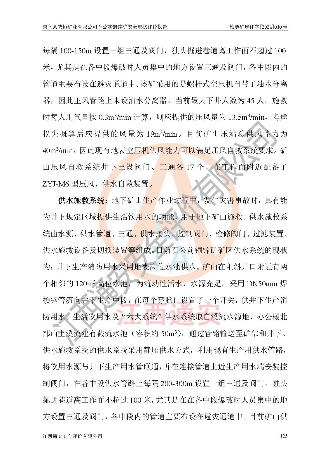 其它 | 崇義縣威恒礦業(yè)有限公司石公前銅鋅礦的主要生產(chǎn)及輔助系統(tǒng):提升運輸、排水、供配電、通風(fēng)、供風(fēng)、采掘、安全避險“六大系統(tǒng)”等基本符合法律法規(guī)要求和規(guī)程、規(guī)范要求;各種危險有害因素及不可接受的風(fēng)險在運行中認(rèn)真落實行之**的技術(shù)措施或管理措施,嚴(yán)格按規(guī)程,按要求加強管理,可以避免和控制各類事故,**安全生產(chǎn)。現(xiàn)階段礦山設(shè)備、設(shè)施和場所符合**安全生產(chǎn)有關(guān)法律、法規(guī)、標(biāo)準(zhǔn)及規(guī)范的規(guī)定。礦山采用斜井+盲斜井聯(lián)合開拓方式,安全生產(chǎn)條件一般;安全管理能滿足法規(guī)要求,礦山地下開采符合**規(guī)定的安全生產(chǎn)條件。 | ||||