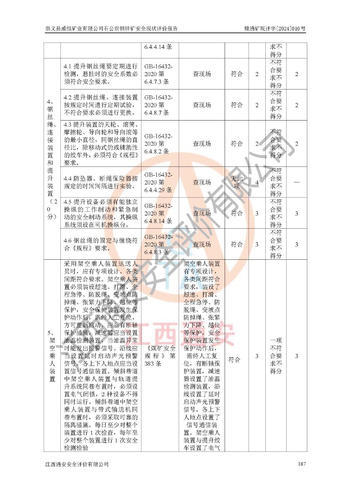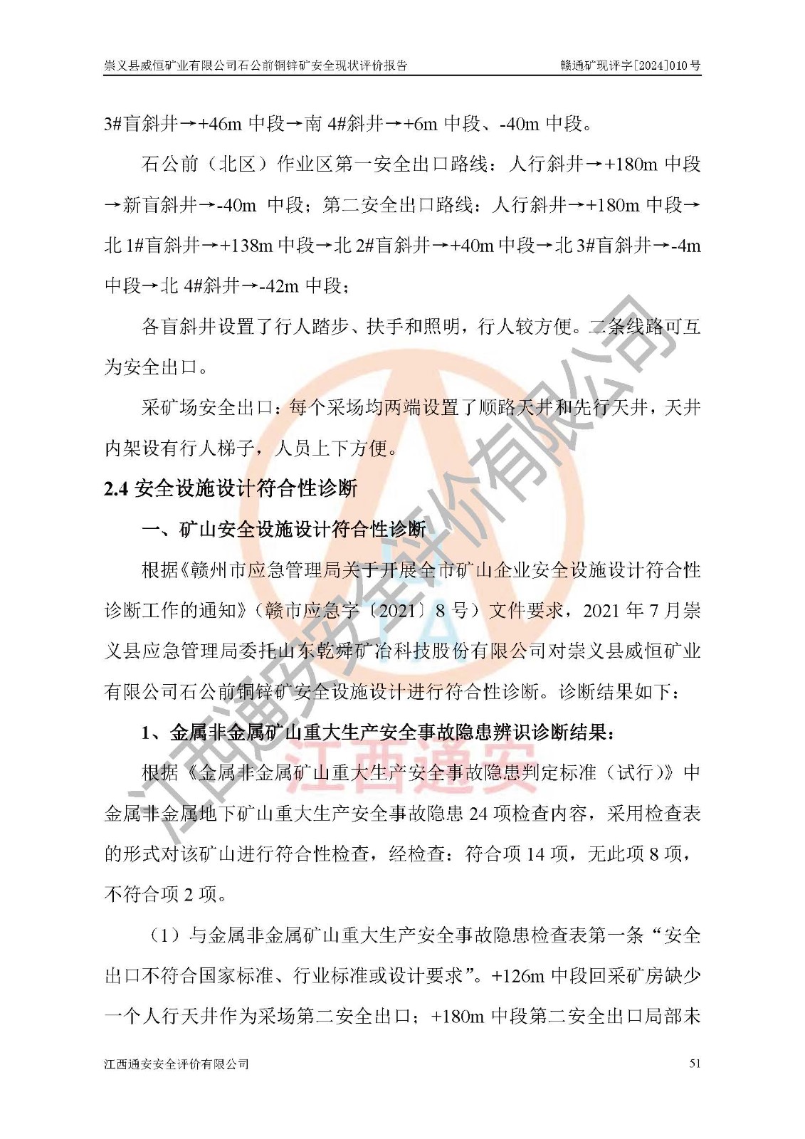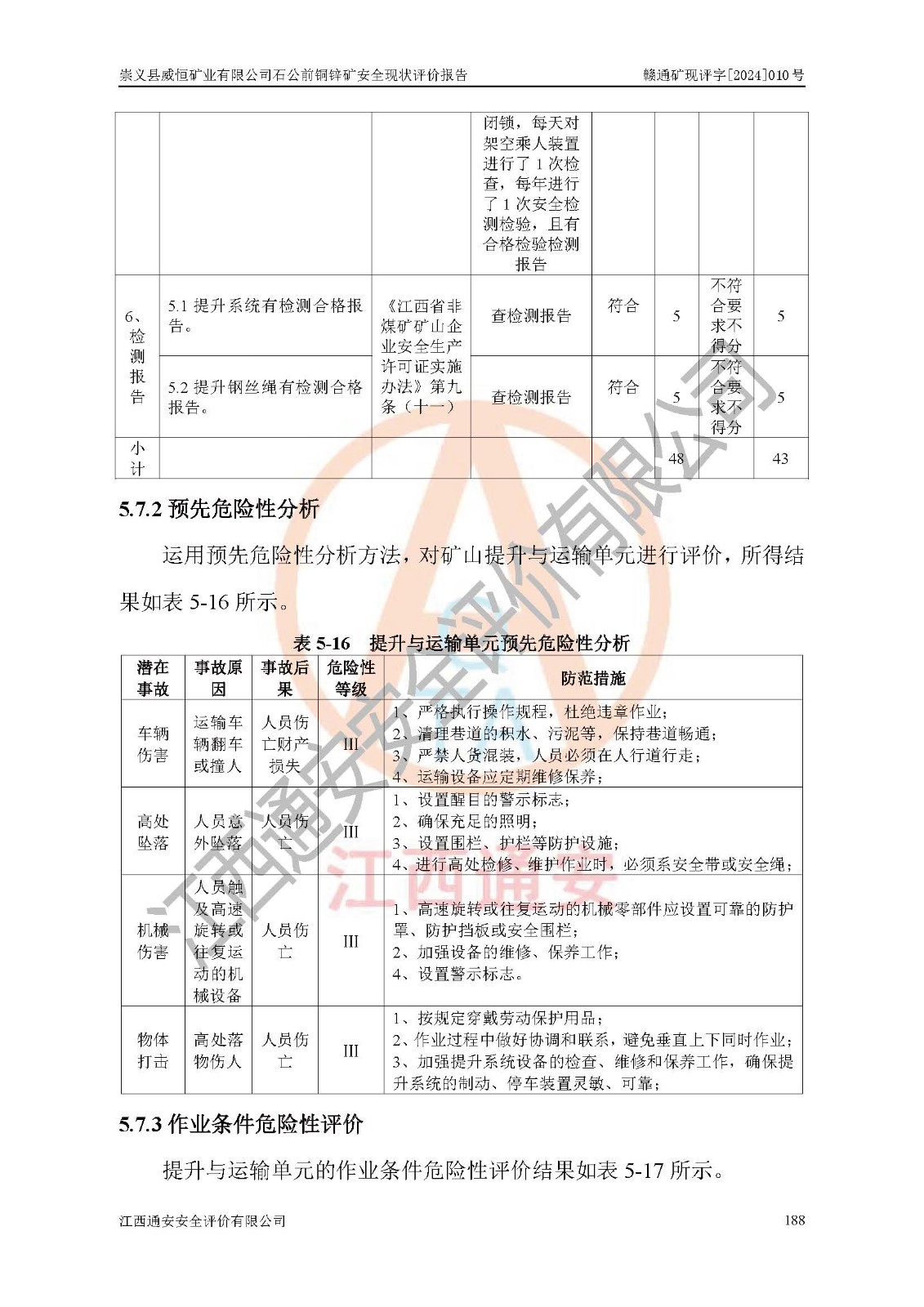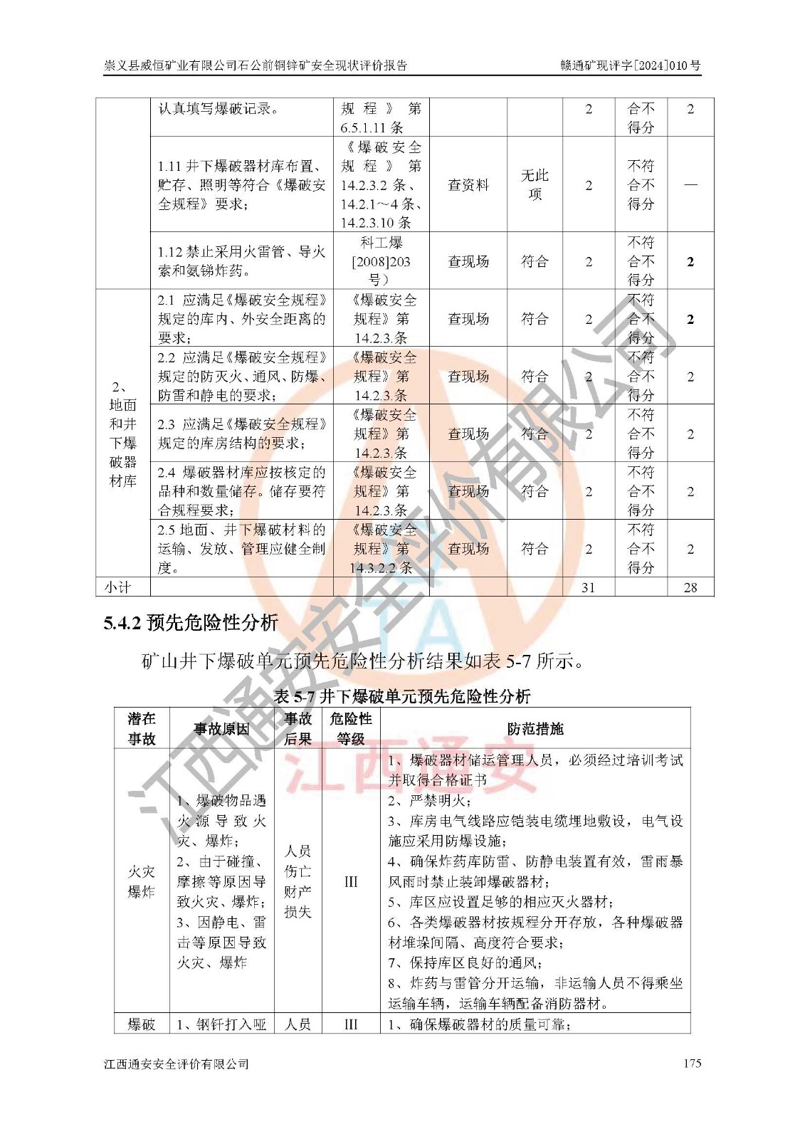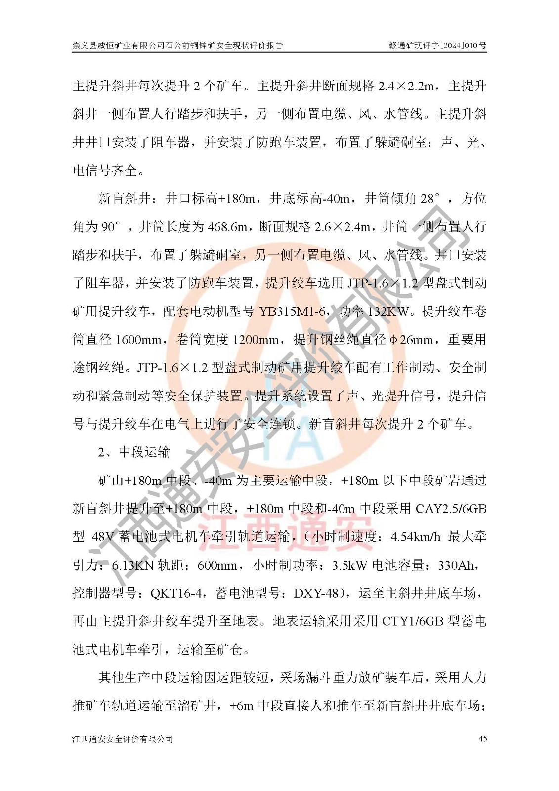 其它 | 崇義縣威恒礦業(yè)有限公司石公前銅鋅礦的主要生產(chǎn)及輔助系統(tǒng):提升運輸、排水、供配電、通風(fēng)、供風(fēng)、采掘、安全避險“六大系統(tǒng)”等基本符合法律法規(guī)要求和規(guī)程、規(guī)范要求;各種危險有害因素及不可接受的風(fēng)險在運行中認(rèn)真落實行之**的技術(shù)措施或管理措施,嚴(yán)格按規(guī)程,按要求加強管理,可以避免和控制各類事故,**安全生產(chǎn)。現(xiàn)階段礦山設(shè)備、設(shè)施和場所符合**安全生產(chǎn)有關(guān)法律、法規(guī)、標(biāo)準(zhǔn)及規(guī)范的規(guī)定。礦山采用斜井+盲斜井聯(lián)合開拓方式,安全生產(chǎn)條件一般;安全管理能滿足法規(guī)要求,礦山地下開采符合**規(guī)定的安全生產(chǎn)條件。 | ||||