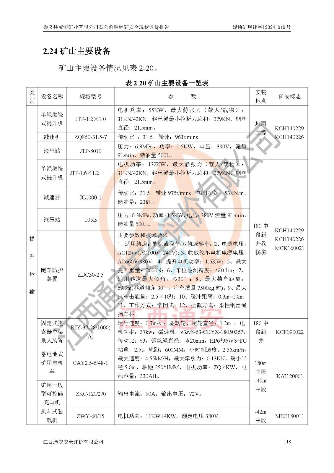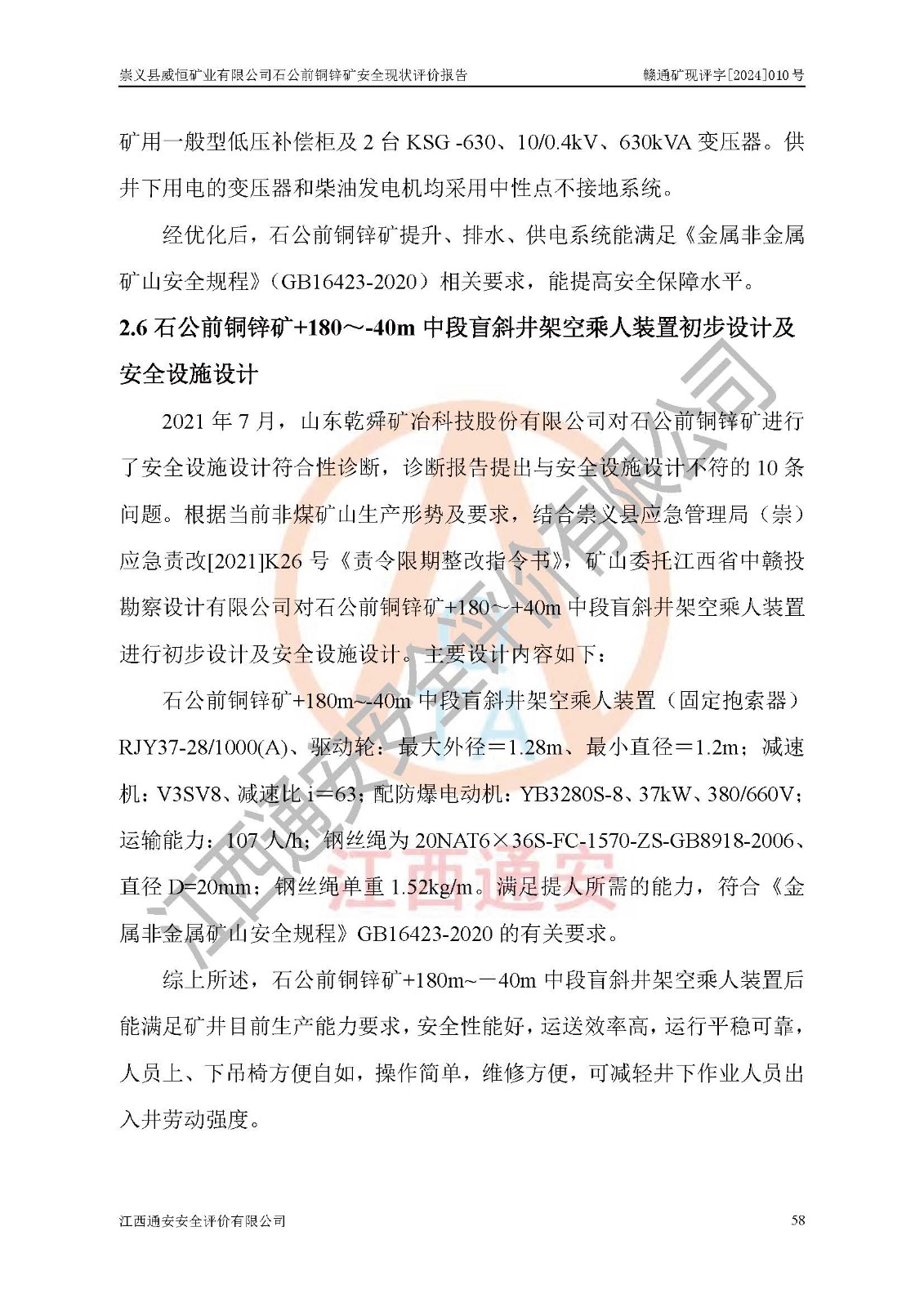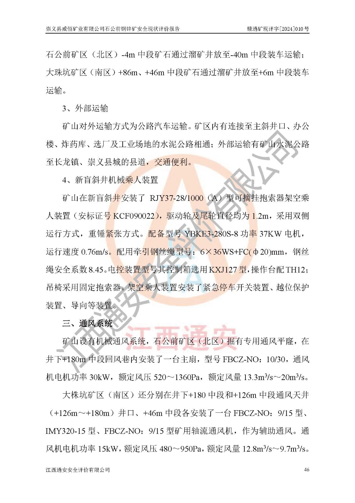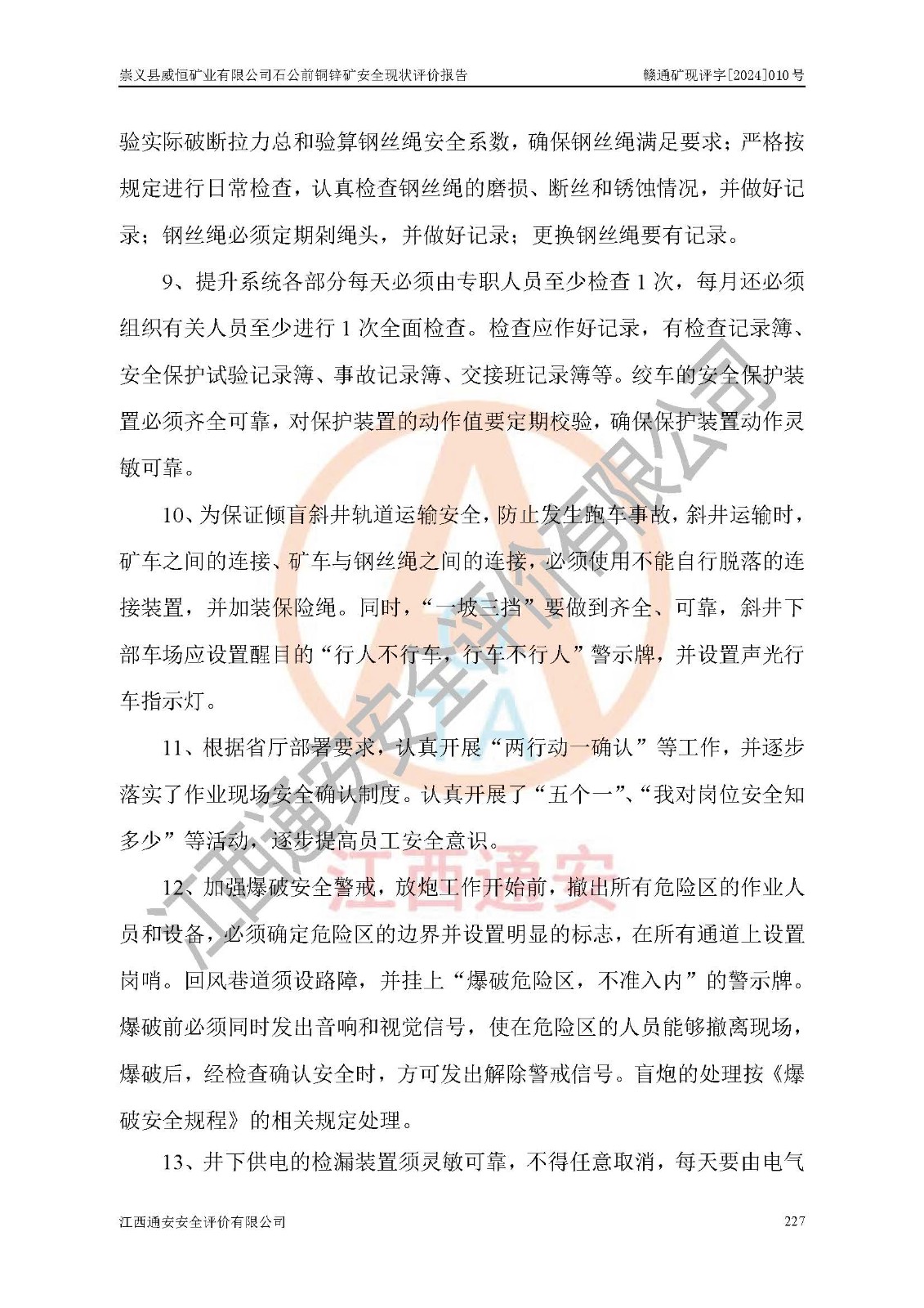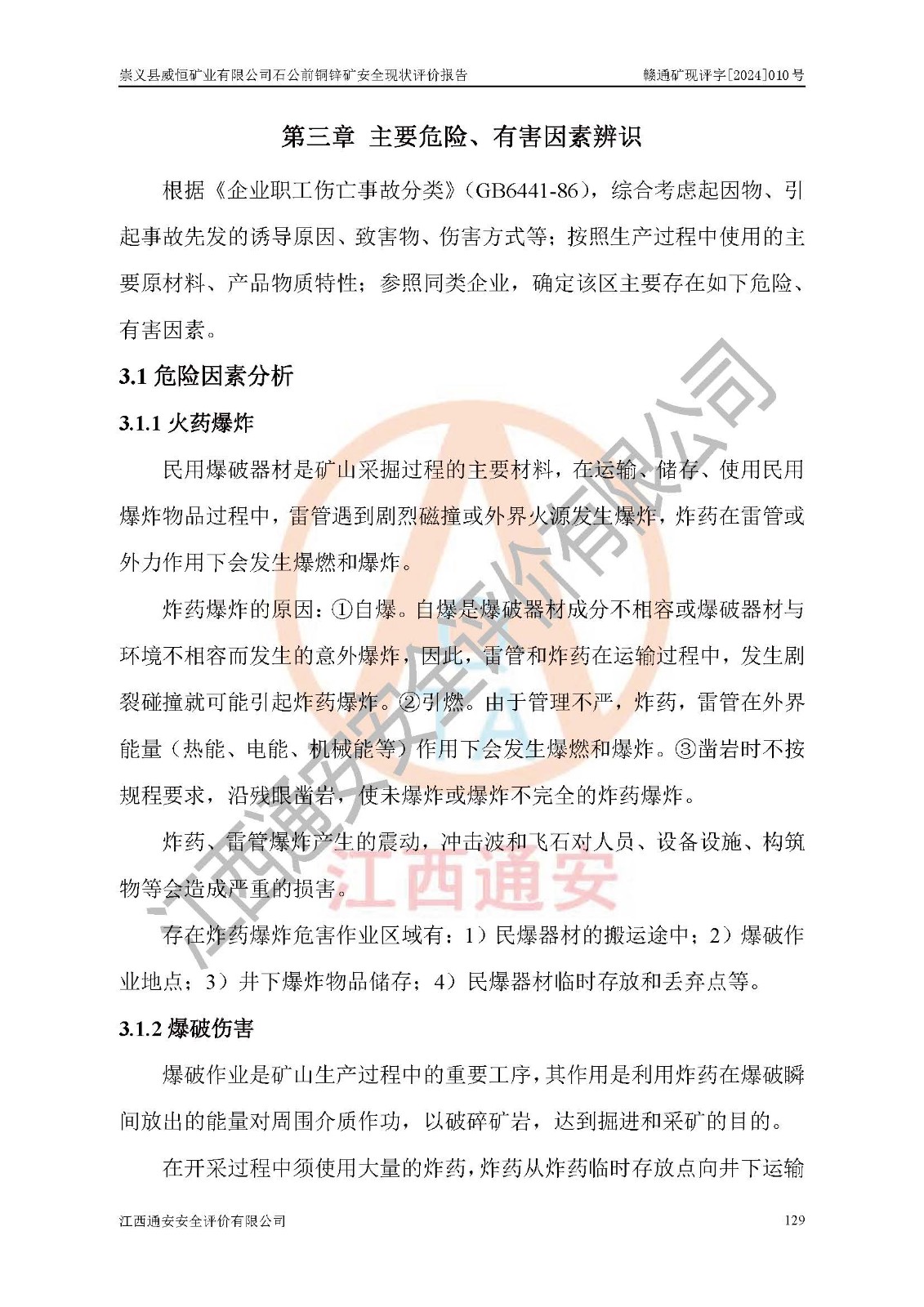 其它 | 崇義縣威恒礦業(yè)有限公司石公前銅鋅礦的主要生產(chǎn)及輔助系統(tǒng):提升運輸、排水、供配電、通風(fēng)、供風(fēng)、采掘、安全避險“六大系統(tǒng)”等基本符合法律法規(guī)要求和規(guī)程、規(guī)范要求;各種危險有害因素及不可接受的風(fēng)險在運行中認(rèn)真落實行之**的技術(shù)措施或管理措施,嚴(yán)格按規(guī)程,按要求加強管理,可以避免和控制各類事故,**安全生產(chǎn)。現(xiàn)階段礦山設(shè)備、設(shè)施和場所符合**安全生產(chǎn)有關(guān)法律、法規(guī)、標(biāo)準(zhǔn)及規(guī)范的規(guī)定。礦山采用斜井+盲斜井聯(lián)合開拓方式,安全生產(chǎn)條件一般;安全管理能滿足法規(guī)要求,礦山地下開采符合**規(guī)定的安全生產(chǎn)條件。 | ||||