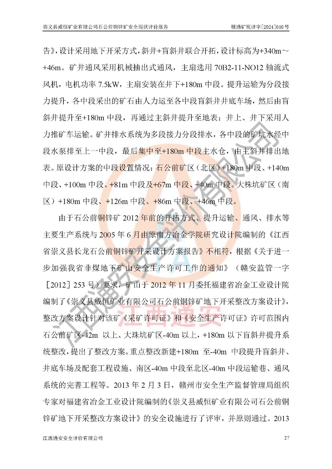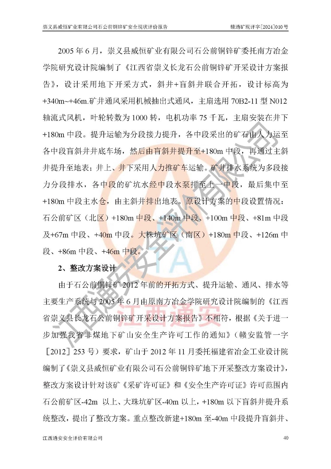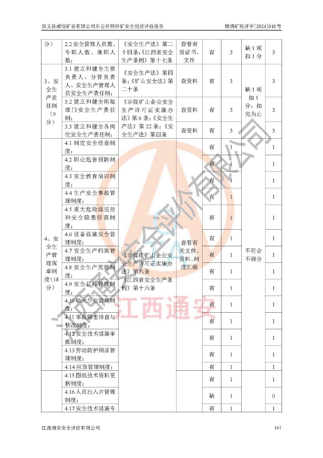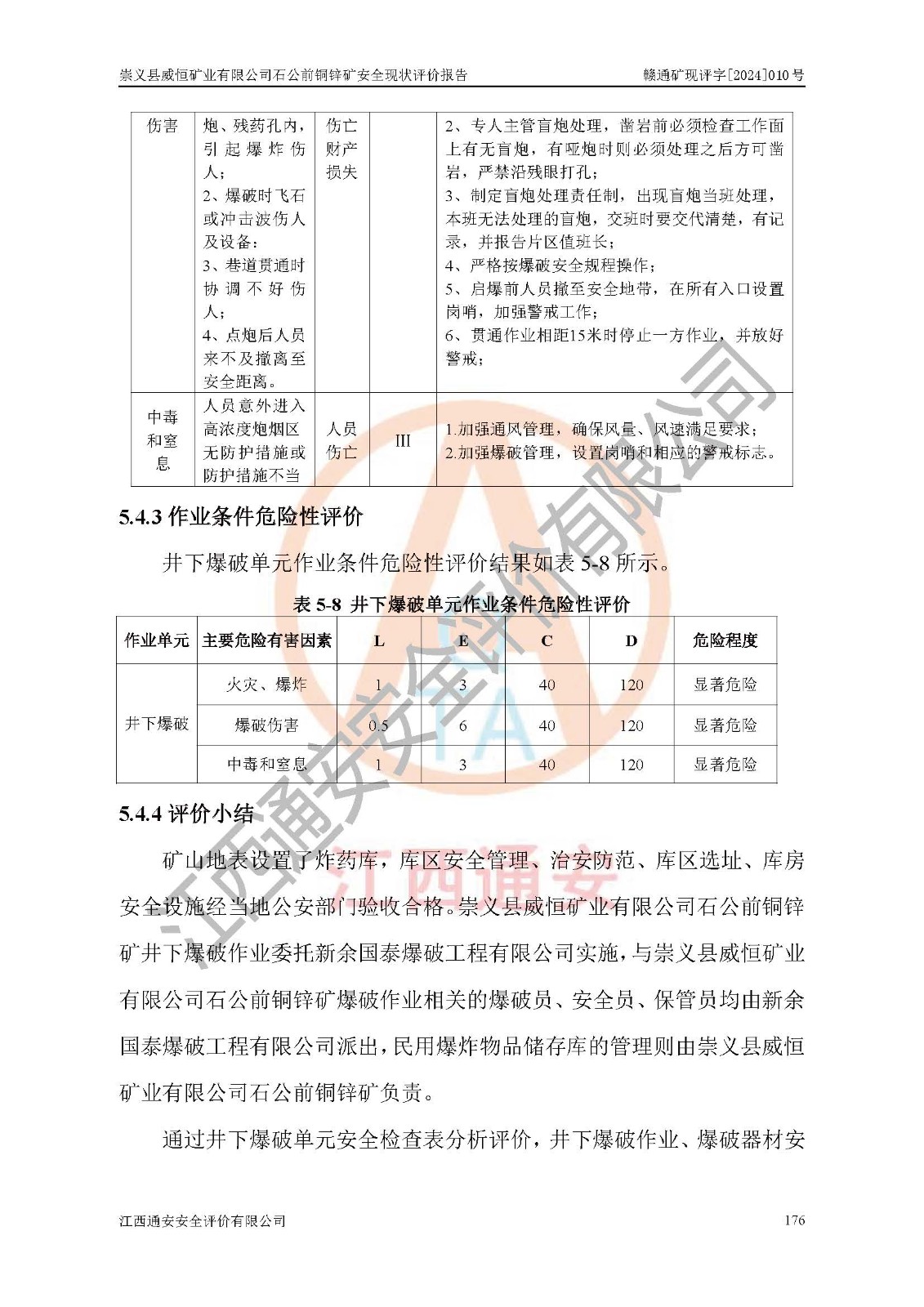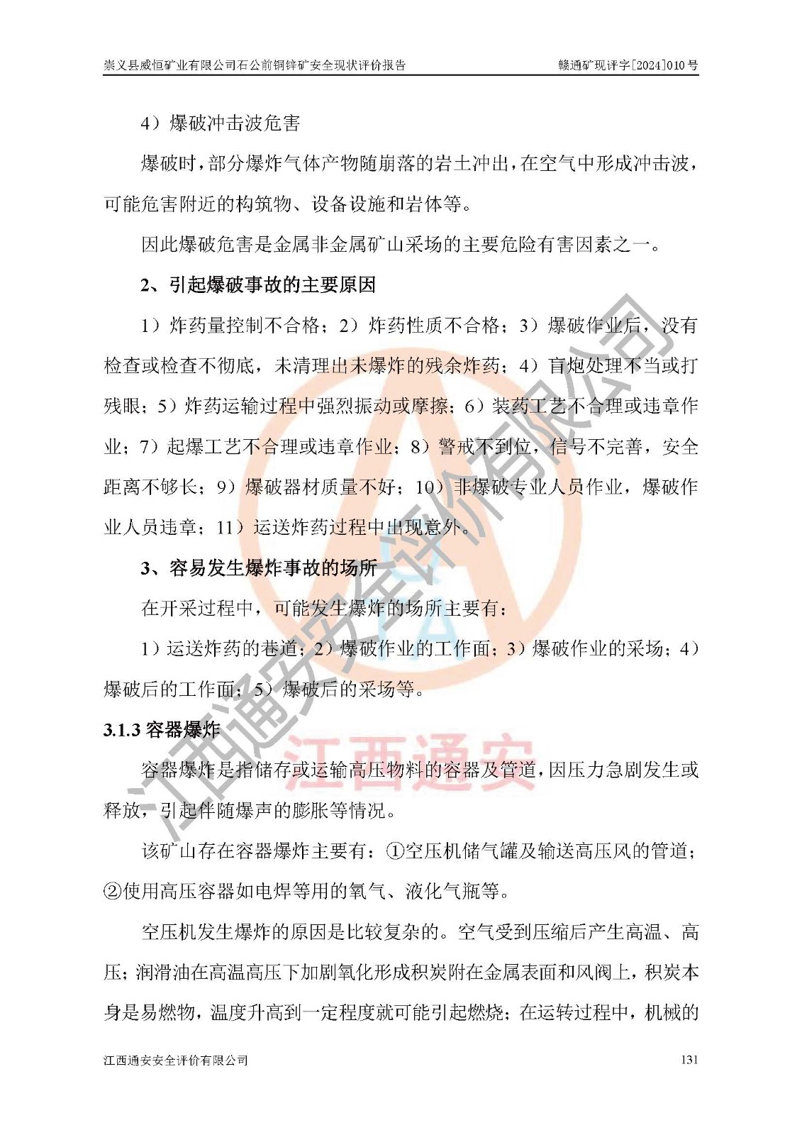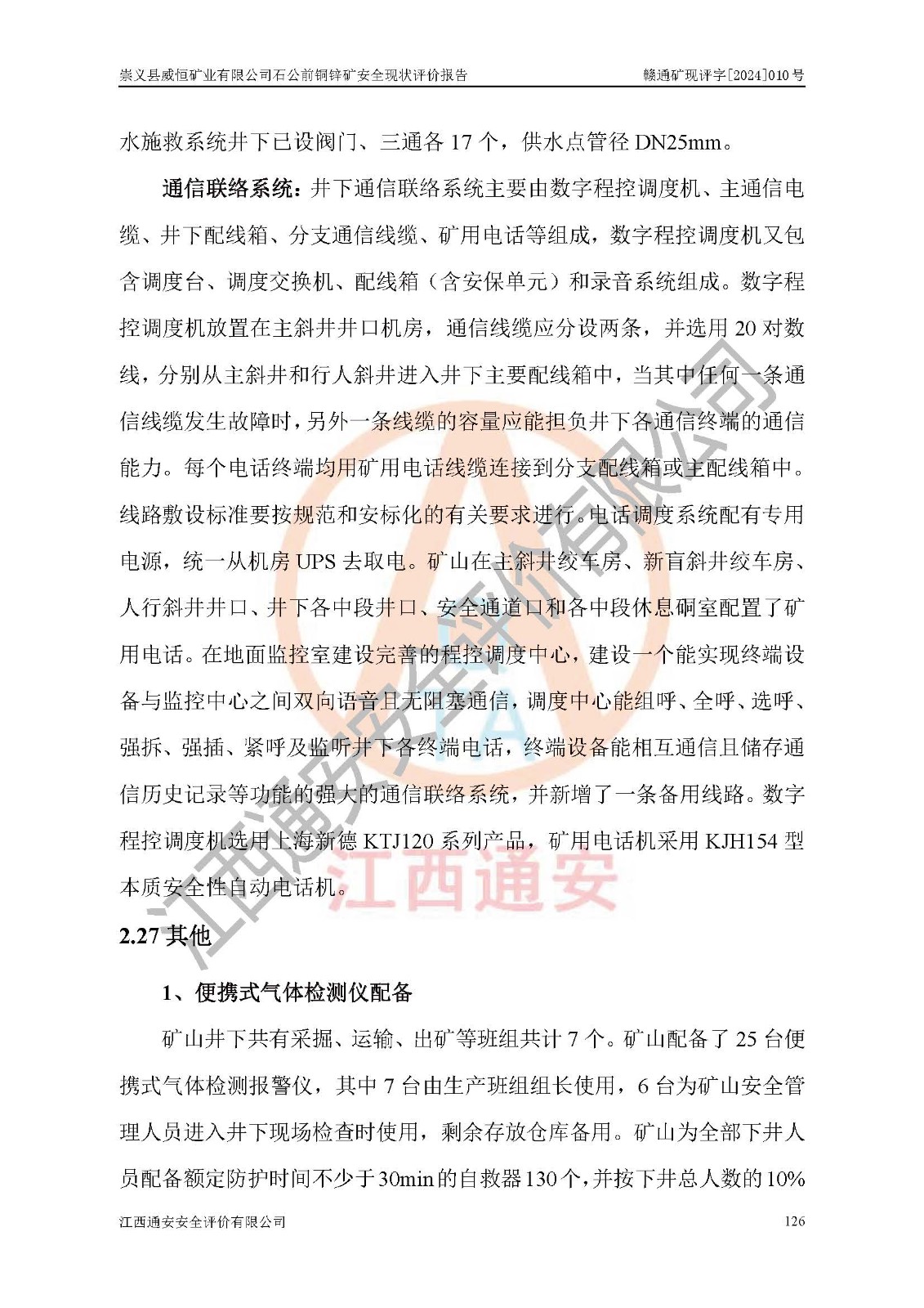 其它 | 崇義縣威恒礦業(yè)有限公司石公前銅鋅礦的主要生產(chǎn)及輔助系統(tǒng):提升運輸、排水、供配電、通風(fēng)、供風(fēng)、采掘、安全避險“六大系統(tǒng)”等基本符合法律法規(guī)要求和規(guī)程、規(guī)范要求;各種危險有害因素及不可接受的風(fēng)險在運行中認(rèn)真落實行之**的技術(shù)措施或管理措施,嚴(yán)格按規(guī)程,按要求加強管理,可以避免和控制各類事故,**安全生產(chǎn)。現(xiàn)階段礦山設(shè)備、設(shè)施和場所符合**安全生產(chǎn)有關(guān)法律、法規(guī)、標(biāo)準(zhǔn)及規(guī)范的規(guī)定。礦山采用斜井+盲斜井聯(lián)合開拓方式,安全生產(chǎn)條件一般;安全管理能滿足法規(guī)要求,礦山地下開采符合**規(guī)定的安全生產(chǎn)條件。 | ||||