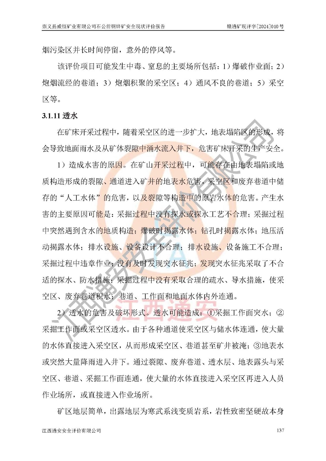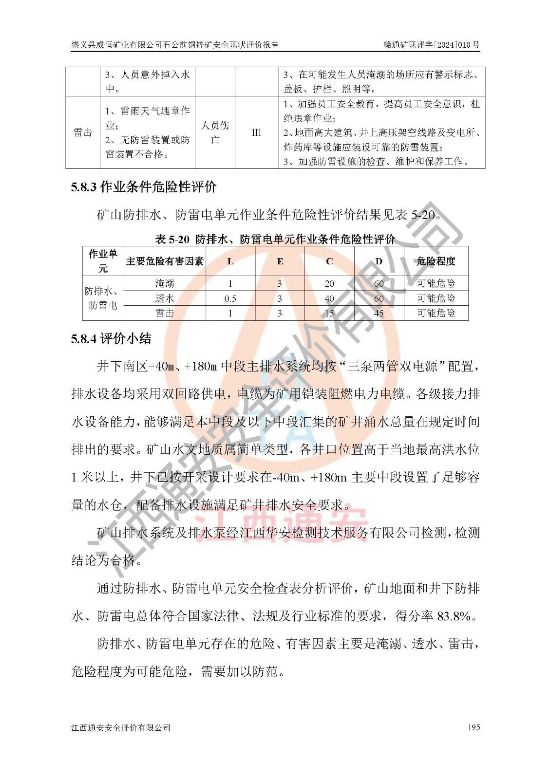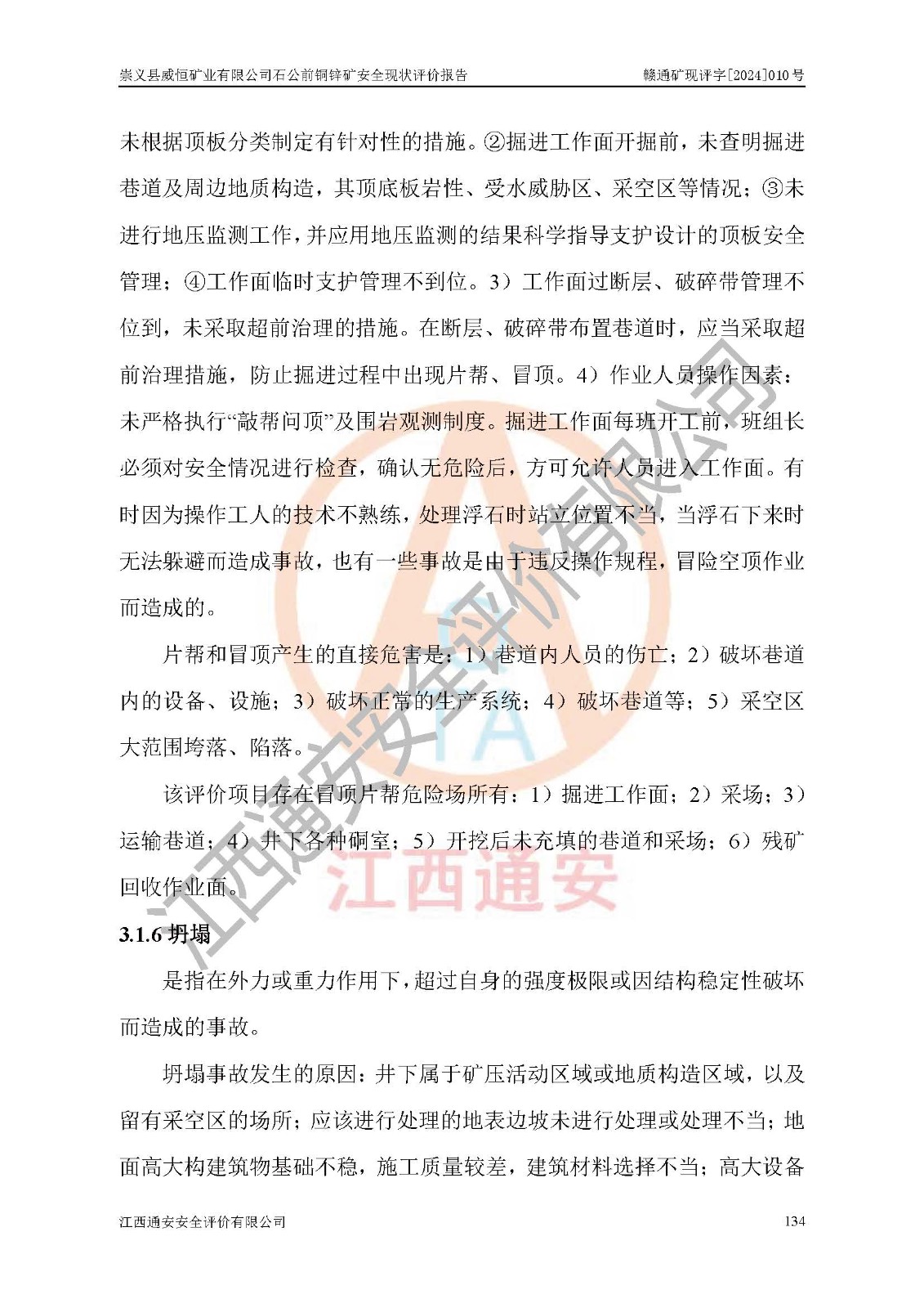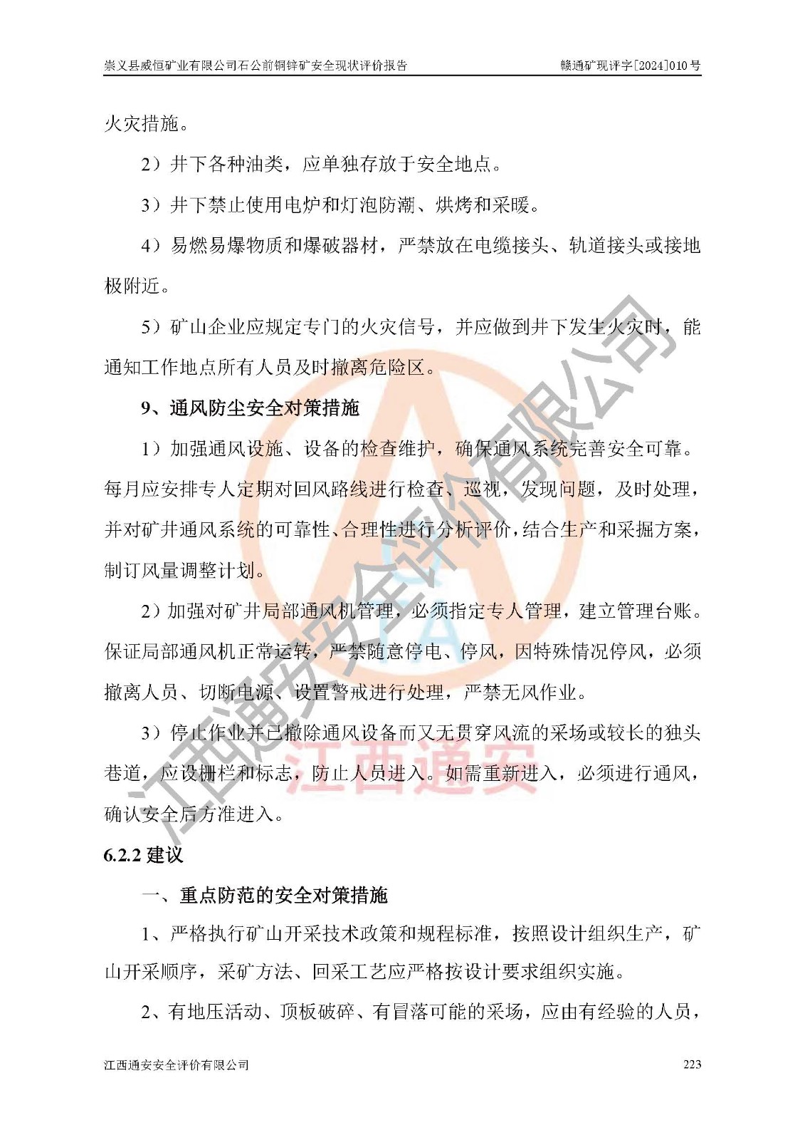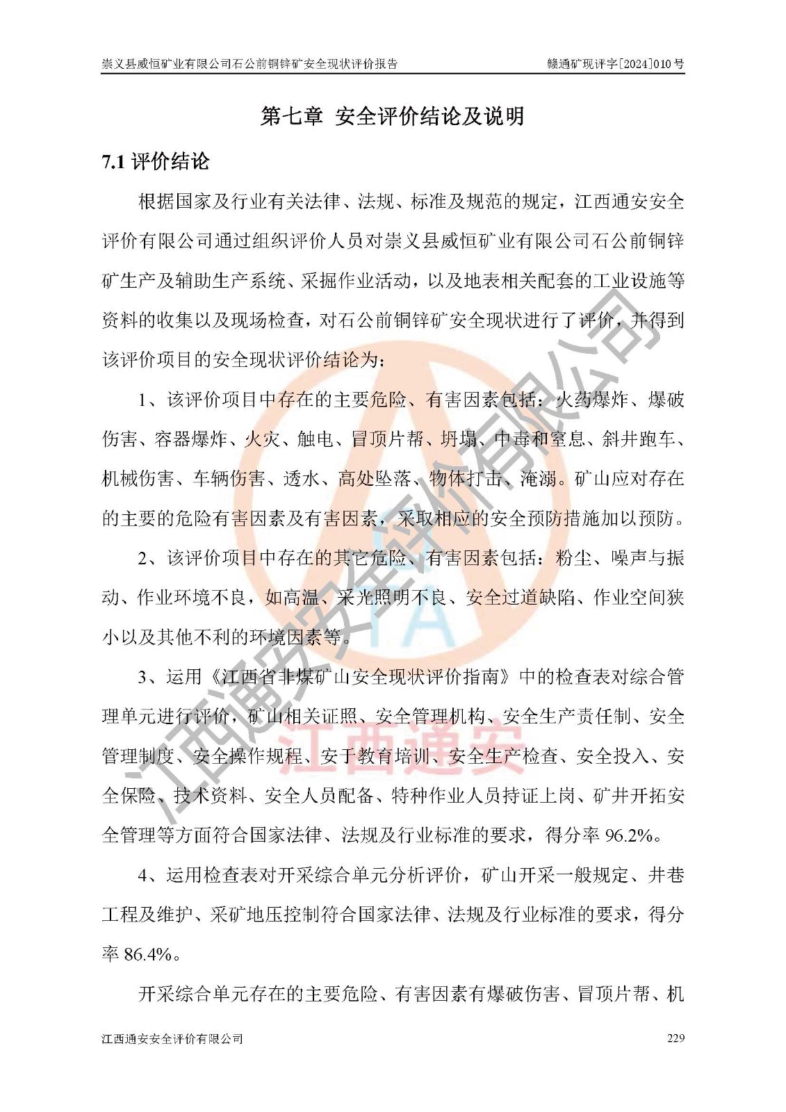 其它 | 崇義縣威恒礦業(yè)有限公司石公前銅鋅礦的主要生產(chǎn)及輔助系統(tǒng):提升運輸、排水、供配電、通風(fēng)、供風(fēng)、采掘、安全避險“六大系統(tǒng)”等基本符合法律法規(guī)要求和規(guī)程、規(guī)范要求;各種危險有害因素及不可接受的風(fēng)險在運行中認(rèn)真落實行之**的技術(shù)措施或管理措施,嚴(yán)格按規(guī)程,按要求加強管理,可以避免和控制各類事故,**安全生產(chǎn)。現(xiàn)階段礦山設(shè)備、設(shè)施和場所符合**安全生產(chǎn)有關(guān)法律、法規(guī)、標(biāo)準(zhǔn)及規(guī)范的規(guī)定。礦山采用斜井+盲斜井聯(lián)合開拓方式,安全生產(chǎn)條件一般;安全管理能滿足法規(guī)要求,礦山地下開采符合**規(guī)定的安全生產(chǎn)條件。 | ||||
