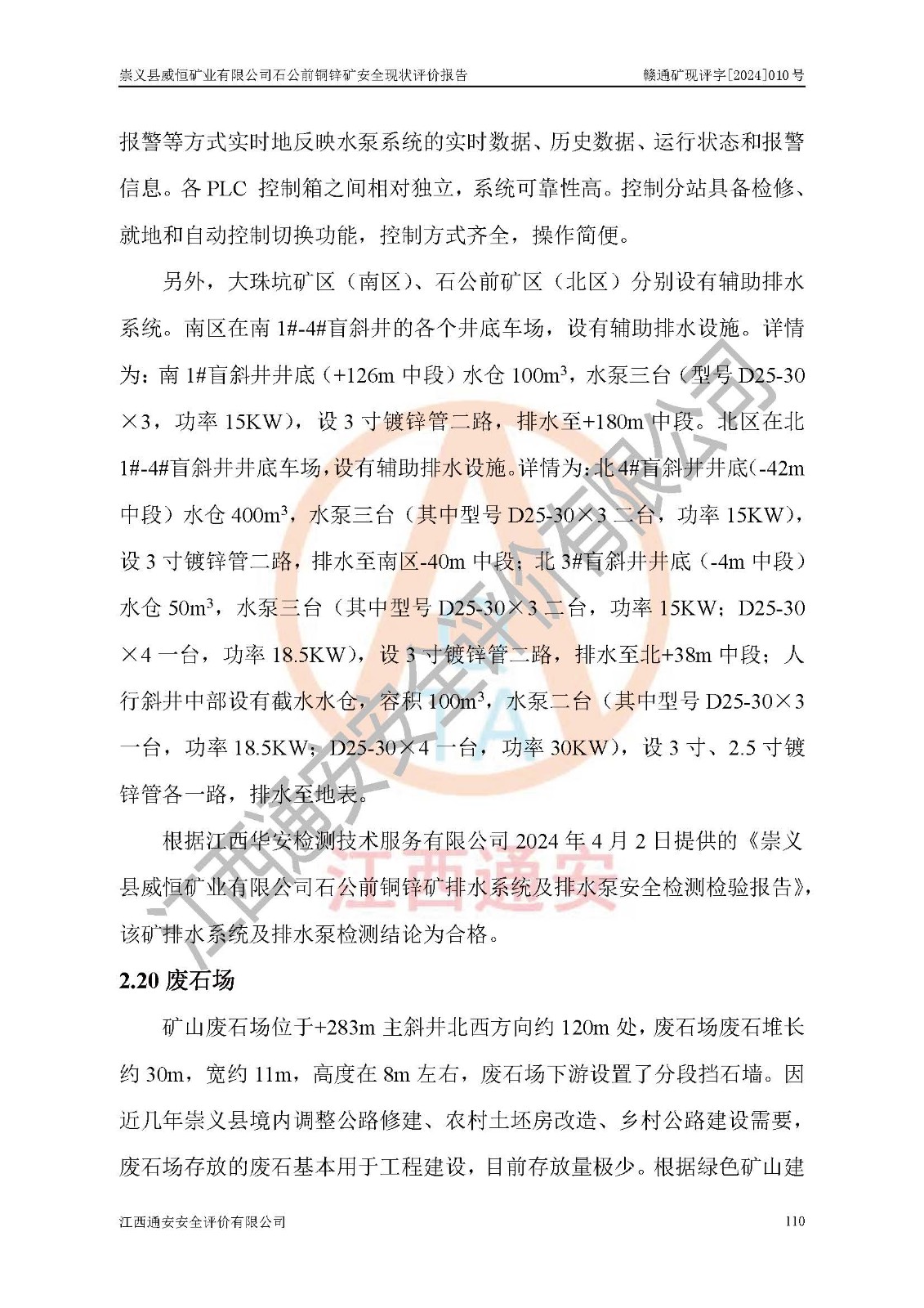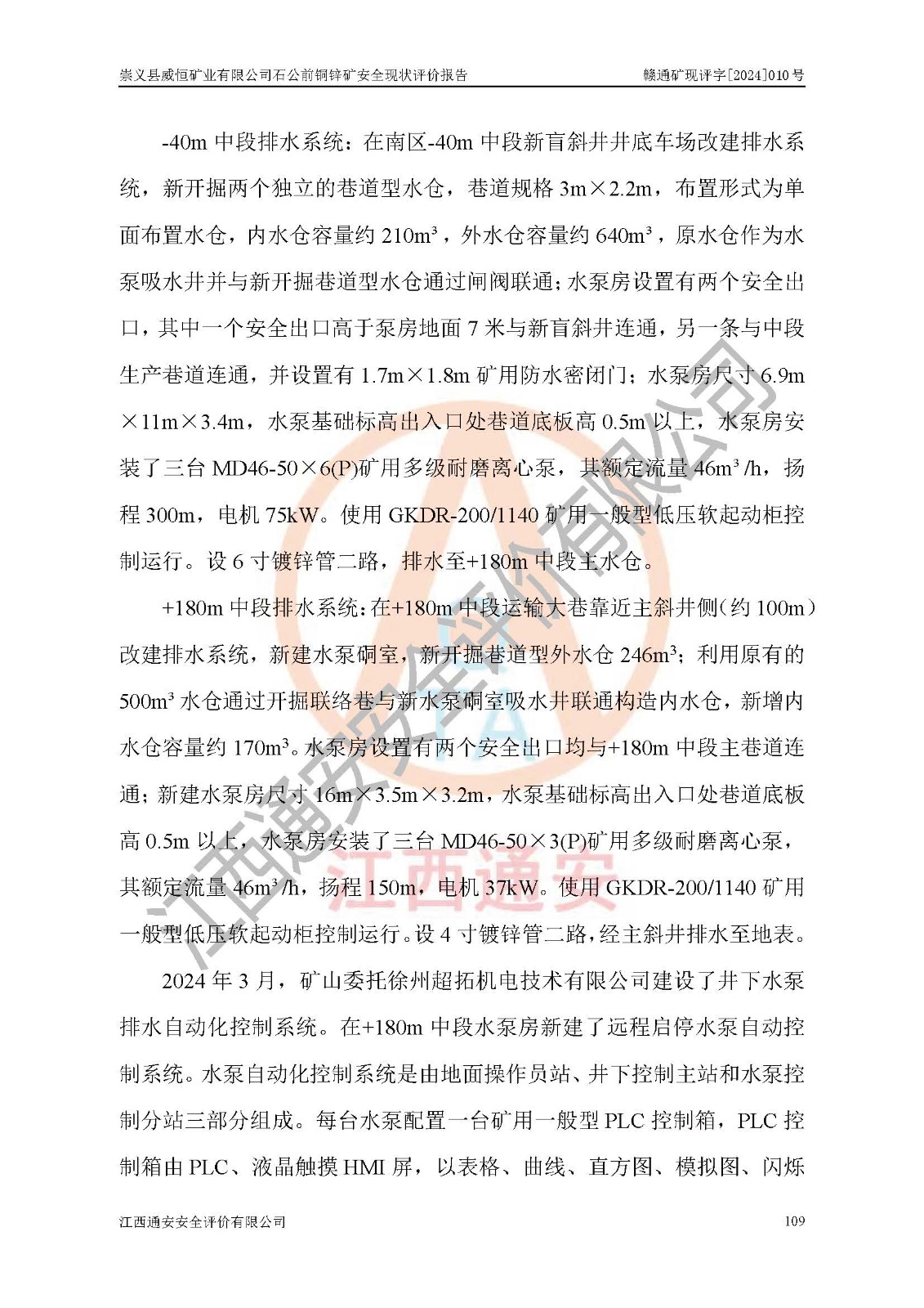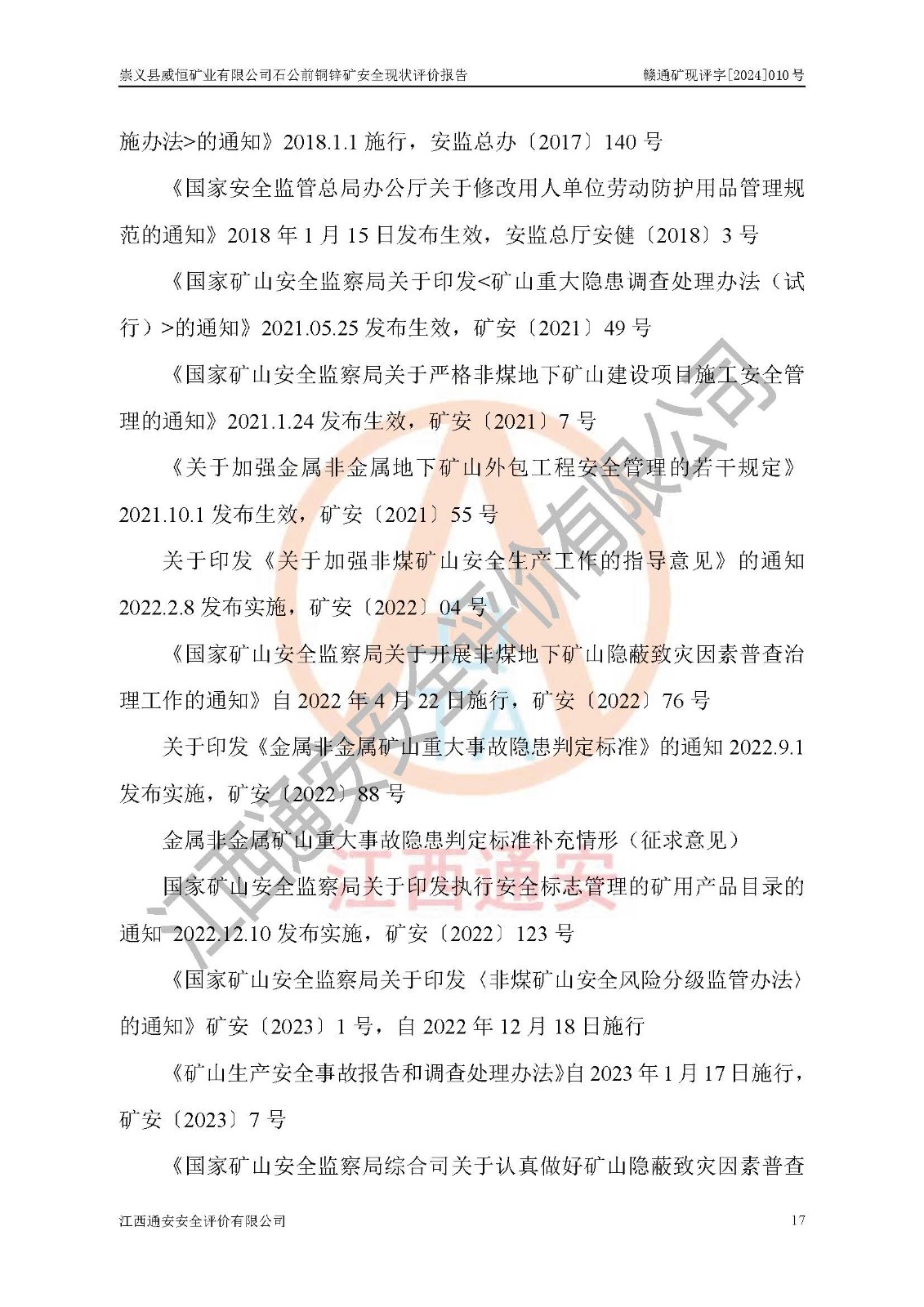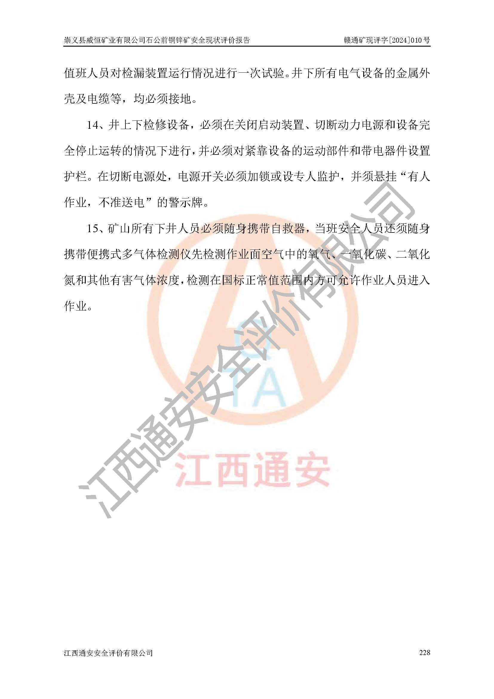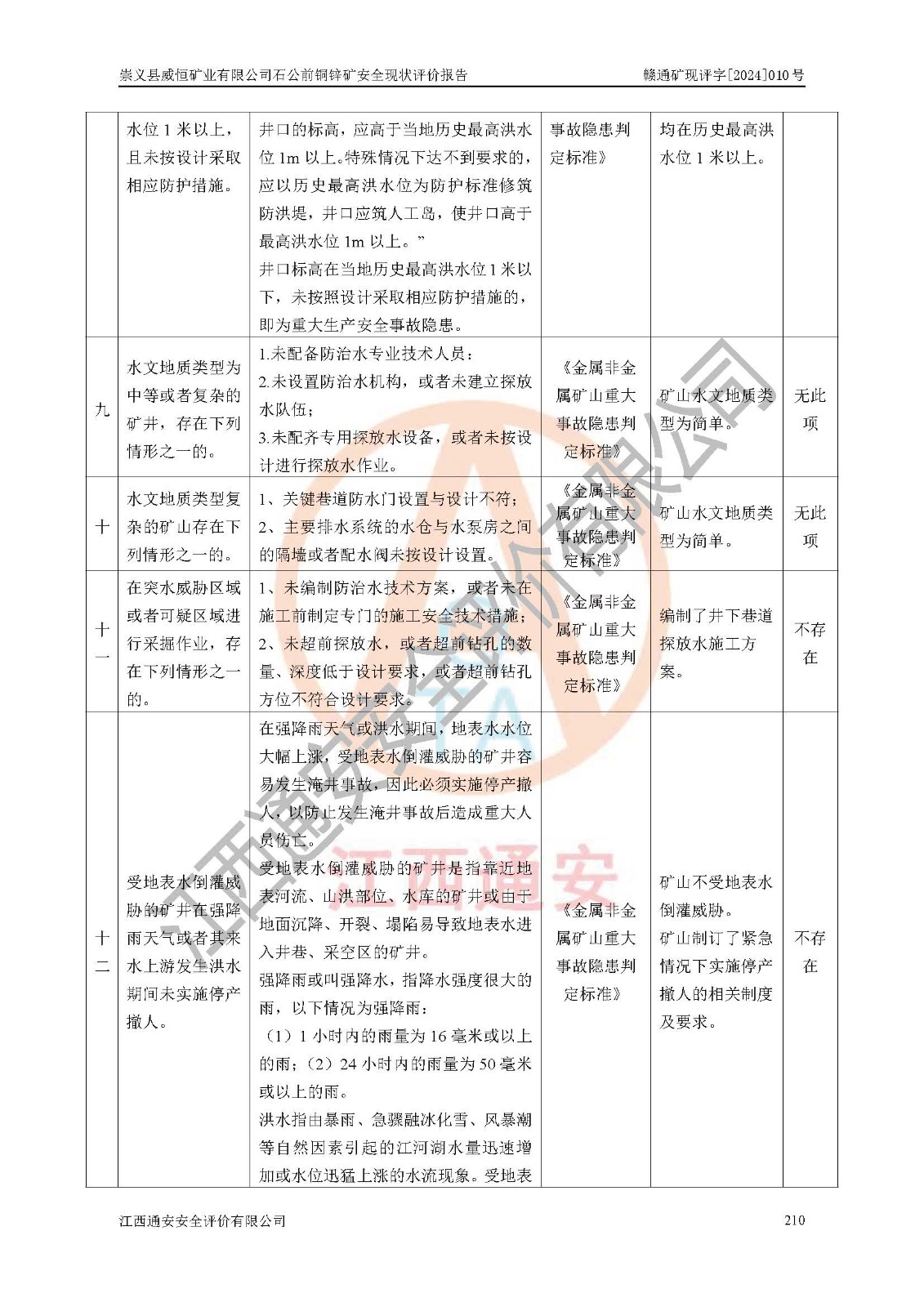 其它 | 崇義縣威恒礦業(yè)有限公司石公前銅鋅礦的主要生產(chǎn)及輔助系統(tǒng):提升運輸、排水、供配電、通風(fēng)、供風(fēng)、采掘、安全避險“六大系統(tǒng)”等基本符合法律法規(guī)要求和規(guī)程、規(guī)范要求;各種危險有害因素及不可接受的風(fēng)險在運行中認(rèn)真落實行之**的技術(shù)措施或管理措施,嚴(yán)格按規(guī)程,按要求加強管理,可以避免和控制各類事故,**安全生產(chǎn)。現(xiàn)階段礦山設(shè)備、設(shè)施和場所符合**安全生產(chǎn)有關(guān)法律、法規(guī)、標(biāo)準(zhǔn)及規(guī)范的規(guī)定。礦山采用斜井+盲斜井聯(lián)合開拓方式,安全生產(chǎn)條件一般;安全管理能滿足法規(guī)要求,礦山地下開采符合**規(guī)定的安全生產(chǎn)條件。 | ||||