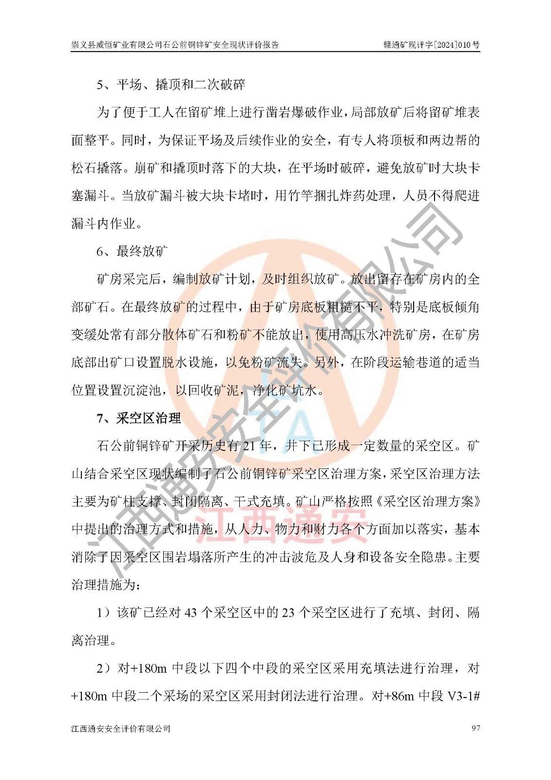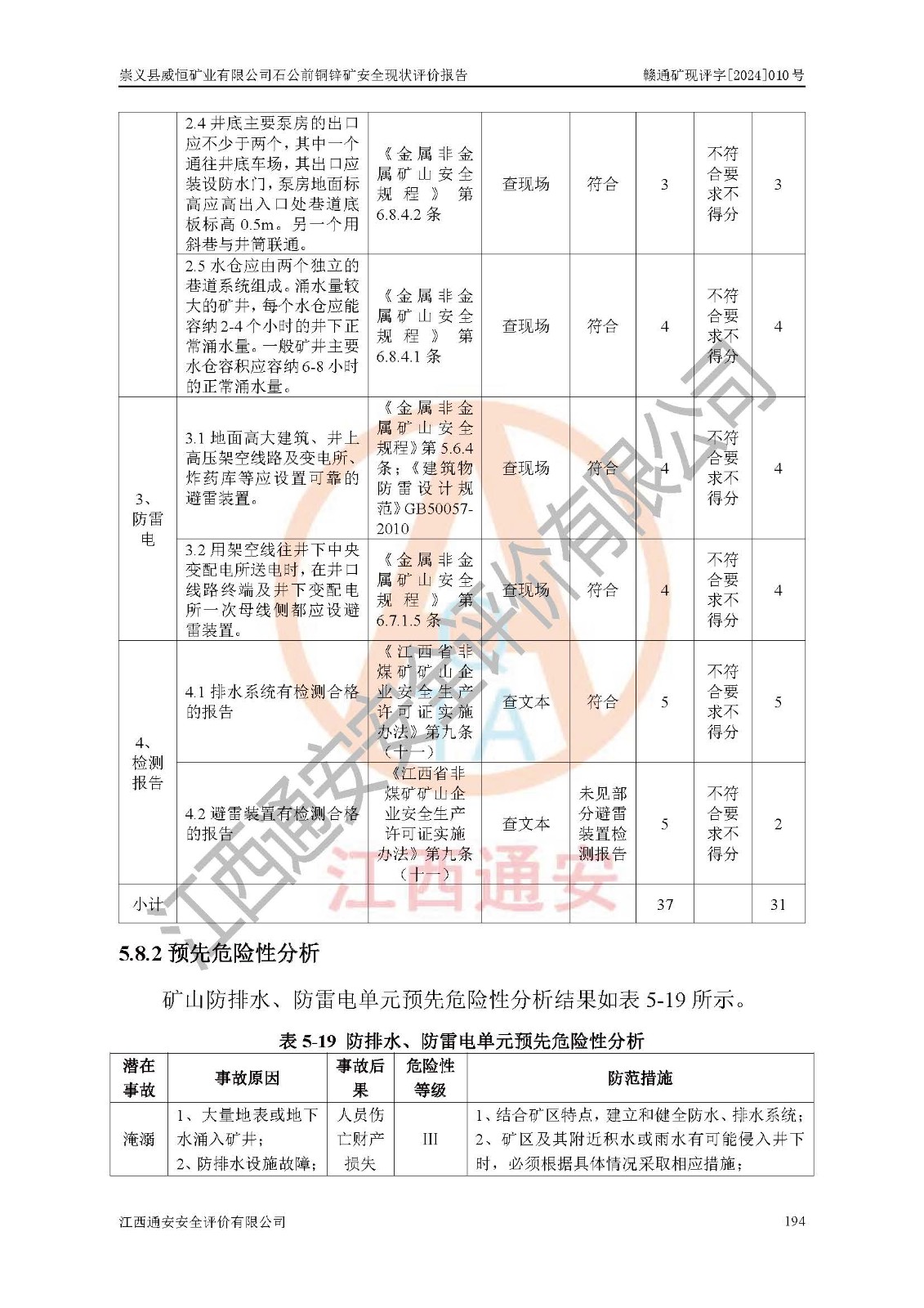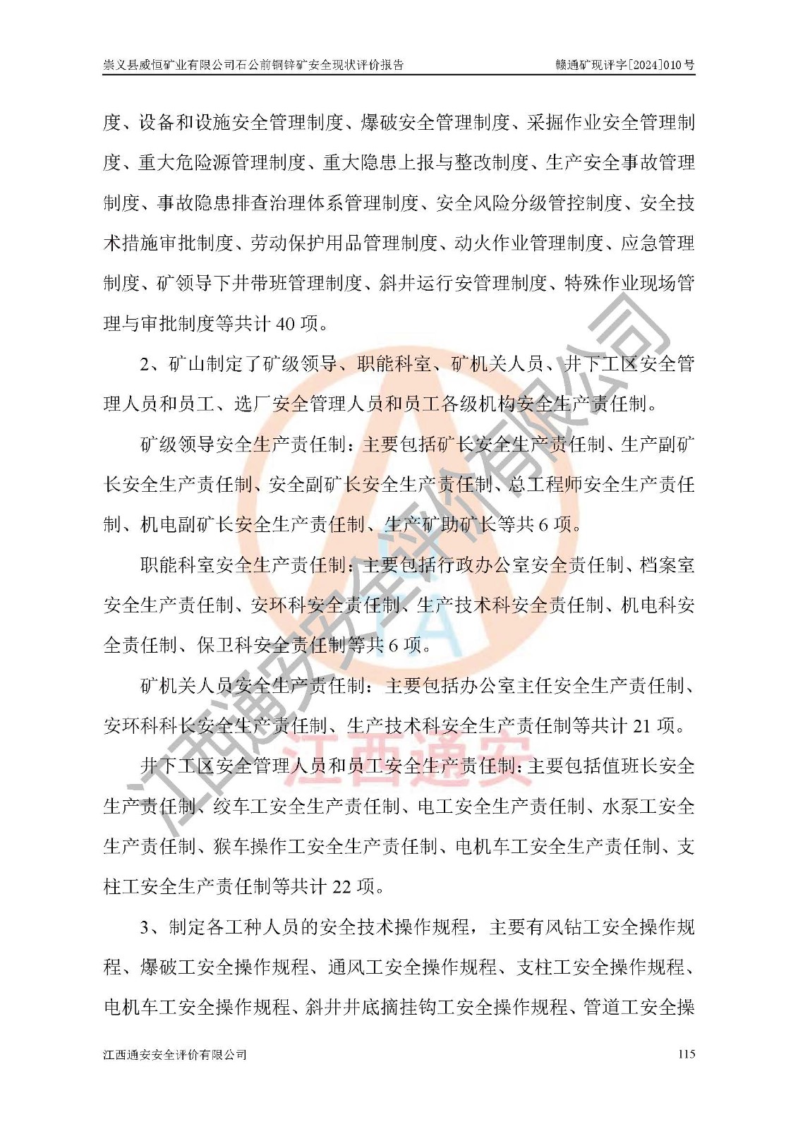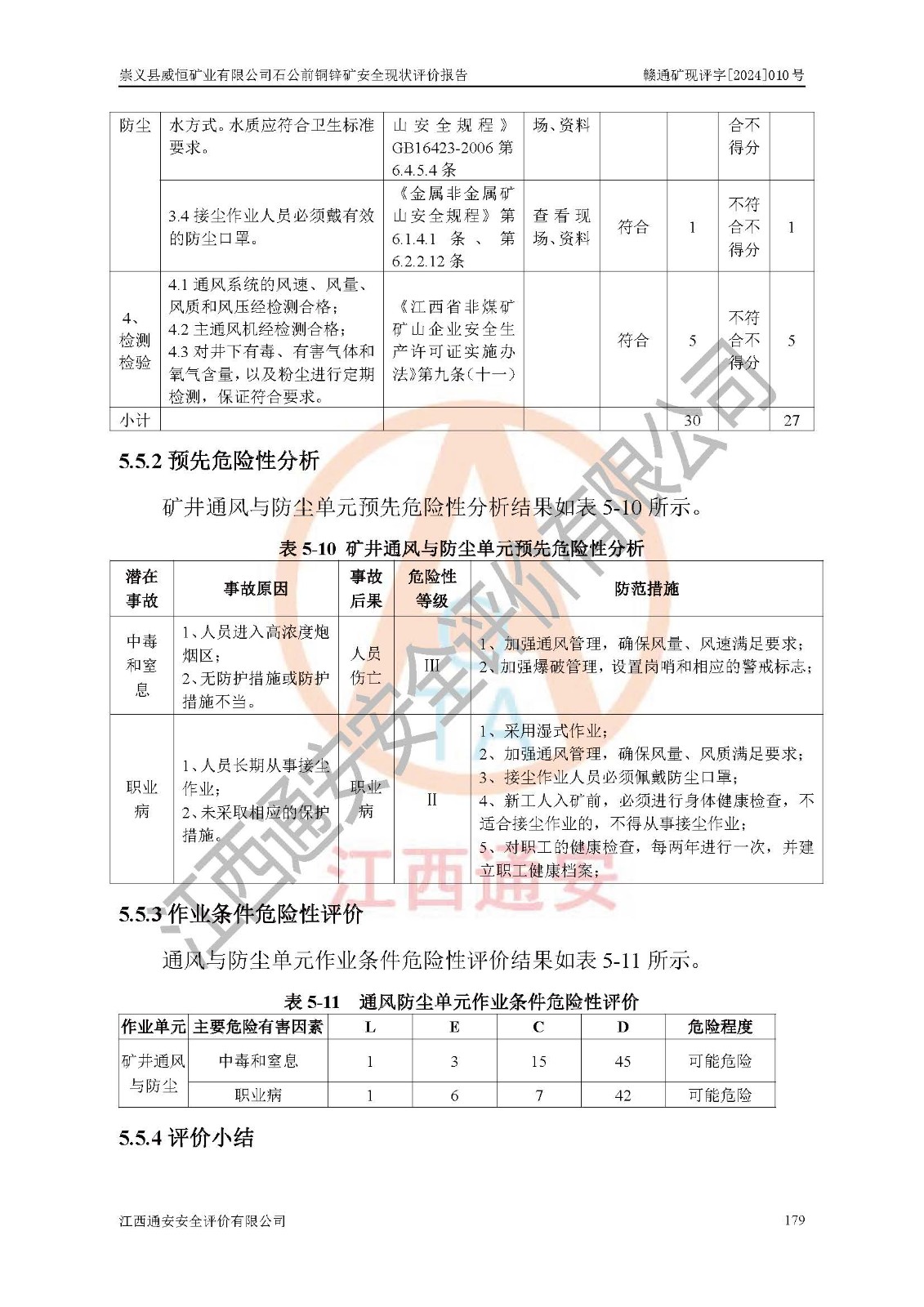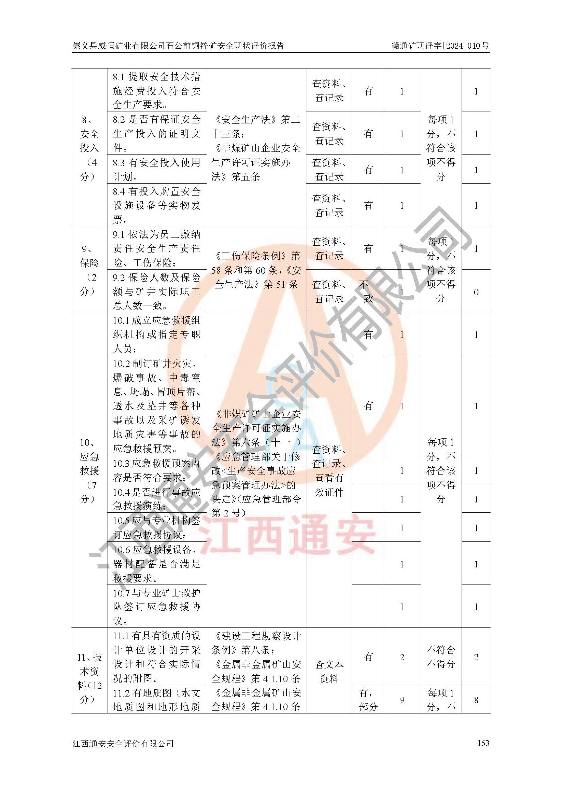 其它 | 崇義縣威恒礦業(yè)有限公司石公前銅鋅礦的主要生產(chǎn)及輔助系統(tǒng):提升運輸、排水、供配電、通風(fēng)、供風(fēng)、采掘、安全避險“六大系統(tǒng)”等基本符合法律法規(guī)要求和規(guī)程、規(guī)范要求;各種危險有害因素及不可接受的風(fēng)險在運行中認(rèn)真落實行之**的技術(shù)措施或管理措施,嚴(yán)格按規(guī)程,按要求加強管理,可以避免和控制各類事故,**安全生產(chǎn)。現(xiàn)階段礦山設(shè)備、設(shè)施和場所符合**安全生產(chǎn)有關(guān)法律、法規(guī)、標(biāo)準(zhǔn)及規(guī)范的規(guī)定。礦山采用斜井+盲斜井聯(lián)合開拓方式,安全生產(chǎn)條件一般;安全管理能滿足法規(guī)要求,礦山地下開采符合**規(guī)定的安全生產(chǎn)條件。 | ||||