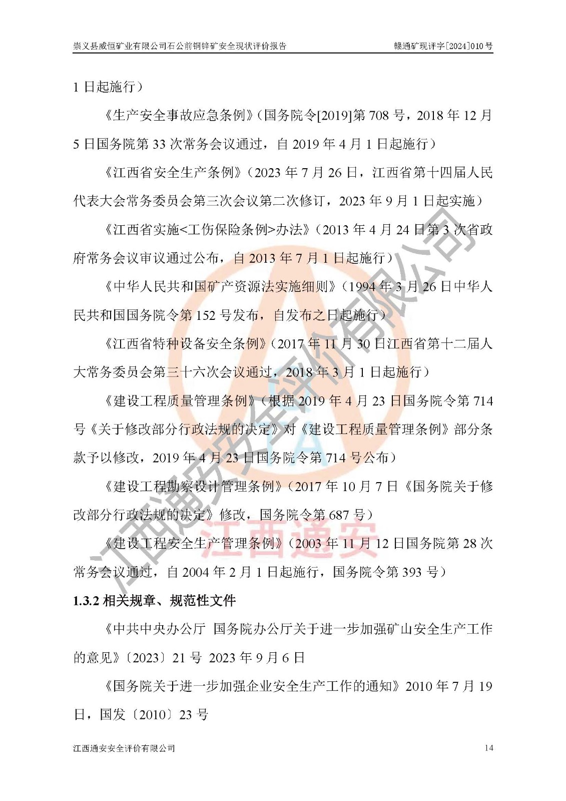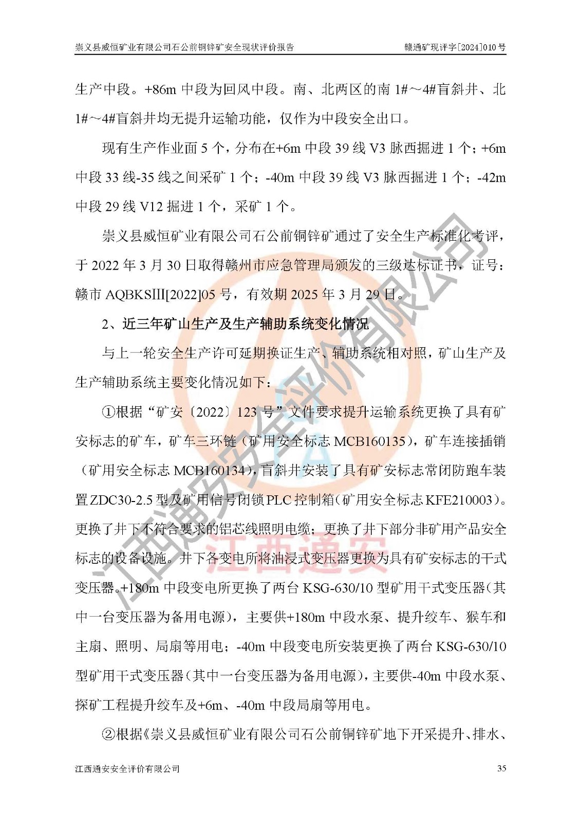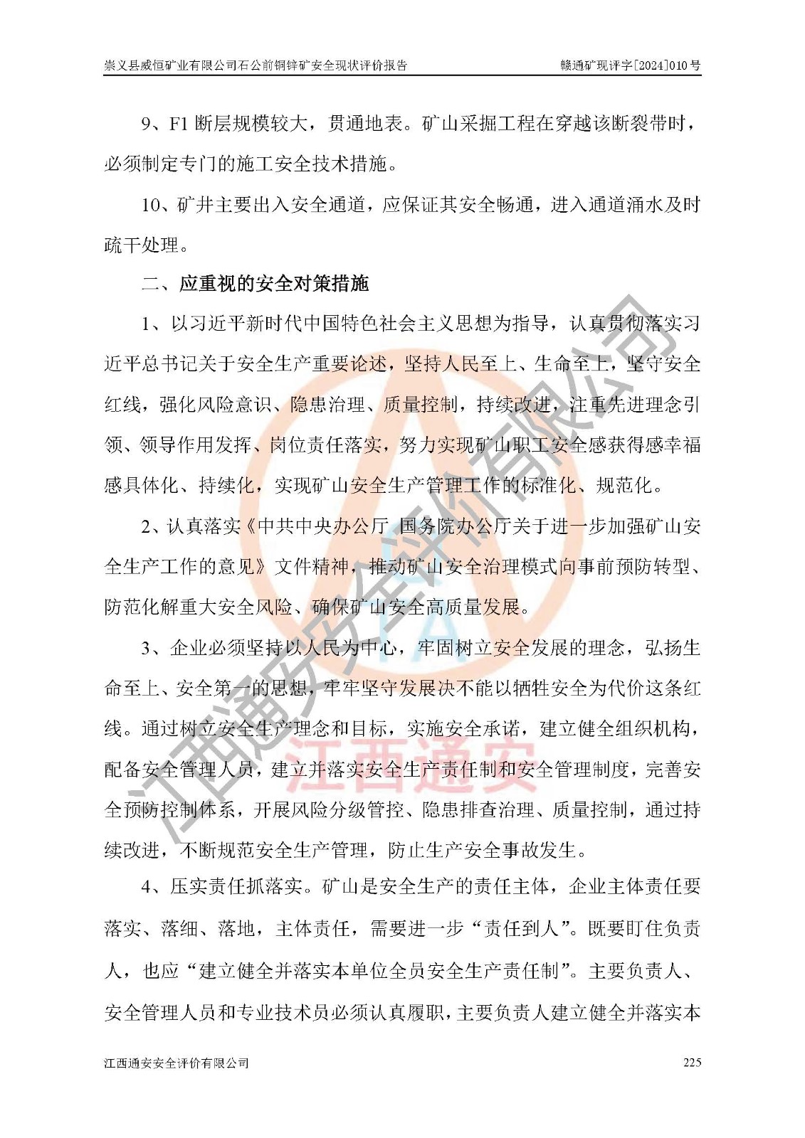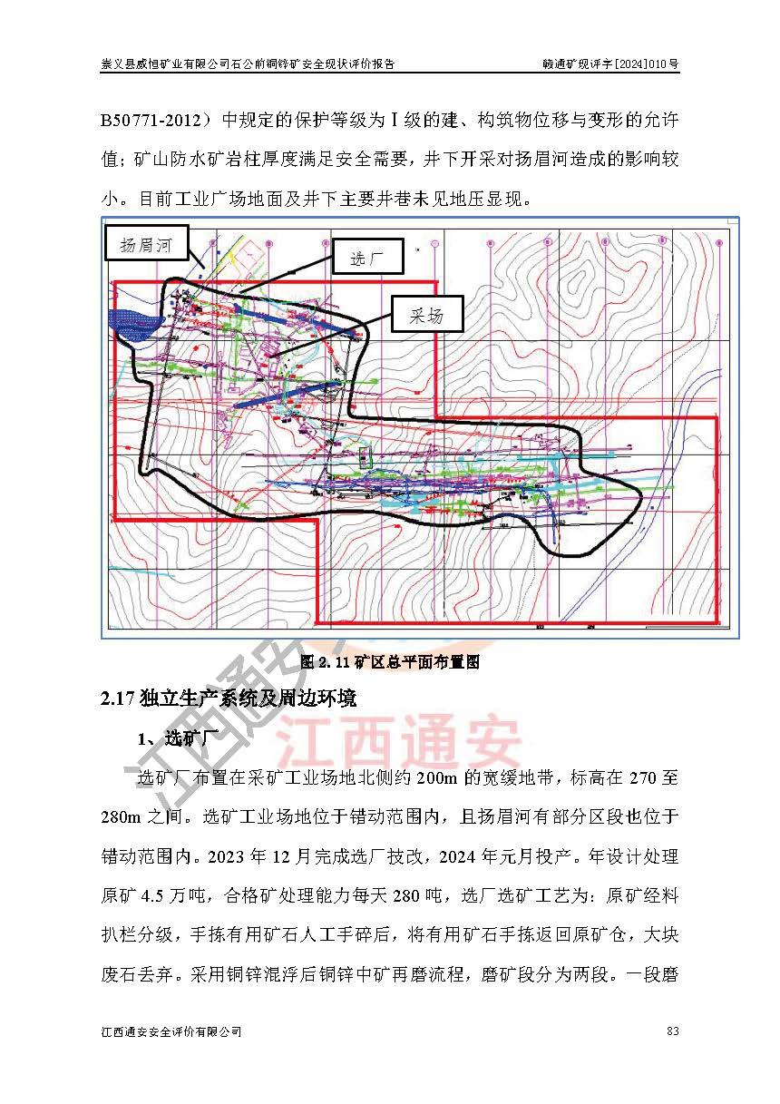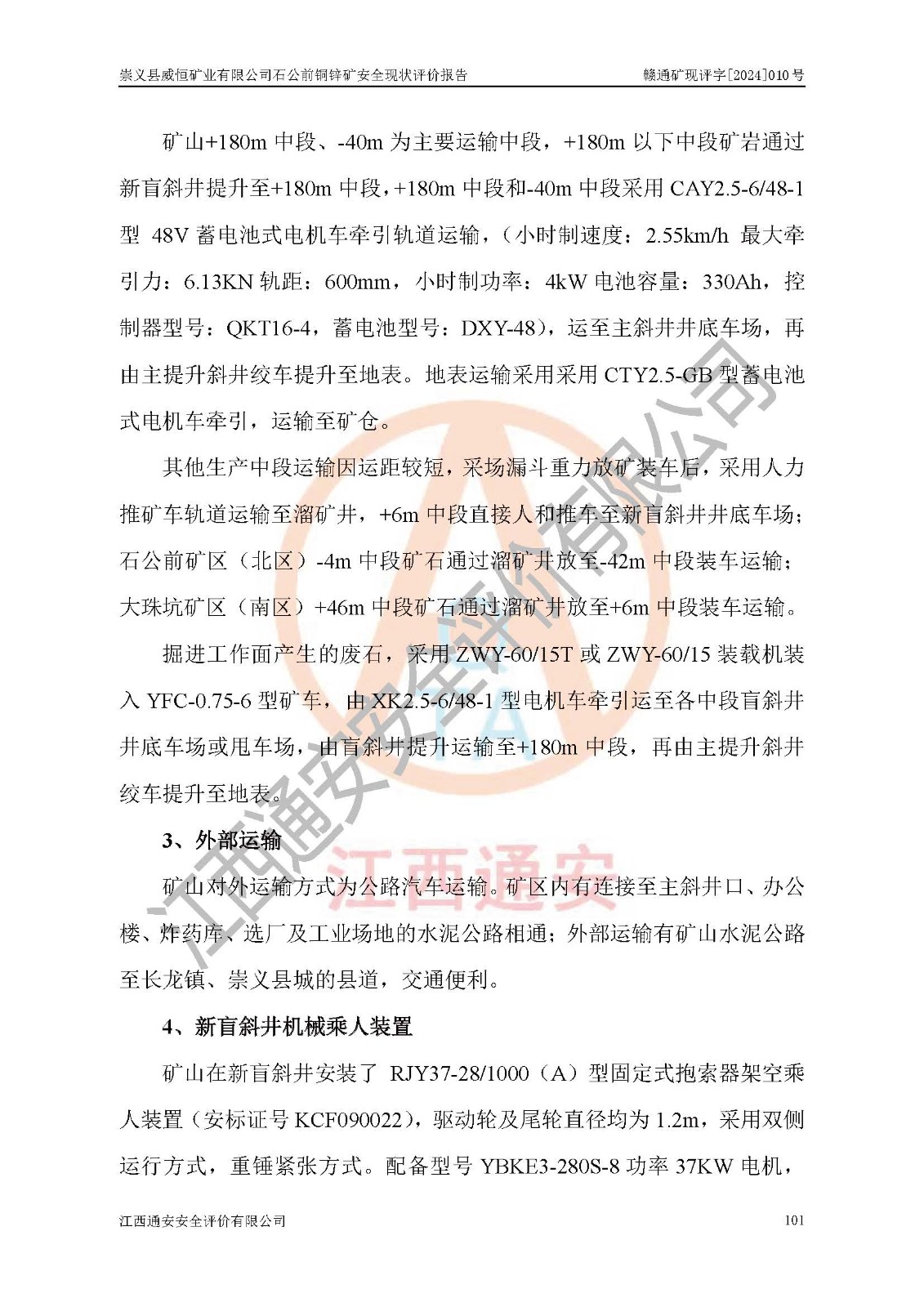 其它 | 崇義縣威恒礦業(yè)有限公司石公前銅鋅礦的主要生產(chǎn)及輔助系統(tǒng):提升運輸、排水、供配電、通風(fēng)、供風(fēng)、采掘、安全避險“六大系統(tǒng)”等基本符合法律法規(guī)要求和規(guī)程、規(guī)范要求;各種危險有害因素及不可接受的風(fēng)險在運行中認(rèn)真落實行之**的技術(shù)措施或管理措施,嚴(yán)格按規(guī)程,按要求加強管理,可以避免和控制各類事故,**安全生產(chǎn)。現(xiàn)階段礦山設(shè)備、設(shè)施和場所符合**安全生產(chǎn)有關(guān)法律、法規(guī)、標(biāo)準(zhǔn)及規(guī)范的規(guī)定。礦山采用斜井+盲斜井聯(lián)合開拓方式,安全生產(chǎn)條件一般;安全管理能滿足法規(guī)要求,礦山地下開采符合**規(guī)定的安全生產(chǎn)條件。 | ||||
