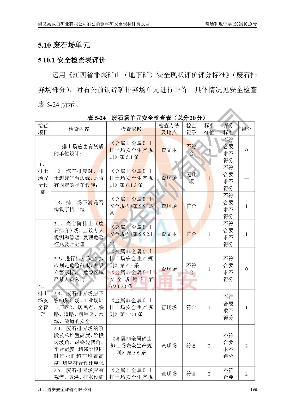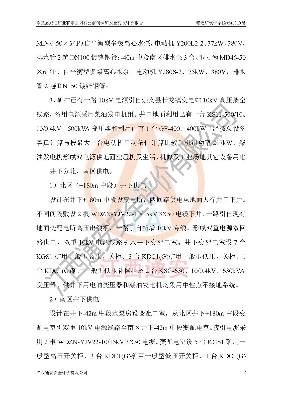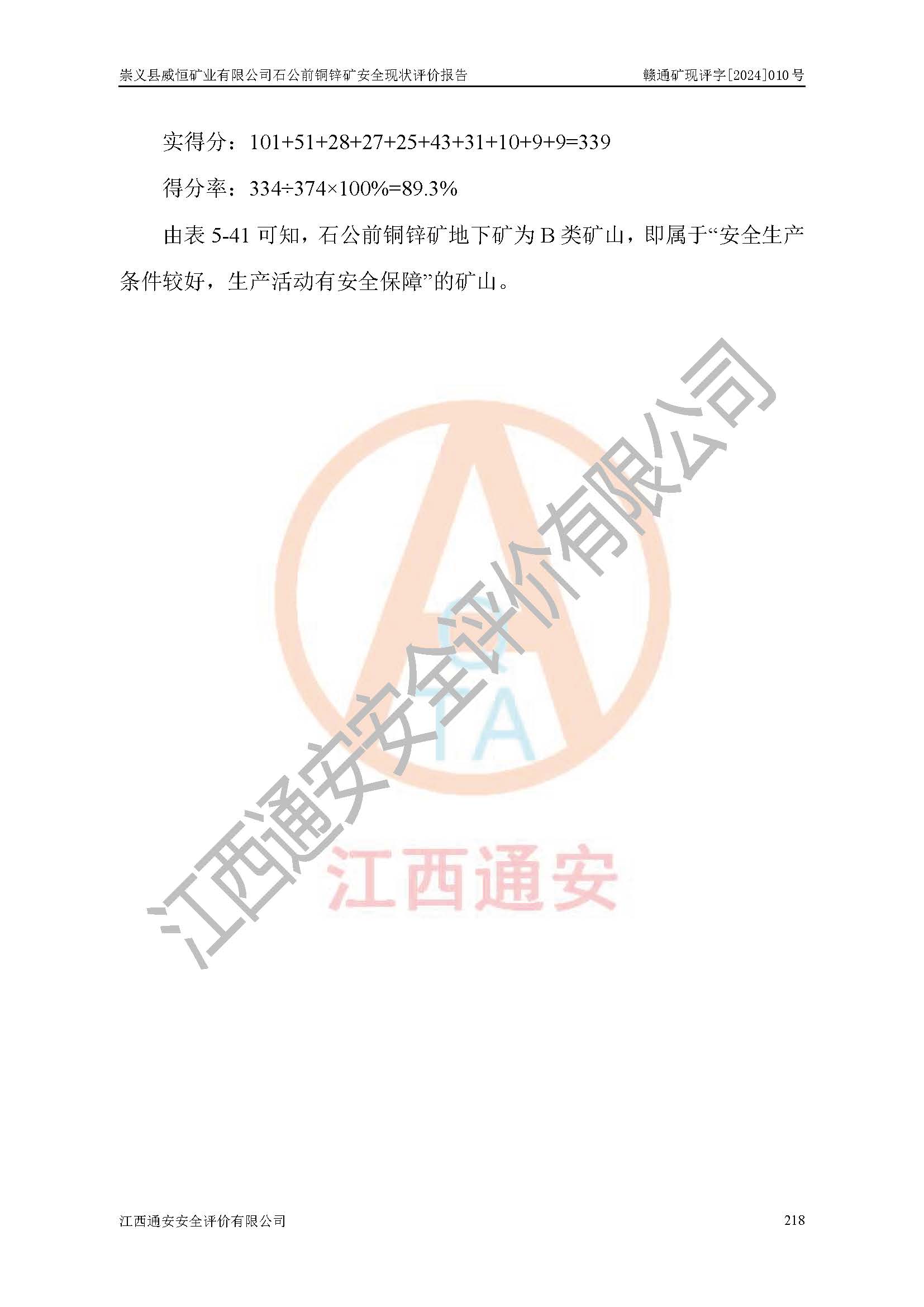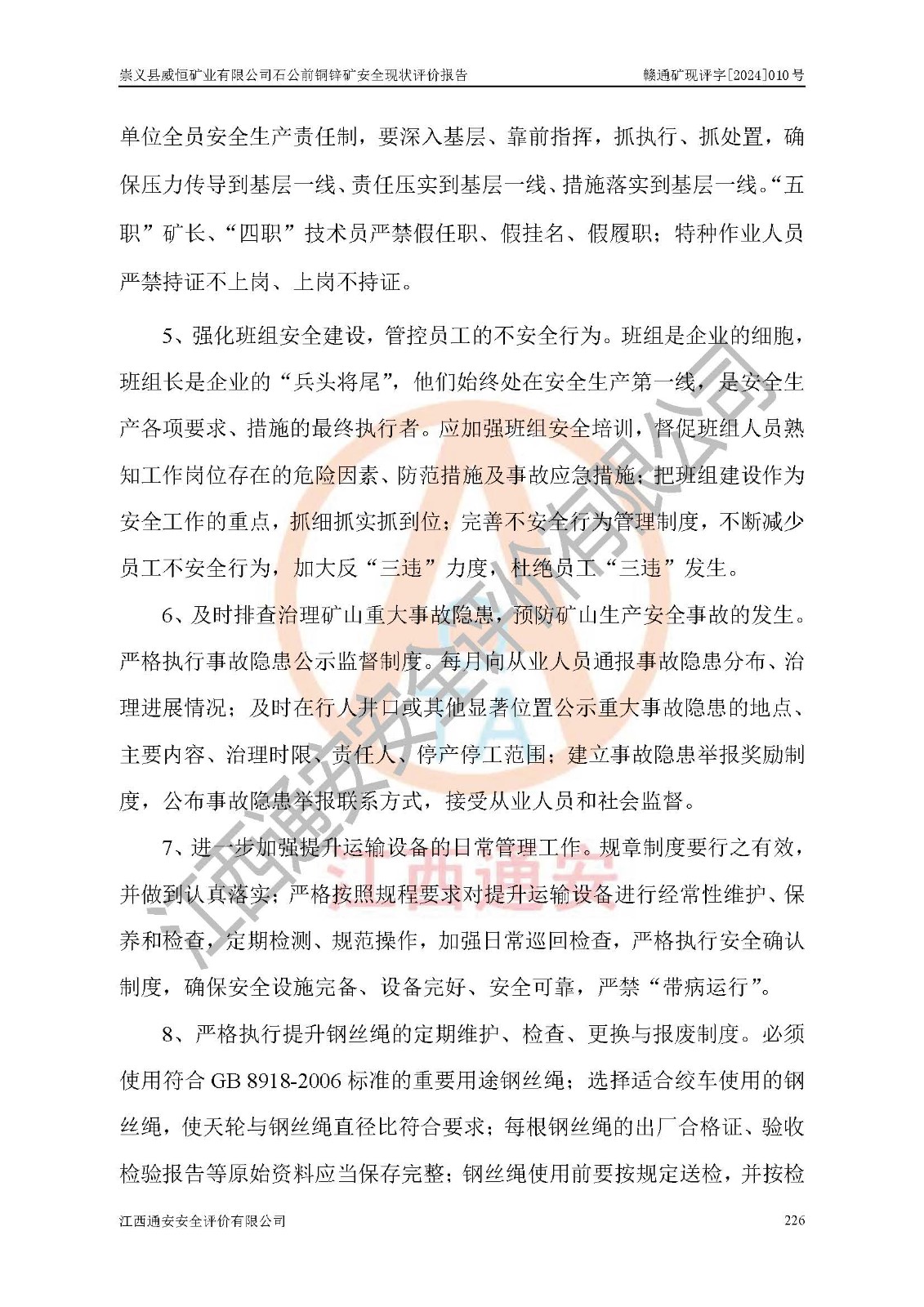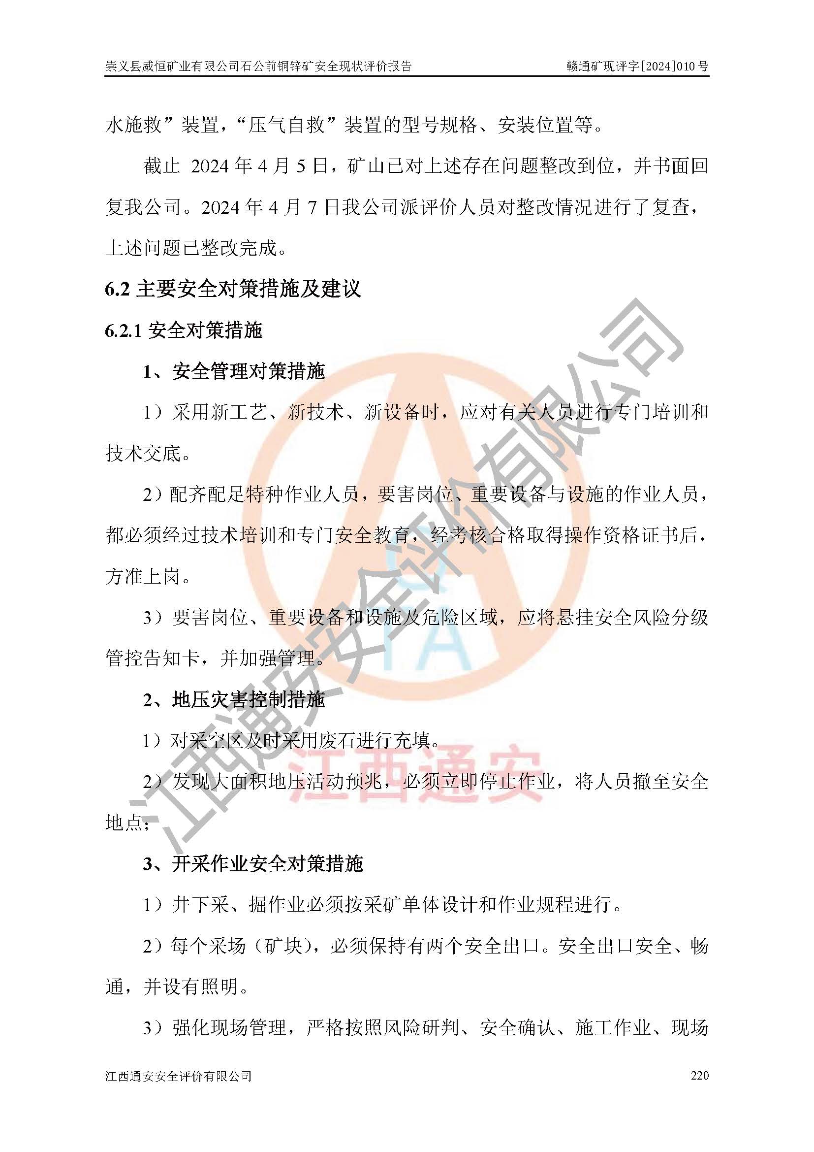 其它 | 崇義縣威恒礦業(yè)有限公司石公前銅鋅礦的主要生產(chǎn)及輔助系統(tǒng):提升運輸、排水、供配電、通風(fēng)、供風(fēng)、采掘、安全避險“六大系統(tǒng)”等基本符合法律法規(guī)要求和規(guī)程、規(guī)范要求;各種危險有害因素及不可接受的風(fēng)險在運行中認(rèn)真落實行之**的技術(shù)措施或管理措施,嚴(yán)格按規(guī)程,按要求加強管理,可以避免和控制各類事故,**安全生產(chǎn)。現(xiàn)階段礦山設(shè)備、設(shè)施和場所符合**安全生產(chǎn)有關(guān)法律、法規(guī)、標(biāo)準(zhǔn)及規(guī)范的規(guī)定。礦山采用斜井+盲斜井聯(lián)合開拓方式,安全生產(chǎn)條件一般;安全管理能滿足法規(guī)要求,礦山地下開采符合**規(guī)定的安全生產(chǎn)條件。 | ||||