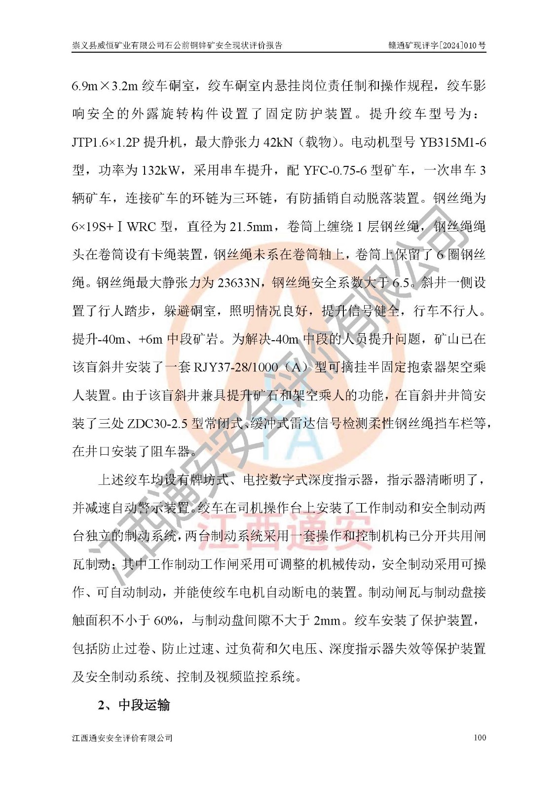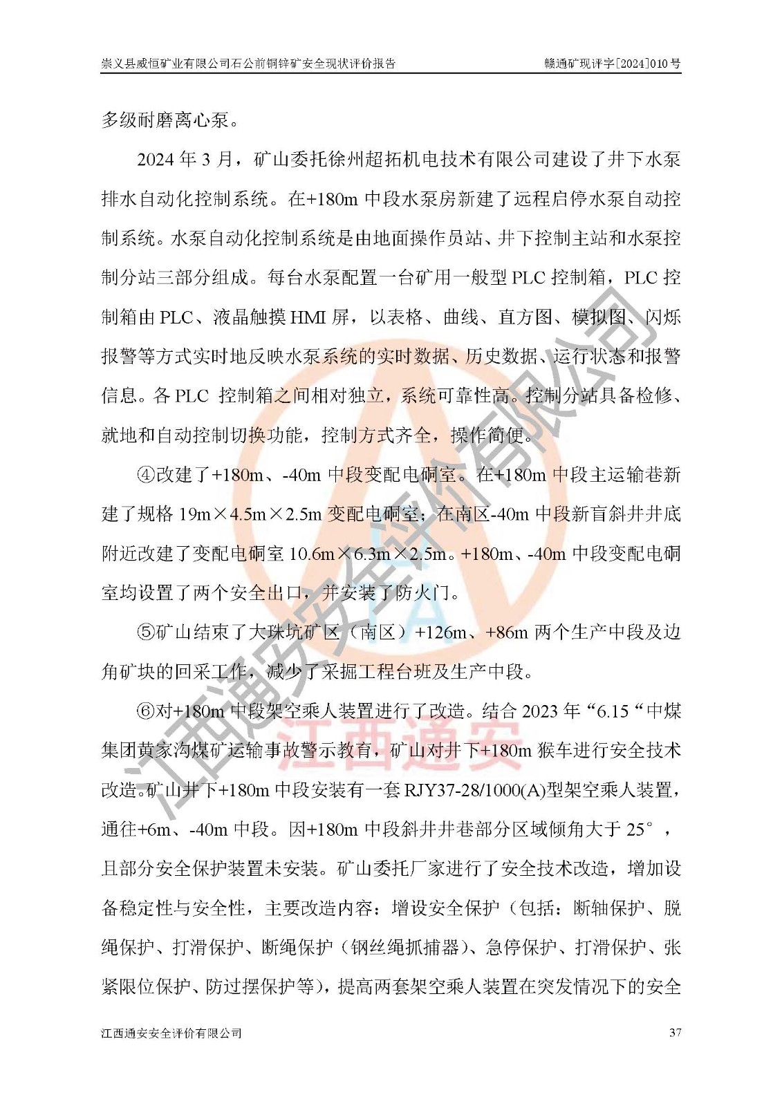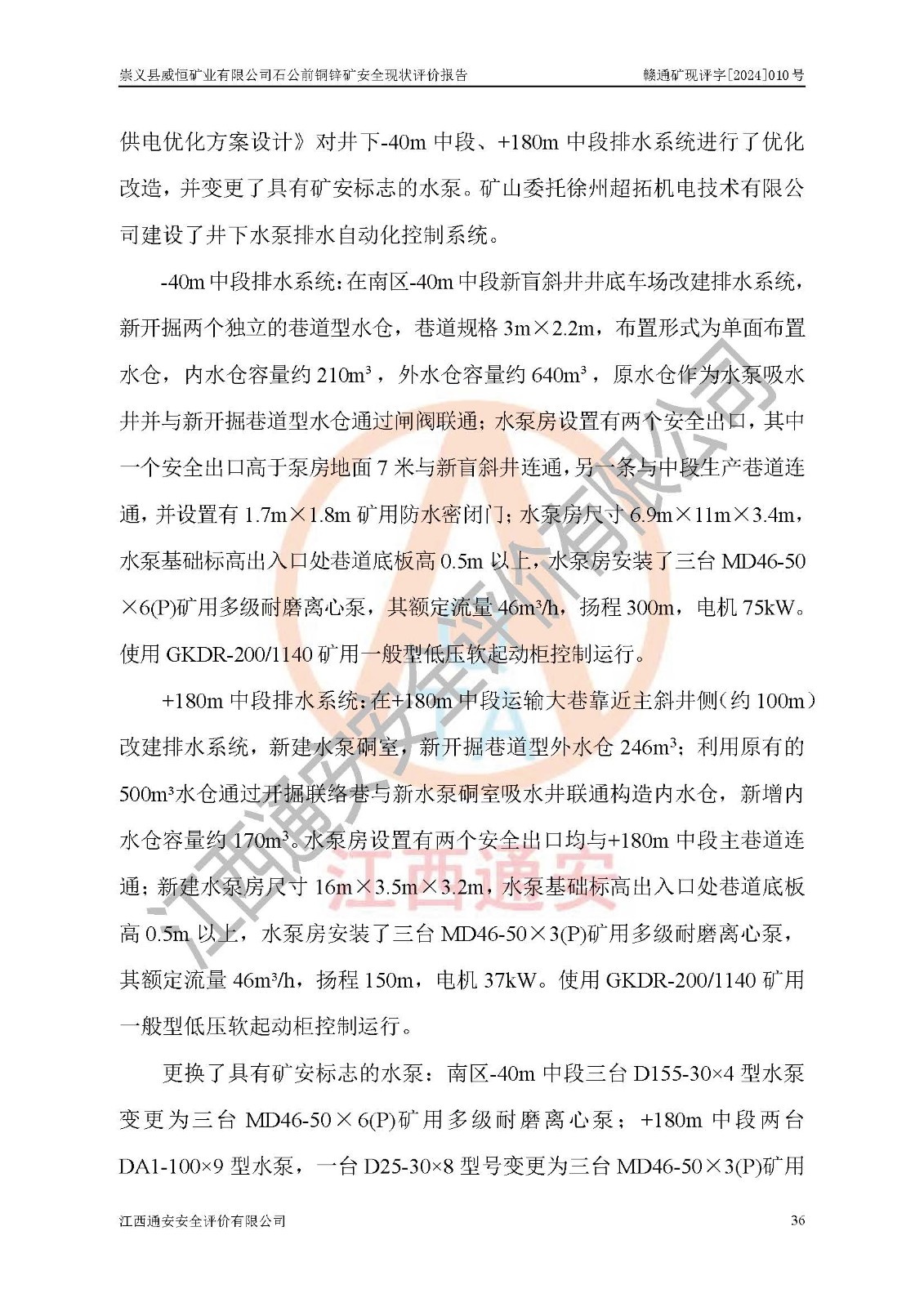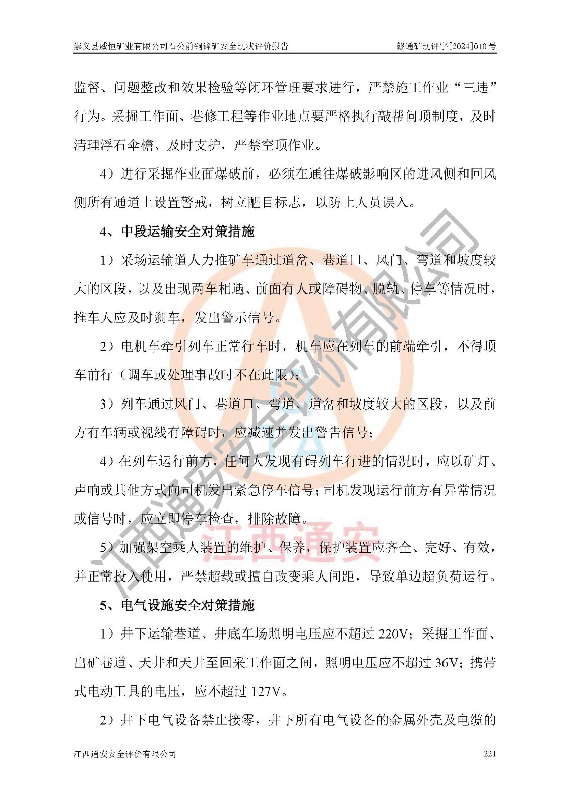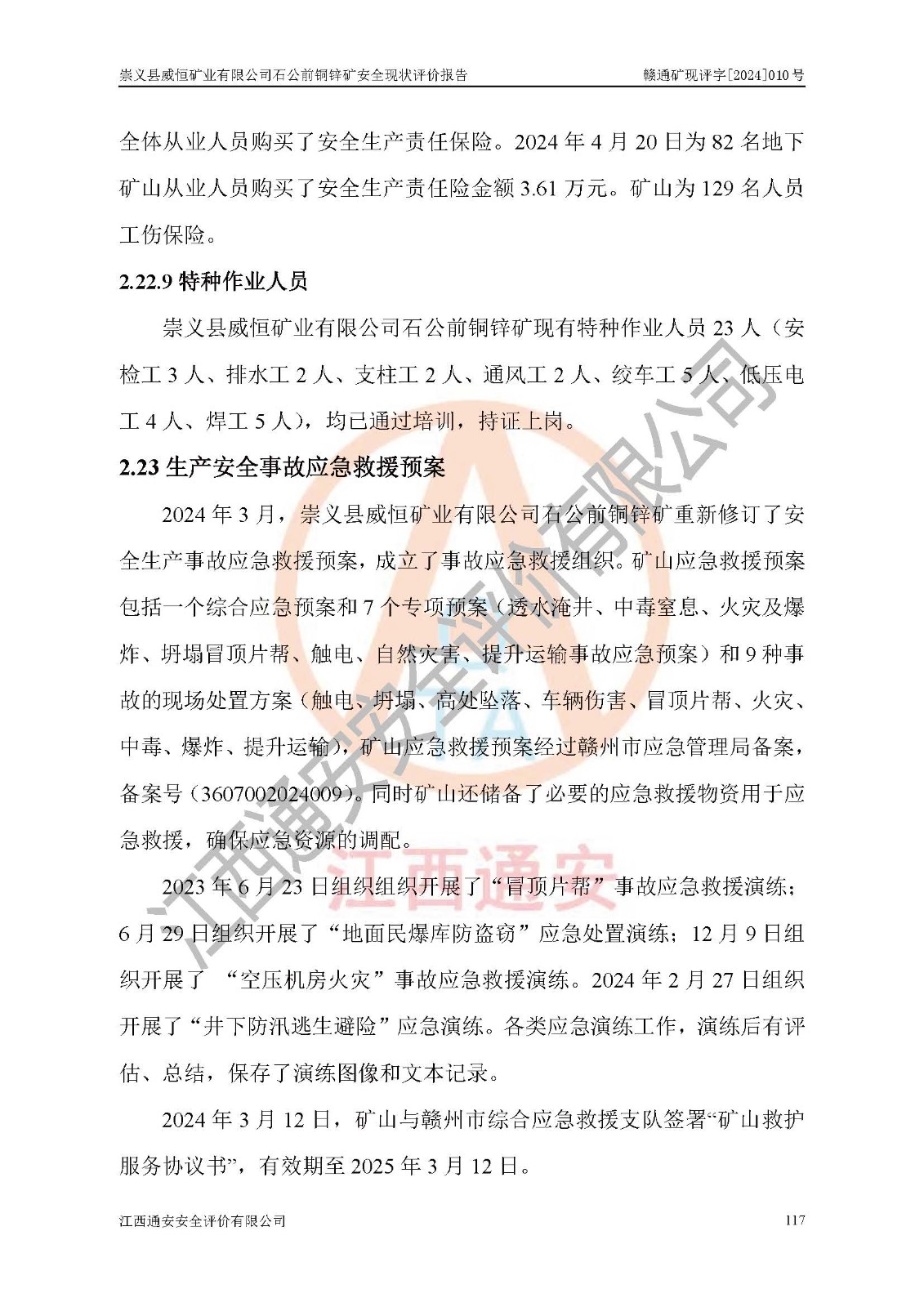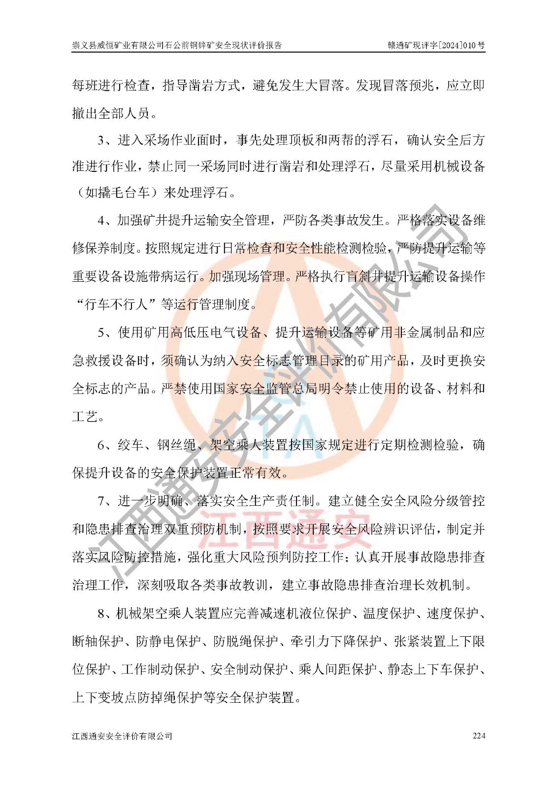 其它 | 崇義縣威恒礦業(yè)有限公司石公前銅鋅礦的主要生產(chǎn)及輔助系統(tǒng):提升運輸、排水、供配電、通風(fēng)、供風(fēng)、采掘、安全避險“六大系統(tǒng)”等基本符合法律法規(guī)要求和規(guī)程、規(guī)范要求;各種危險有害因素及不可接受的風(fēng)險在運行中認(rèn)真落實行之**的技術(shù)措施或管理措施,嚴(yán)格按規(guī)程,按要求加強管理,可以避免和控制各類事故,**安全生產(chǎn)。現(xiàn)階段礦山設(shè)備、設(shè)施和場所符合**安全生產(chǎn)有關(guān)法律、法規(guī)、標(biāo)準(zhǔn)及規(guī)范的規(guī)定。礦山采用斜井+盲斜井聯(lián)合開拓方式,安全生產(chǎn)條件一般;安全管理能滿足法規(guī)要求,礦山地下開采符合**規(guī)定的安全生產(chǎn)條件。 | ||||