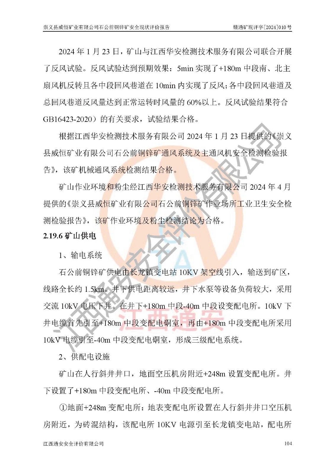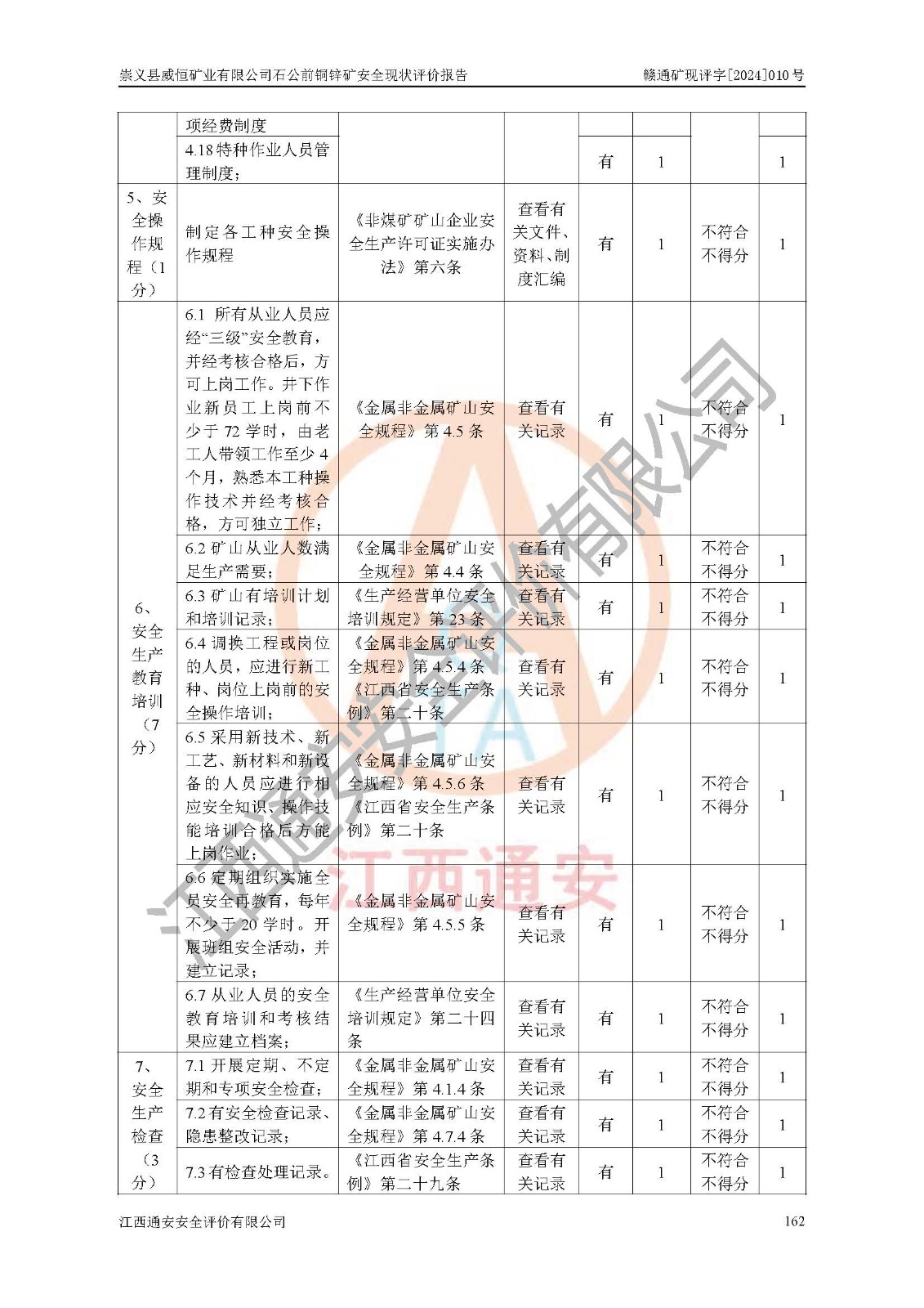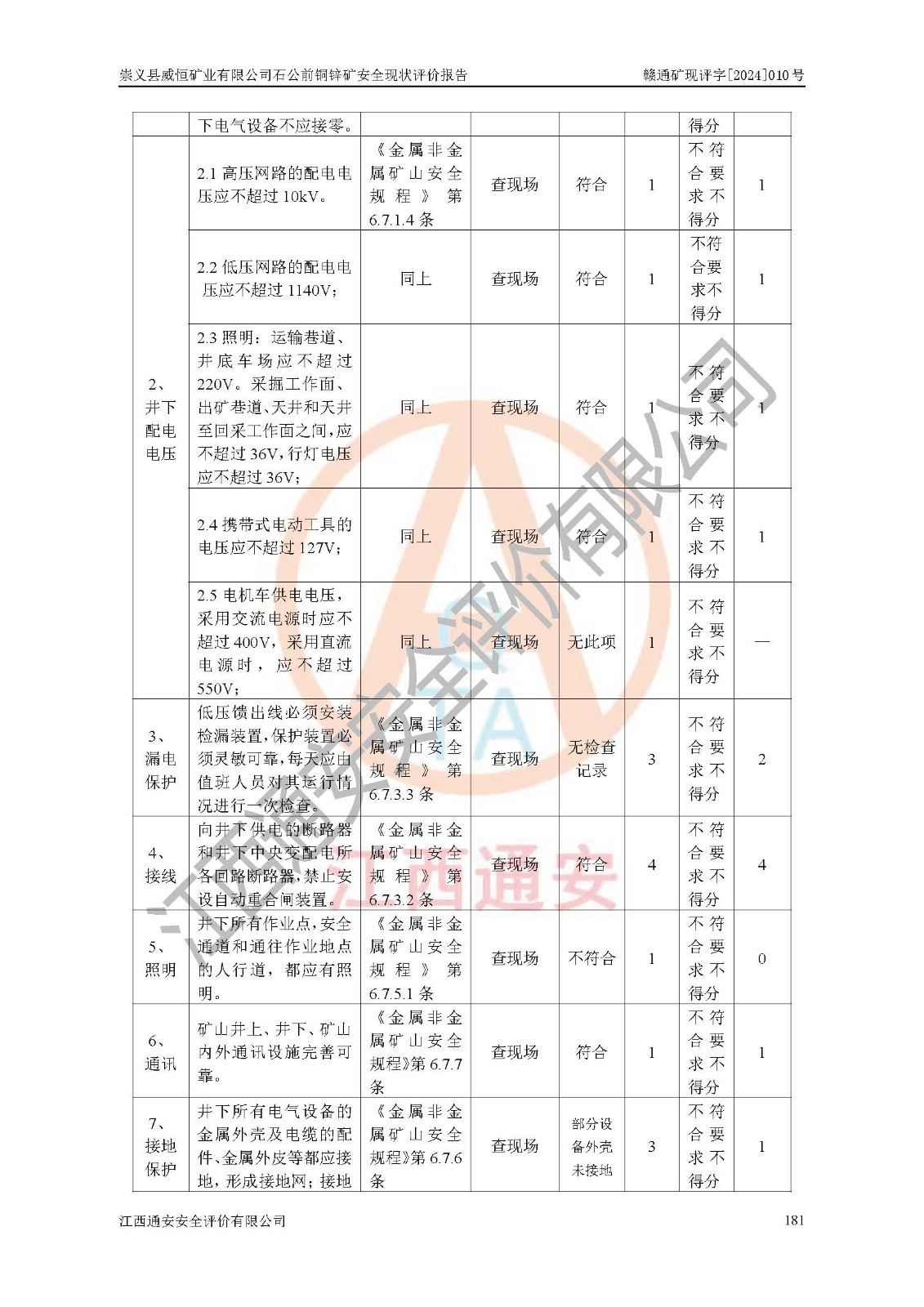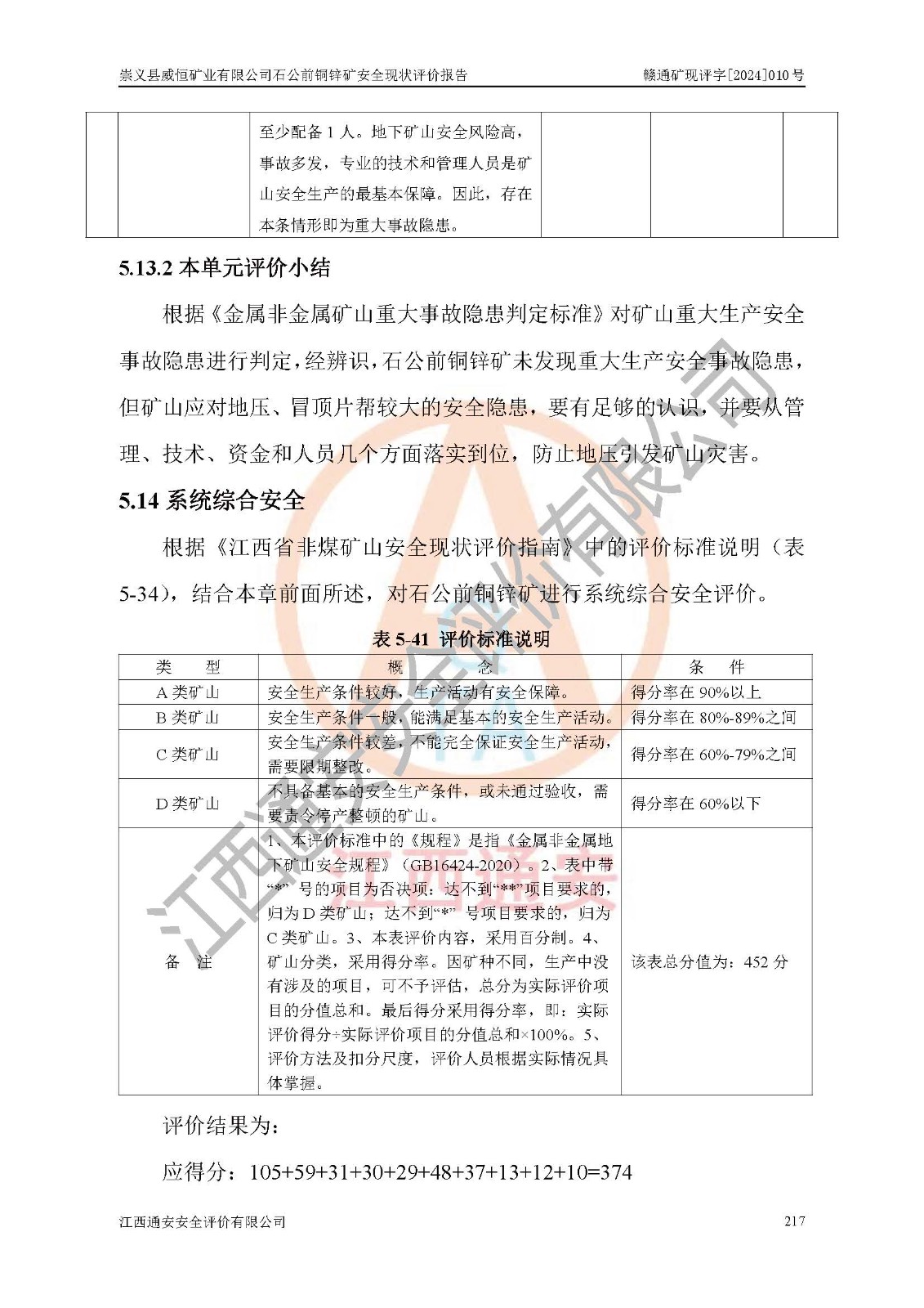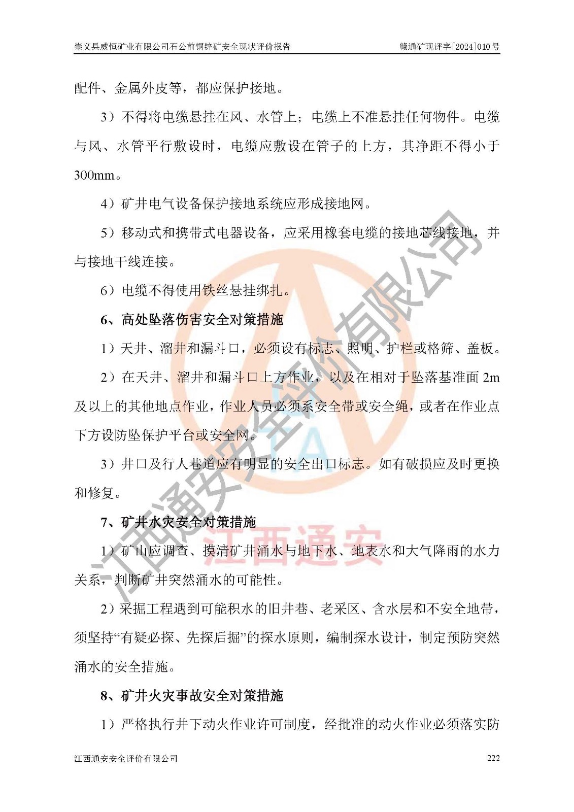 其它 | 崇義縣威恒礦業(yè)有限公司石公前銅鋅礦的主要生產(chǎn)及輔助系統(tǒng):提升運輸、排水、供配電、通風(fēng)、供風(fēng)、采掘、安全避險“六大系統(tǒng)”等基本符合法律法規(guī)要求和規(guī)程、規(guī)范要求;各種危險有害因素及不可接受的風(fēng)險在運行中認(rèn)真落實行之**的技術(shù)措施或管理措施,嚴(yán)格按規(guī)程,按要求加強管理,可以避免和控制各類事故,**安全生產(chǎn)。現(xiàn)階段礦山設(shè)備、設(shè)施和場所符合**安全生產(chǎn)有關(guān)法律、法規(guī)、標(biāo)準(zhǔn)及規(guī)范的規(guī)定。礦山采用斜井+盲斜井聯(lián)合開拓方式,安全生產(chǎn)條件一般;安全管理能滿足法規(guī)要求,礦山地下開采符合**規(guī)定的安全生產(chǎn)條件。 | ||||