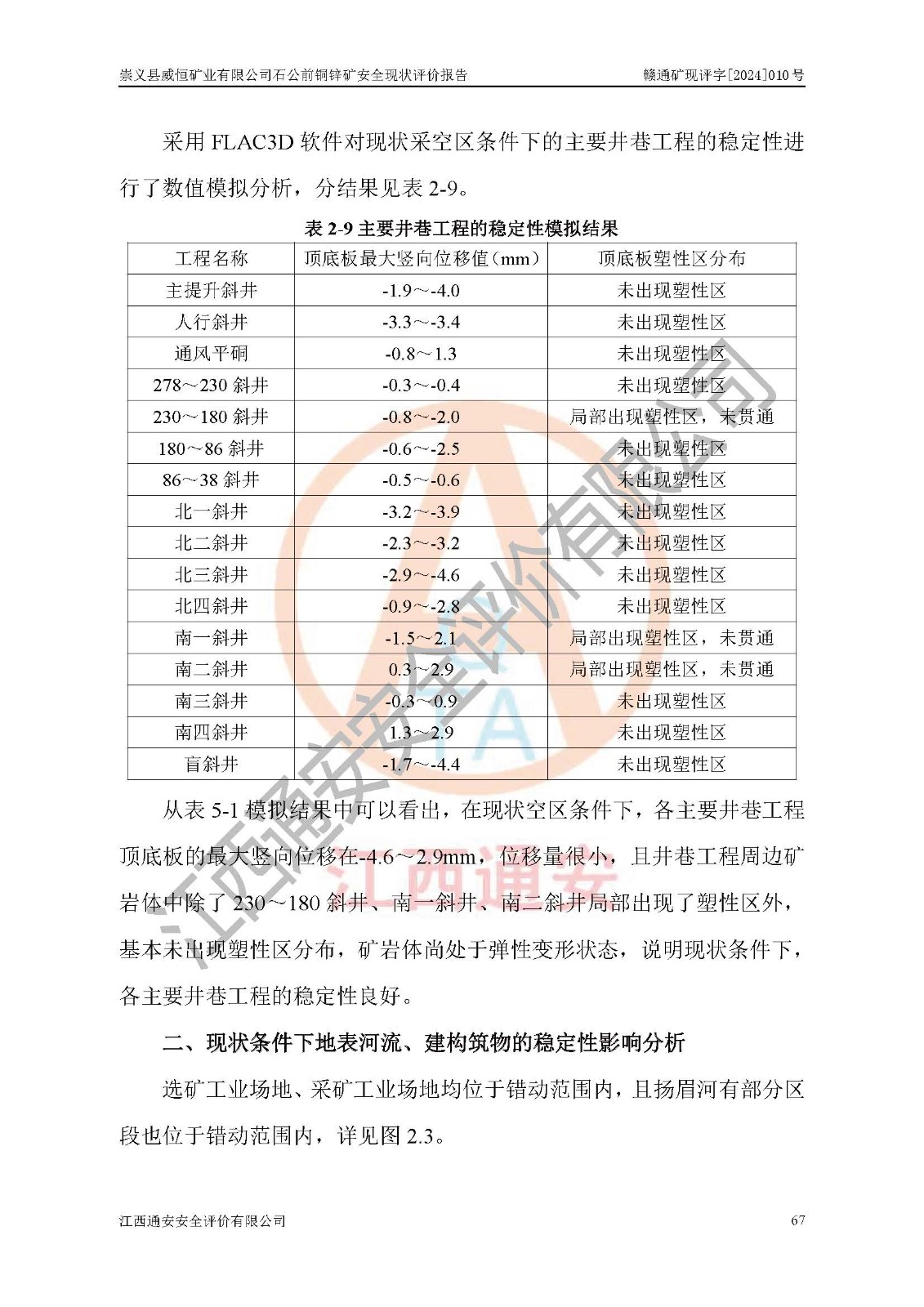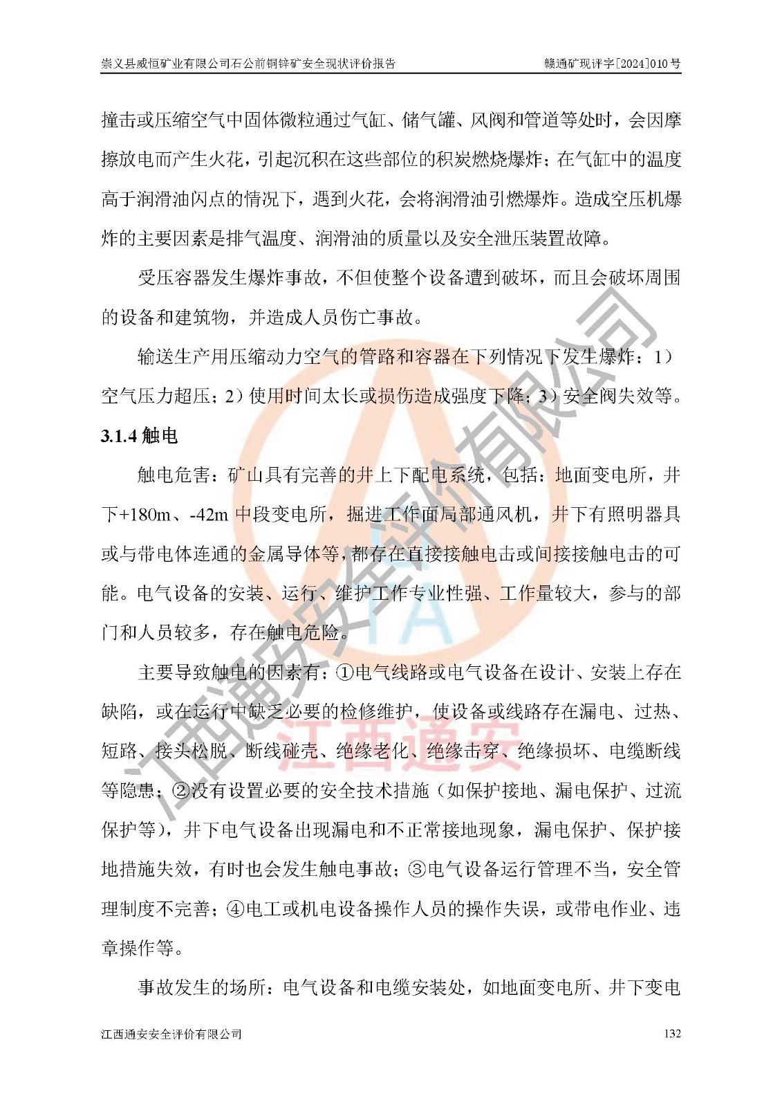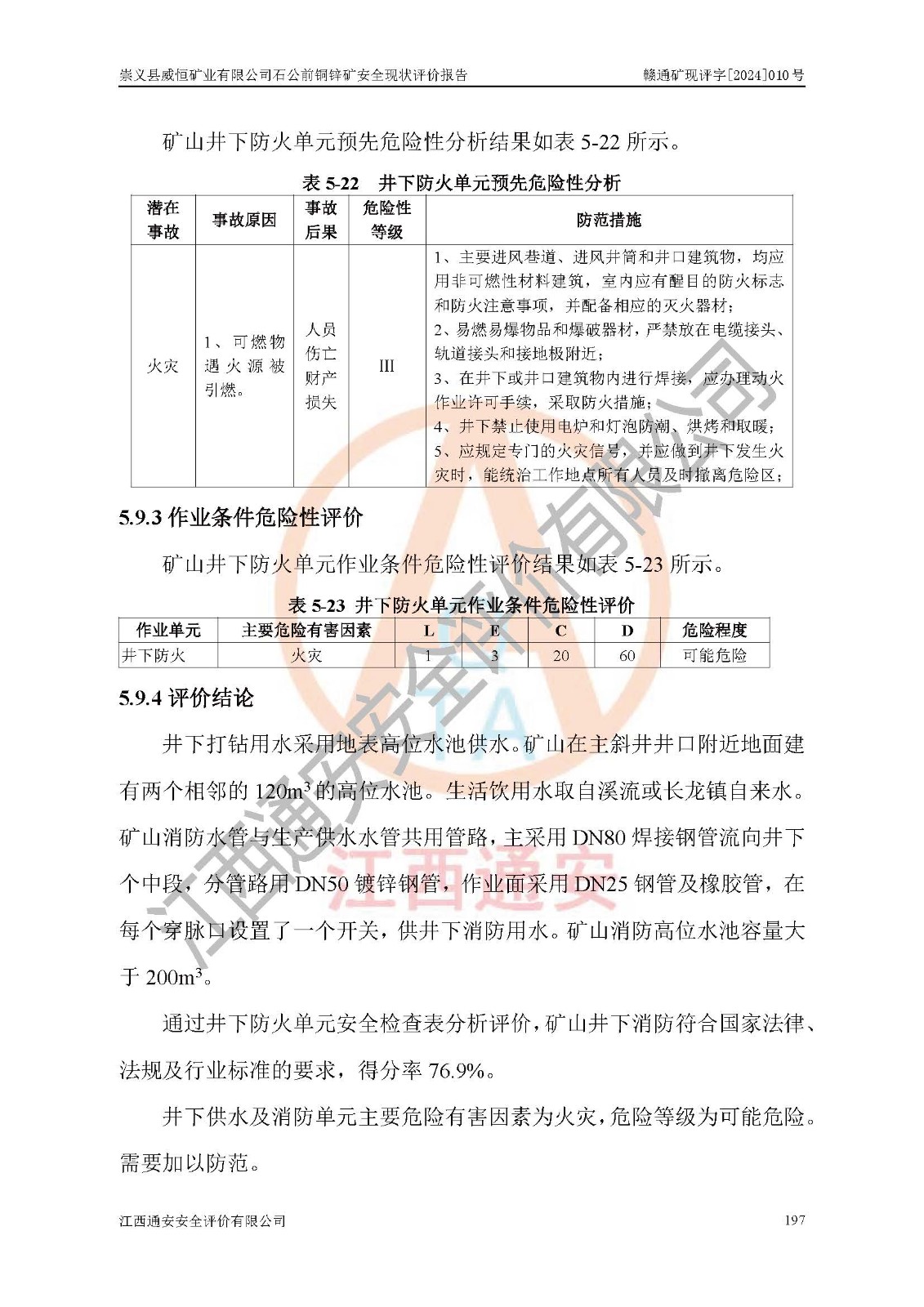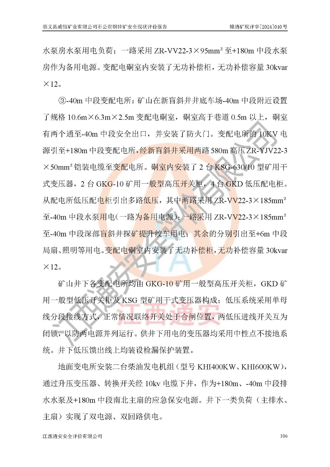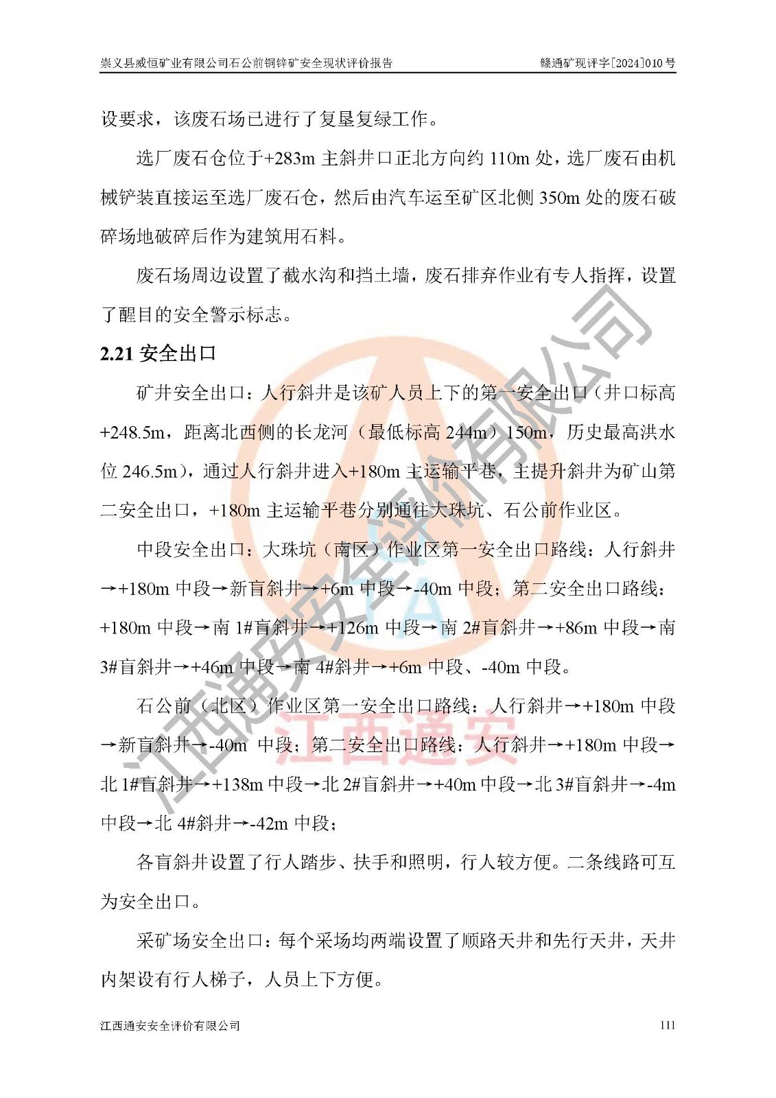 其它 | 崇義縣威恒礦業(yè)有限公司石公前銅鋅礦的主要生產(chǎn)及輔助系統(tǒng):提升運輸、排水、供配電、通風(fēng)、供風(fēng)、采掘、安全避險“六大系統(tǒng)”等基本符合法律法規(guī)要求和規(guī)程、規(guī)范要求;各種危險有害因素及不可接受的風(fēng)險在運行中認(rèn)真落實行之**的技術(shù)措施或管理措施,嚴(yán)格按規(guī)程,按要求加強管理,可以避免和控制各類事故,**安全生產(chǎn)。現(xiàn)階段礦山設(shè)備、設(shè)施和場所符合**安全生產(chǎn)有關(guān)法律、法規(guī)、標(biāo)準(zhǔn)及規(guī)范的規(guī)定。礦山采用斜井+盲斜井聯(lián)合開拓方式,安全生產(chǎn)條件一般;安全管理能滿足法規(guī)要求,礦山地下開采符合**規(guī)定的安全生產(chǎn)條件。 | ||||