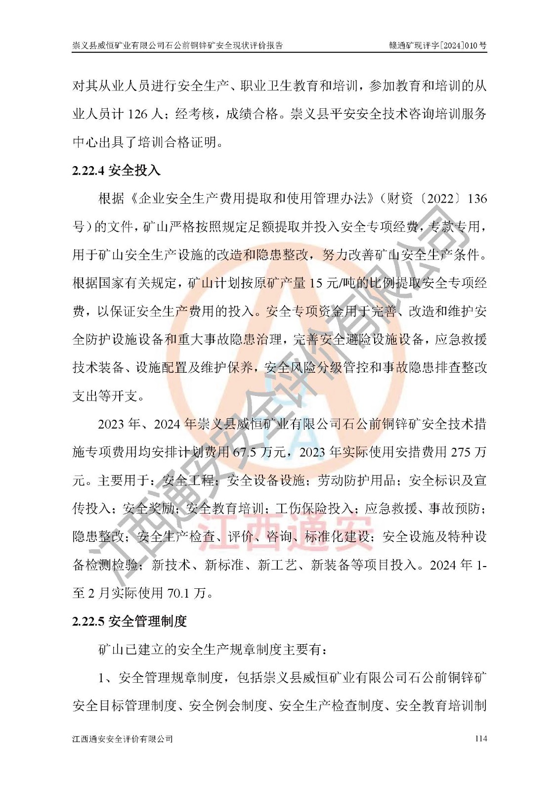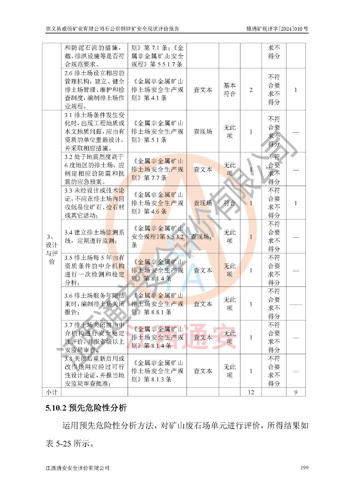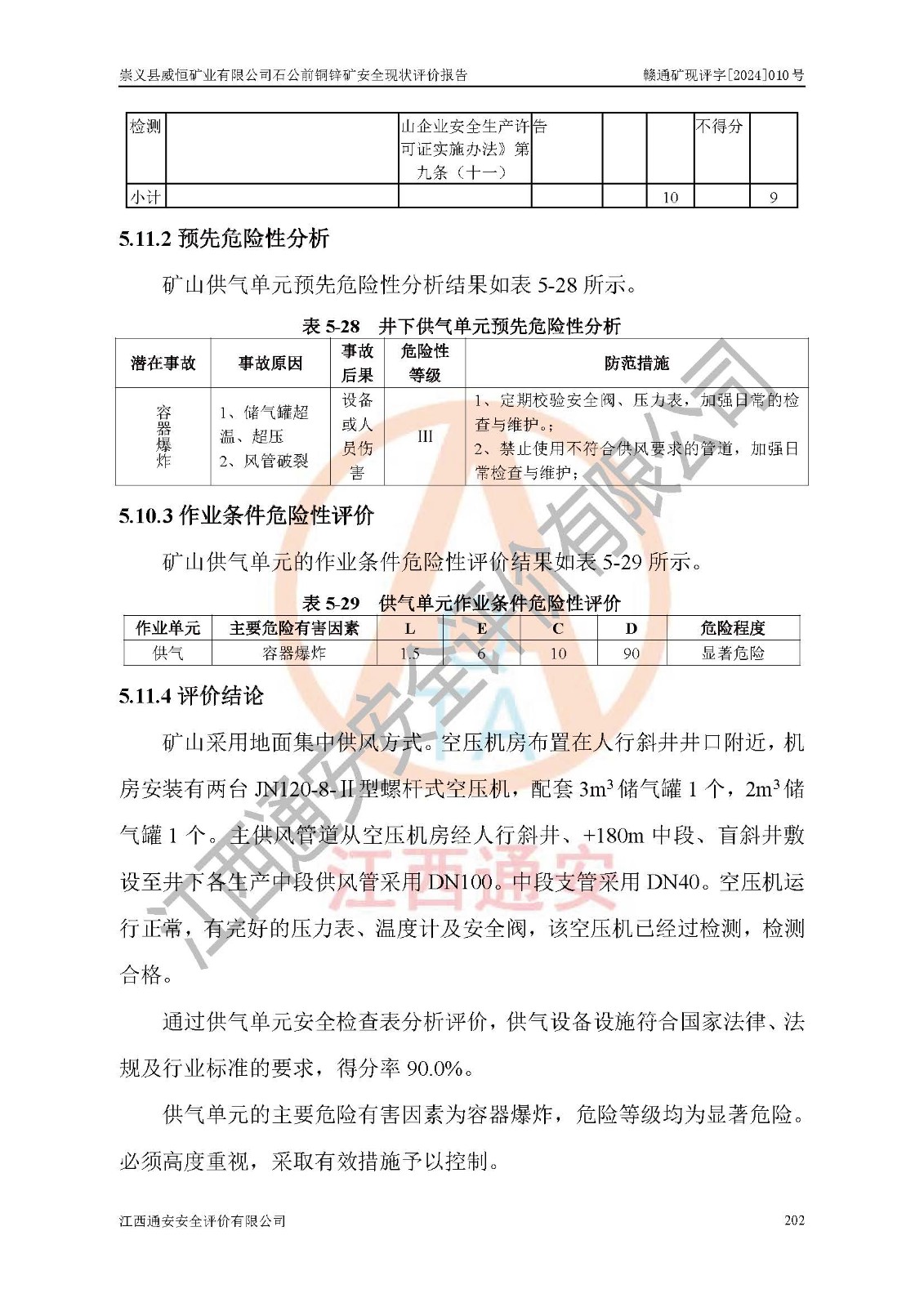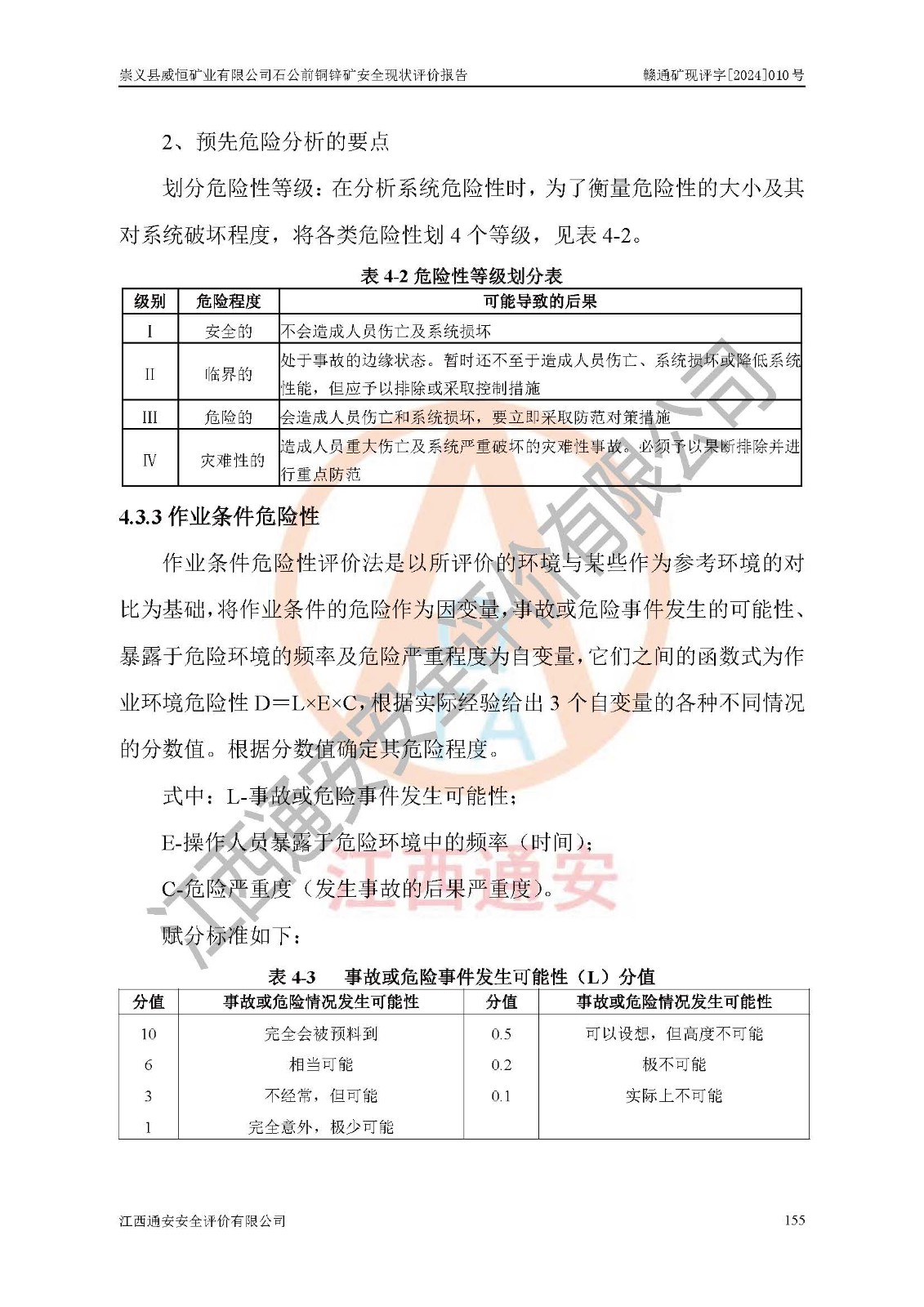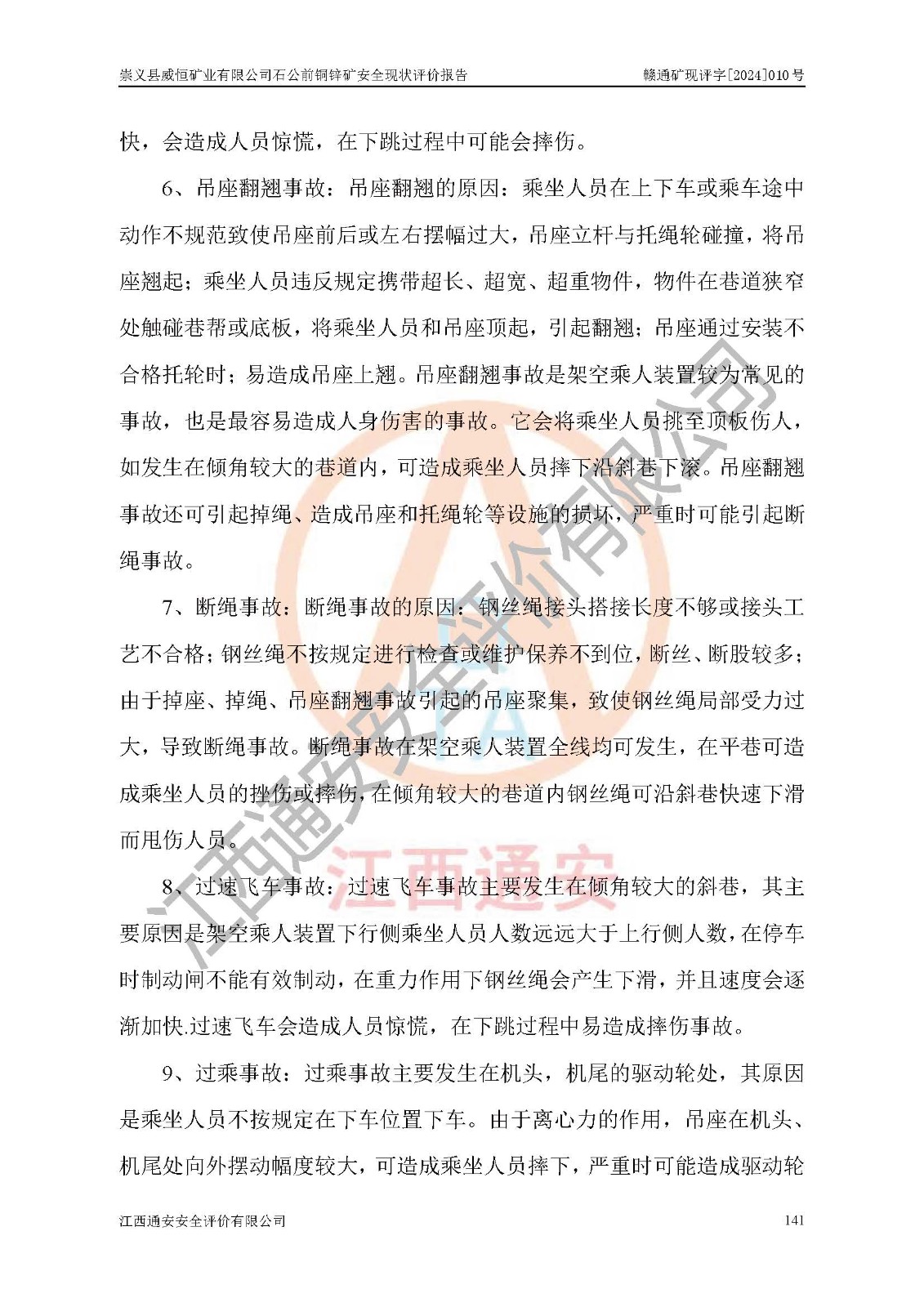 其它 | 崇義縣威恒礦業(yè)有限公司石公前銅鋅礦的主要生產(chǎn)及輔助系統(tǒng):提升運輸、排水、供配電、通風(fēng)、供風(fēng)、采掘、安全避險“六大系統(tǒng)”等基本符合法律法規(guī)要求和規(guī)程、規(guī)范要求;各種危險有害因素及不可接受的風(fēng)險在運行中認(rèn)真落實行之**的技術(shù)措施或管理措施,嚴(yán)格按規(guī)程,按要求加強管理,可以避免和控制各類事故,**安全生產(chǎn)。現(xiàn)階段礦山設(shè)備、設(shè)施和場所符合**安全生產(chǎn)有關(guān)法律、法規(guī)、標(biāo)準(zhǔn)及規(guī)范的規(guī)定。礦山采用斜井+盲斜井聯(lián)合開拓方式,安全生產(chǎn)條件一般;安全管理能滿足法規(guī)要求,礦山地下開采符合**規(guī)定的安全生產(chǎn)條件。 | ||||