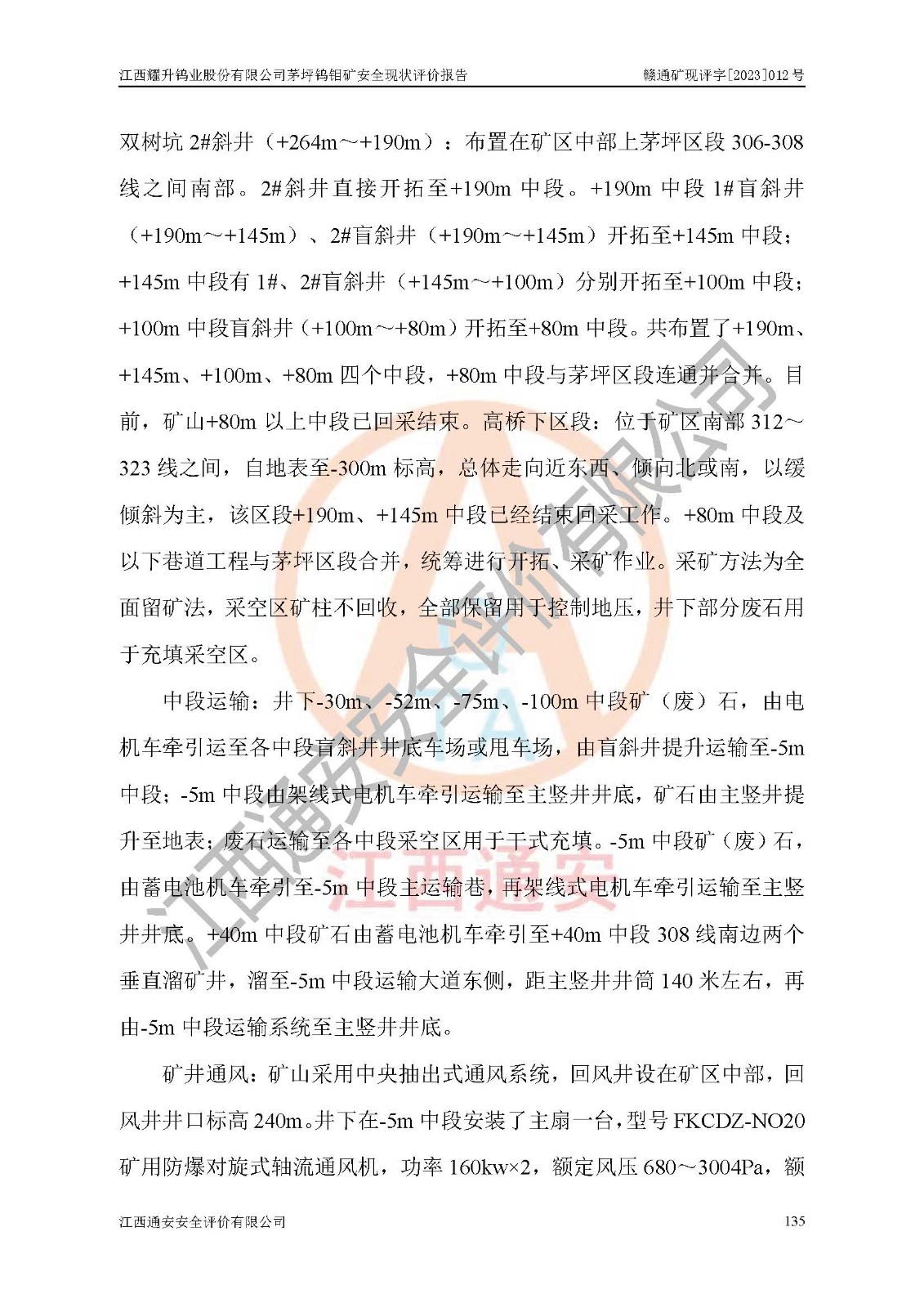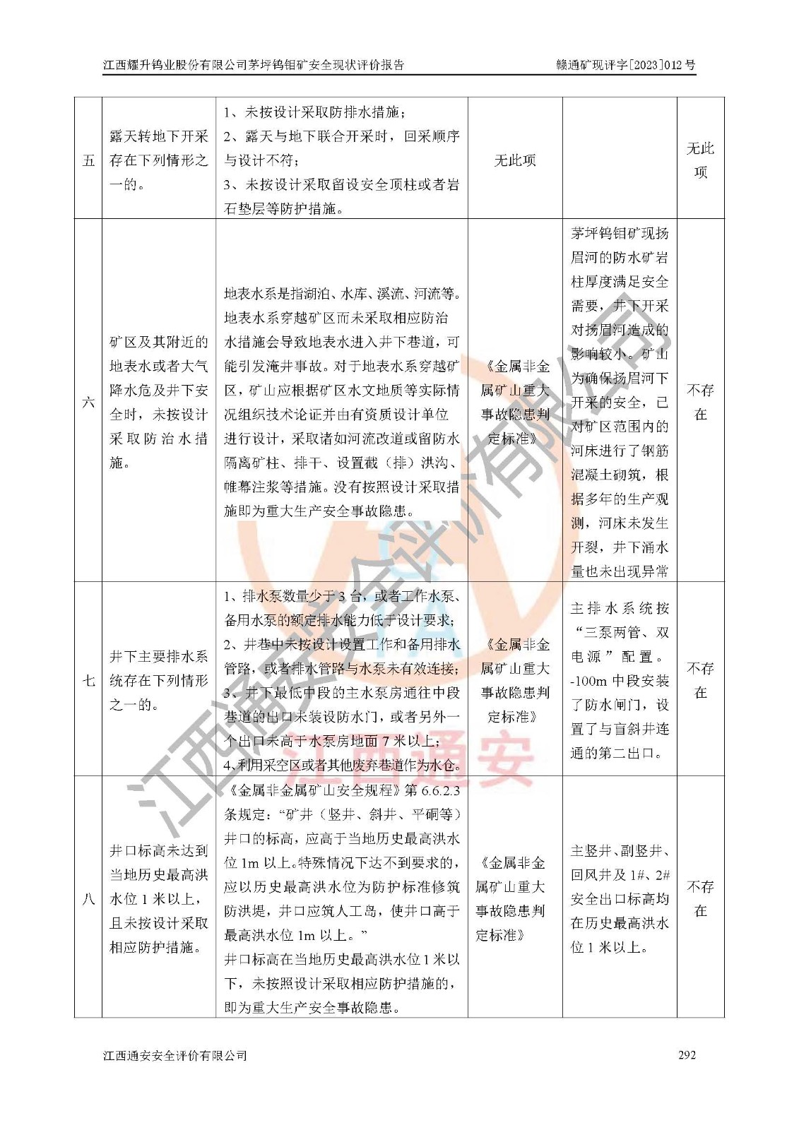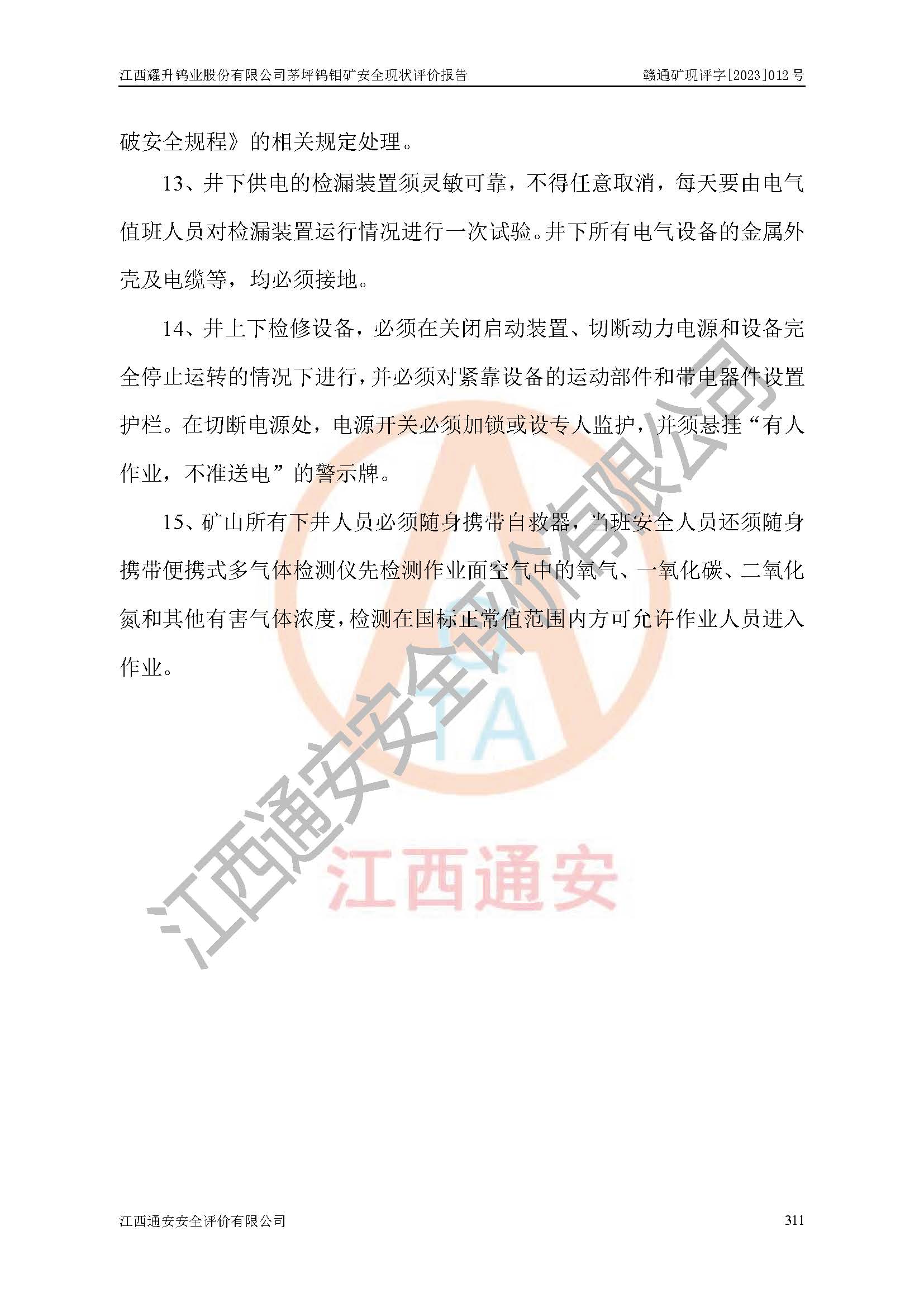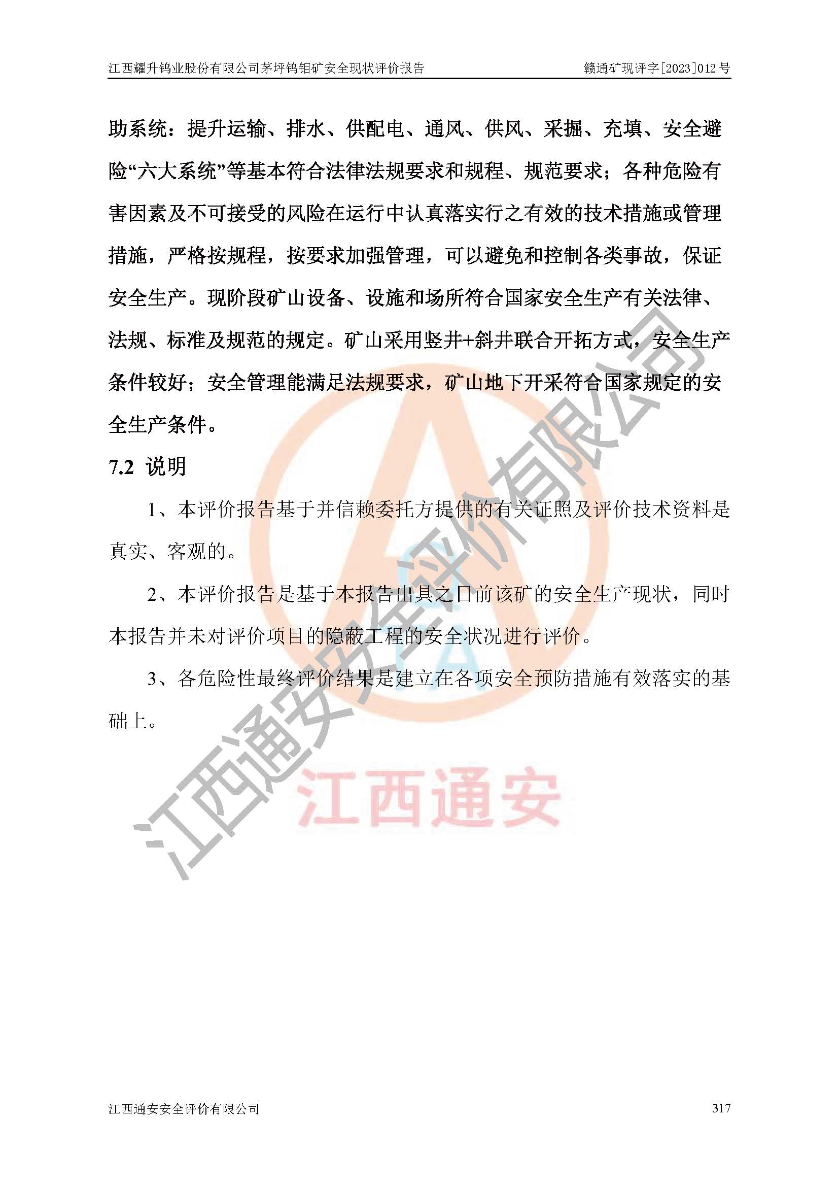 其它 | 江西耀升鎢業(yè)股份有限公司茅坪鎢鉬礦的主要生產(chǎn)及輔助系統(tǒng):提升運(yùn)輸、排水、供配電、通風(fēng)、供風(fēng)、采掘、充填、安全避險“六大系統(tǒng)”等基本符合法律法規(guī)要求和規(guī)程、規(guī)范要求;各種危險有害因素及不可接受的風(fēng)險在運(yùn)行中認(rèn)真落實(shí)行之**的技術(shù)措施或管理措施,嚴(yán)格按規(guī)程,按要求加強(qiáng)管理,可以避免和控制各類事故,**安全生產(chǎn)?,F(xiàn)階段礦山設(shè)備、設(shè)施和場所符合**安全生產(chǎn)有關(guān)法律、法規(guī)、標(biāo)準(zhǔn)及規(guī)范的規(guī)定。礦山采用豎井+斜井聯(lián)合開拓方式,安全生產(chǎn)條件較好;安全管理能滿足法規(guī)要求,礦山地下開采符合**規(guī)定的安全生產(chǎn)條件。 | ||||