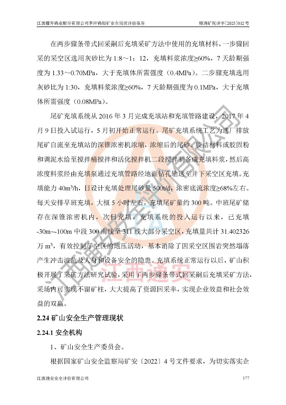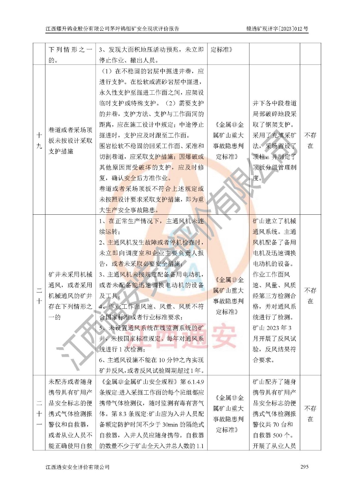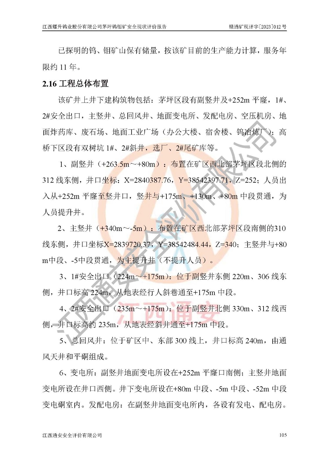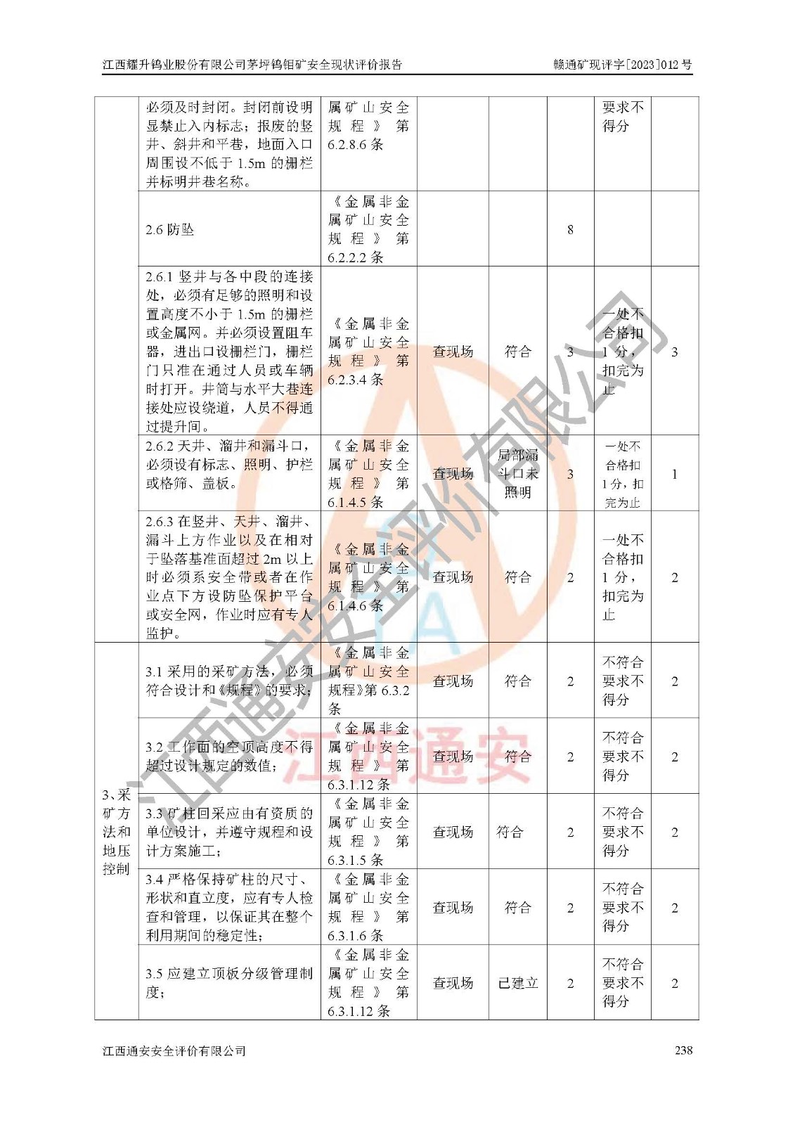 其它 | 江西耀升鎢業(yè)股份有限公司茅坪鎢鉬礦的主要生產(chǎn)及輔助系統(tǒng):提升運(yùn)輸、排水、供配電、通風(fēng)、供風(fēng)、采掘、充填、安全避險“六大系統(tǒng)”等基本符合法律法規(guī)要求和規(guī)程、規(guī)范要求;各種危險有害因素及不可接受的風(fēng)險在運(yùn)行中認(rèn)真落實(shí)行之**的技術(shù)措施或管理措施,嚴(yán)格按規(guī)程,按要求加強(qiáng)管理,可以避免和控制各類事故,**安全生產(chǎn)?,F(xiàn)階段礦山設(shè)備、設(shè)施和場所符合**安全生產(chǎn)有關(guān)法律、法規(guī)、標(biāo)準(zhǔn)及規(guī)范的規(guī)定。礦山采用豎井+斜井聯(lián)合開拓方式,安全生產(chǎn)條件較好;安全管理能滿足法規(guī)要求,礦山地下開采符合**規(guī)定的安全生產(chǎn)條件。 | ||||