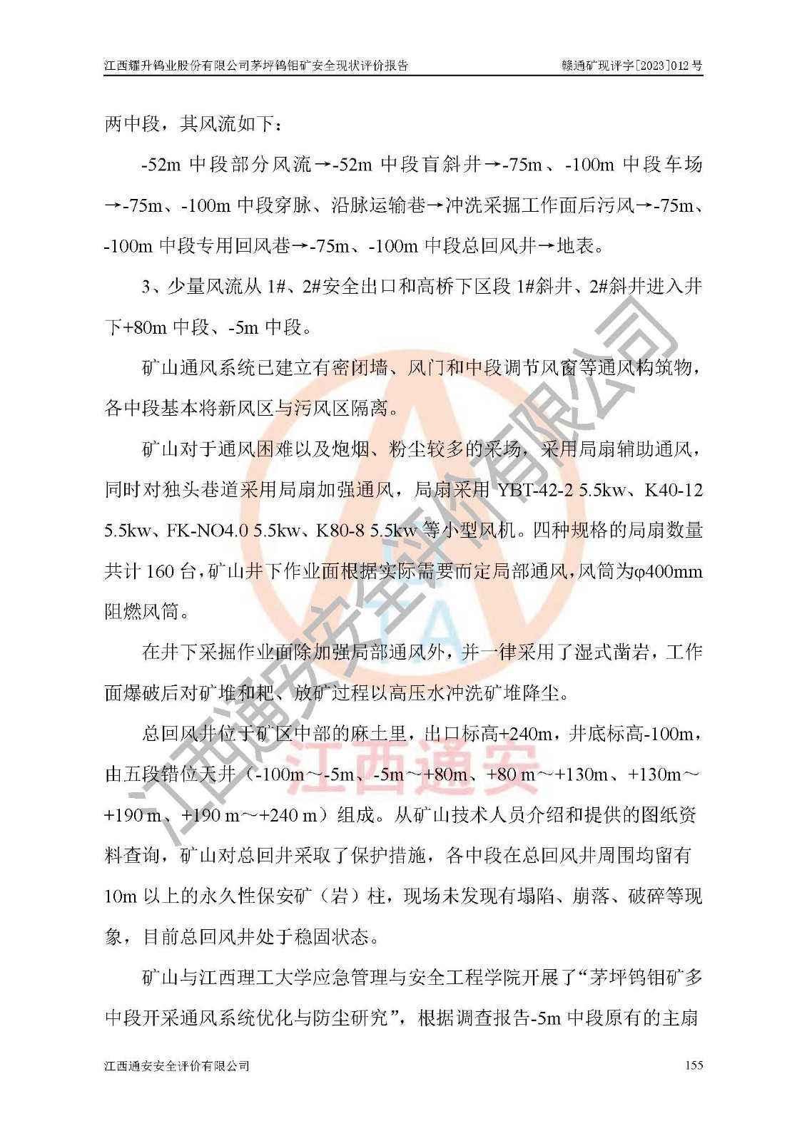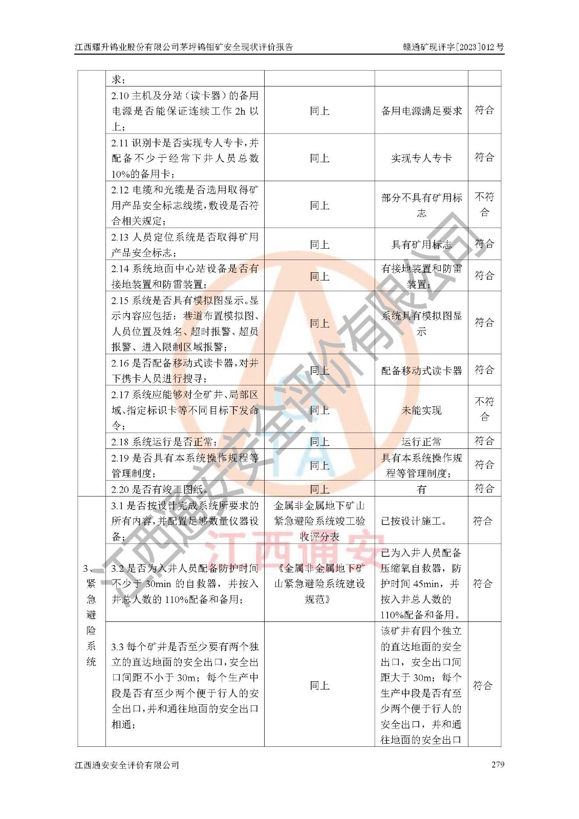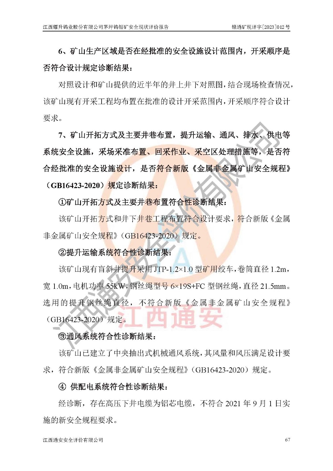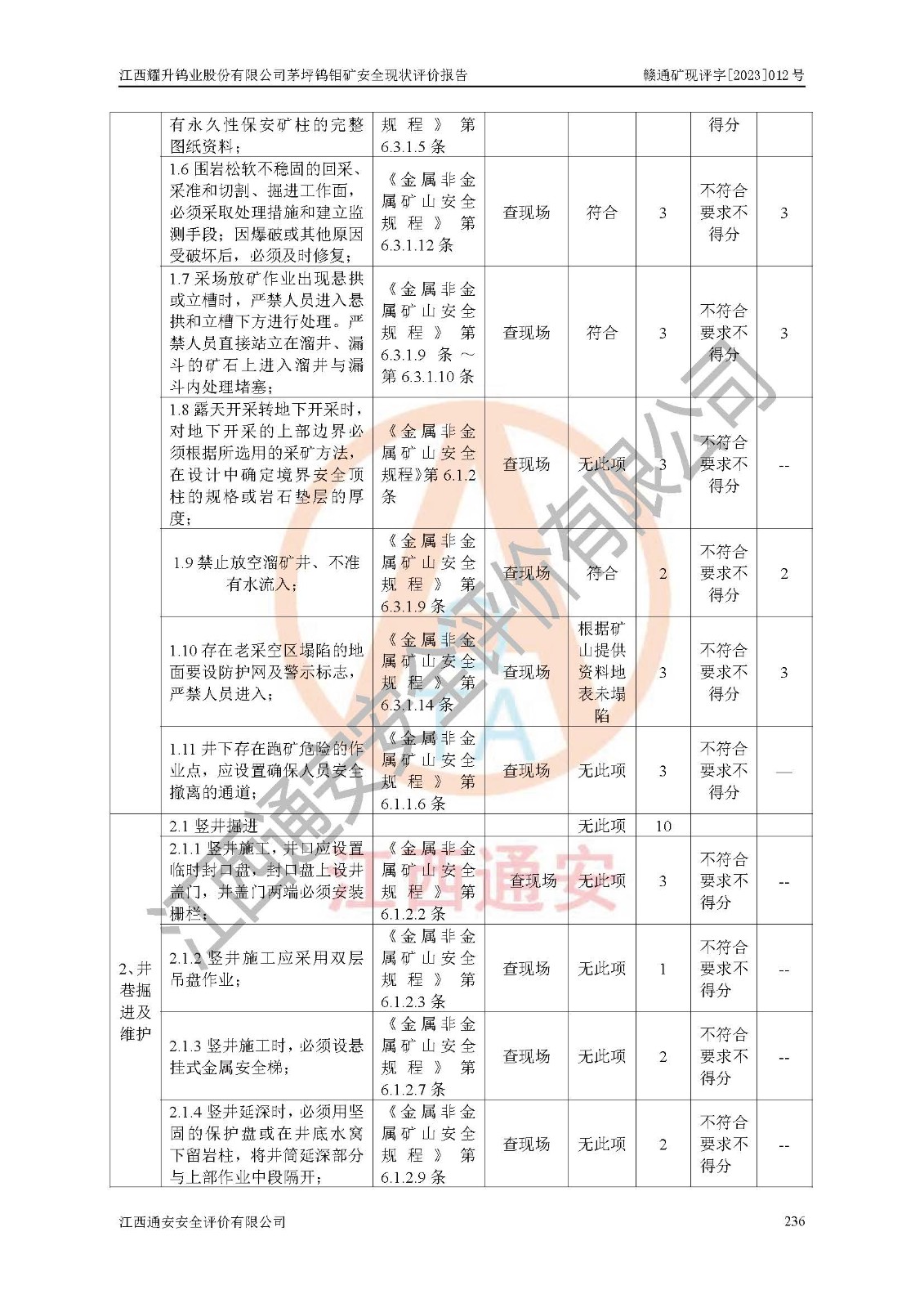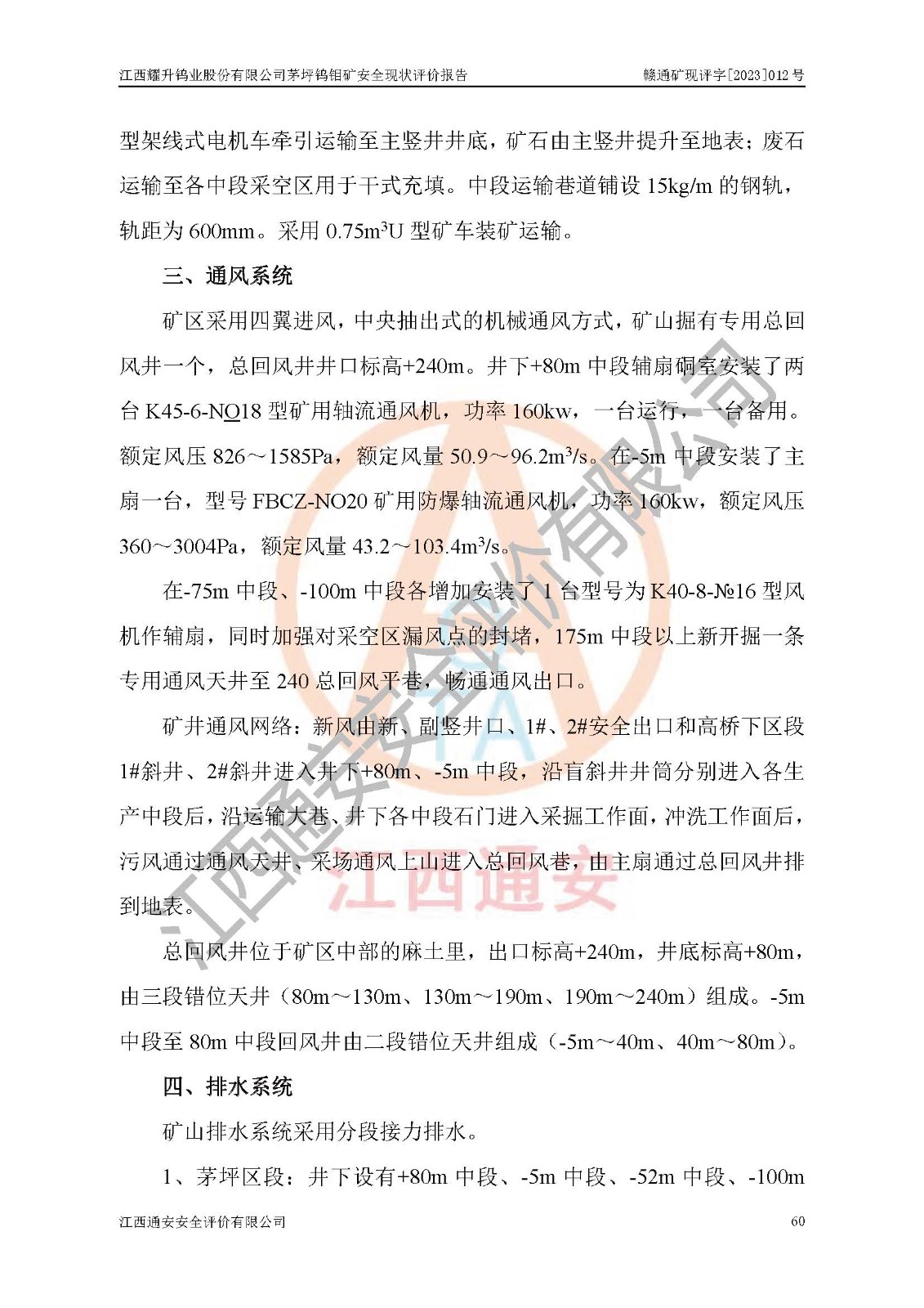 其它 | 江西耀升鎢業(yè)股份有限公司茅坪鎢鉬礦的主要生產(chǎn)及輔助系統(tǒng):提升運(yùn)輸、排水、供配電、通風(fēng)、供風(fēng)、采掘、充填、安全避險“六大系統(tǒng)”等基本符合法律法規(guī)要求和規(guī)程、規(guī)范要求;各種危險有害因素及不可接受的風(fēng)險在運(yùn)行中認(rèn)真落實(shí)行之**的技術(shù)措施或管理措施,嚴(yán)格按規(guī)程,按要求加強(qiáng)管理,可以避免和控制各類事故,**安全生產(chǎn)?,F(xiàn)階段礦山設(shè)備、設(shè)施和場所符合**安全生產(chǎn)有關(guān)法律、法規(guī)、標(biāo)準(zhǔn)及規(guī)范的規(guī)定。礦山采用豎井+斜井聯(lián)合開拓方式,安全生產(chǎn)條件較好;安全管理能滿足法規(guī)要求,礦山地下開采符合**規(guī)定的安全生產(chǎn)條件。 | ||||