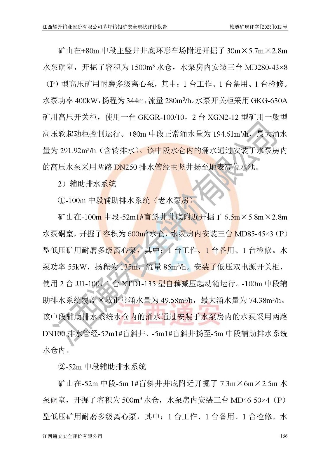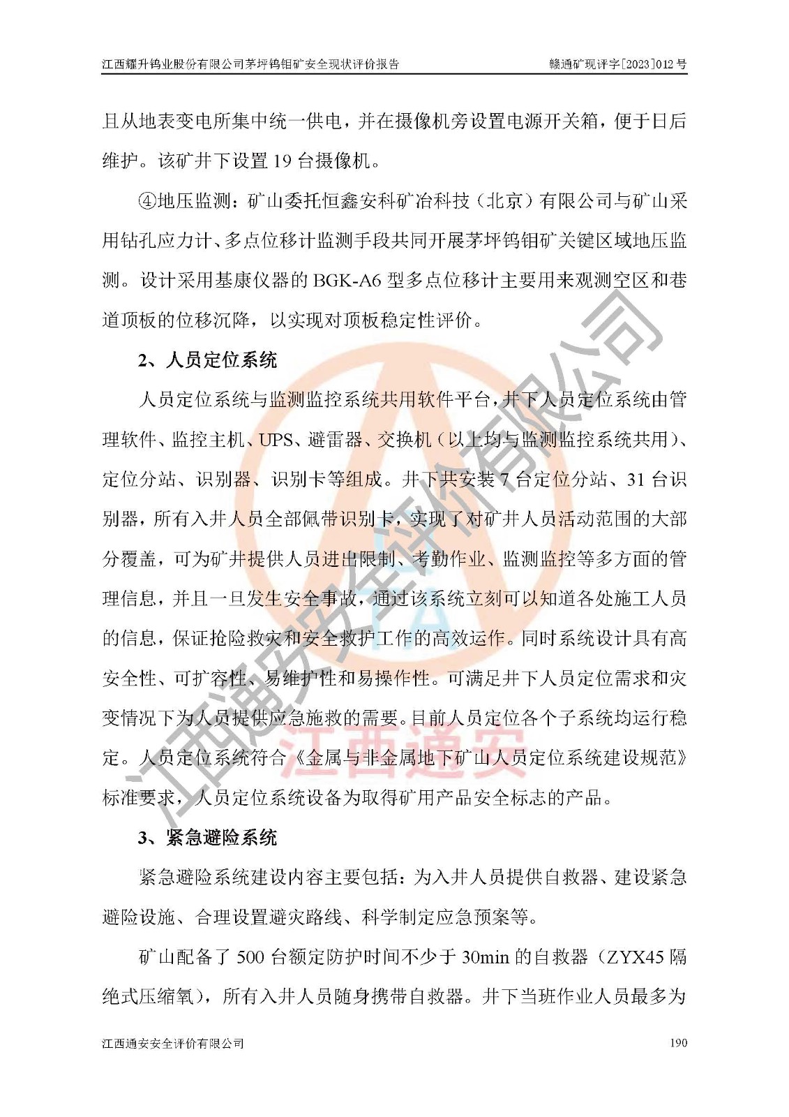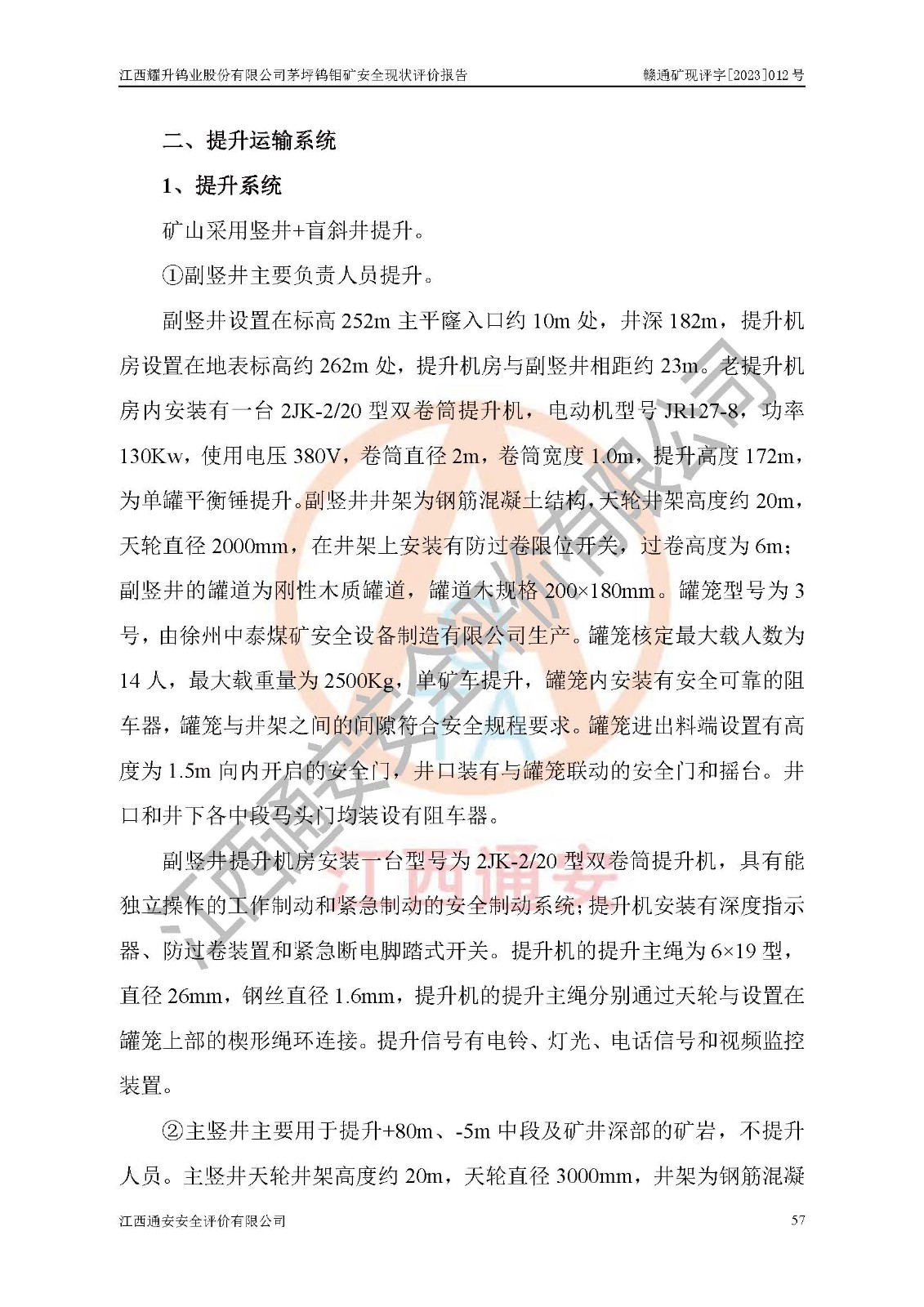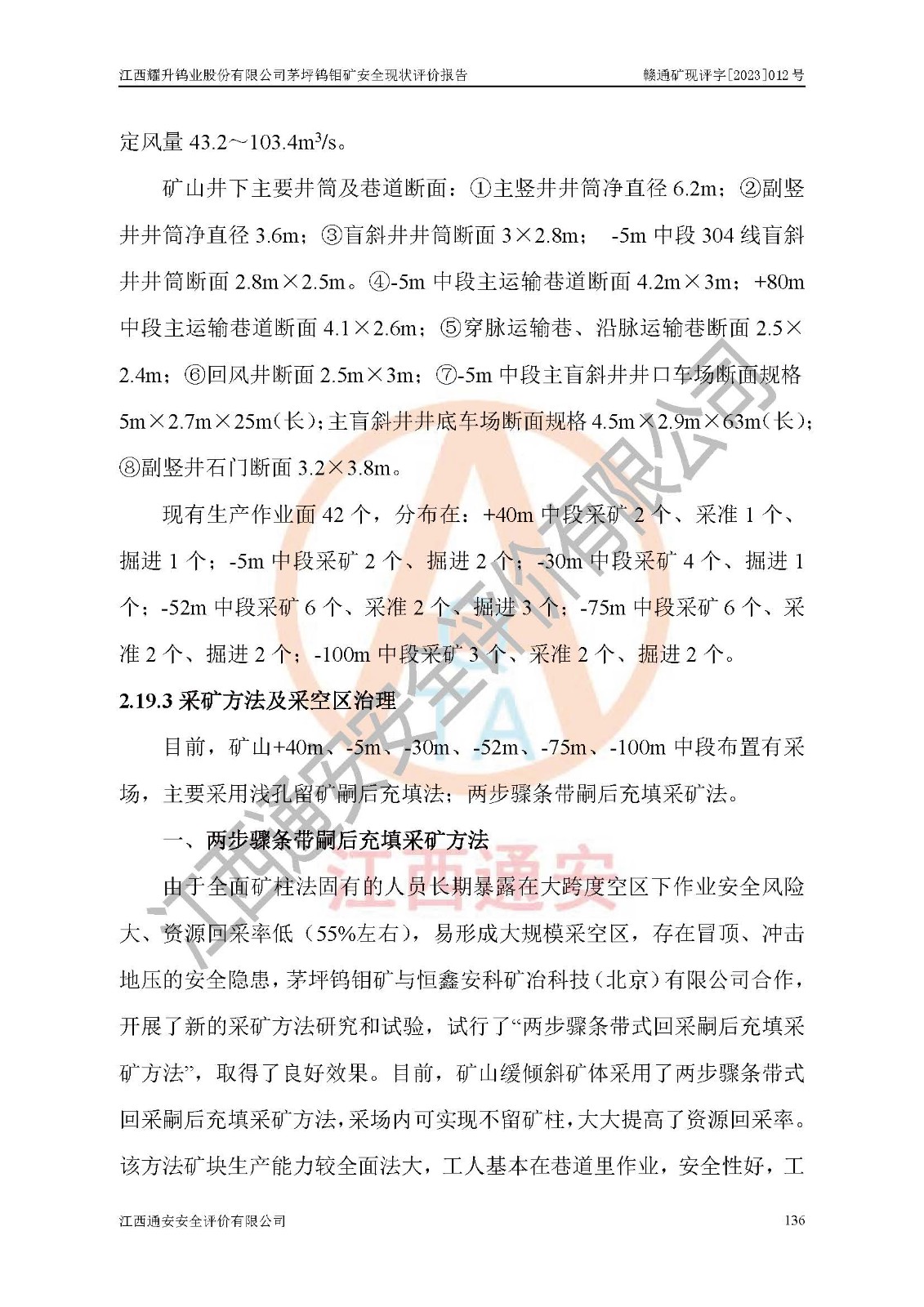 其它 | 江西耀升鎢業(yè)股份有限公司茅坪鎢鉬礦的主要生產(chǎn)及輔助系統(tǒng):提升運(yùn)輸、排水、供配電、通風(fēng)、供風(fēng)、采掘、充填、安全避險“六大系統(tǒng)”等基本符合法律法規(guī)要求和規(guī)程、規(guī)范要求;各種危險有害因素及不可接受的風(fēng)險在運(yùn)行中認(rèn)真落實(shí)行之**的技術(shù)措施或管理措施,嚴(yán)格按規(guī)程,按要求加強(qiáng)管理,可以避免和控制各類事故,**安全生產(chǎn)?,F(xiàn)階段礦山設(shè)備、設(shè)施和場所符合**安全生產(chǎn)有關(guān)法律、法規(guī)、標(biāo)準(zhǔn)及規(guī)范的規(guī)定。礦山采用豎井+斜井聯(lián)合開拓方式,安全生產(chǎn)條件較好;安全管理能滿足法規(guī)要求,礦山地下開采符合**規(guī)定的安全生產(chǎn)條件。 | ||||
