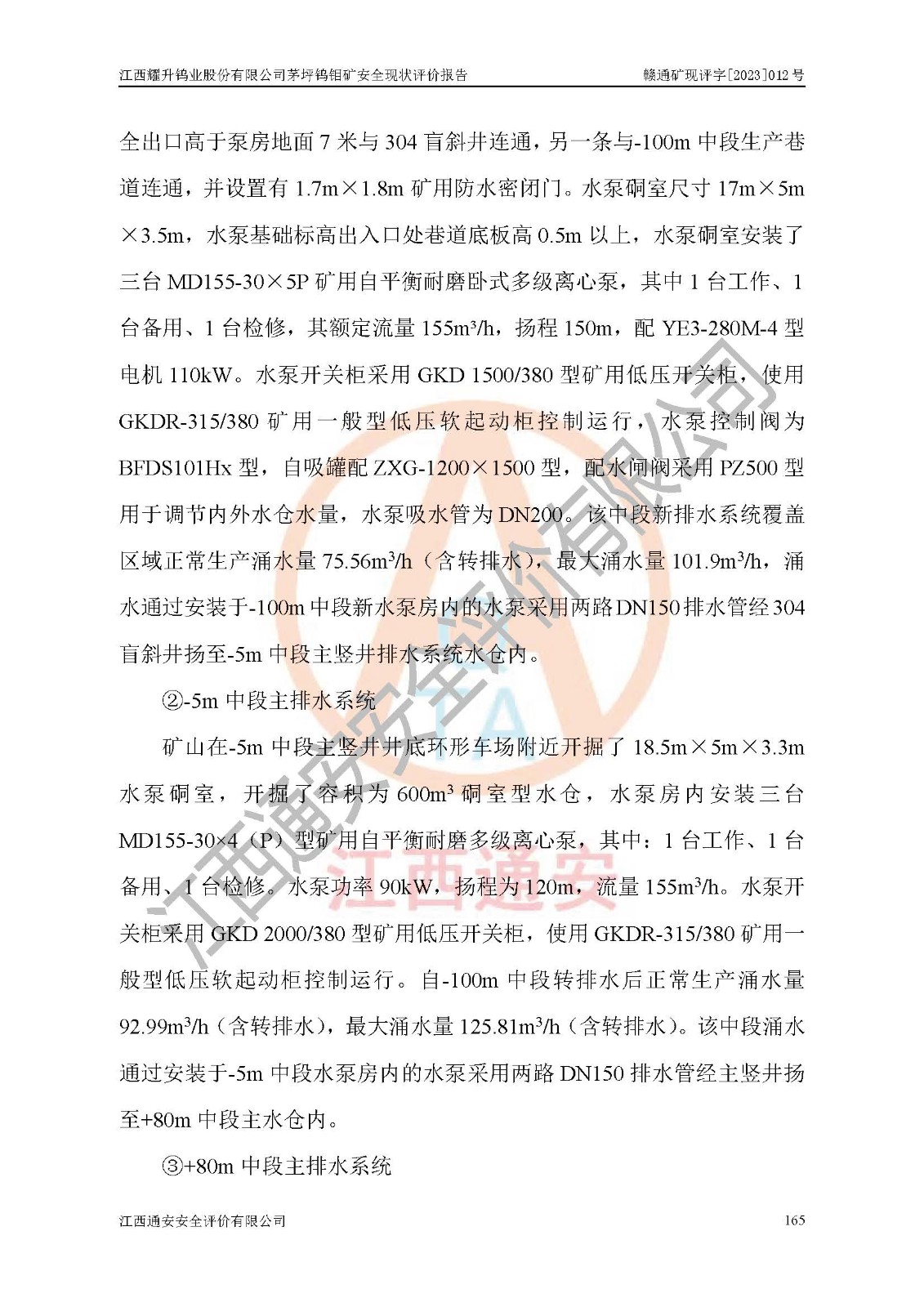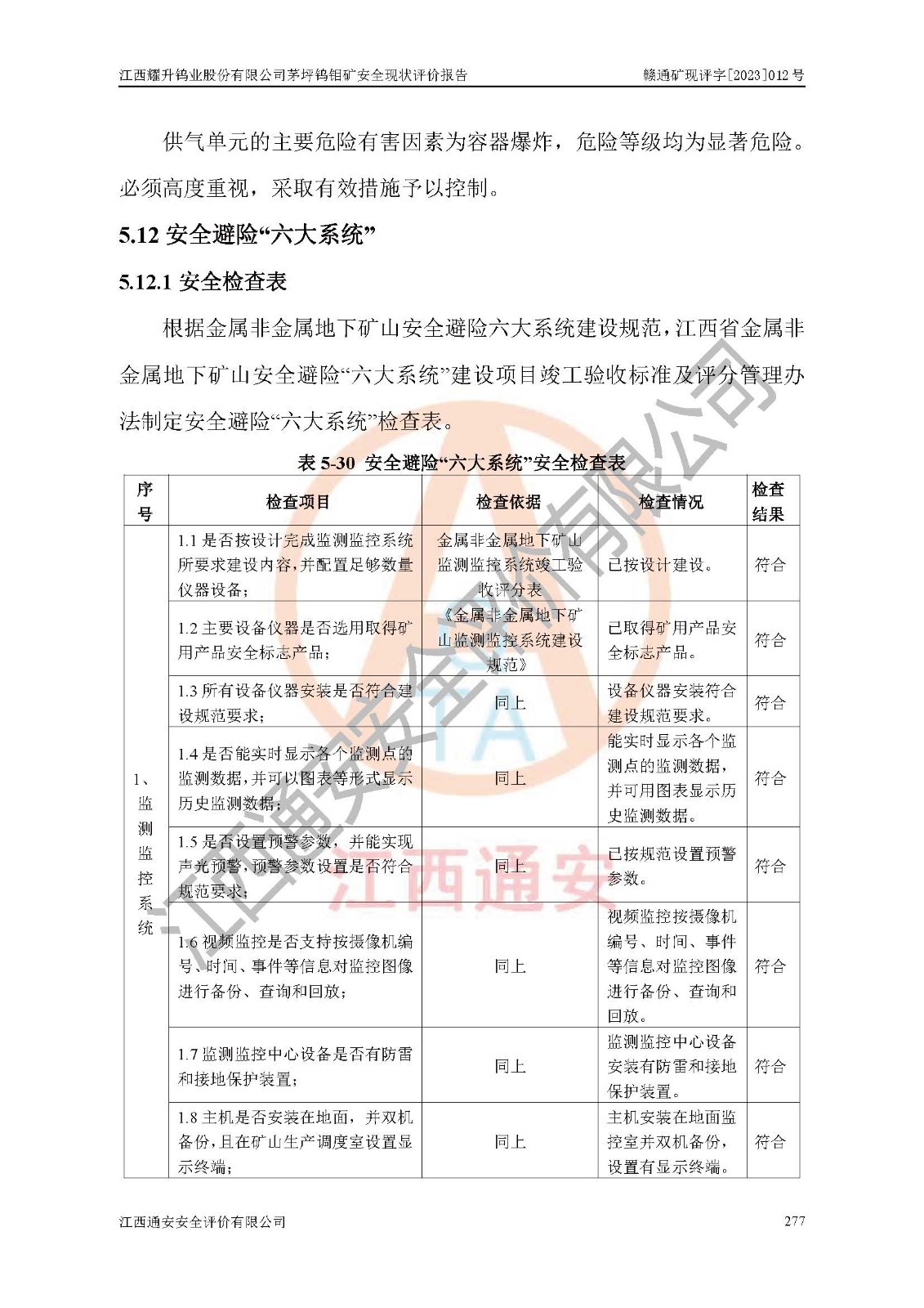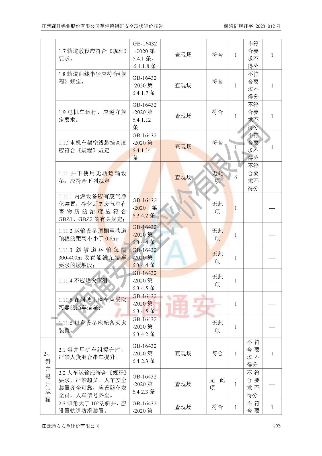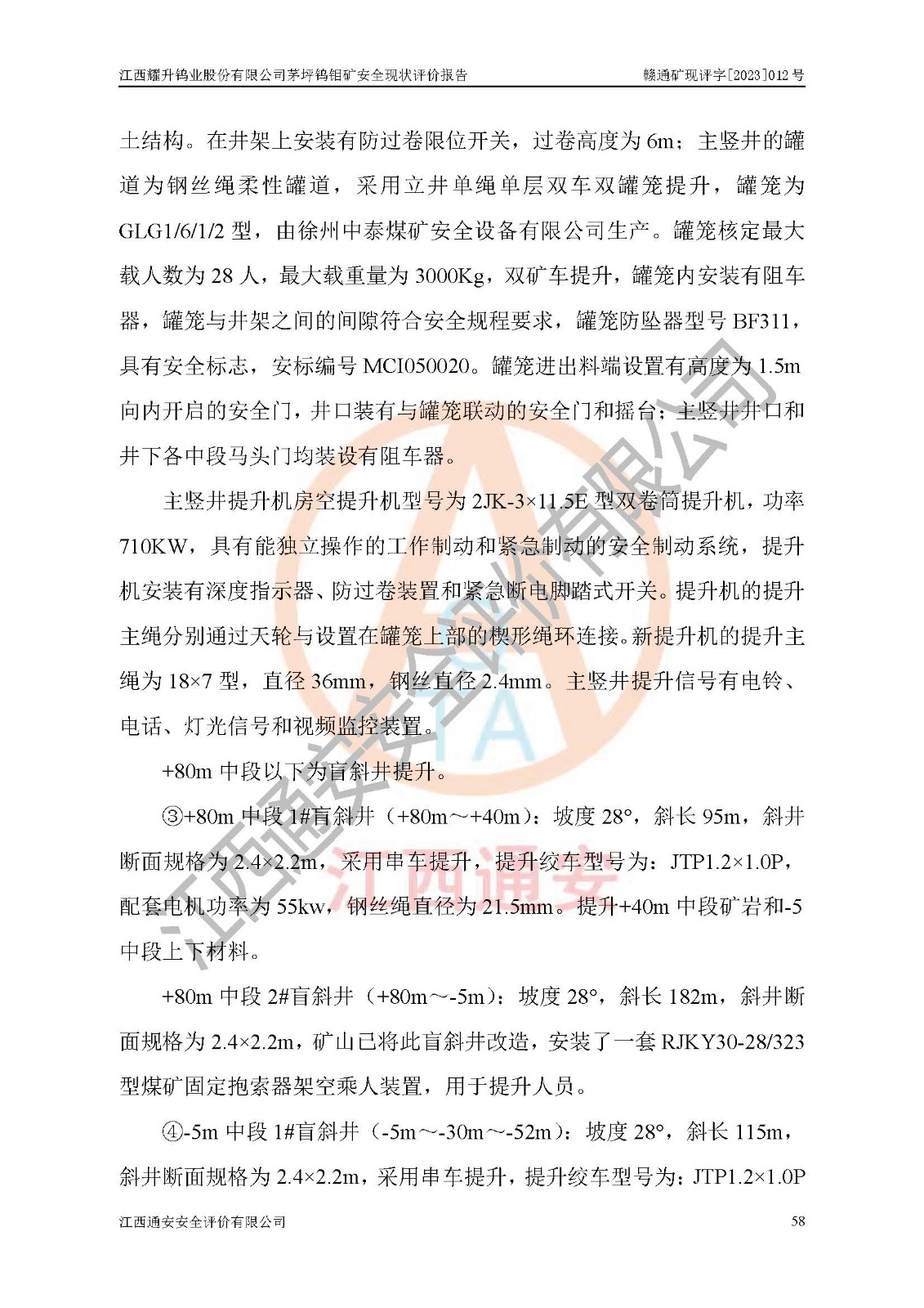 其它 | 江西耀升鎢業(yè)股份有限公司茅坪鎢鉬礦的主要生產(chǎn)及輔助系統(tǒng):提升運(yùn)輸、排水、供配電、通風(fēng)、供風(fēng)、采掘、充填、安全避險“六大系統(tǒng)”等基本符合法律法規(guī)要求和規(guī)程、規(guī)范要求;各種危險有害因素及不可接受的風(fēng)險在運(yùn)行中認(rèn)真落實(shí)行之**的技術(shù)措施或管理措施,嚴(yán)格按規(guī)程,按要求加強(qiáng)管理,可以避免和控制各類事故,**安全生產(chǎn)?,F(xiàn)階段礦山設(shè)備、設(shè)施和場所符合**安全生產(chǎn)有關(guān)法律、法規(guī)、標(biāo)準(zhǔn)及規(guī)范的規(guī)定。礦山采用豎井+斜井聯(lián)合開拓方式,安全生產(chǎn)條件較好;安全管理能滿足法規(guī)要求,礦山地下開采符合**規(guī)定的安全生產(chǎn)條件。 | ||||