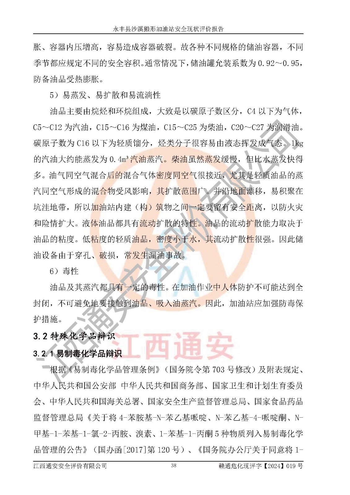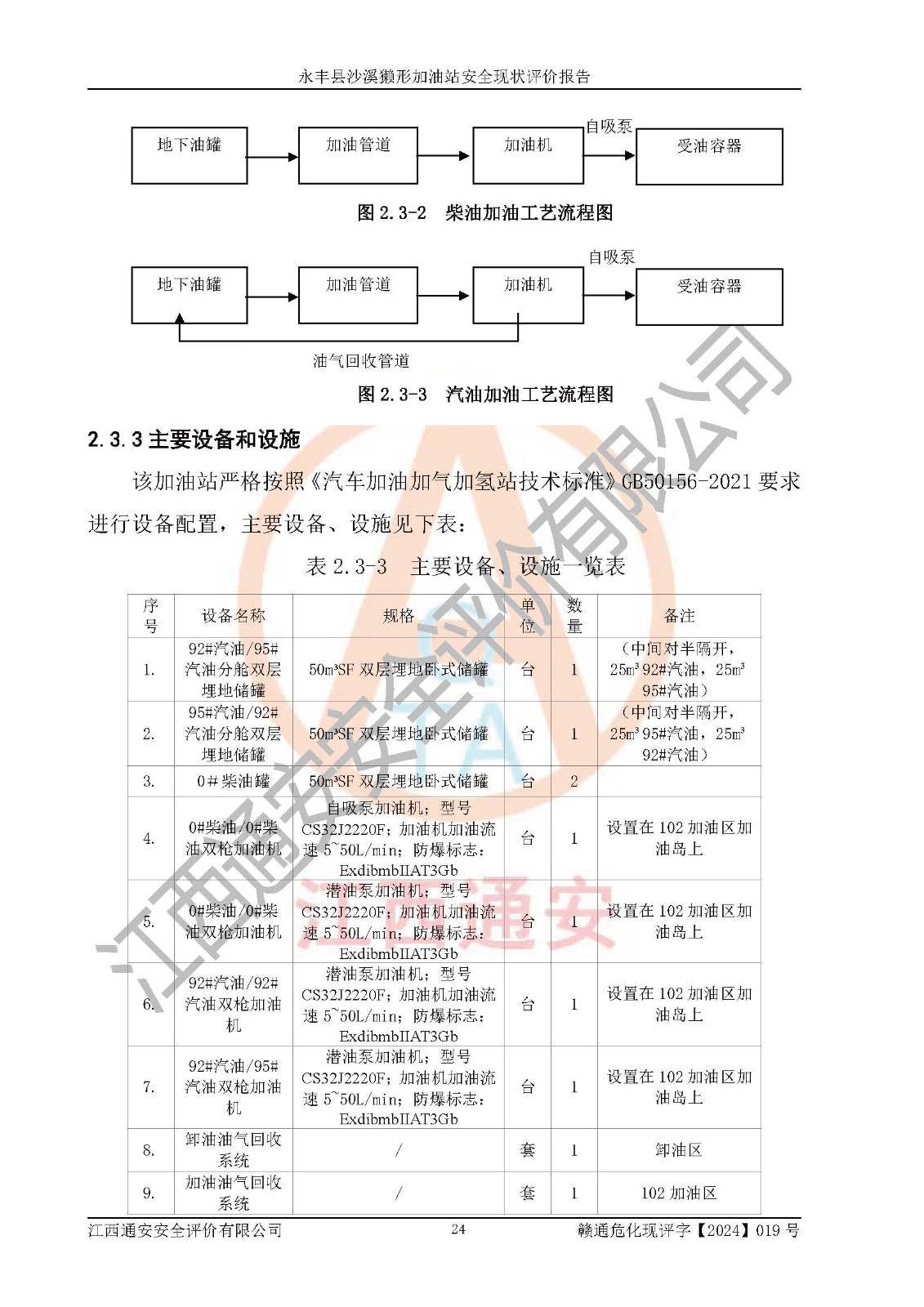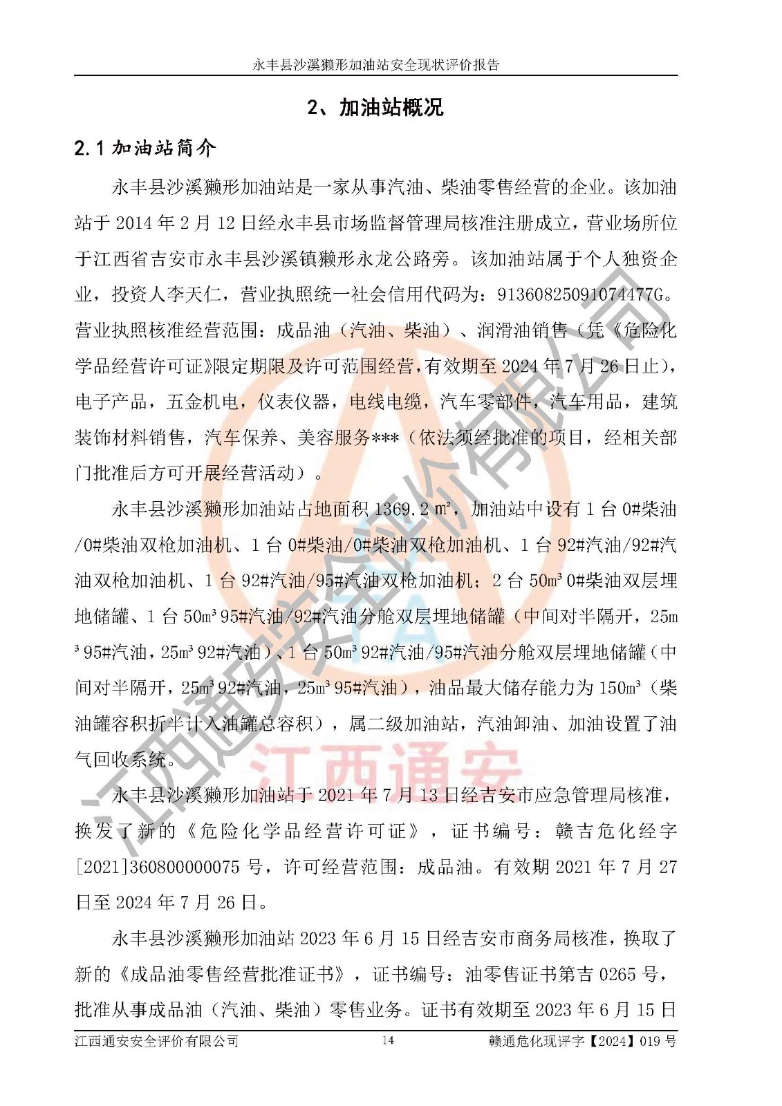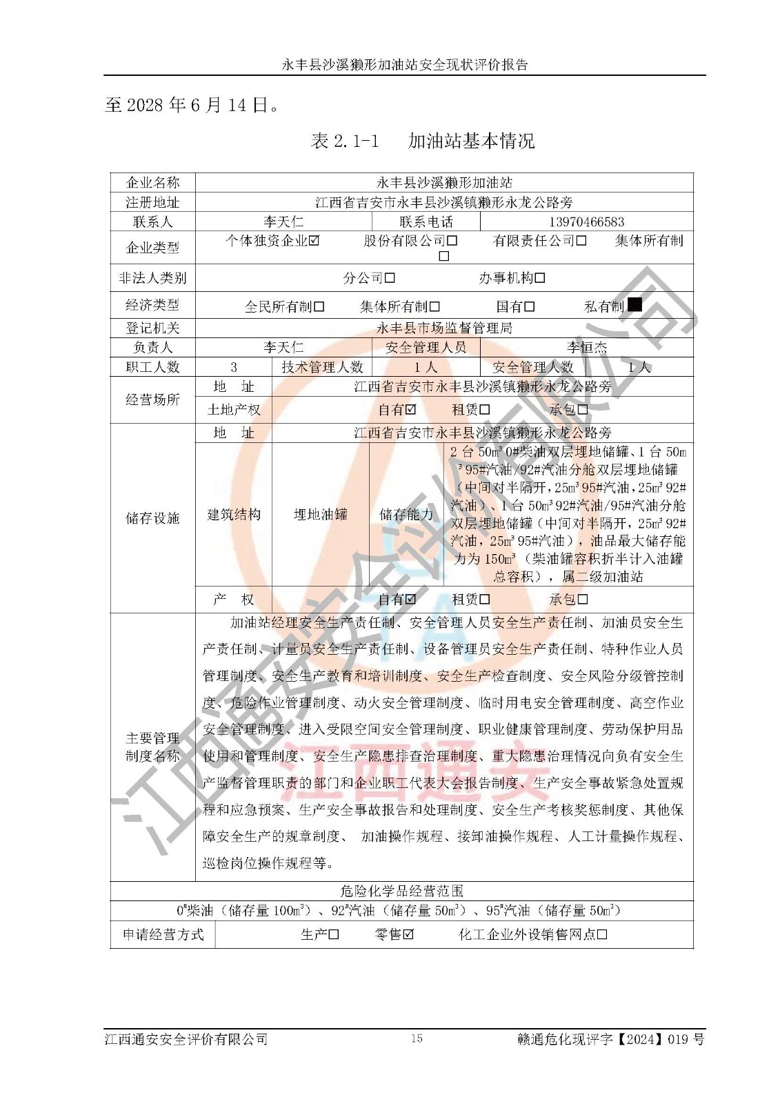 項目簡介 | 永豐縣沙溪獺形加油站是一家從事汽油、柴油零售經(jīng)營的企業(yè)。該加油站于2014年2月12日經(jīng)永豐縣市場監(jiān)督管理局核準注冊成立,營業(yè)場所位于江西省吉安市永豐縣沙溪鎮(zhèn)獺形永龍公路旁。該加油站屬于個人獨資企業(yè),投資人李天仁,營業(yè)執(zhí)照統(tǒng)一社會信用代碼為:91360825091074477G。營業(yè)執(zhí)照核準經(jīng)營范圍:成品油(汽油、柴油)、潤滑油銷售(憑《危險化學(xué)品經(jīng)營許可證》限定期限及許可范圍經(jīng)營,**期至2024年7月26日止),電子產(chǎn)品,五金機電,儀表儀器,電線電纜,汽車零部件,汽車用品,建筑裝飾材料銷售,汽車保養(yǎng)、美容服務(wù)***(依法須經(jīng)批準的項目,經(jīng)相關(guān)部門批準后方可開展經(jīng)營活動)。 永豐縣沙溪獺形加油站占地面積1369.2㎡,加油站中設(shè)有1臺0#柴油/0#柴油雙槍加油機、1臺0#柴油/0#柴油雙槍加油機、1臺92#汽油/92#汽油雙槍加油機、1臺92#汽油/95#汽油雙槍加油機;2臺50m30#柴油雙層埋地儲罐、1臺50m395#汽油/92#汽油分艙雙層埋地儲罐(中間對半隔開,25m395#汽油,25m392#汽油)、1臺50m392#汽油/95#汽油分艙雙層埋地儲罐(中間對半隔開,25m392#汽油,25m395#汽油),油品*大儲存能力為150m3(柴油罐容積折半計入油罐總?cè)莘e),屬二級加油站,汽油卸油、加油設(shè)置了油氣回收系統(tǒng)。 永豐縣沙溪獺形加油站于2021年7月13日經(jīng)吉安市應(yīng)急管理局核準,換發(fā)了新的《危險化學(xué)品經(jīng)營許可證》,證書編號:贛吉?;?jīng)字[2021]360800000075號,許可經(jīng)營范圍:成品油。**期2021年7月27日至2024年7月26日。 永豐縣沙溪獺形加油站2023年6月15日經(jīng)吉安市商務(wù)局核準,換取了新的《成品油零售經(jīng)營批準證書》,證書編號:油零售證書第吉0265號,批準從事成品油(汽油、柴油)零售業(yè)務(wù)。證書**期至2023年6月15日至2028年6月14日。 | ||||