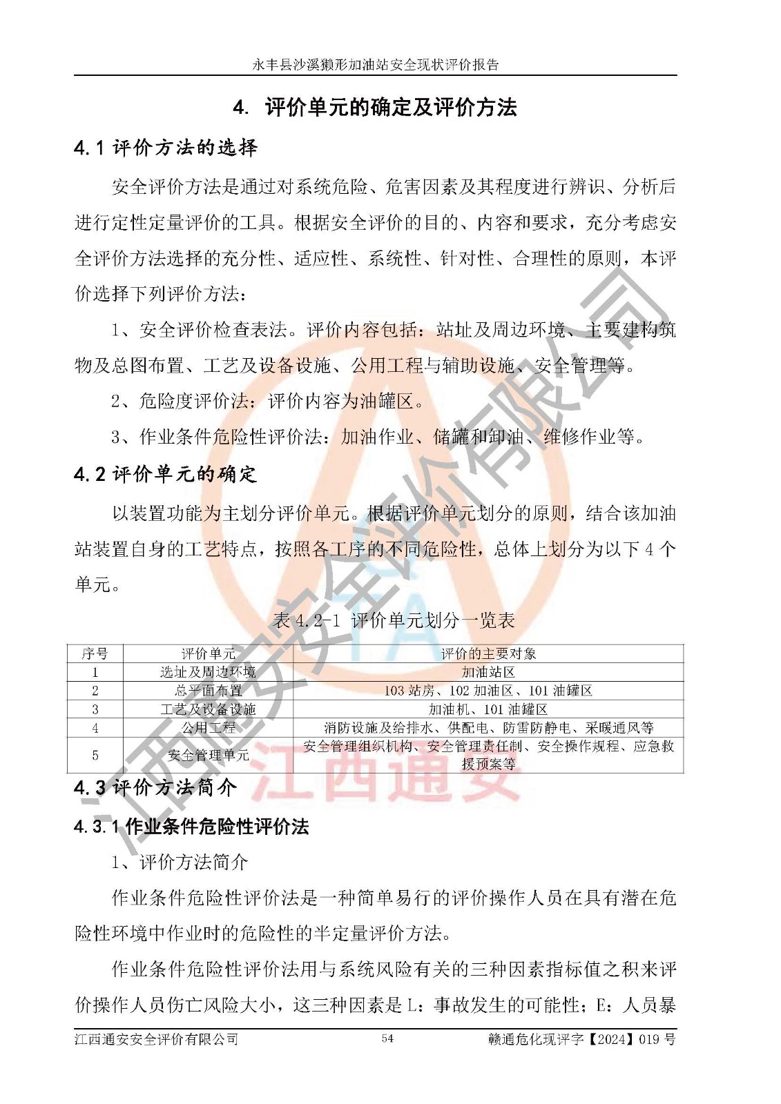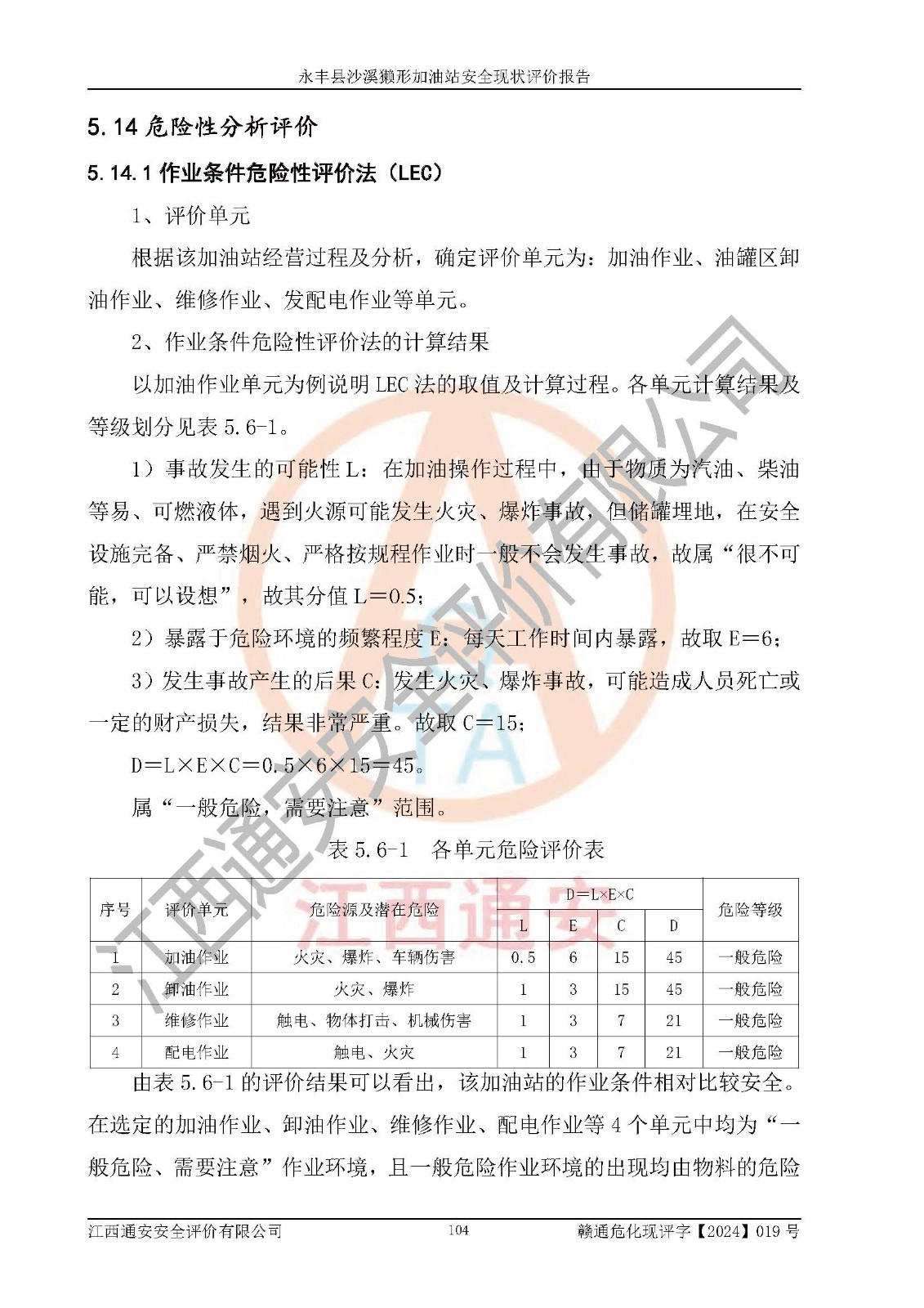 其它 | 在對該項目危險、有害因素辨識分析的基礎(chǔ)上,運用安全檢查表、預(yù)作業(yè)條件危險性分析法、危險度評價、重大事故后果分析結(jié)果等評價方法對該項目進行了分析評價,評價結(jié)果如下: 1、該項目位于江西省吉安市永豐縣沙溪鎮(zhèn)獺形永龍公路旁,符合當(dāng)?shù)匾?guī)劃,與周邊環(huán)境的距離符合有關(guān)標(biāo)準、規(guī)范的要求。 2、總圖布置分區(qū)明確,布局合理,各建構(gòu)筑物的防火間距滿足規(guī)范要求。 3、該項目無**明令淘汰的工藝,設(shè)備、設(shè)施與工藝條件、內(nèi)部介質(zhì)相適應(yīng),特種設(shè)備及設(shè)施較齊全,按規(guī)定設(shè)置防雷、防靜電接地,爆炸危險環(huán)境加油機按要求采用防爆型,符合相關(guān)標(biāo)準規(guī)范要求。 5、企業(yè)設(shè)置了安全生產(chǎn)管理機構(gòu),配備了專職安全生產(chǎn)管理人員,建立了安全生產(chǎn)責(zé)任制和安全生產(chǎn)管理制度,編制了崗位操作規(guī)程,編制了生產(chǎn)安全事故應(yīng)急預(yù)案,人員經(jīng)過相應(yīng)的培訓(xùn),企業(yè)的安全生產(chǎn)管理正常。 6、作業(yè)條件危險性評價結(jié)果:在選定的評價單元中,作業(yè)危險程度均為“一般危險,需要注意”,作業(yè)條件相對安全。 7、危險度評價結(jié)果:汽油儲罐的危險程度為**危險。其設(shè)置了高液位遠傳報警系統(tǒng),滲漏檢測報警系統(tǒng),可以滿足安全生產(chǎn)條件要求。 評價結(jié)論: 永豐縣沙溪獺形加油站工藝設(shè)備和安全設(shè)施運行正常,安全管理機制運行正常,安全設(shè)施、措施達到設(shè)計要求和預(yù)期結(jié)果,可以滿足建設(shè)項目安全生產(chǎn)的要求,安全生產(chǎn)管理**,項目具備危險化學(xué)品經(jīng)營單位安全經(jīng)營條件的要求。 | ||||