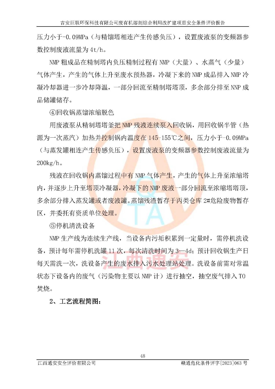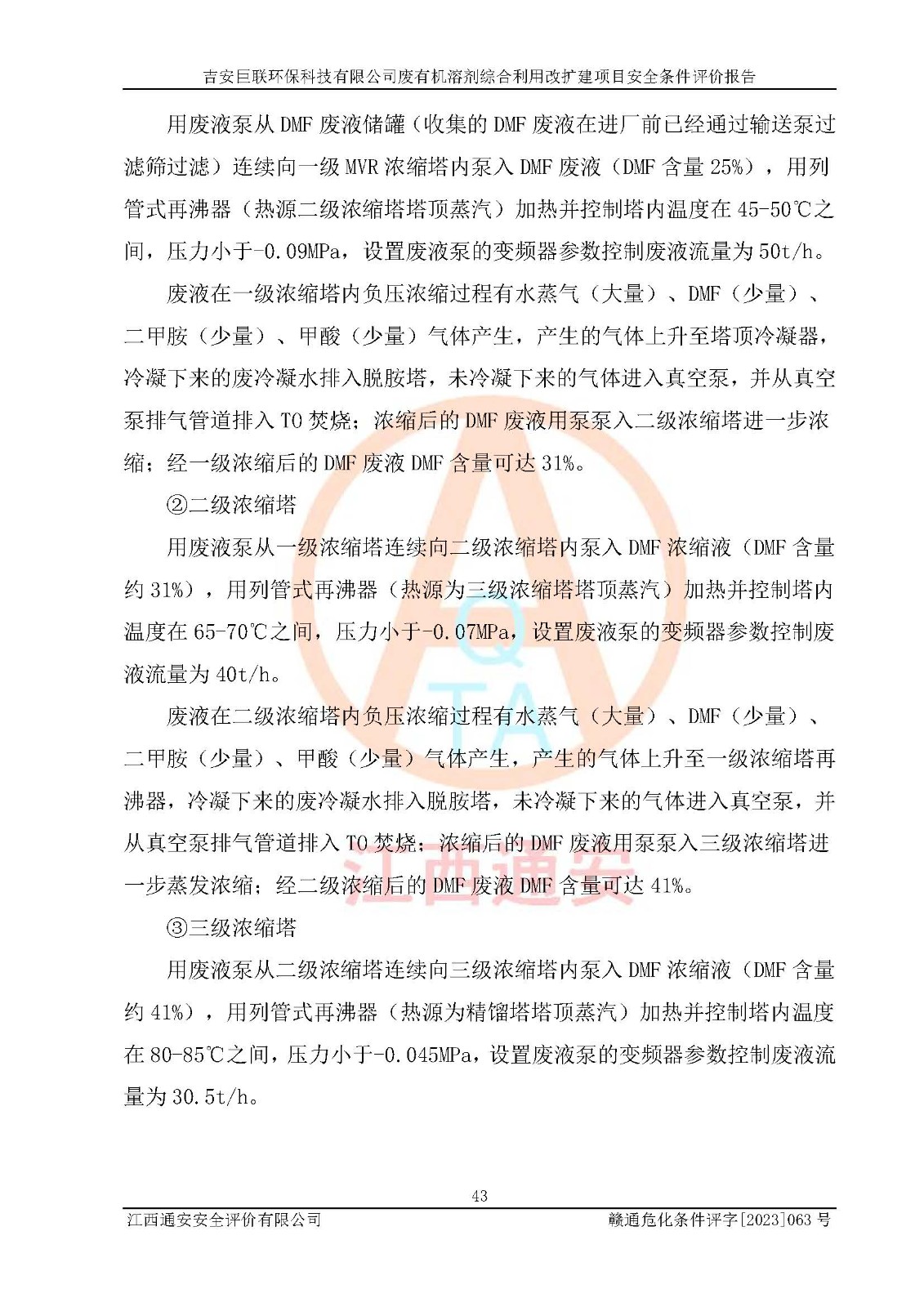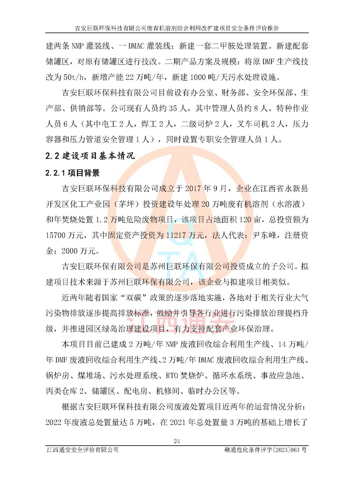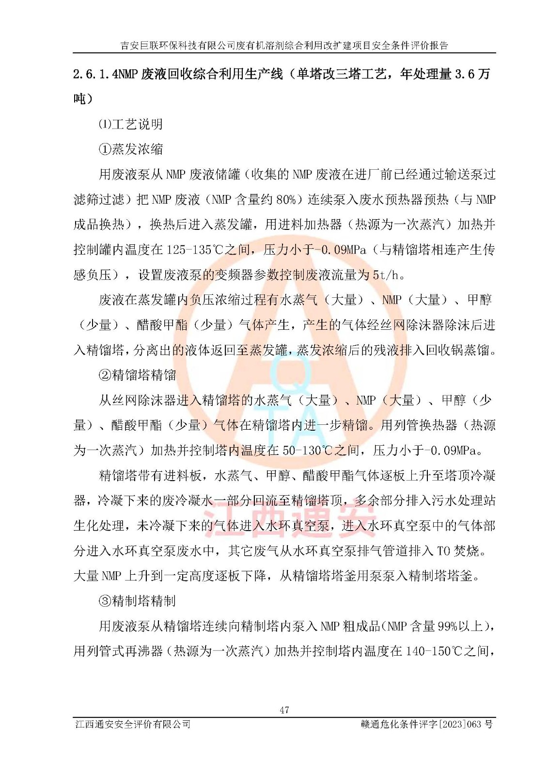項(xiàng)目簡(jiǎn)介 | 吉安巨聯(lián)**科技有限公司成立于2017年9月,并取得永新縣市場(chǎng)監(jiān)督管理局頒發(fā)的《營(yíng)業(yè)執(zhí)照》,營(yíng)業(yè)執(zhí)照統(tǒng)一社會(huì)信用代碼:91360830MA369Q6F9X。公司注冊(cè)住所:江西省吉安市永新縣工業(yè)開(kāi)發(fā)區(qū)。法定**人:尹東峰。注冊(cè)資本貳仟萬(wàn)元整。企業(yè)性質(zhì)為有限責(zé)任公司(自然人投資或控股)。營(yíng)業(yè)執(zhí)照許可經(jīng)營(yíng)范圍:許可項(xiàng)目:危險(xiǎn)廢物經(jīng)營(yíng)(依法須經(jīng)批準(zhǔn)的項(xiàng)目,經(jīng)相關(guān)部門批準(zhǔn)后方可開(kāi)展經(jīng)營(yíng)活動(dòng))一般項(xiàng)目:污水處理及其再生利用,大氣污染治理,環(huán)境保護(hù)**設(shè)備制造,固體廢物治理,資源再生利用技術(shù)研發(fā),水環(huán)境污染防治服務(wù)(除許可業(yè)務(wù)外,可自主依法經(jīng)營(yíng)法律法規(guī)非禁止或限制的項(xiàng)目)。 吉安巨聯(lián)**科技有限公司2023年11月03日取得永新縣工業(yè)和信息化局頒發(fā)的《江西省工業(yè)企業(yè)技術(shù)改造項(xiàng)目備案通知書(shū)》,備案項(xiàng)目名稱為:吉安巨聯(lián)**科技有限公司廢有機(jī)溶劑綜合利用改擴(kuò)建項(xiàng)目。項(xiàng)目統(tǒng)一代碼為:2311-360830-07-02-655303。項(xiàng)目總投資12000萬(wàn)元,項(xiàng)目總占地面積54.15畝,項(xiàng)目主要建設(shè)內(nèi)容為:主要建設(shè)內(nèi)容:項(xiàng)目利用現(xiàn)有土地面積約36099.6091㎡,總建筑面積約2840㎡,不新增用地。主要建、構(gòu)筑物內(nèi)容包括DMF回收裝置區(qū)、NMP回收裝置區(qū)、2#儲(chǔ)罐區(qū)、檢測(cè)中心、灌裝車間、倉(cāng)庫(kù)、公用工程及污水處理(二期)等。產(chǎn)品方案及規(guī)模:一期產(chǎn)品方案及規(guī)模:新建1條DMF廢液50t/h生產(chǎn)線,新增產(chǎn)能36萬(wàn)噸/年:新建1條NMP廢液10t/h生產(chǎn)線,新增產(chǎn)能7.2萬(wàn)噸/年NMP廢液:將原NMP生產(chǎn)線技改,新增產(chǎn)能1.6萬(wàn)噸/年;將原DMAC生產(chǎn)線技改,新增產(chǎn)能1.6萬(wàn)噸/年;新建兩條NMP灌裝線、一DMAC灌裝線:新建一套二甲胺處理裝置。新建配套儲(chǔ)罐區(qū),對(duì)原有儲(chǔ)罐區(qū)進(jìn)行技改。二期產(chǎn)品方案及規(guī)模:將原DMF生產(chǎn)線技改為50t/h,新增產(chǎn)能22萬(wàn)噸/年,新建1000噸/天污水處理設(shè)施。 | |||