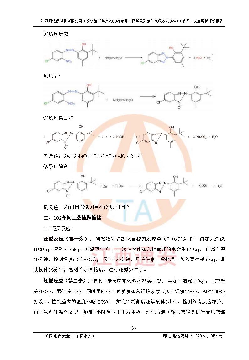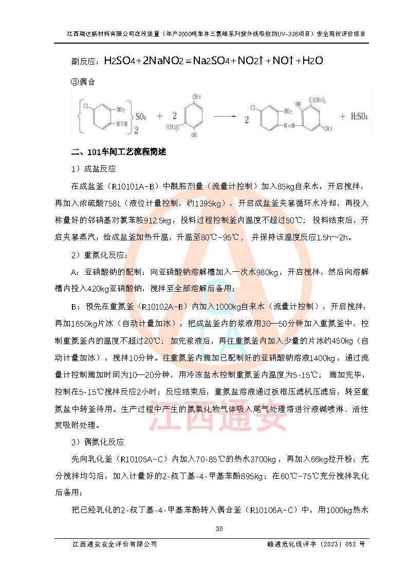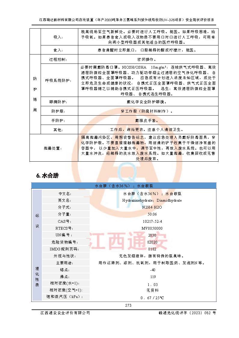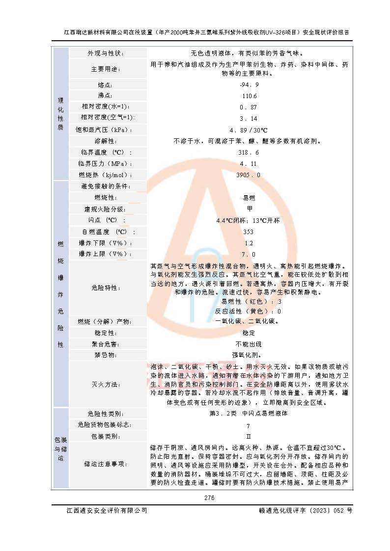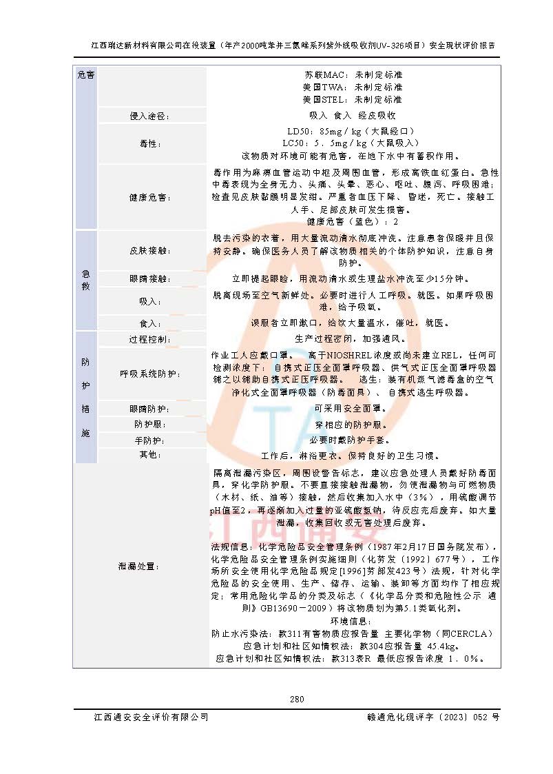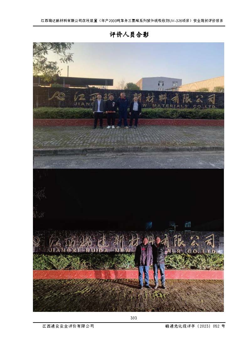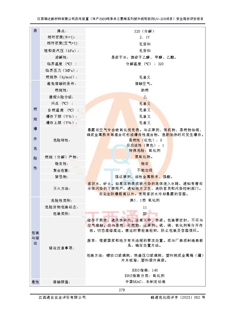 評價報告名稱 | 江西瑞達新材料有限公司年產(chǎn)2000噸苯并三氮唑系列紫外線吸收劑UV-326生產(chǎn)裝置技術(shù)改造項目安全驗收評價 | |||