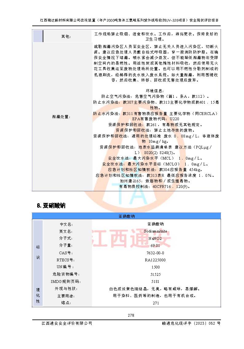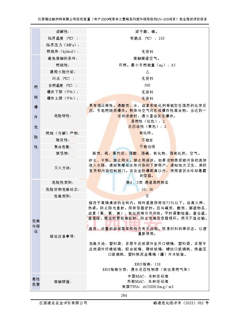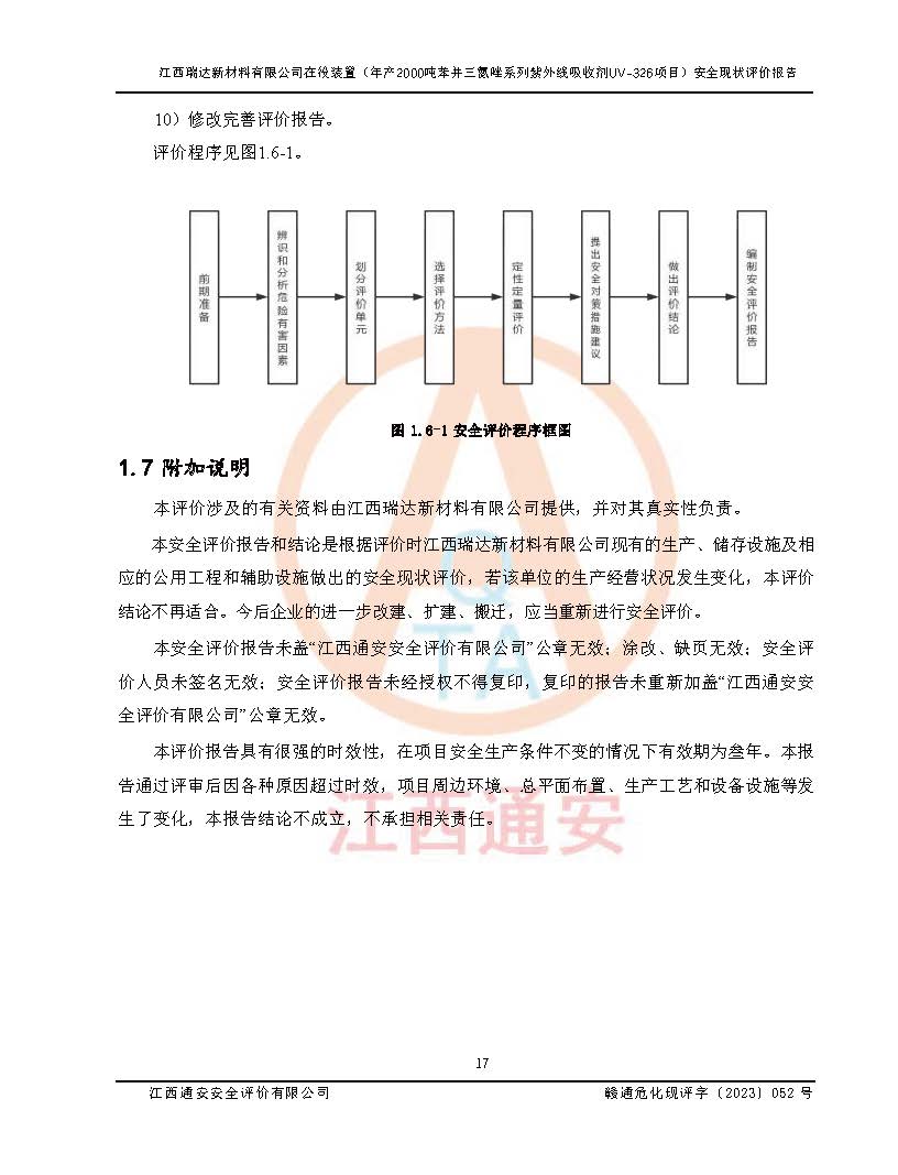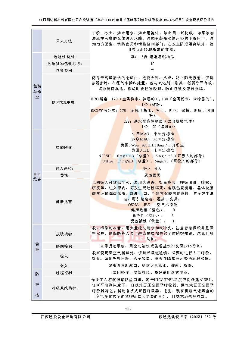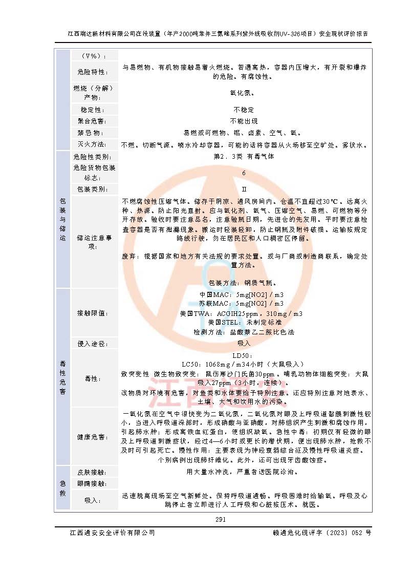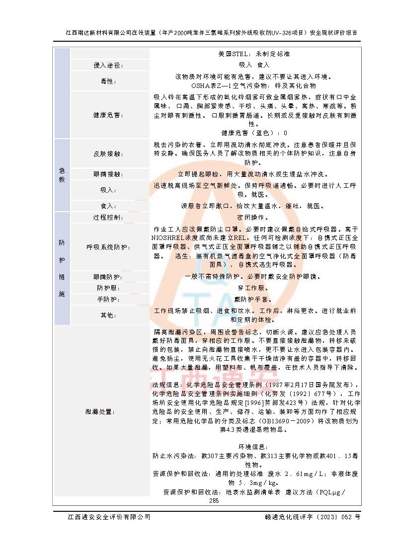 評價報告名稱 | 江西瑞達新材料有限公司年產(chǎn)2000噸苯并三氮唑系列紫外線吸收劑UV-326生產(chǎn)裝置技術(shù)改造項目安全驗收評價 | |||