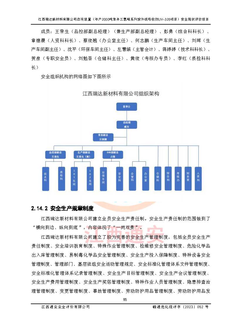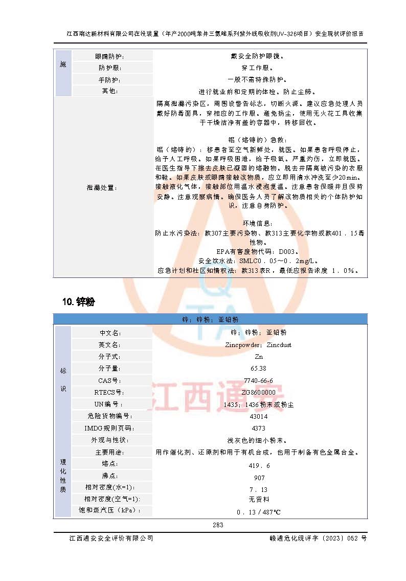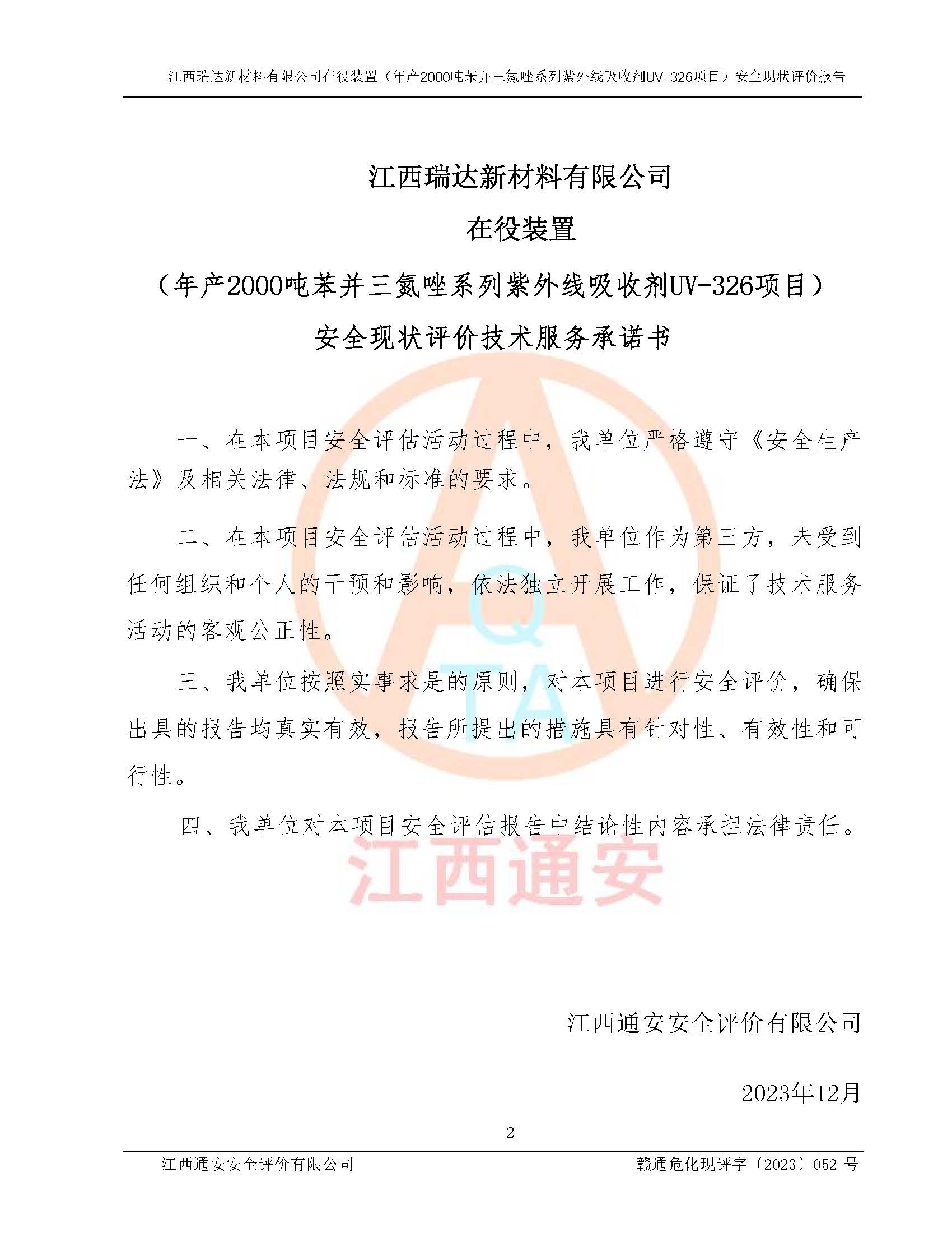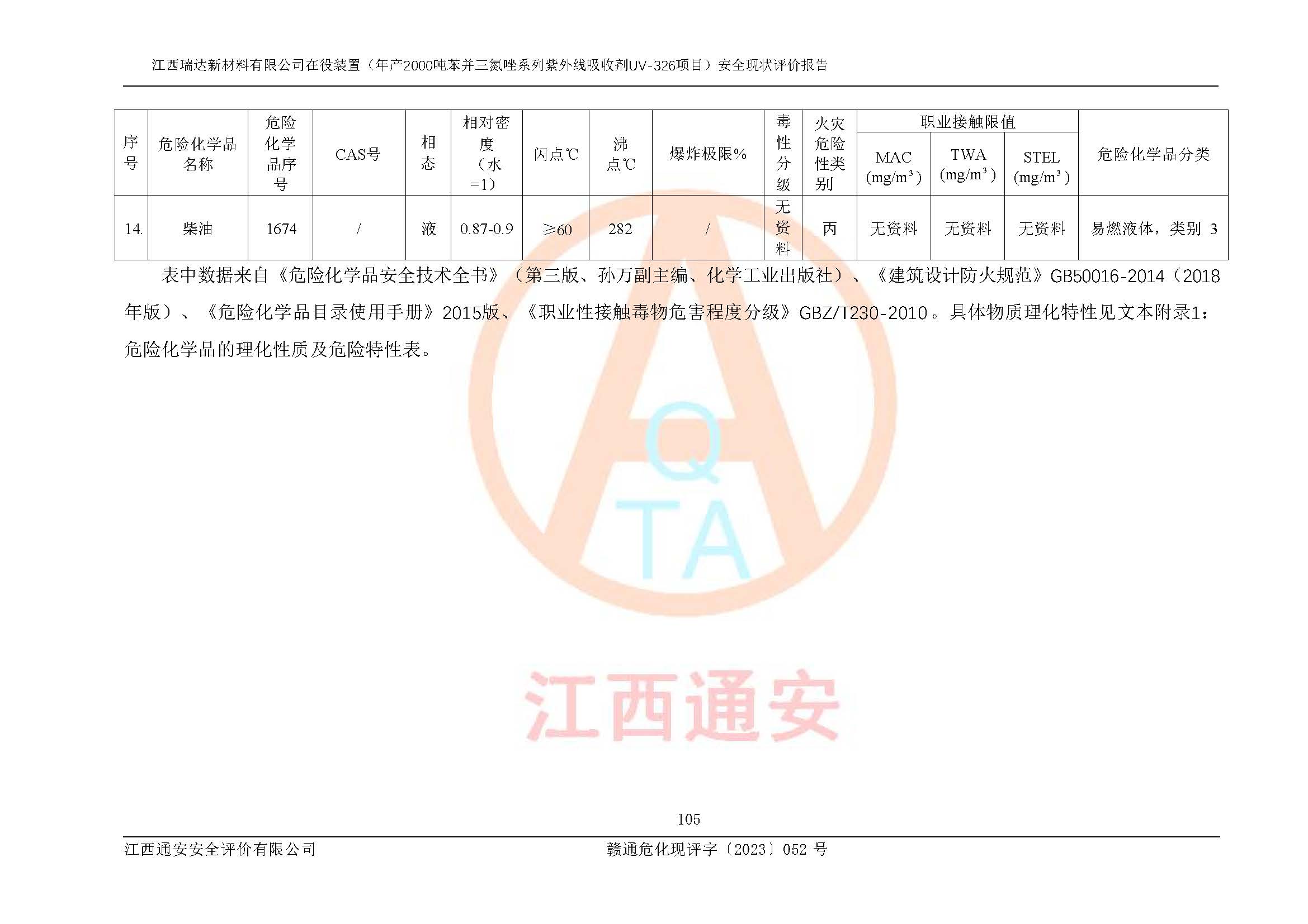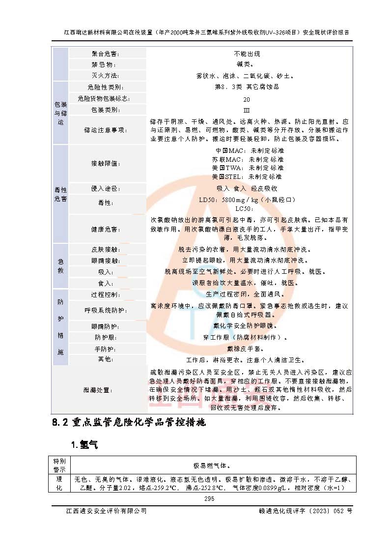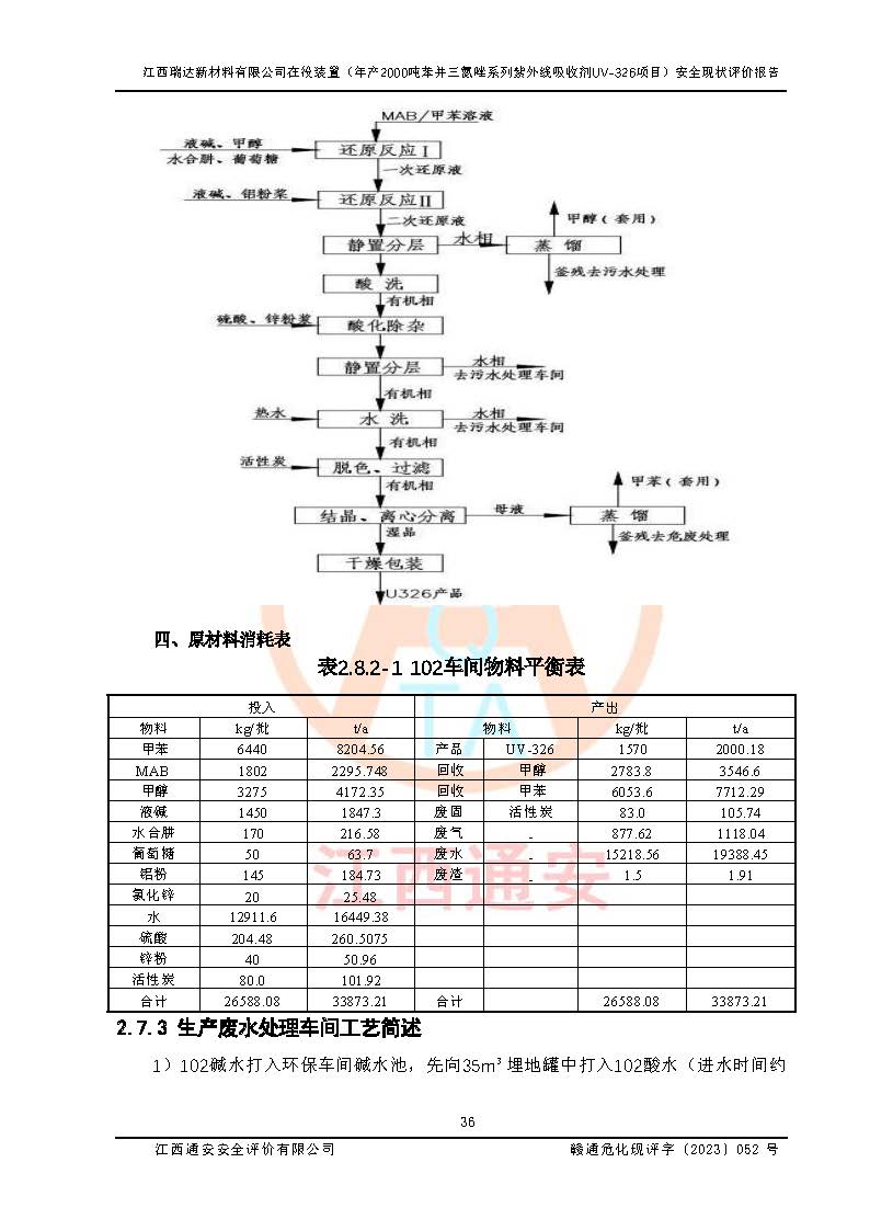 評價報告名稱 | 江西瑞達新材料有限公司年產(chǎn)2000噸苯并三氮唑系列紫外線吸收劑UV-326生產(chǎn)裝置技術(shù)改造項目安全驗收評價 | |||