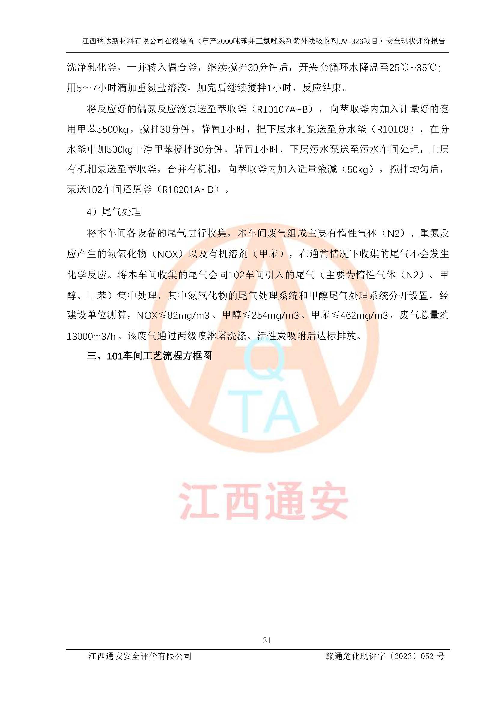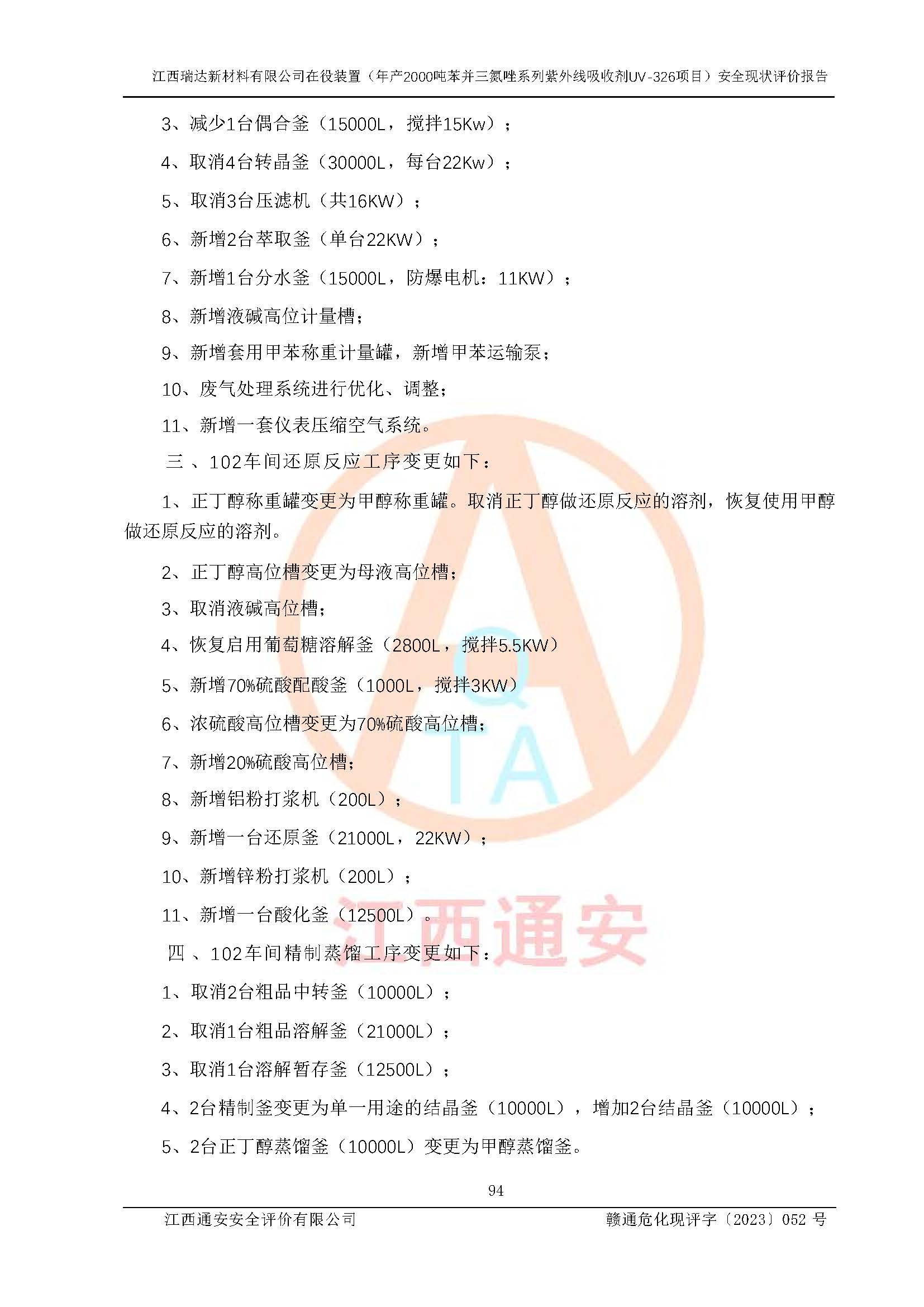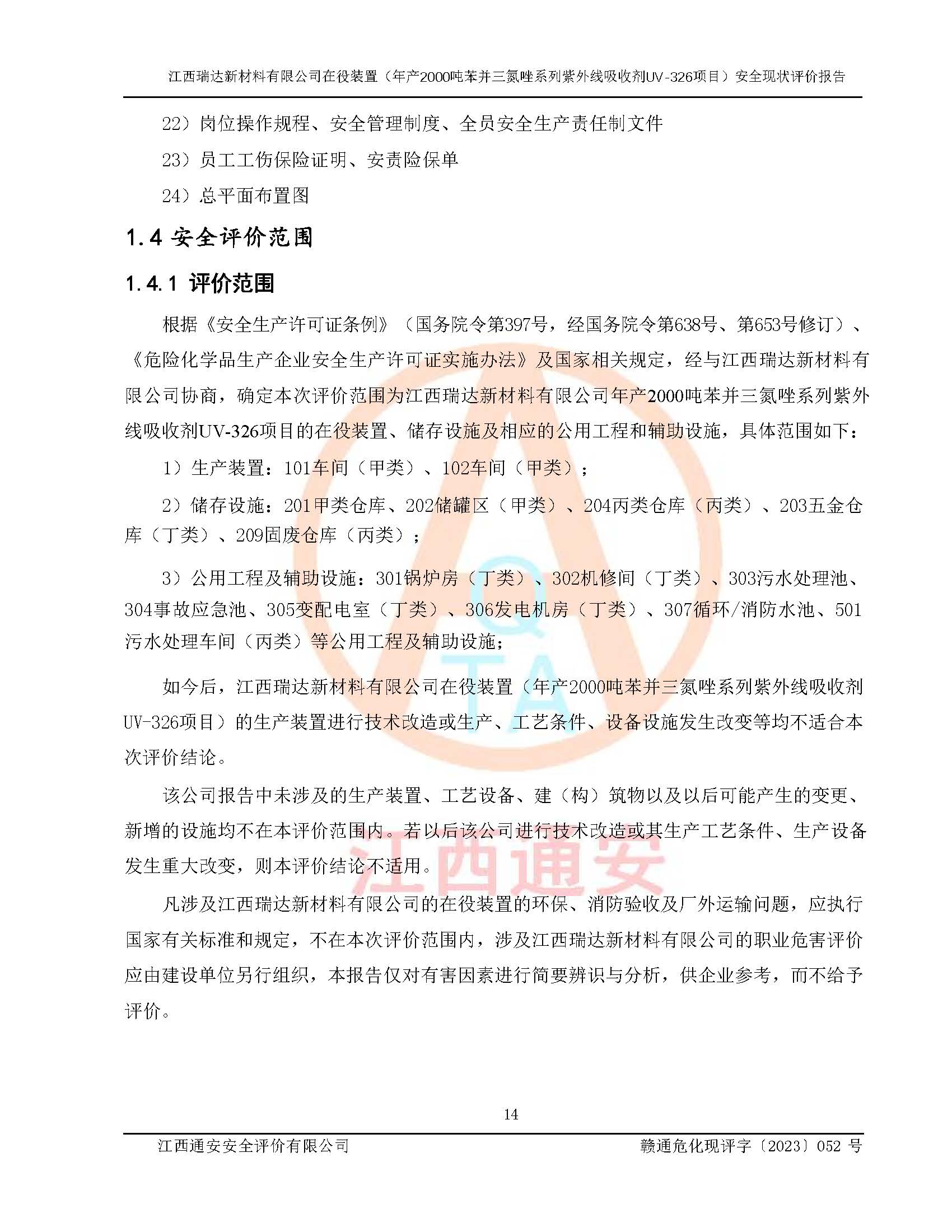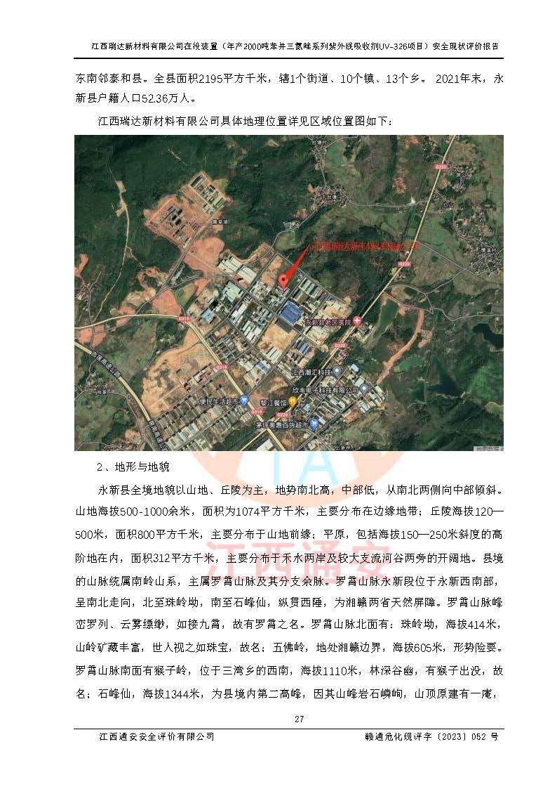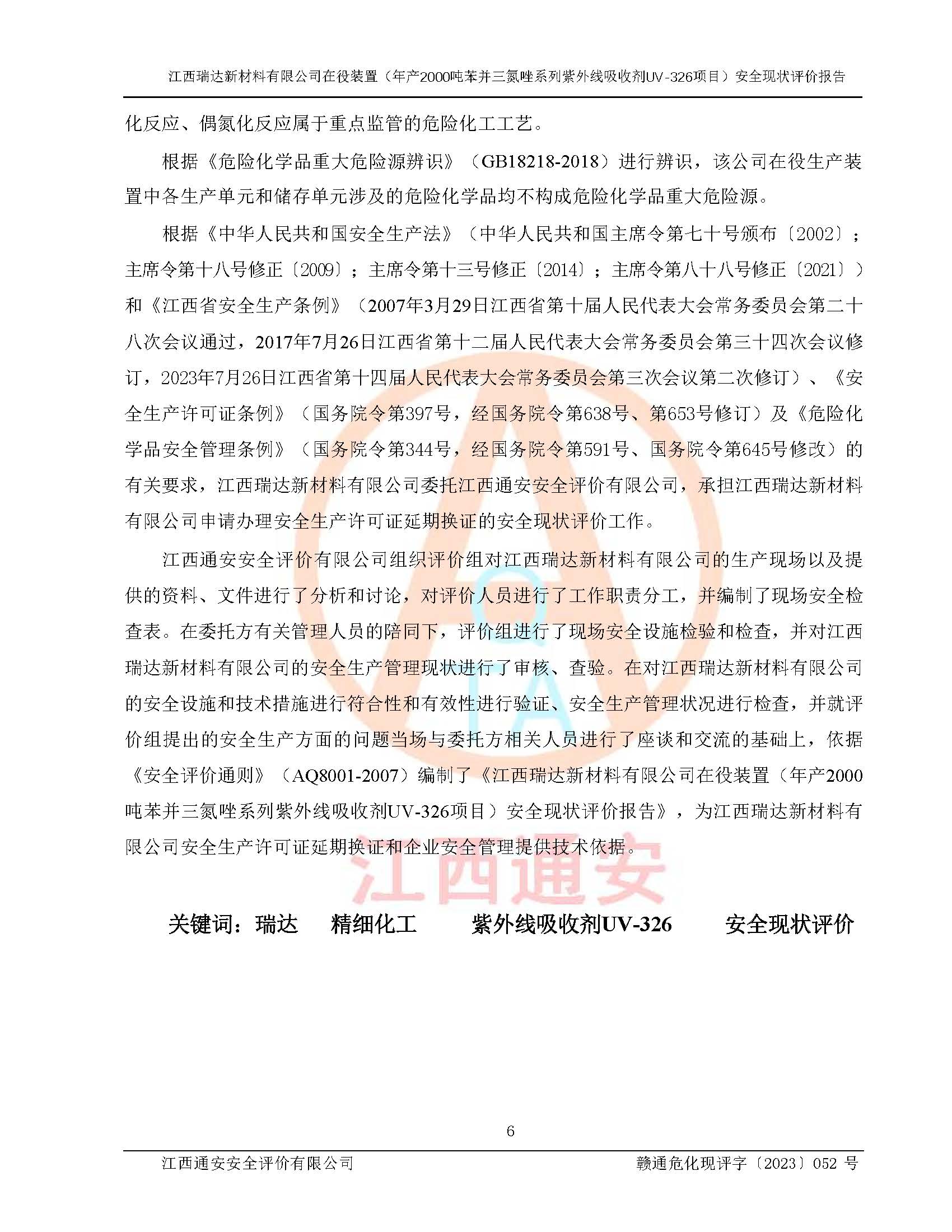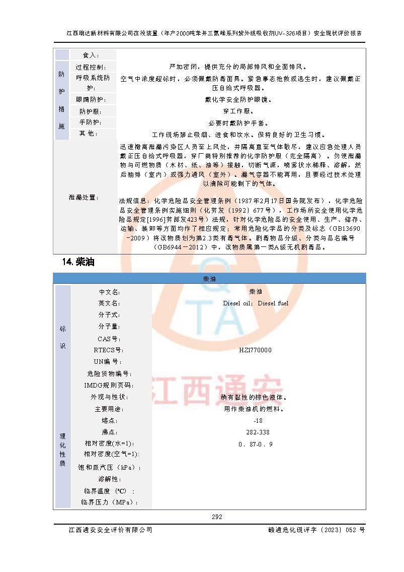 評價報告名稱 | 江西瑞達新材料有限公司年產(chǎn)2000噸苯并三氮唑系列紫外線吸收劑UV-326生產(chǎn)裝置技術(shù)改造項目安全驗收評價 | |||