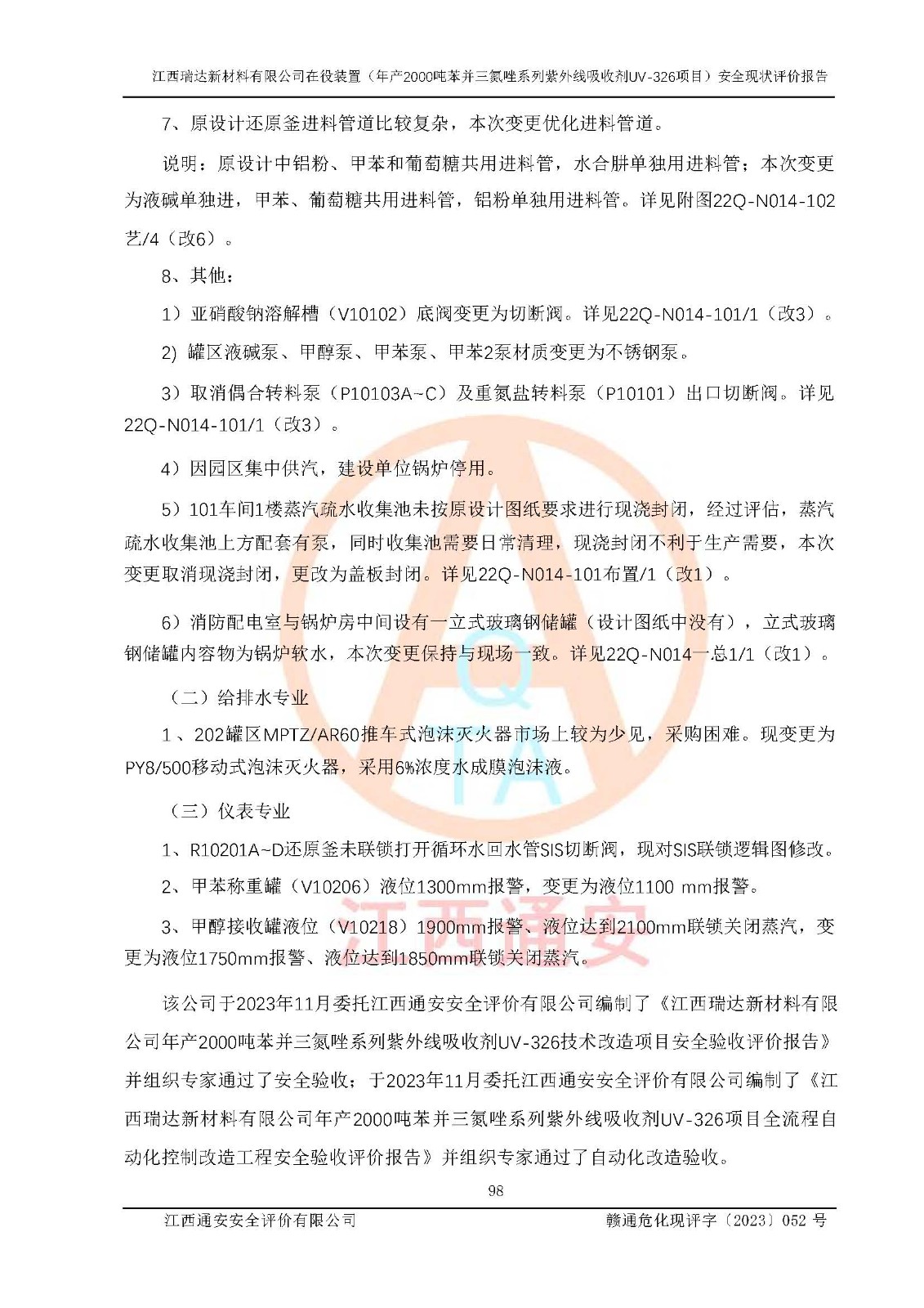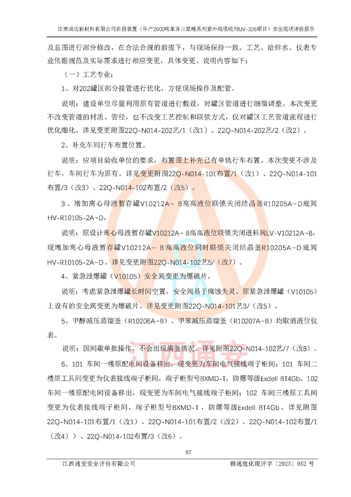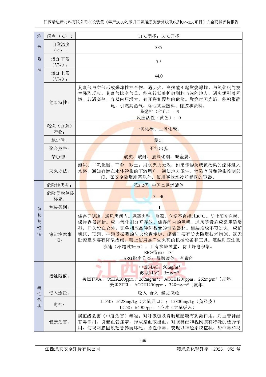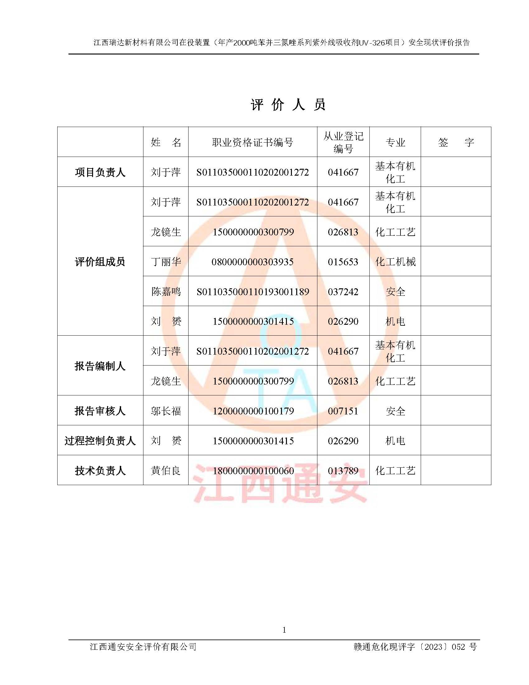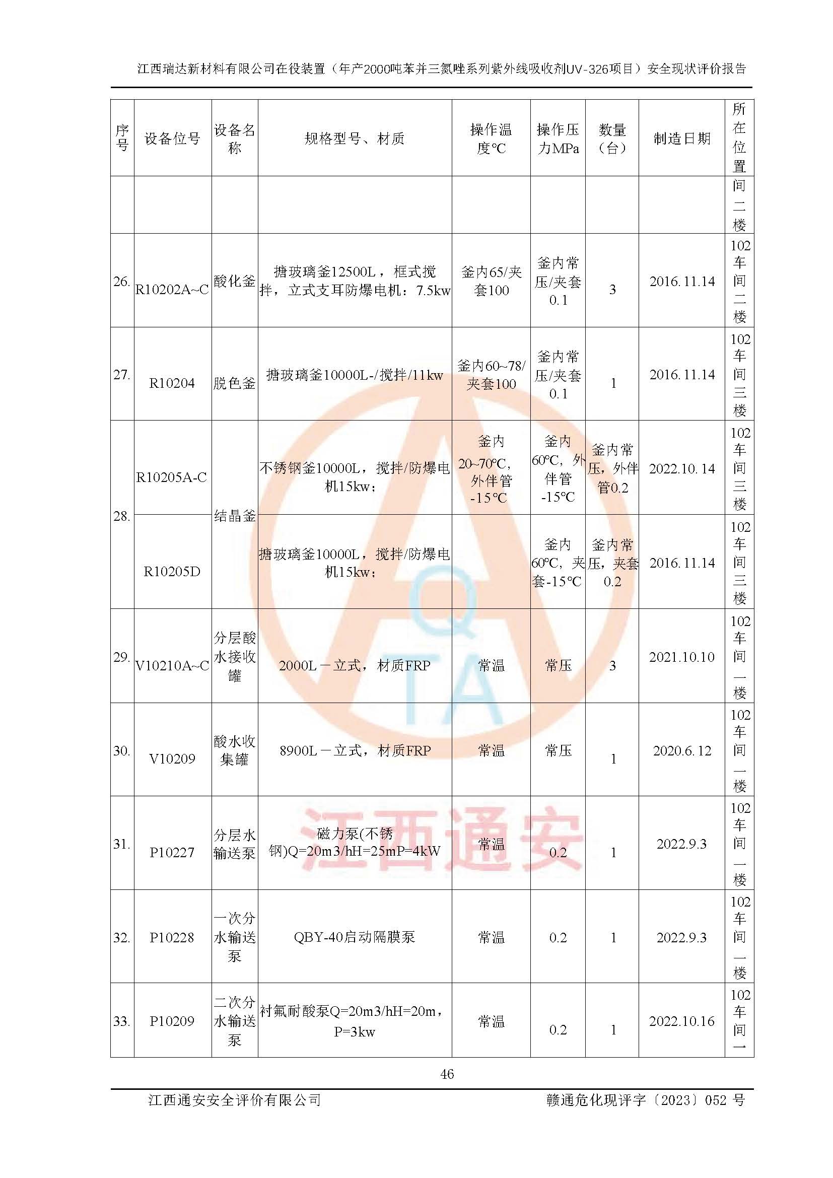 評價報告名稱 | 江西瑞達新材料有限公司年產(chǎn)2000噸苯并三氮唑系列紫外線吸收劑UV-326生產(chǎn)裝置技術(shù)改造項目安全驗收評價 | |||
