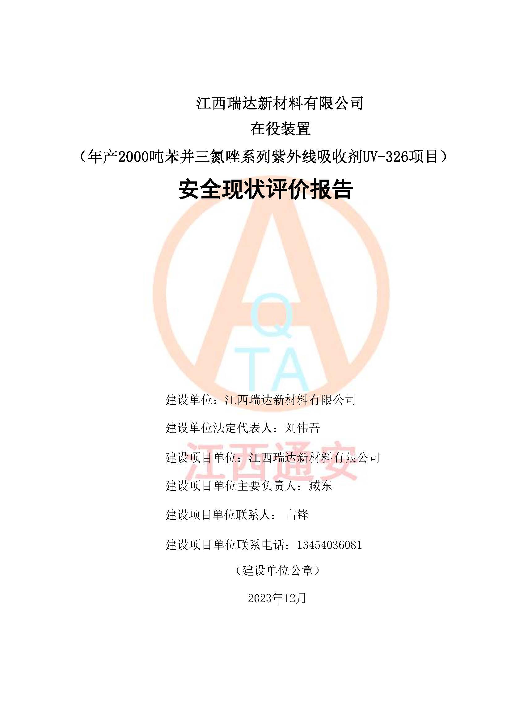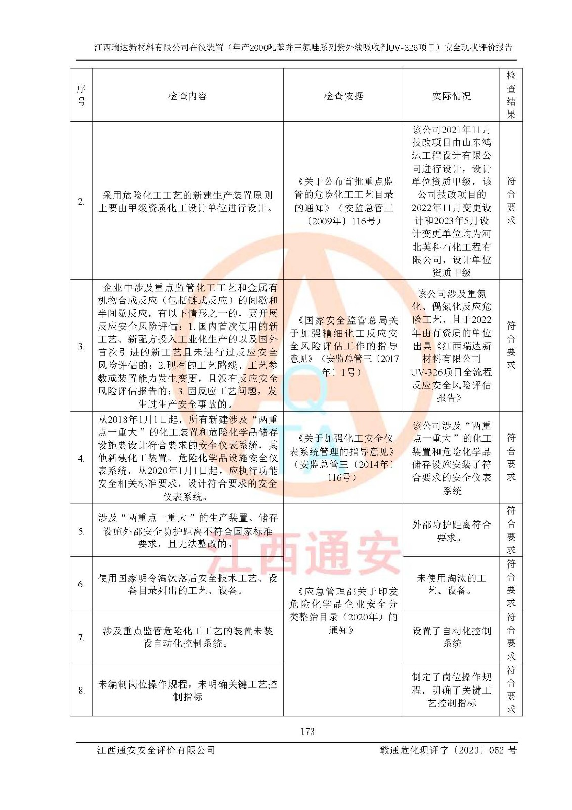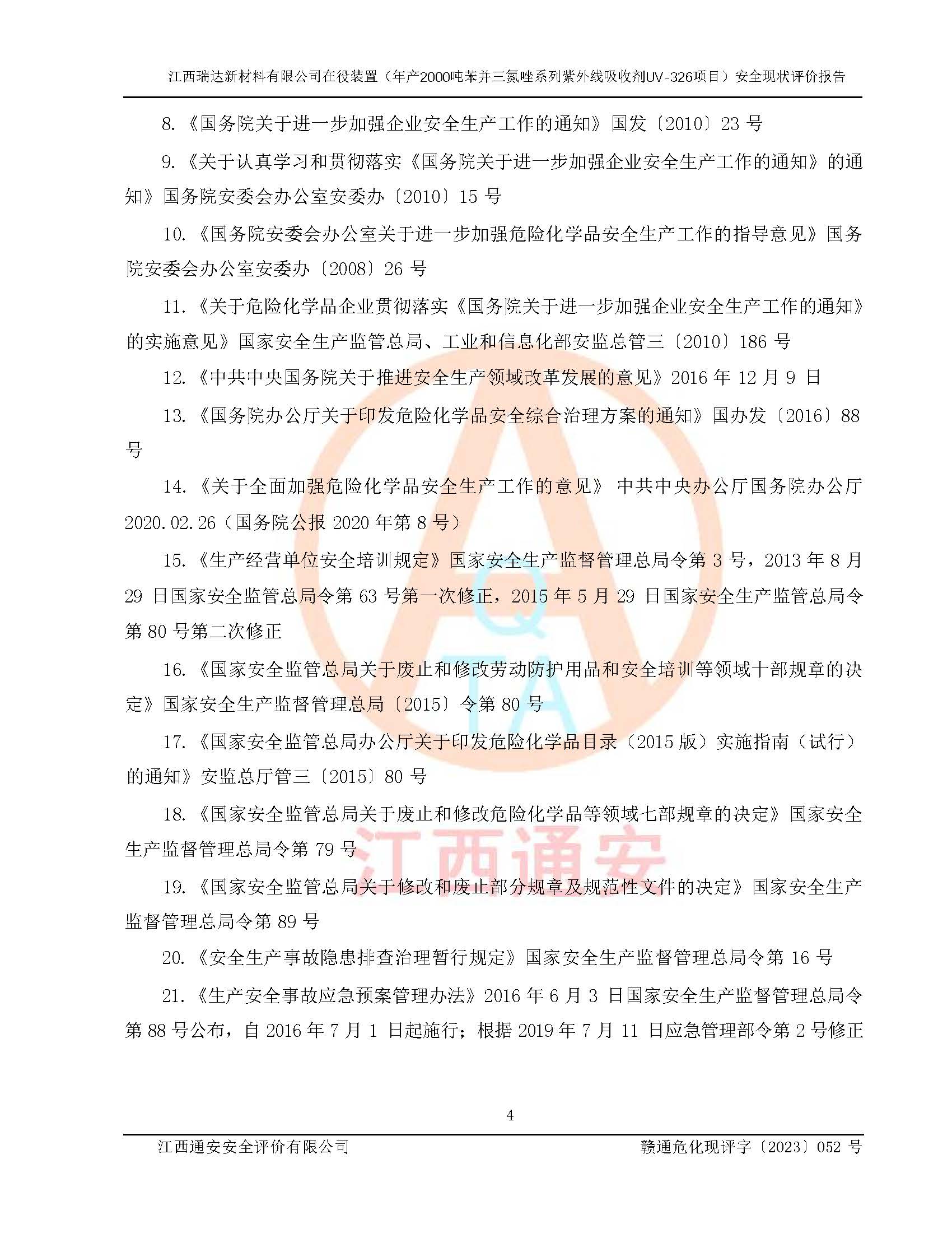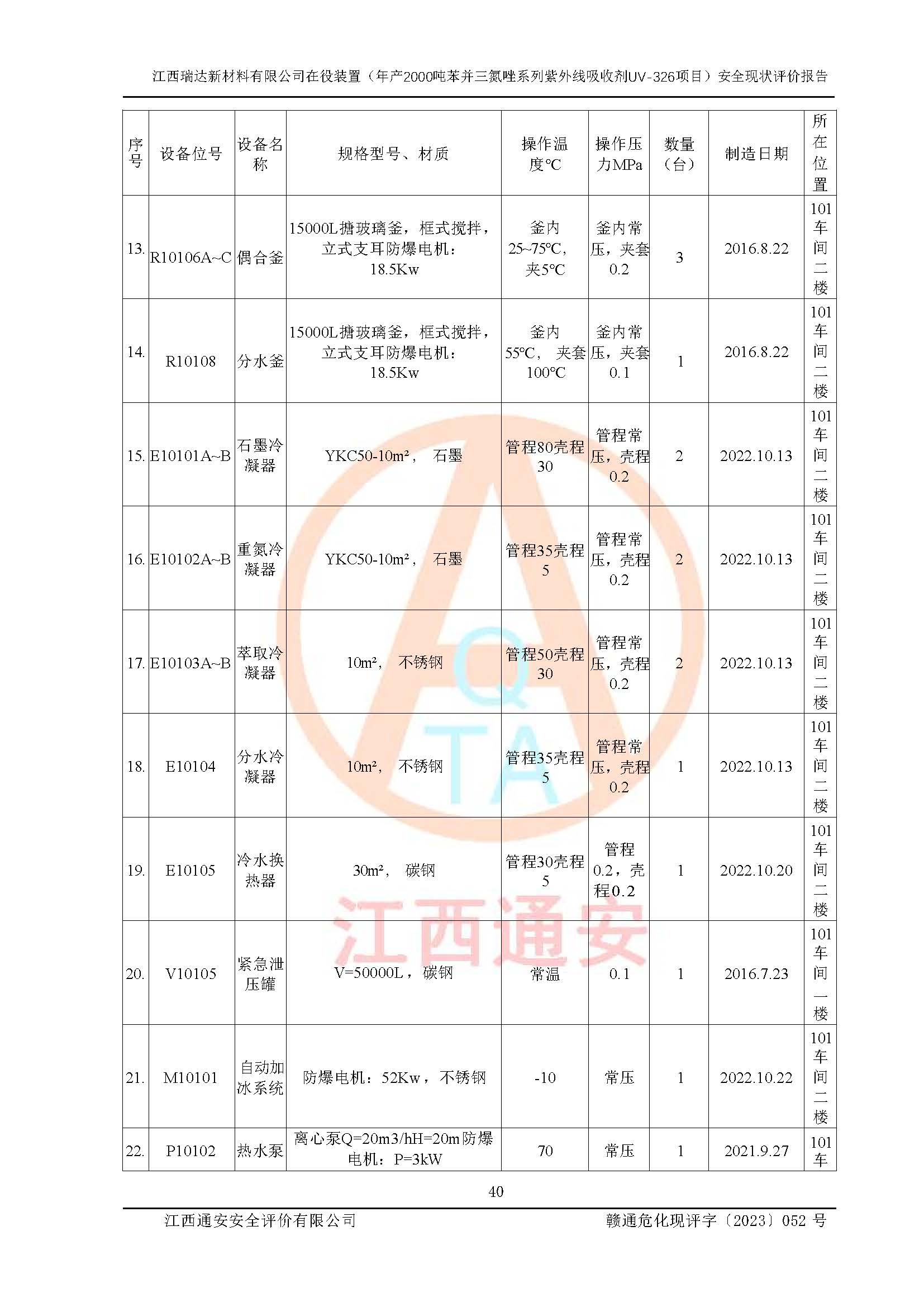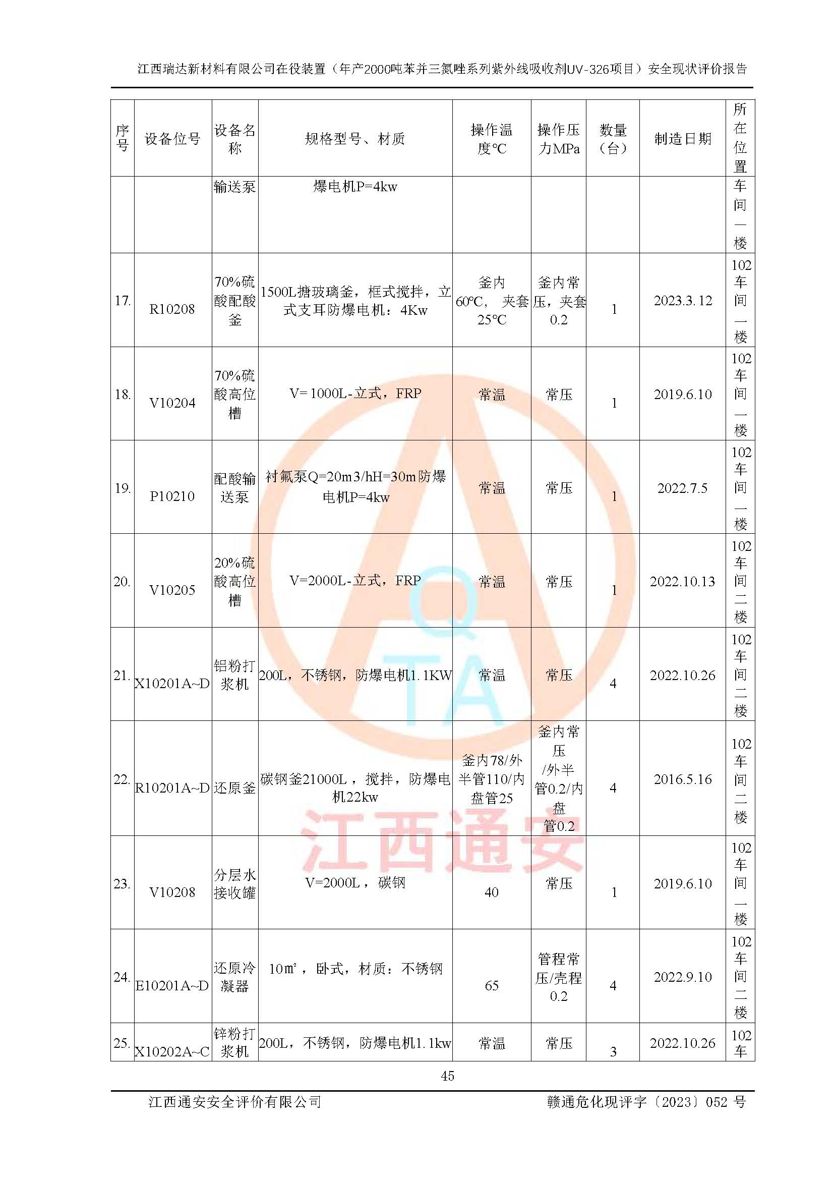 評價報告名稱 | 江西瑞達新材料有限公司年產(chǎn)2000噸苯并三氮唑系列紫外線吸收劑UV-326生產(chǎn)裝置技術(shù)改造項目安全驗收評價 | |||