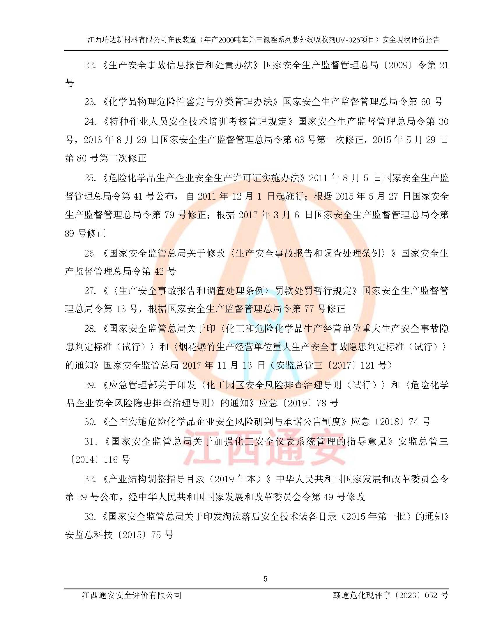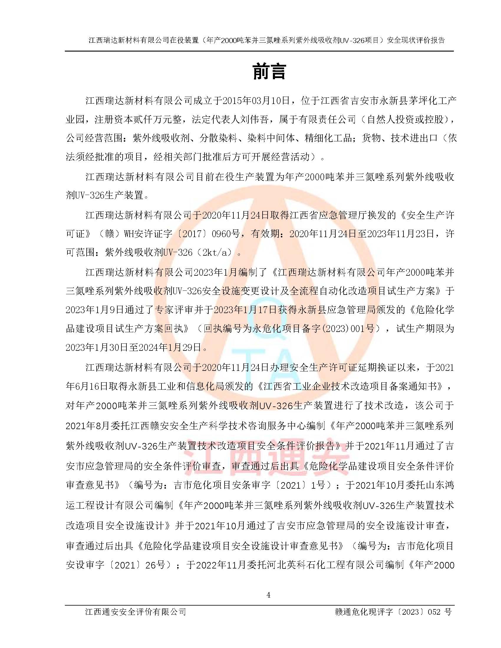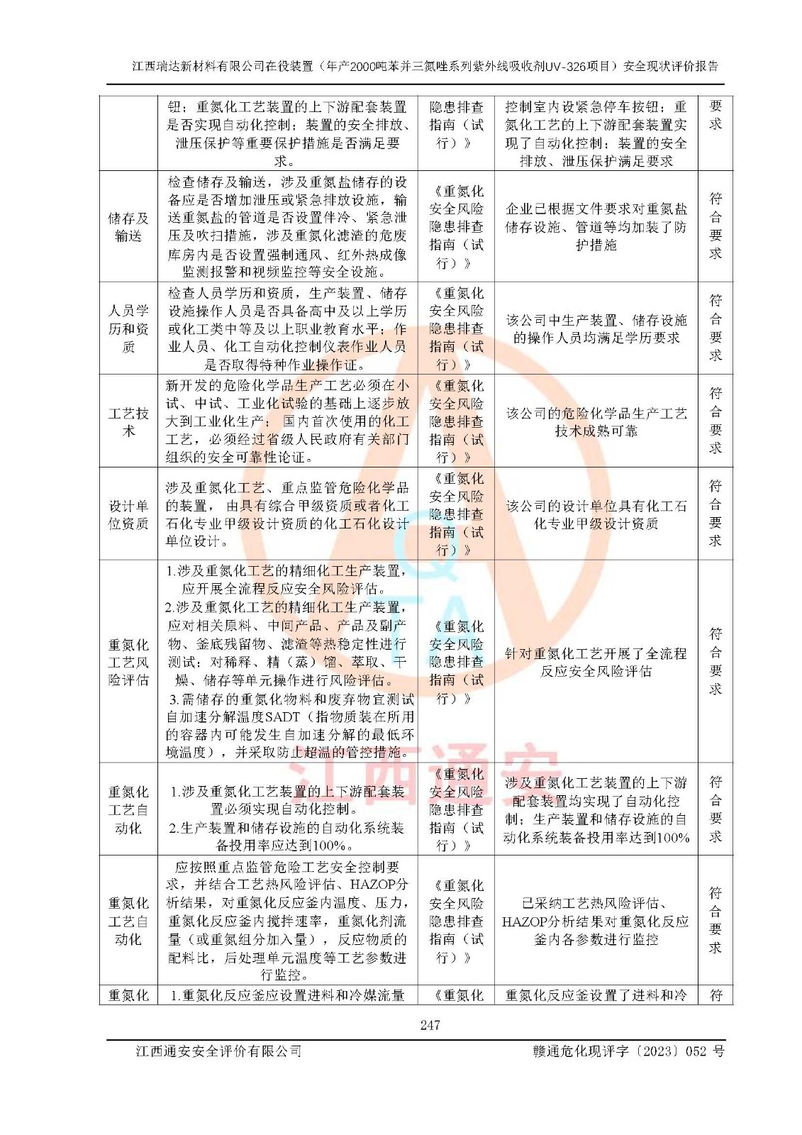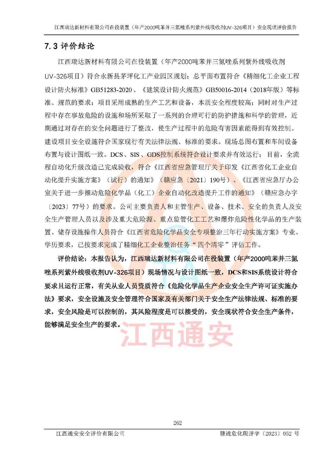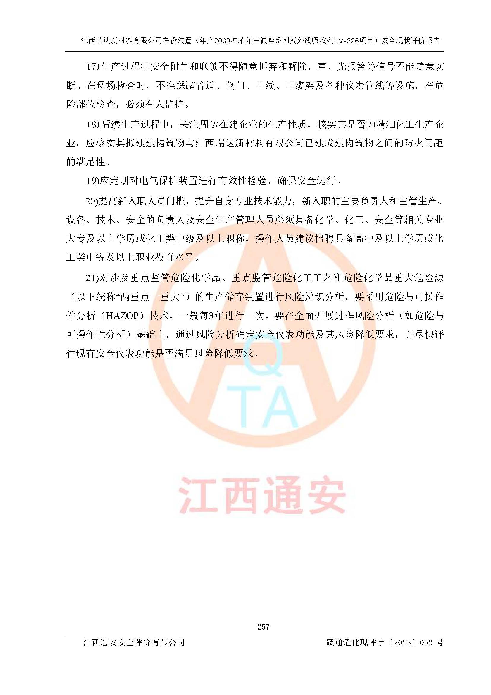 評價報告名稱 | 江西瑞達新材料有限公司年產(chǎn)2000噸苯并三氮唑系列紫外線吸收劑UV-326生產(chǎn)裝置技術(shù)改造項目安全驗收評價 | |||
