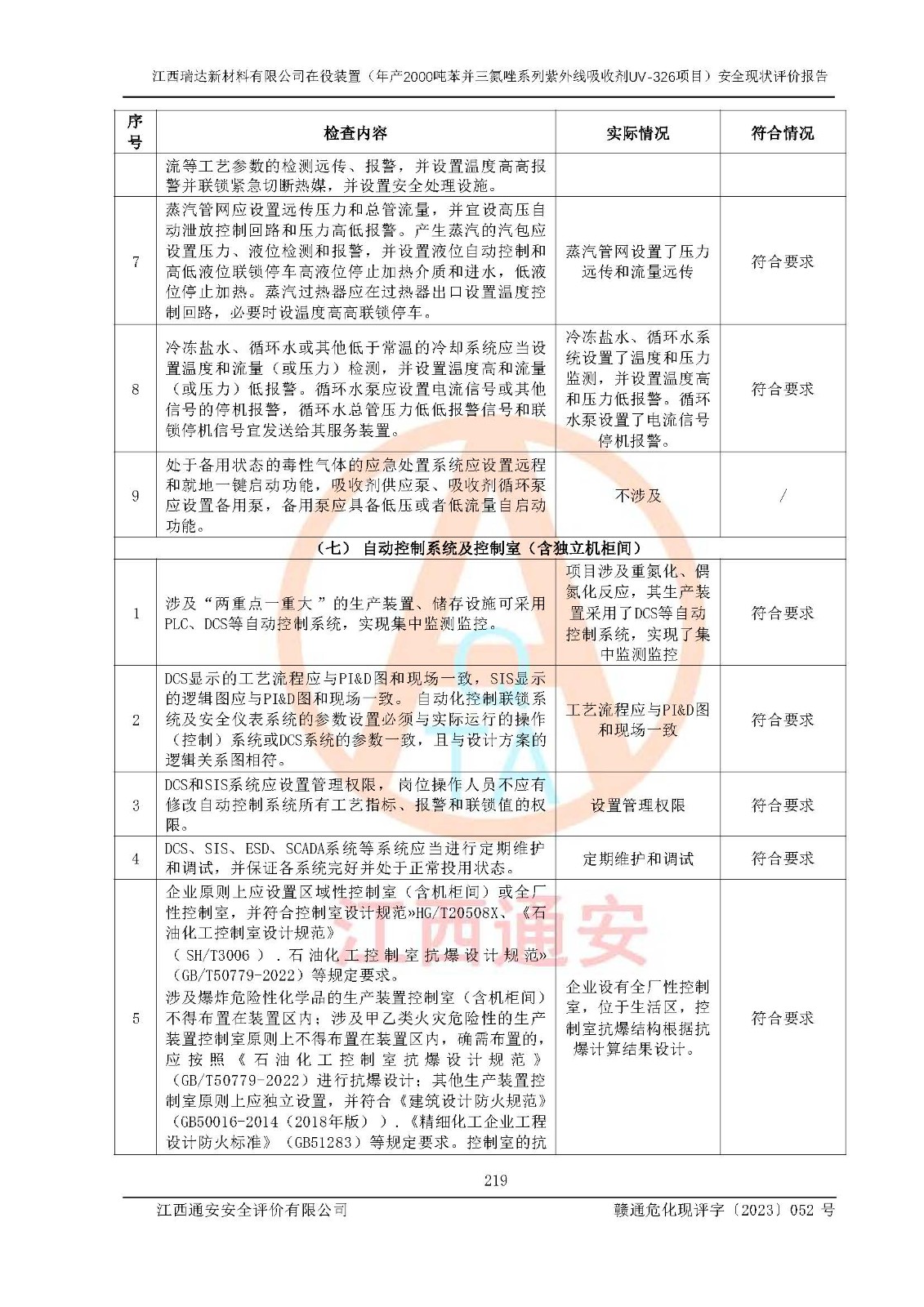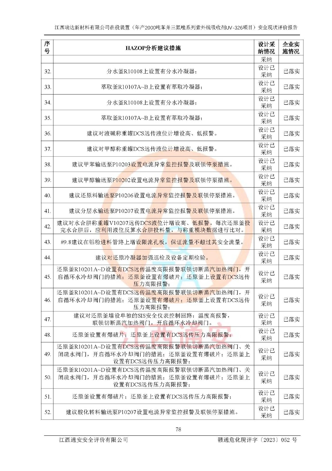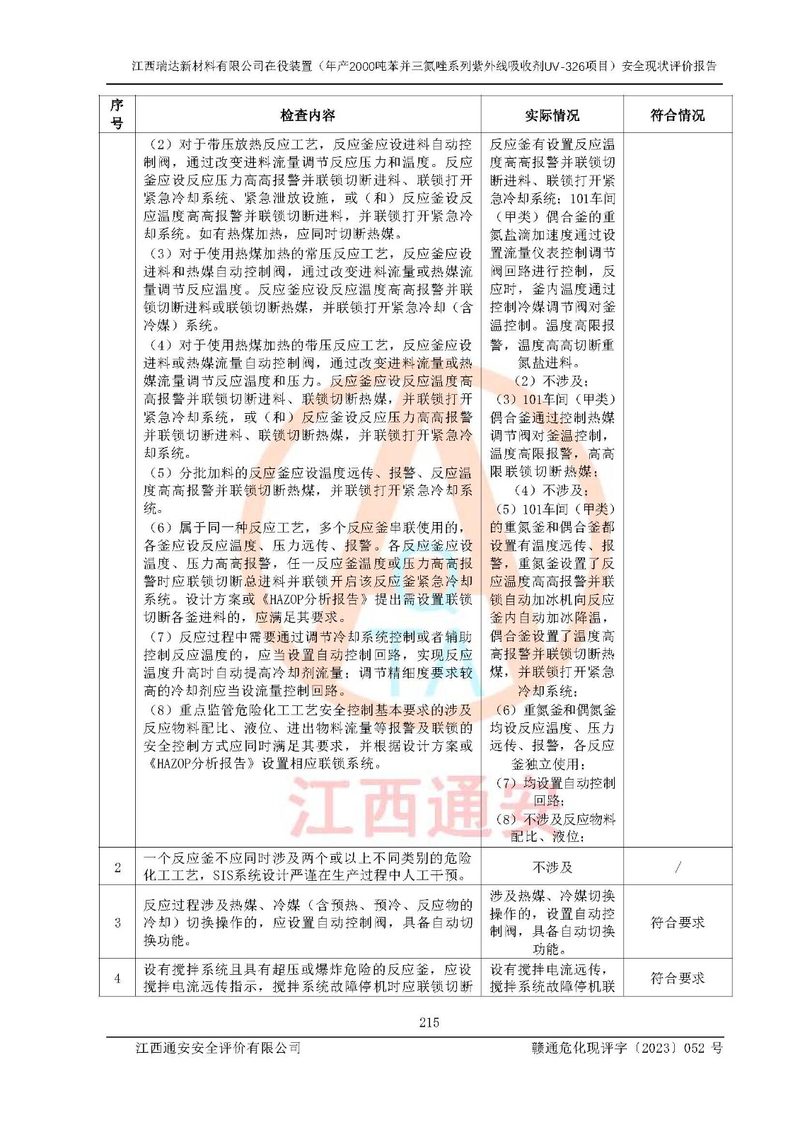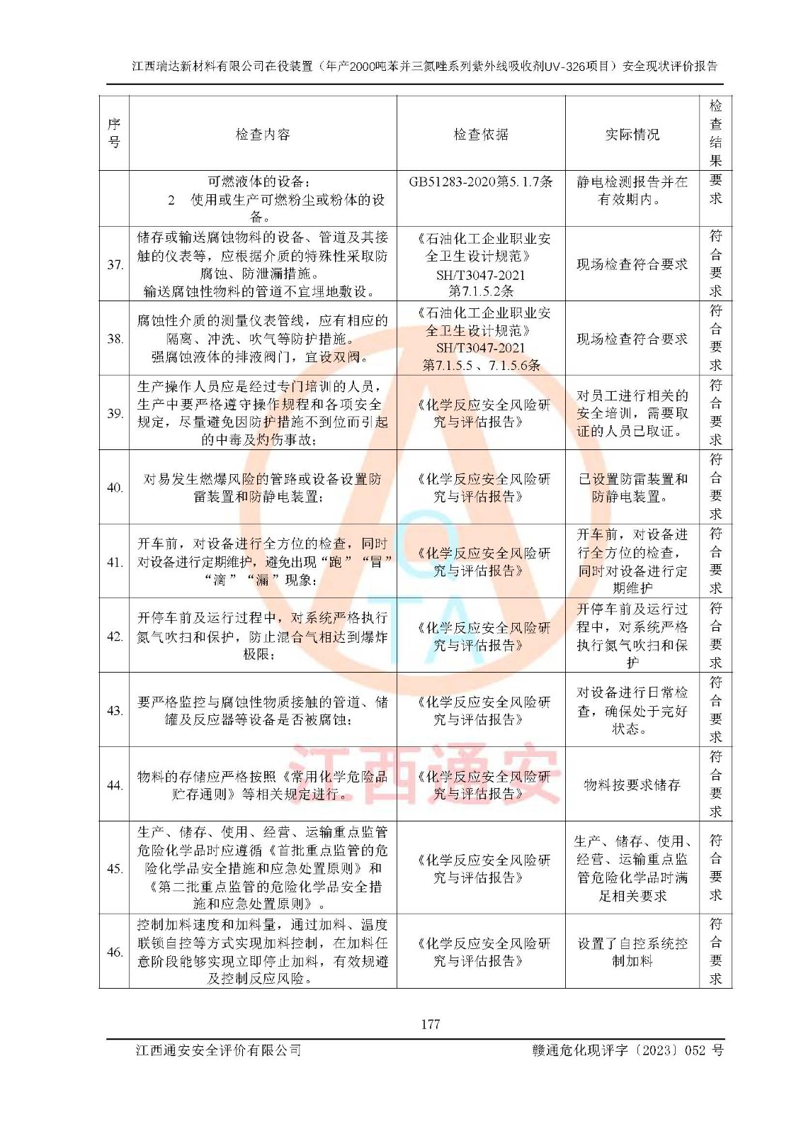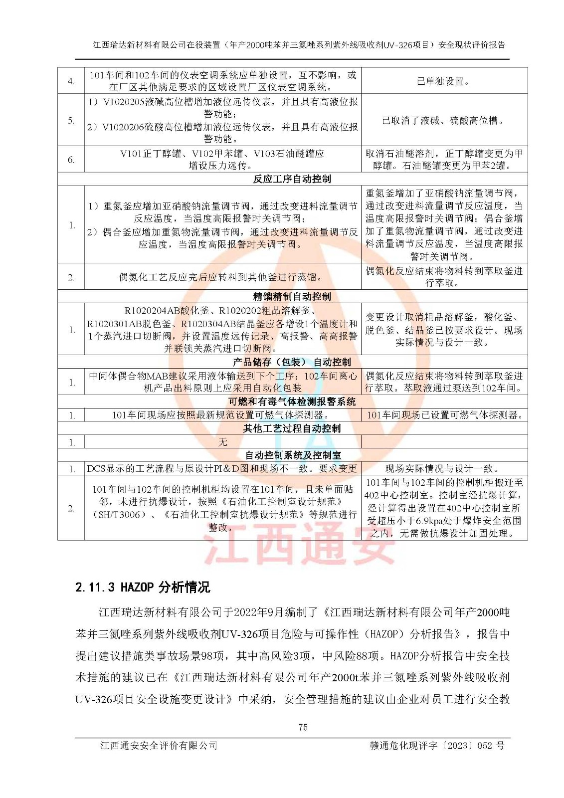 評價結(jié)論 | 1. 江西瑞達新材料有限公司年產(chǎn)2000噸苯并三氮唑系列紫外線吸收劑UV-326技術(shù)改造項目的安全設(shè)施與主體工程同時設(shè)計、同時施工、同時投入生產(chǎn)和使用,符合**有關(guān)建設(shè)項目“三同時”的規(guī)定和要求。 江西瑞達新材料有限公司年產(chǎn)2000噸苯并三氮唑系列紫外線吸收劑UV-326生產(chǎn)裝置技術(shù)改造項目符合永新縣茅坪化工產(chǎn)業(yè)園發(fā)展規(guī)劃的布局; 2. 該項目現(xiàn)場情況、企業(yè)總平面布置、設(shè)備設(shè)施的布置與設(shè)計圖、竣工圖紙一致,主體工程安全設(shè)施、安全措施符合法律法規(guī)的規(guī)定和要求,安全設(shè)施正常投用并運行**;供配電、給排水、供熱、空壓、供冷等公用工程及輔助設(shè)施滿足主體工程生產(chǎn)安全的需要;企業(yè)安全管理體系滿足生產(chǎn)安全的要求; 3. 總平面布置符合《建筑設(shè)計防火規(guī)范》GB50016-2014(2018年版)、《精細化工企業(yè)工程設(shè)計防火標準》GB51283-2020等標準、規(guī)范的要求; 4. DCS系統(tǒng)、SIS系統(tǒng)和可燃/有毒氣體報警系統(tǒng)等自動化控制系統(tǒng)設(shè)計符合《江西省應(yīng)急管理廳關(guān)于印發(fā)<江西省化工企業(yè)自動化提升實施方案>(試行)的通知》、《江西省危險化學品安全專項整治三年行動實施方案》要求,并已調(diào)試到位,自動化系統(tǒng)安裝單位出具了調(diào)試報告。目前DCS系統(tǒng)、SIS系統(tǒng)和可燃/有毒氣體報警系統(tǒng)已投入使用且運行正常; 5. 企業(yè)分管安全負責人、分管生產(chǎn)負責人、分管技術(shù)負責人、專職安全生產(chǎn)管理人員、危險工藝操作工等從業(yè)人員資格滿足《江西省危險化學品安全專項整治三年行動攻堅戰(zhàn)實施方案》要求; 6. 公司已針對本報告提出的安全隱患整改意見組織人員進行整改,整改措施已落實到位,企業(yè)安全生產(chǎn)的風險控制在可以接受的范圍內(nèi); 7. 該項目采用成熟的生產(chǎn)工藝和設(shè)備,本質(zhì)安全程度較高。 綜上所述:本報告認為,江西瑞達新材料有限公司年產(chǎn)2000噸苯并三氮唑系列紫外線吸收劑UV-326技術(shù)改造項目的生產(chǎn)裝置現(xiàn)場情況與設(shè)計圖紙一致,DCS和SIS系統(tǒng)設(shè)計符合要求且運行正常,有關(guān)從業(yè)人員資質(zhì)符合《江西省危險化學品安全專項整治三年行動實施方案》要求,安全設(shè)施及安全管理符合**及有關(guān)部門關(guān)于安全生產(chǎn)法律、法規(guī)、標準的要求,安全風險是受控制的,其風險程度是可以接受的,符合安全生產(chǎn)條件,能夠滿足安全生產(chǎn)的要求,具備安全設(shè)施“三同時”驗收條件。 | |||