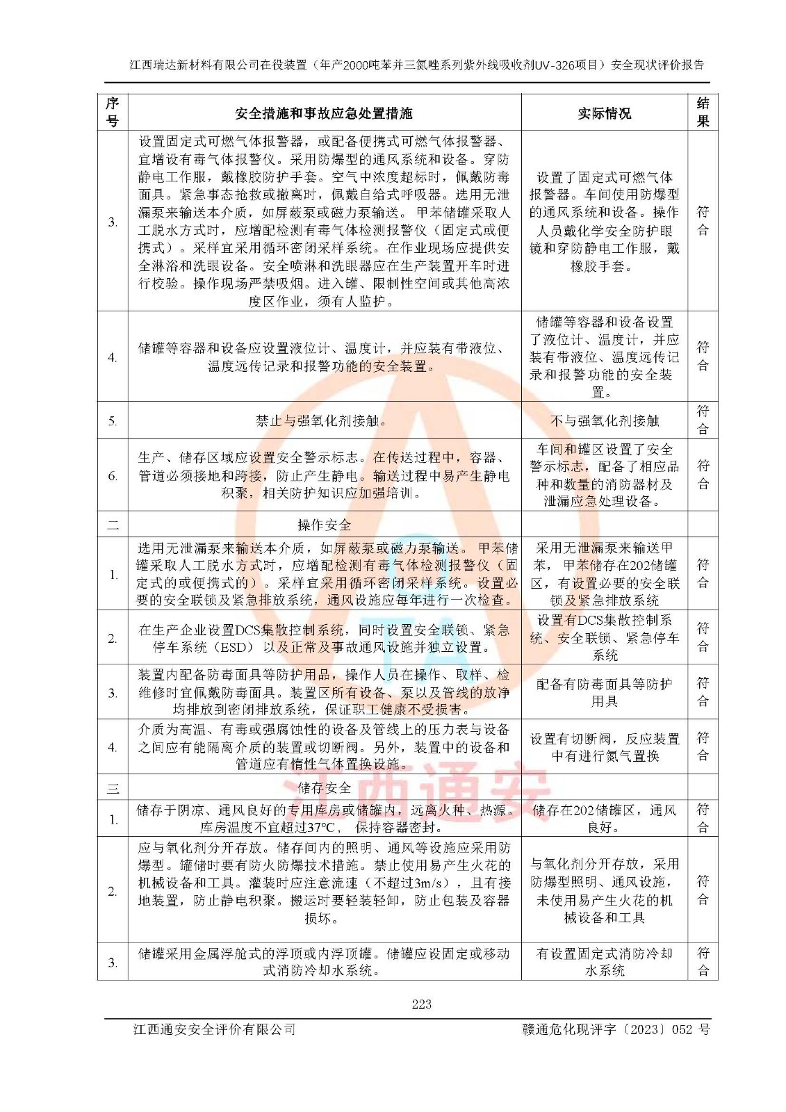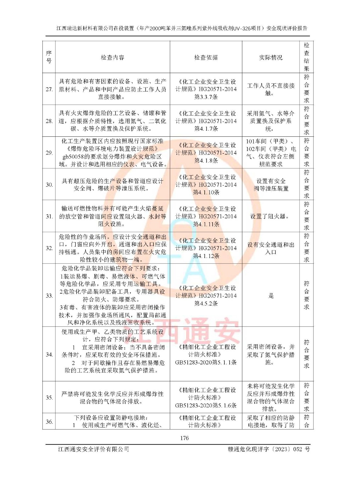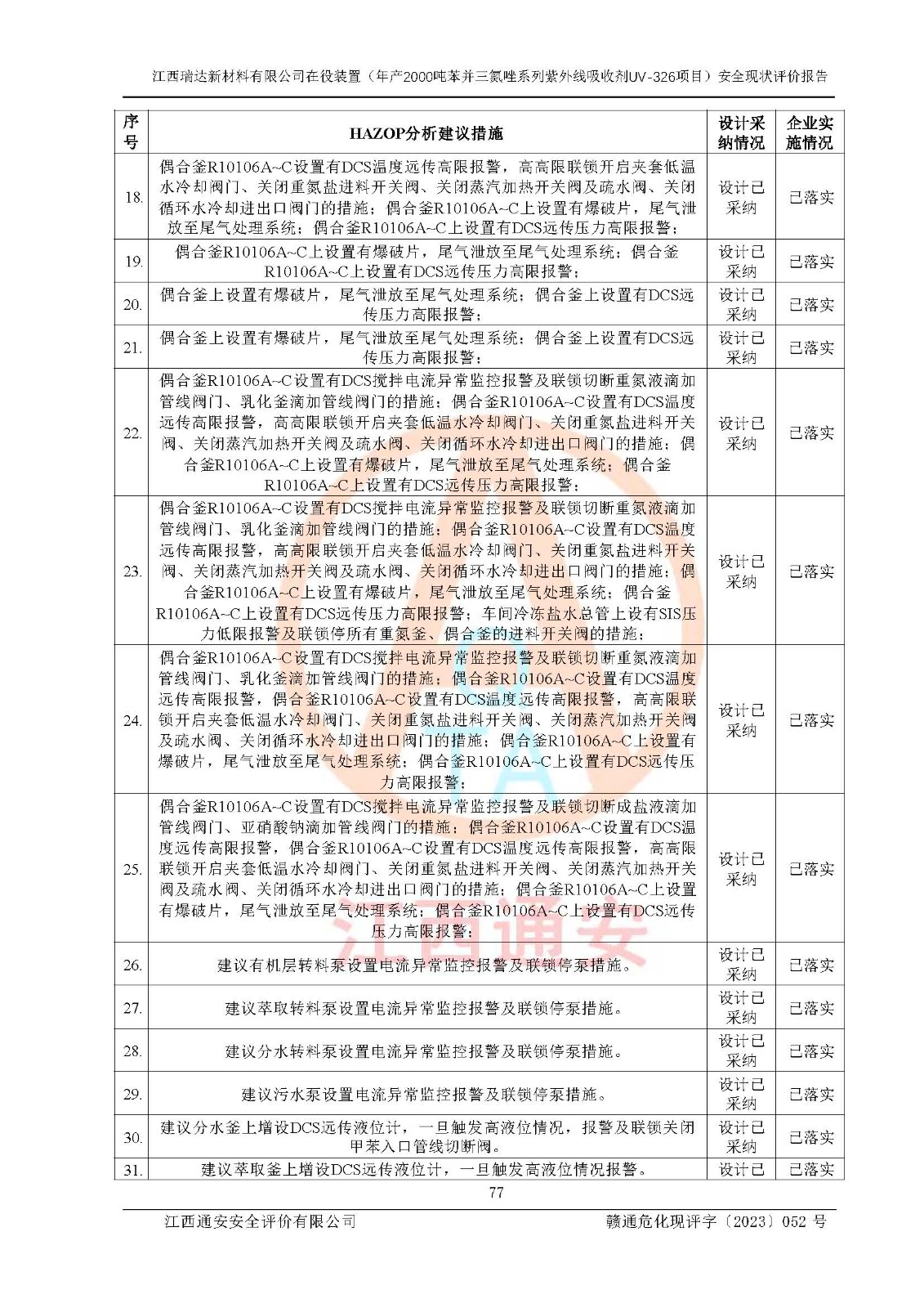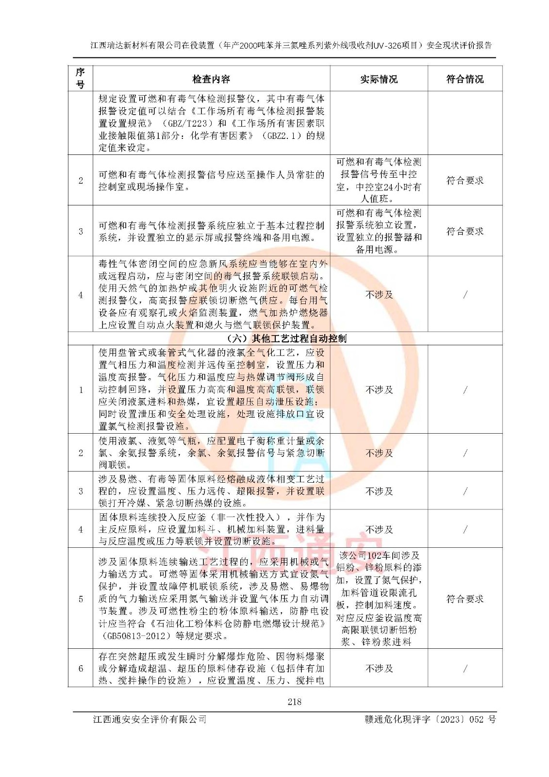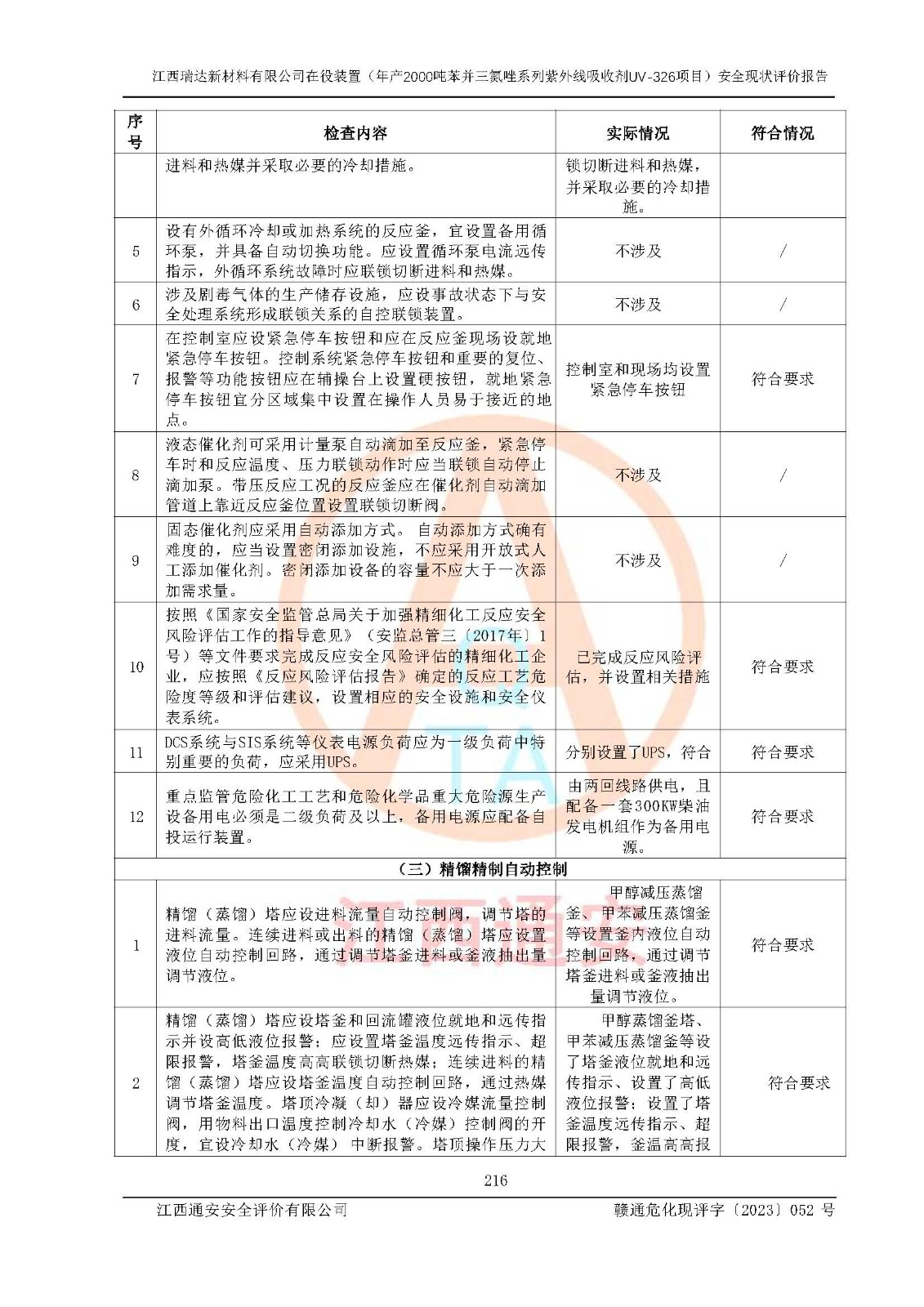 評價結(jié)論 | 1. 江西瑞達新材料有限公司年產(chǎn)2000噸苯并三氮唑系列紫外線吸收劑UV-326技術(shù)改造項目的安全設(shè)施與主體工程同時設(shè)計、同時施工、同時投入生產(chǎn)和使用,符合**有關(guān)建設(shè)項目“三同時”的規(guī)定和要求。 江西瑞達新材料有限公司年產(chǎn)2000噸苯并三氮唑系列紫外線吸收劑UV-326生產(chǎn)裝置技術(shù)改造項目符合永新縣茅坪化工產(chǎn)業(yè)園發(fā)展規(guī)劃的布局; 2. 該項目現(xiàn)場情況、企業(yè)總平面布置、設(shè)備設(shè)施的布置與設(shè)計圖、竣工圖紙一致,主體工程安全設(shè)施、安全措施符合法律法規(guī)的規(guī)定和要求,安全設(shè)施正常投用并運行**;供配電、給排水、供熱、空壓、供冷等公用工程及輔助設(shè)施滿足主體工程生產(chǎn)安全的需要;企業(yè)安全管理體系滿足生產(chǎn)安全的要求; 3. 總平面布置符合《建筑設(shè)計防火規(guī)范》GB50016-2014(2018年版)、《精細化工企業(yè)工程設(shè)計防火標準》GB51283-2020等標準、規(guī)范的要求; 4. DCS系統(tǒng)、SIS系統(tǒng)和可燃/有毒氣體報警系統(tǒng)等自動化控制系統(tǒng)設(shè)計符合《江西省應(yīng)急管理廳關(guān)于印發(fā)<江西省化工企業(yè)自動化提升實施方案>(試行)的通知》、《江西省危險化學品安全專項整治三年行動實施方案》要求,并已調(diào)試到位,自動化系統(tǒng)安裝單位出具了調(diào)試報告。目前DCS系統(tǒng)、SIS系統(tǒng)和可燃/有毒氣體報警系統(tǒng)已投入使用且運行正常; 5. 企業(yè)分管安全負責人、分管生產(chǎn)負責人、分管技術(shù)負責人、專職安全生產(chǎn)管理人員、危險工藝操作工等從業(yè)人員資格滿足《江西省危險化學品安全專項整治三年行動攻堅戰(zhàn)實施方案》要求; 6. 公司已針對本報告提出的安全隱患整改意見組織人員進行整改,整改措施已落實到位,企業(yè)安全生產(chǎn)的風險控制在可以接受的范圍內(nèi); 7. 該項目采用成熟的生產(chǎn)工藝和設(shè)備,本質(zhì)安全程度較高。 綜上所述:本報告認為,江西瑞達新材料有限公司年產(chǎn)2000噸苯并三氮唑系列紫外線吸收劑UV-326技術(shù)改造項目的生產(chǎn)裝置現(xiàn)場情況與設(shè)計圖紙一致,DCS和SIS系統(tǒng)設(shè)計符合要求且運行正常,有關(guān)從業(yè)人員資質(zhì)符合《江西省危險化學品安全專項整治三年行動實施方案》要求,安全設(shè)施及安全管理符合**及有關(guān)部門關(guān)于安全生產(chǎn)法律、法規(guī)、標準的要求,安全風險是受控制的,其風險程度是可以接受的,符合安全生產(chǎn)條件,能夠滿足安全生產(chǎn)的要求,具備安全設(shè)施“三同時”驗收條件。 | |||