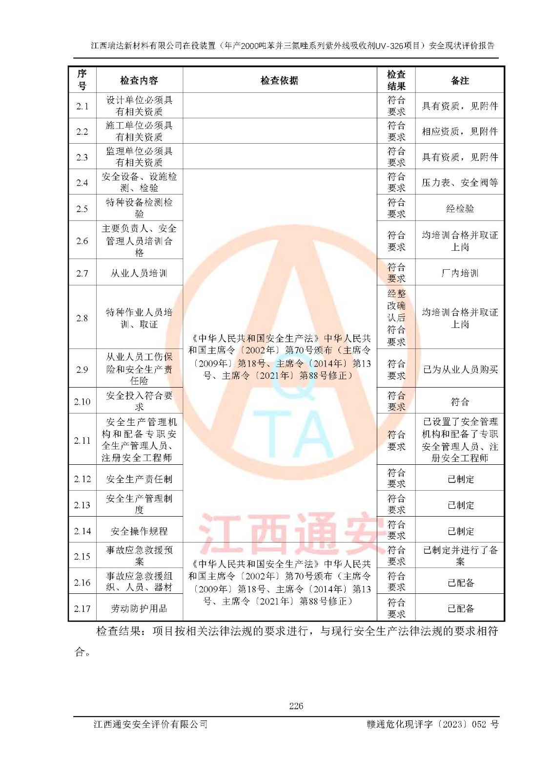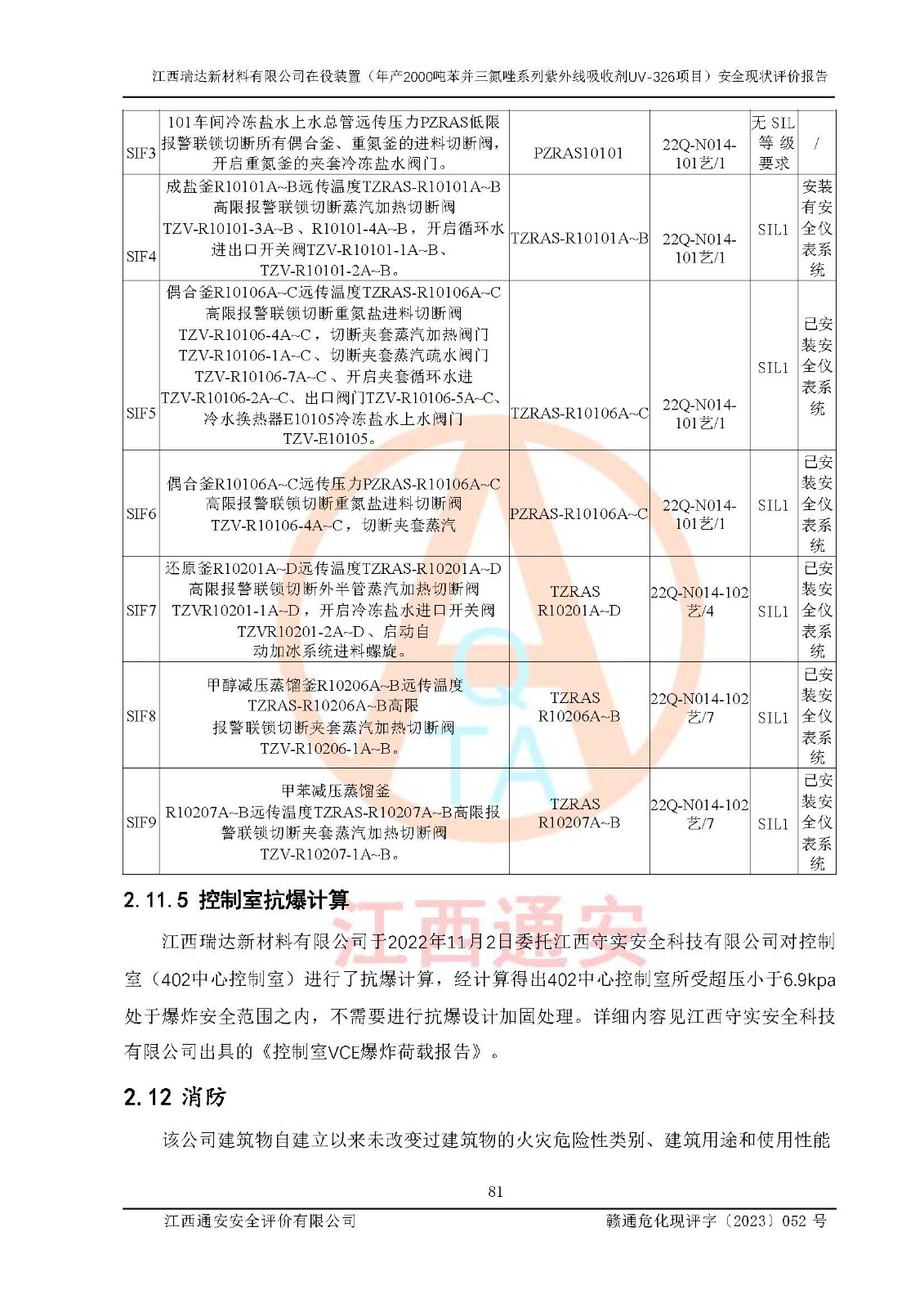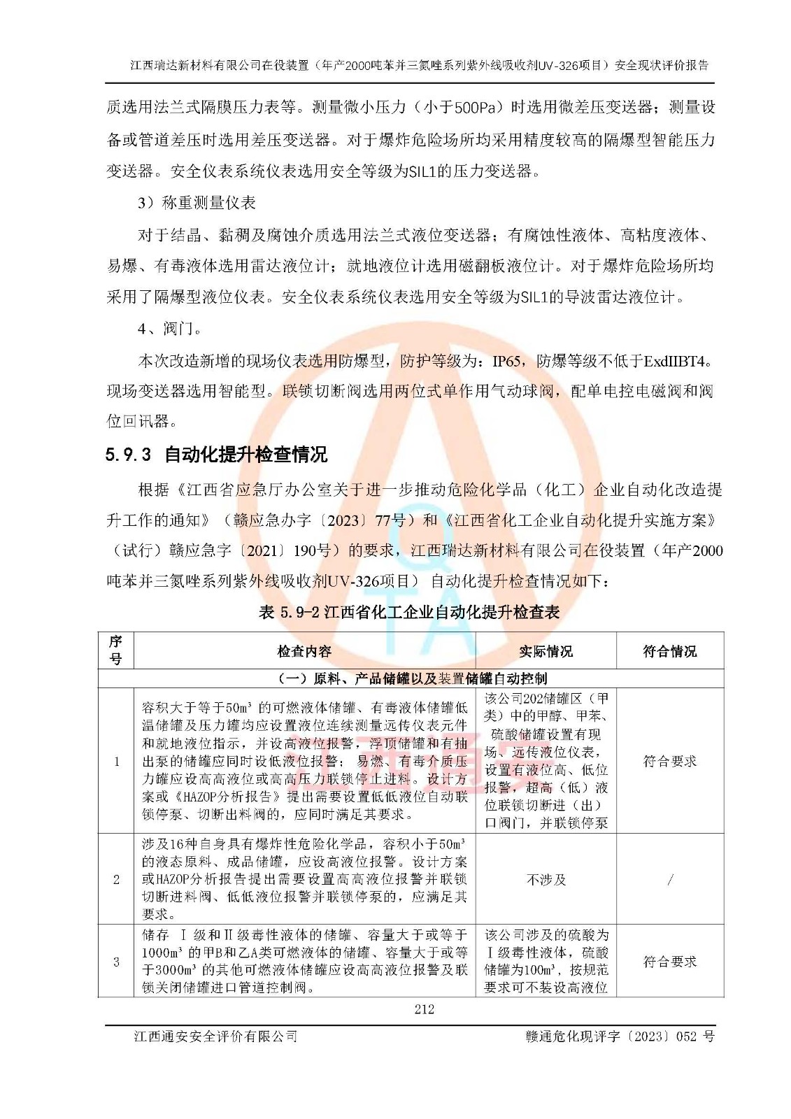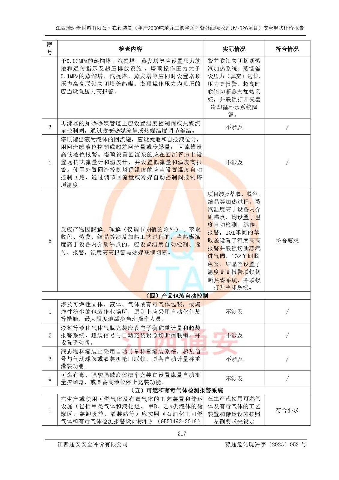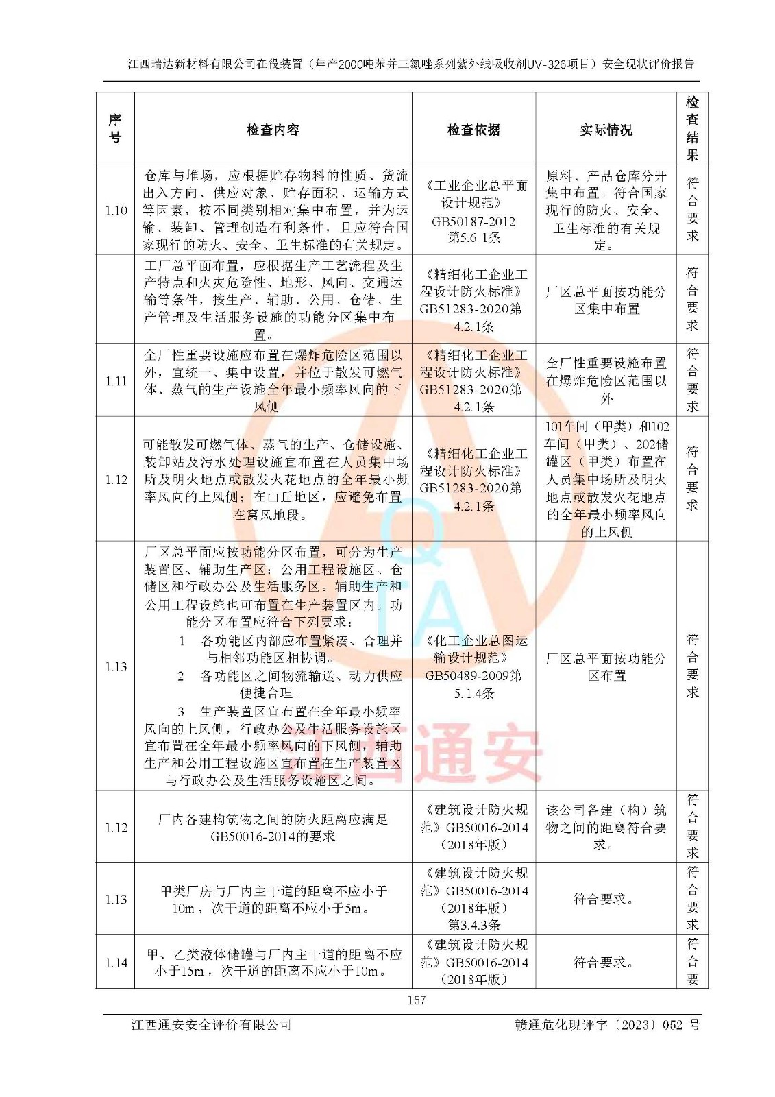 評價結(jié)論 | 1. 江西瑞達新材料有限公司年產(chǎn)2000噸苯并三氮唑系列紫外線吸收劑UV-326技術(shù)改造項目的安全設(shè)施與主體工程同時設(shè)計、同時施工、同時投入生產(chǎn)和使用,符合**有關(guān)建設(shè)項目“三同時”的規(guī)定和要求。 江西瑞達新材料有限公司年產(chǎn)2000噸苯并三氮唑系列紫外線吸收劑UV-326生產(chǎn)裝置技術(shù)改造項目符合永新縣茅坪化工產(chǎn)業(yè)園發(fā)展規(guī)劃的布局; 2. 該項目現(xiàn)場情況、企業(yè)總平面布置、設(shè)備設(shè)施的布置與設(shè)計圖、竣工圖紙一致,主體工程安全設(shè)施、安全措施符合法律法規(guī)的規(guī)定和要求,安全設(shè)施正常投用并運行**;供配電、給排水、供熱、空壓、供冷等公用工程及輔助設(shè)施滿足主體工程生產(chǎn)安全的需要;企業(yè)安全管理體系滿足生產(chǎn)安全的要求; 3. 總平面布置符合《建筑設(shè)計防火規(guī)范》GB50016-2014(2018年版)、《精細化工企業(yè)工程設(shè)計防火標準》GB51283-2020等標準、規(guī)范的要求; 4. DCS系統(tǒng)、SIS系統(tǒng)和可燃/有毒氣體報警系統(tǒng)等自動化控制系統(tǒng)設(shè)計符合《江西省應(yīng)急管理廳關(guān)于印發(fā)<江西省化工企業(yè)自動化提升實施方案>(試行)的通知》、《江西省危險化學品安全專項整治三年行動實施方案》要求,并已調(diào)試到位,自動化系統(tǒng)安裝單位出具了調(diào)試報告。目前DCS系統(tǒng)、SIS系統(tǒng)和可燃/有毒氣體報警系統(tǒng)已投入使用且運行正常; 5. 企業(yè)分管安全負責人、分管生產(chǎn)負責人、分管技術(shù)負責人、專職安全生產(chǎn)管理人員、危險工藝操作工等從業(yè)人員資格滿足《江西省危險化學品安全專項整治三年行動攻堅戰(zhàn)實施方案》要求; 6. 公司已針對本報告提出的安全隱患整改意見組織人員進行整改,整改措施已落實到位,企業(yè)安全生產(chǎn)的風險控制在可以接受的范圍內(nèi); 7. 該項目采用成熟的生產(chǎn)工藝和設(shè)備,本質(zhì)安全程度較高。 綜上所述:本報告認為,江西瑞達新材料有限公司年產(chǎn)2000噸苯并三氮唑系列紫外線吸收劑UV-326技術(shù)改造項目的生產(chǎn)裝置現(xiàn)場情況與設(shè)計圖紙一致,DCS和SIS系統(tǒng)設(shè)計符合要求且運行正常,有關(guān)從業(yè)人員資質(zhì)符合《江西省危險化學品安全專項整治三年行動實施方案》要求,安全設(shè)施及安全管理符合**及有關(guān)部門關(guān)于安全生產(chǎn)法律、法規(guī)、標準的要求,安全風險是受控制的,其風險程度是可以接受的,符合安全生產(chǎn)條件,能夠滿足安全生產(chǎn)的要求,具備安全設(shè)施“三同時”驗收條件。 | |||
